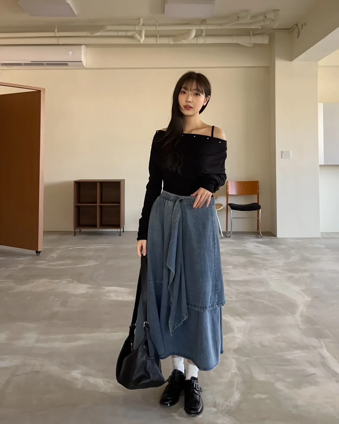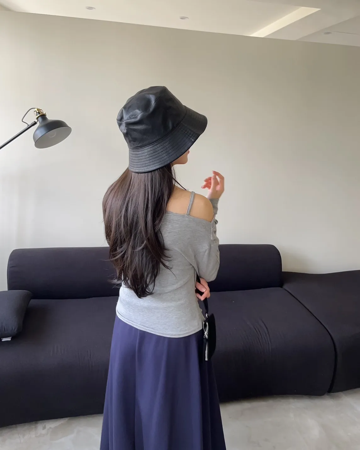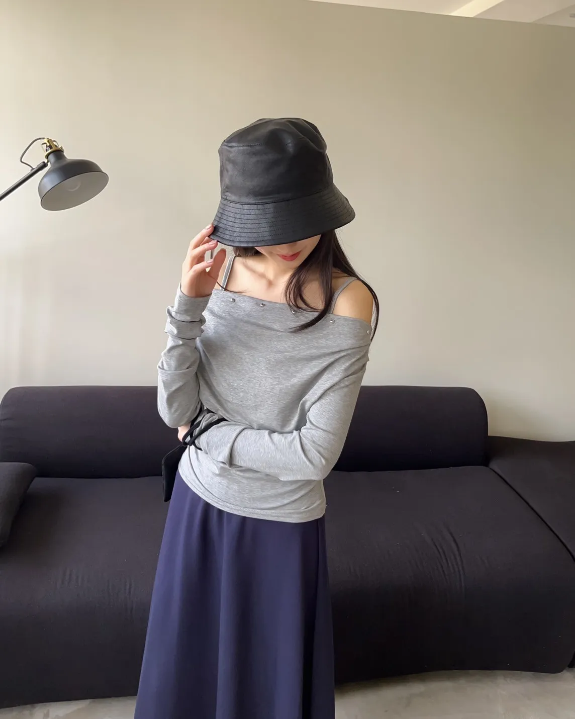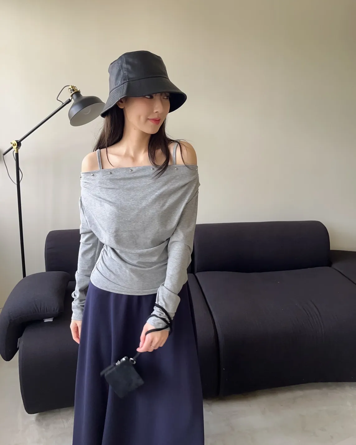 假兩件 內有細肩小背心(固定不可拆) 胸前鉚釘裝飾 平領 彈性滑棉料 兩側腰抓皺