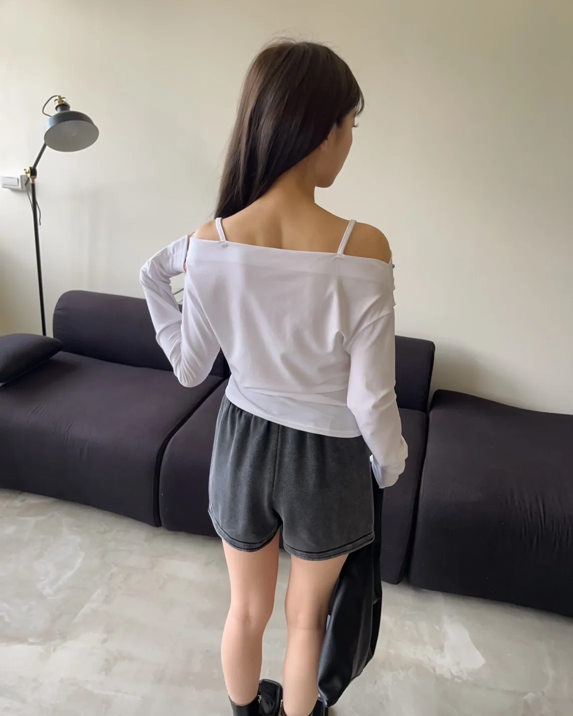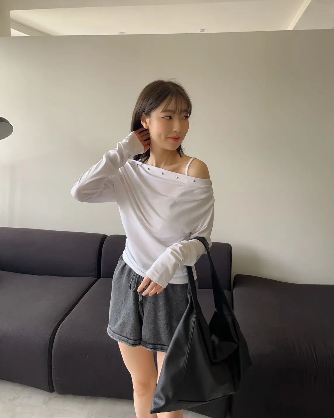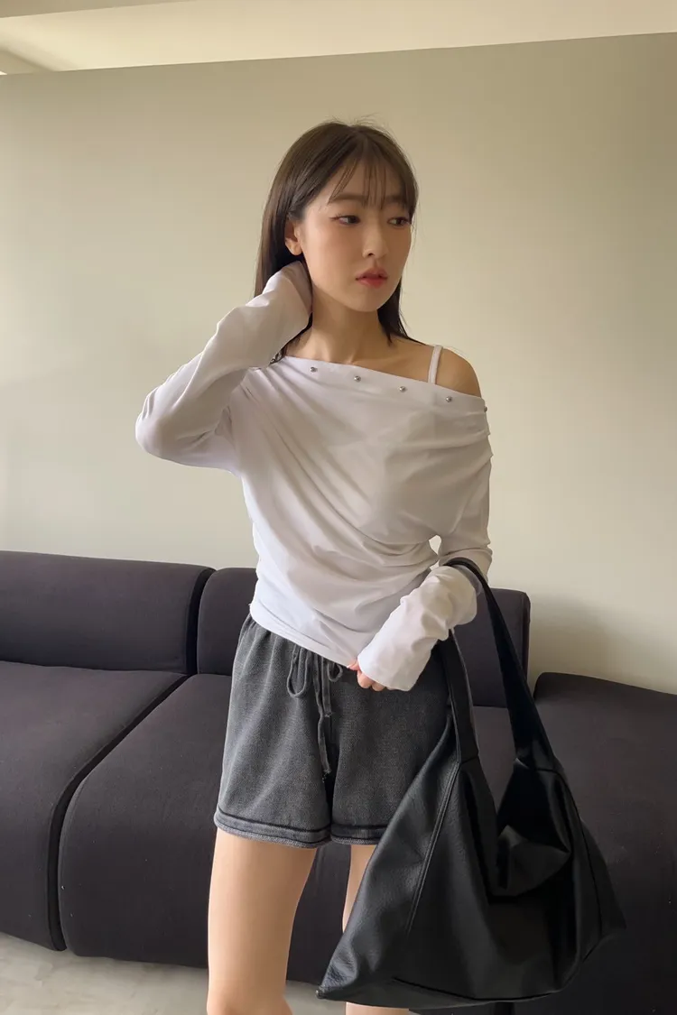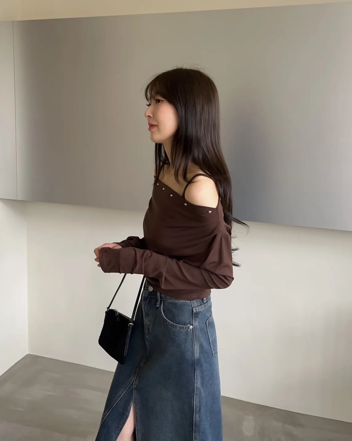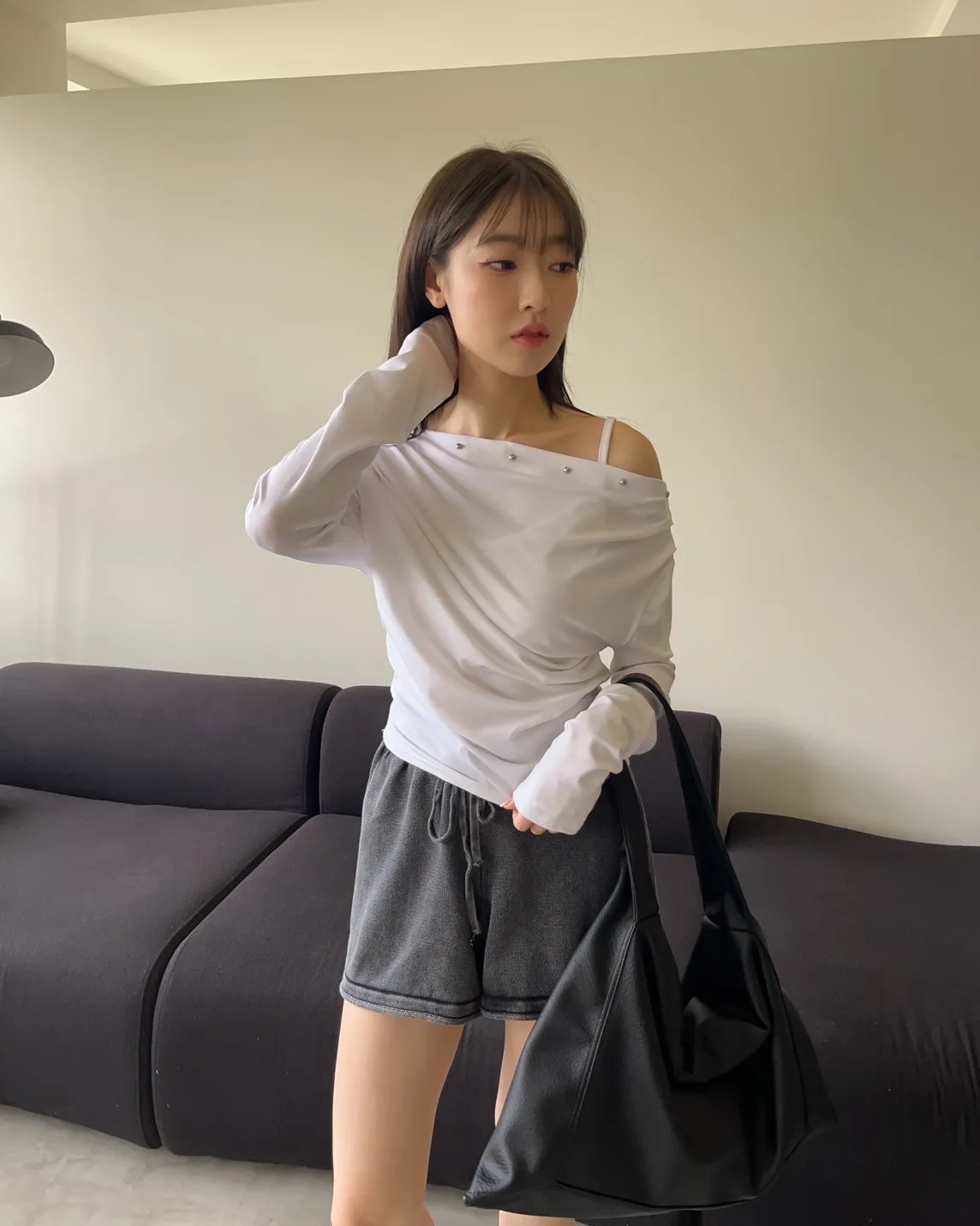 V0082個性假兩件鉚釘縮腰上衣(白/咖啡/灰/黑)(售完不補)