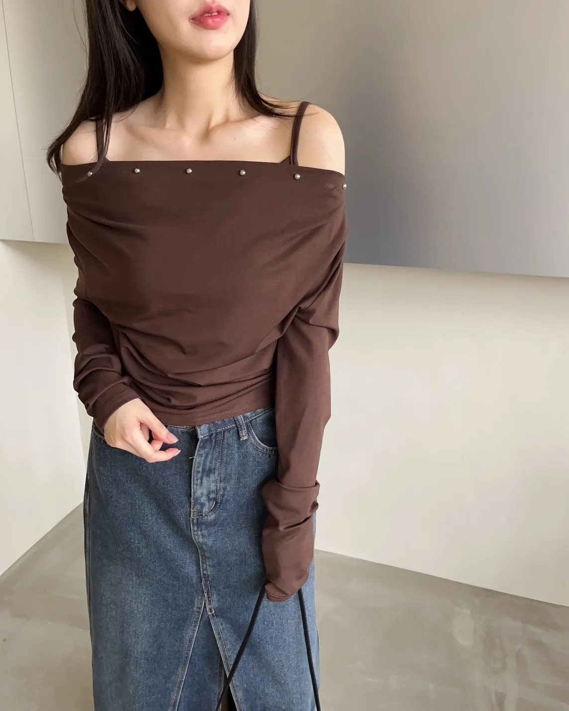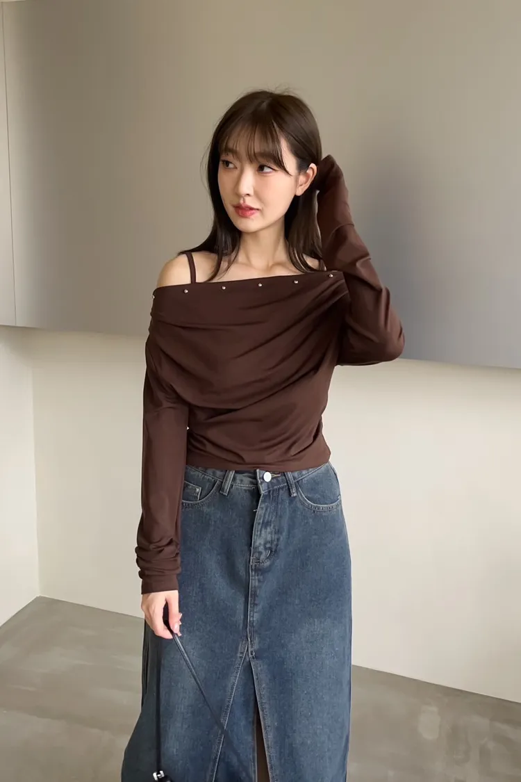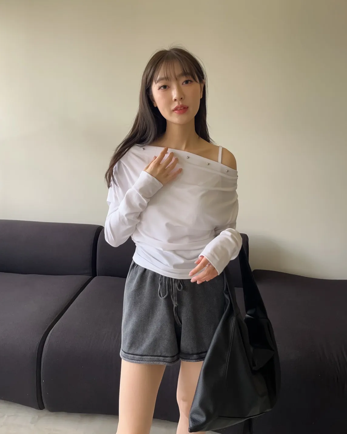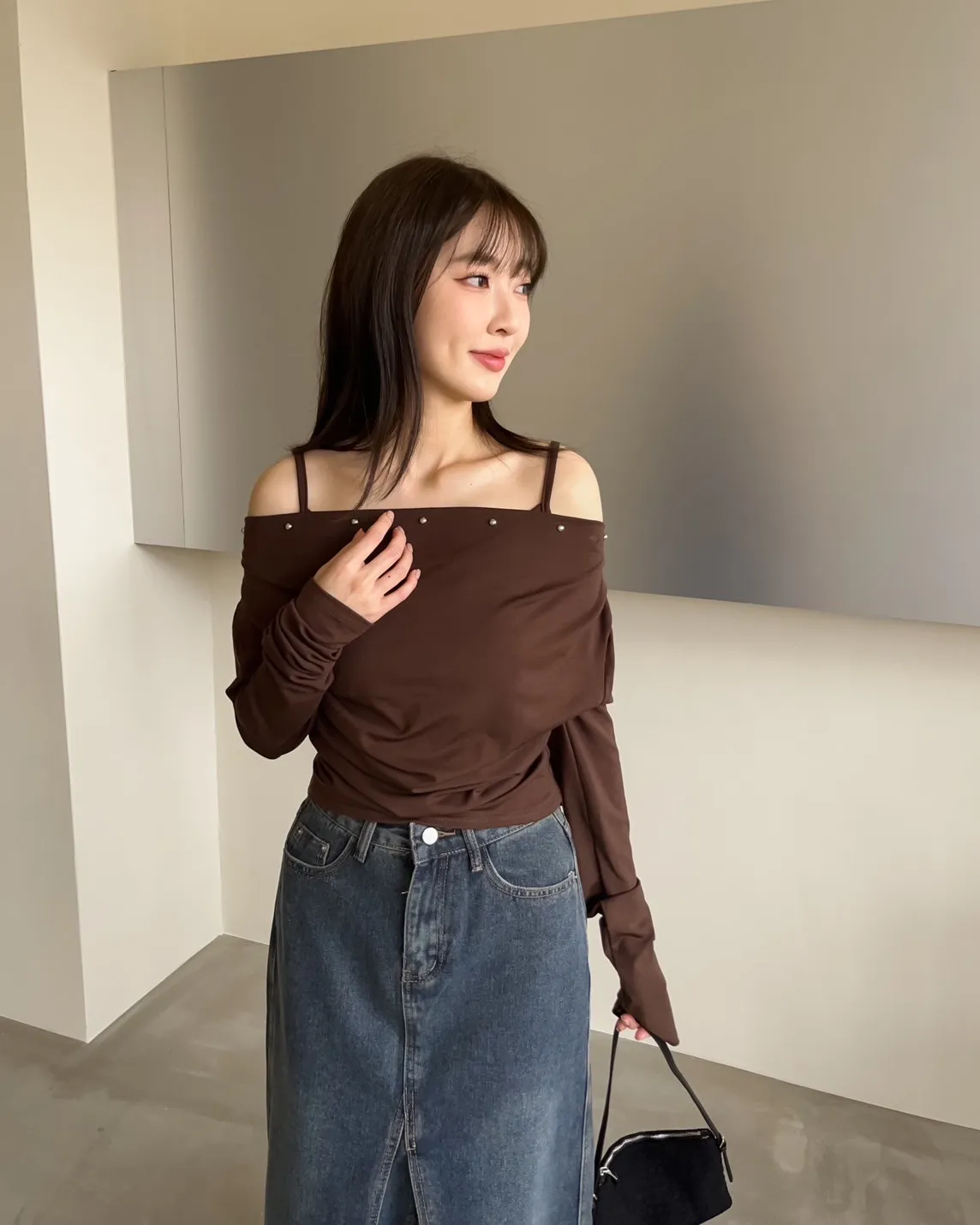 V0082個性假兩件鉚釘縮腰上衣(白/咖啡/灰/黑)(售完不補)