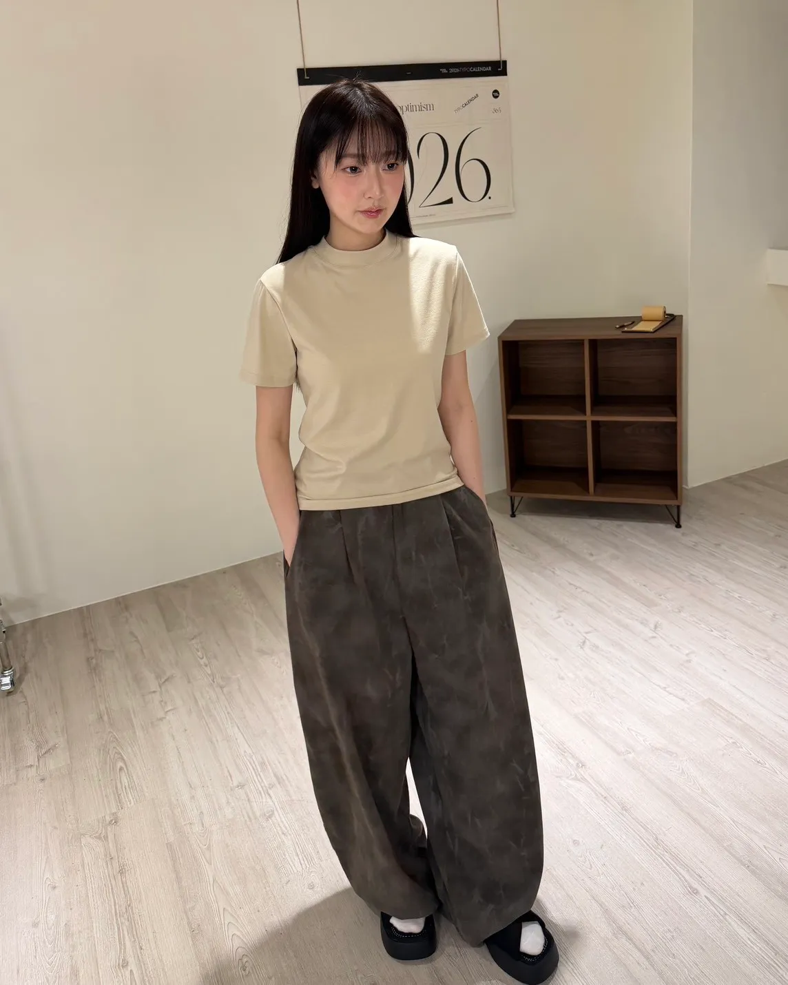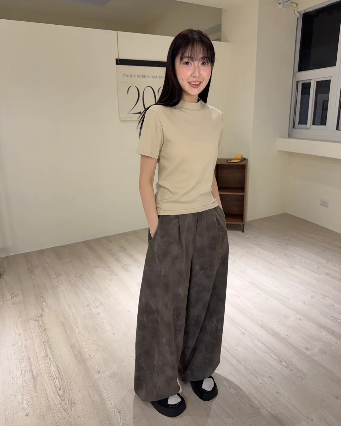 後鬆緊 建議尺寸S-大M小L 煙霧感刷白紋理 寬版廓型 兩側口袋 後假口袋 同色系鈕扣 布料無彈性