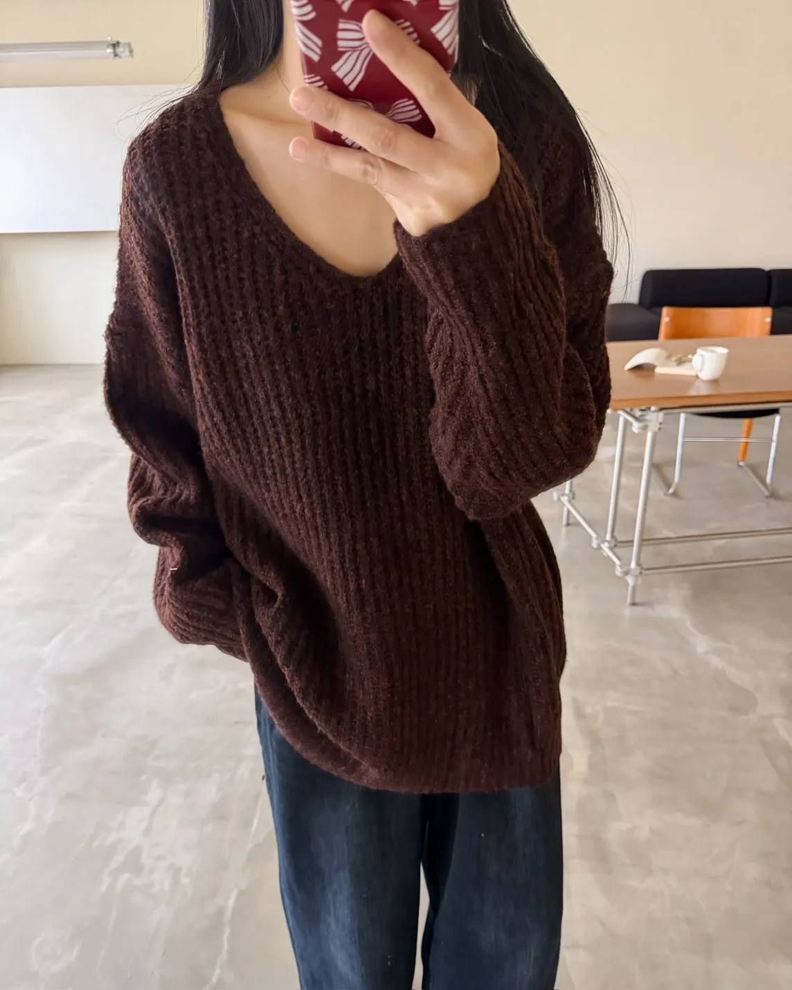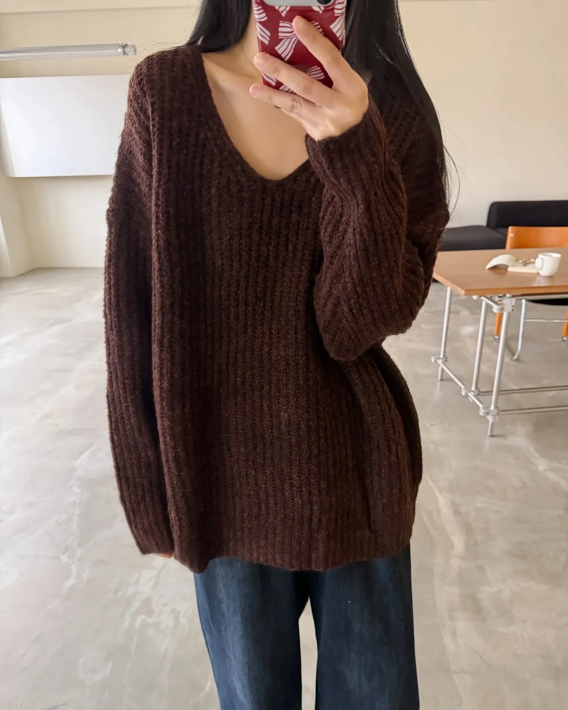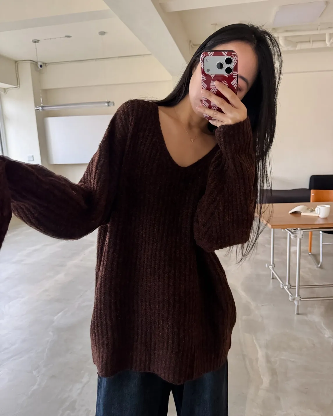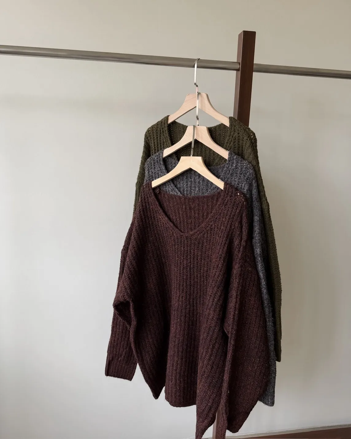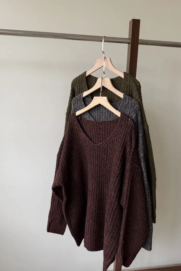 Y0028圈圈織紋V領大件混色毛衣(咖紅/巧克力/綠)