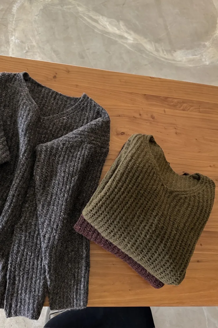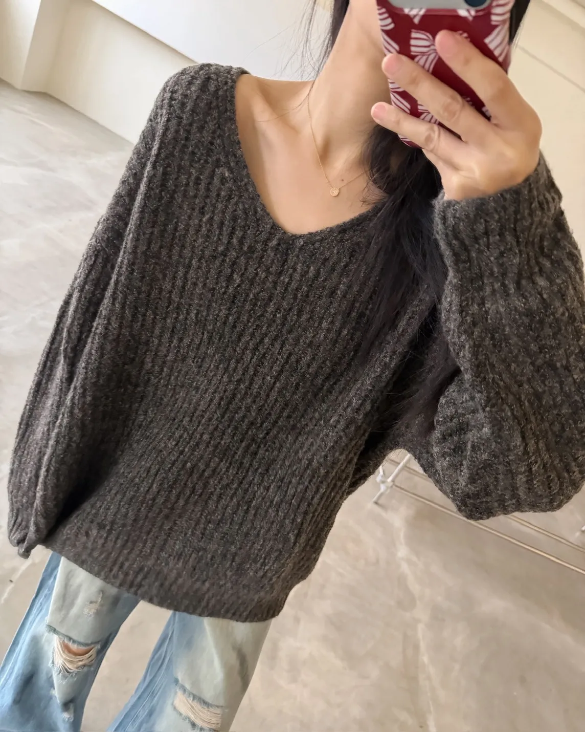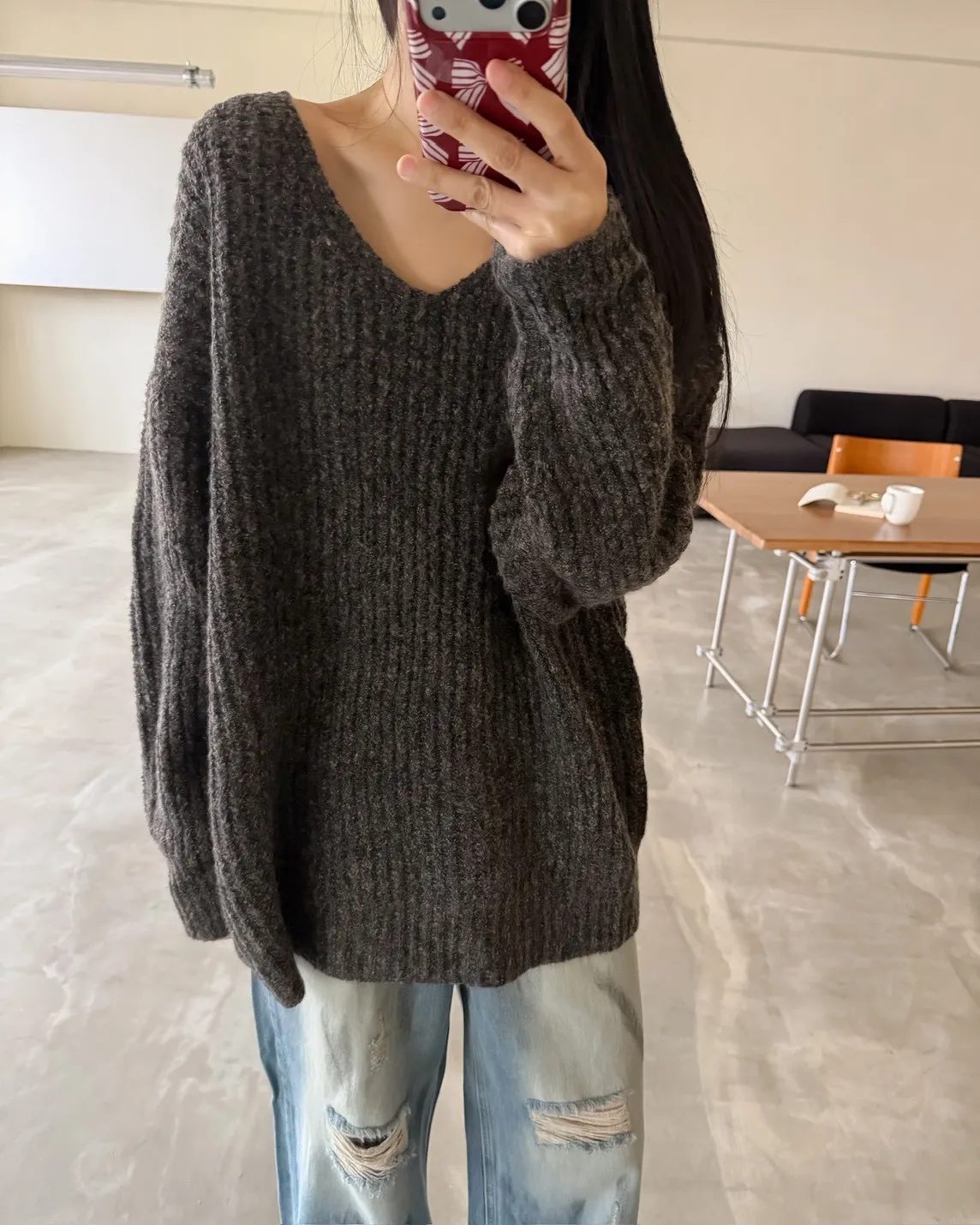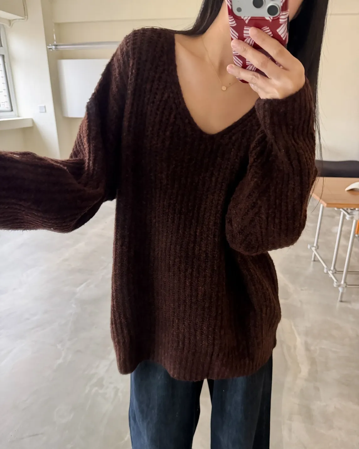 Y0028圈圈織紋V領大件混色毛衣(咖紅/巧克力/綠)
