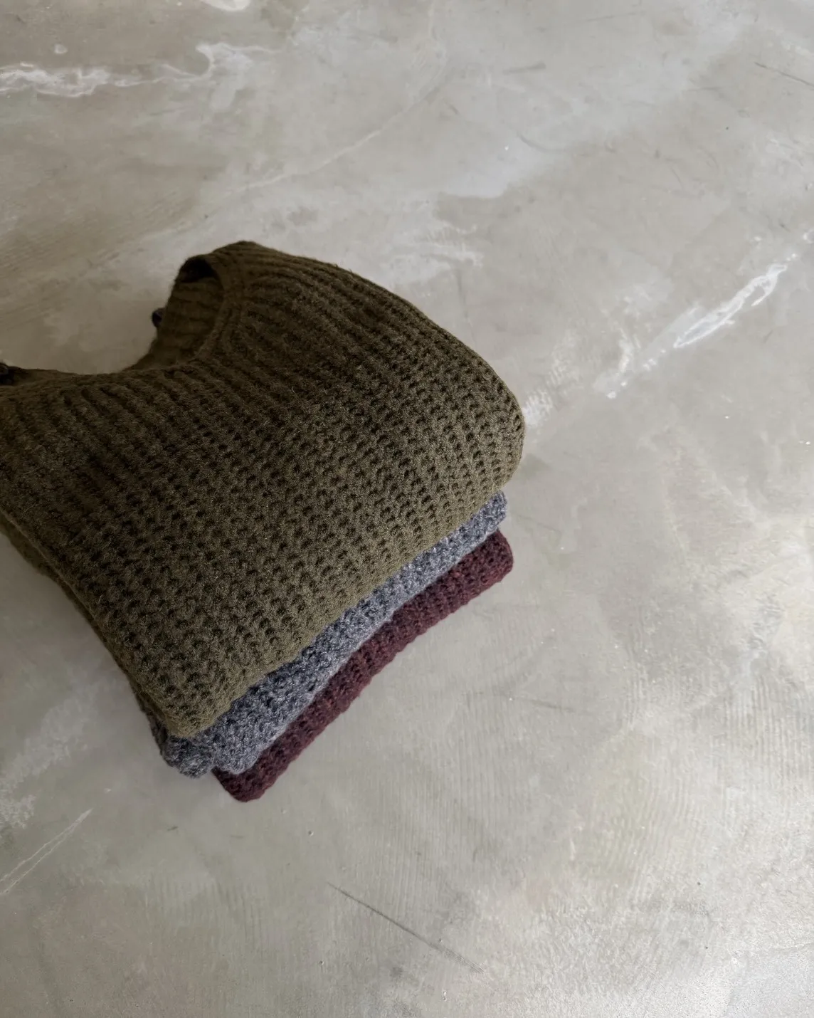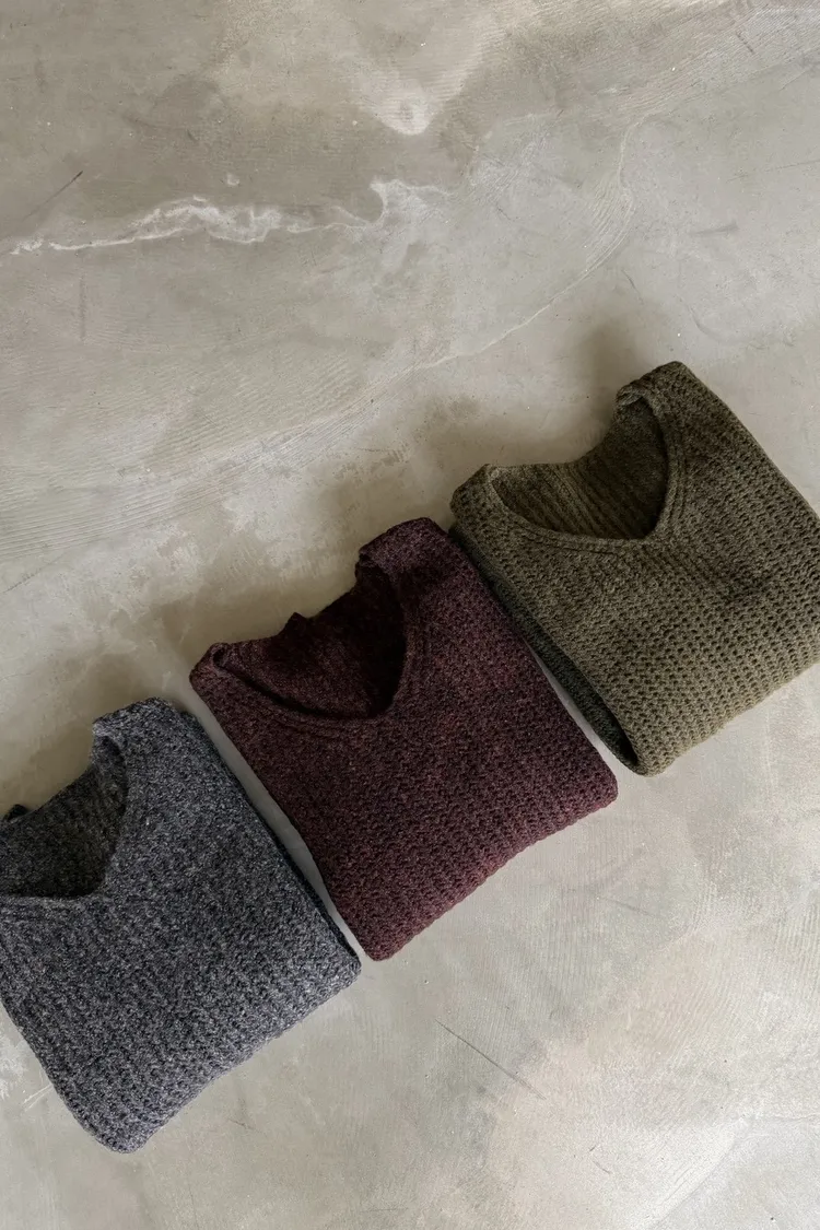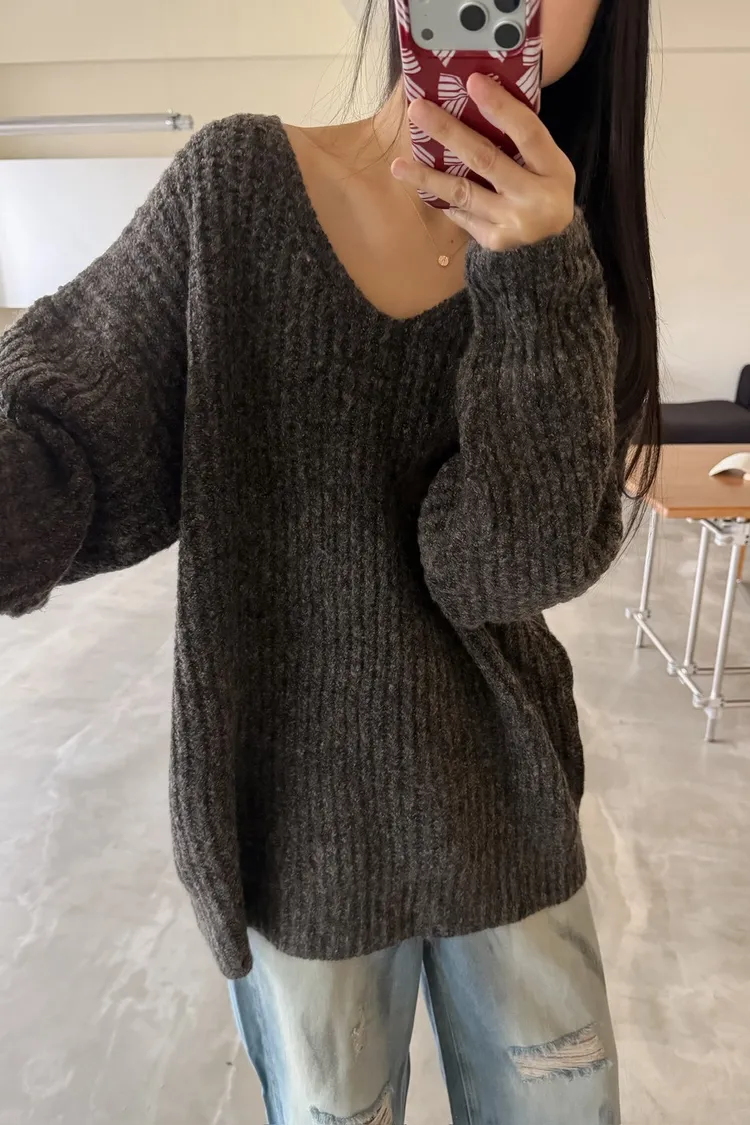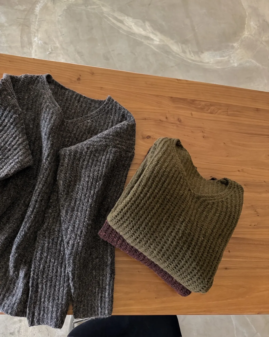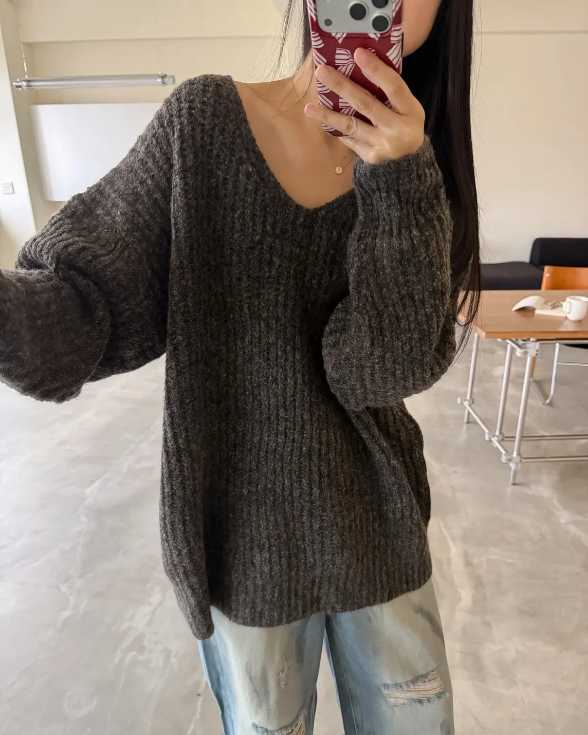 Y0028圈圈織紋V領大件混色毛衣(咖紅/巧克力/綠)
