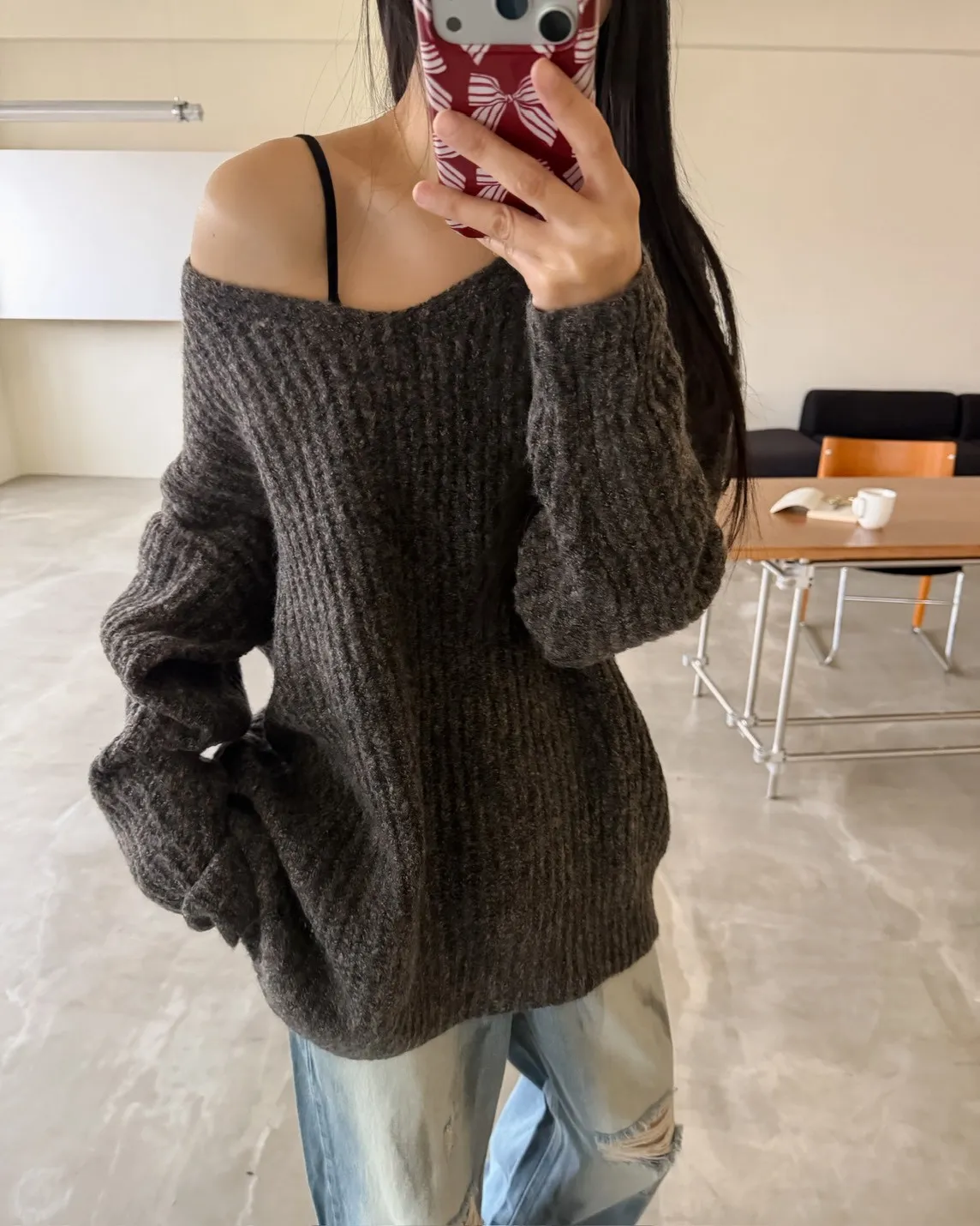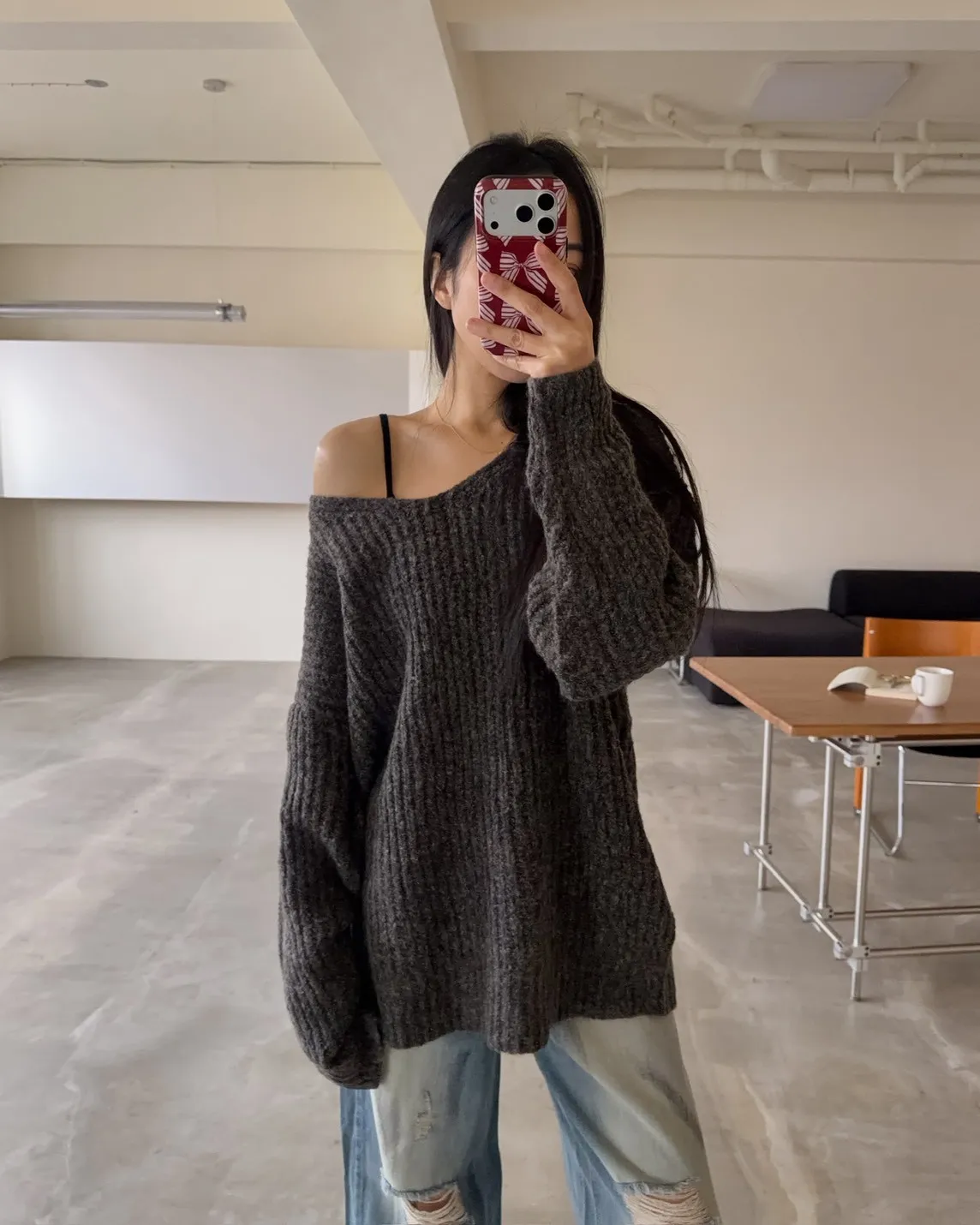 QQ針織 圈圈織紋 V領 寬鬆落肩 混毛