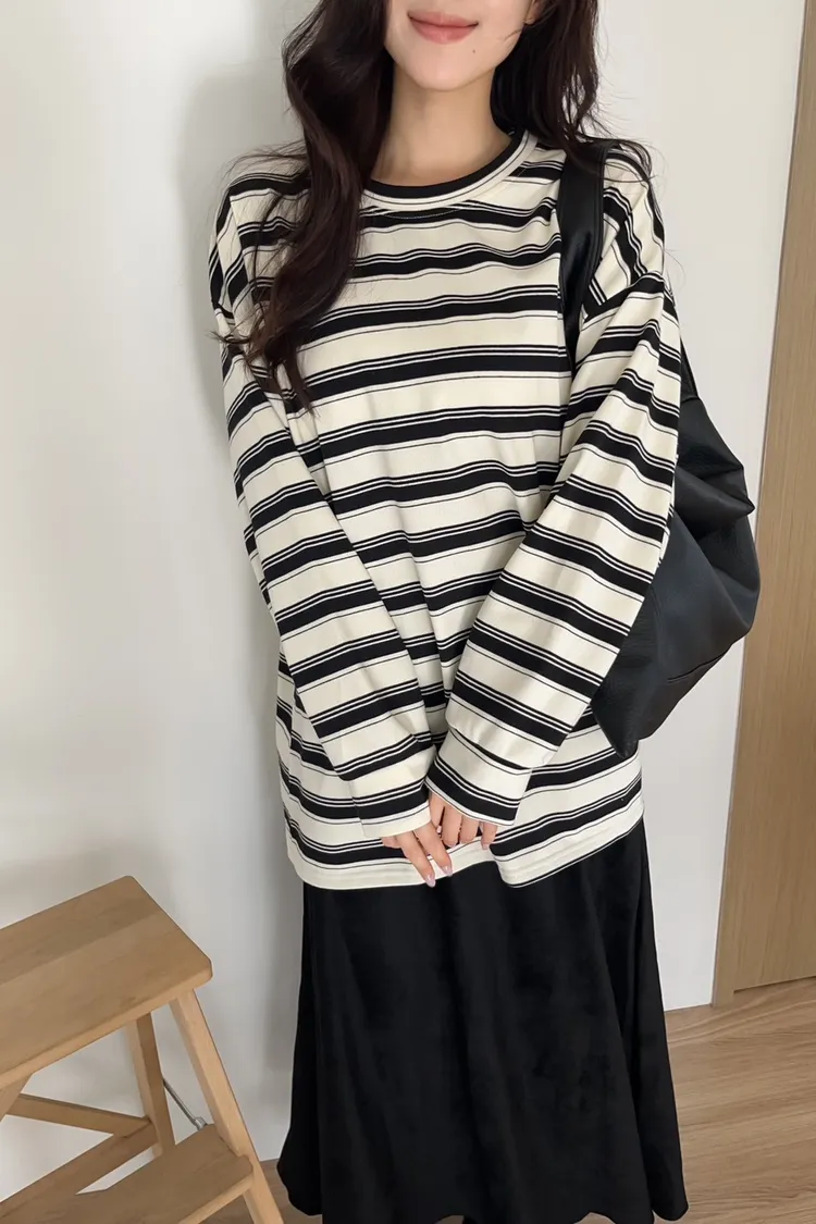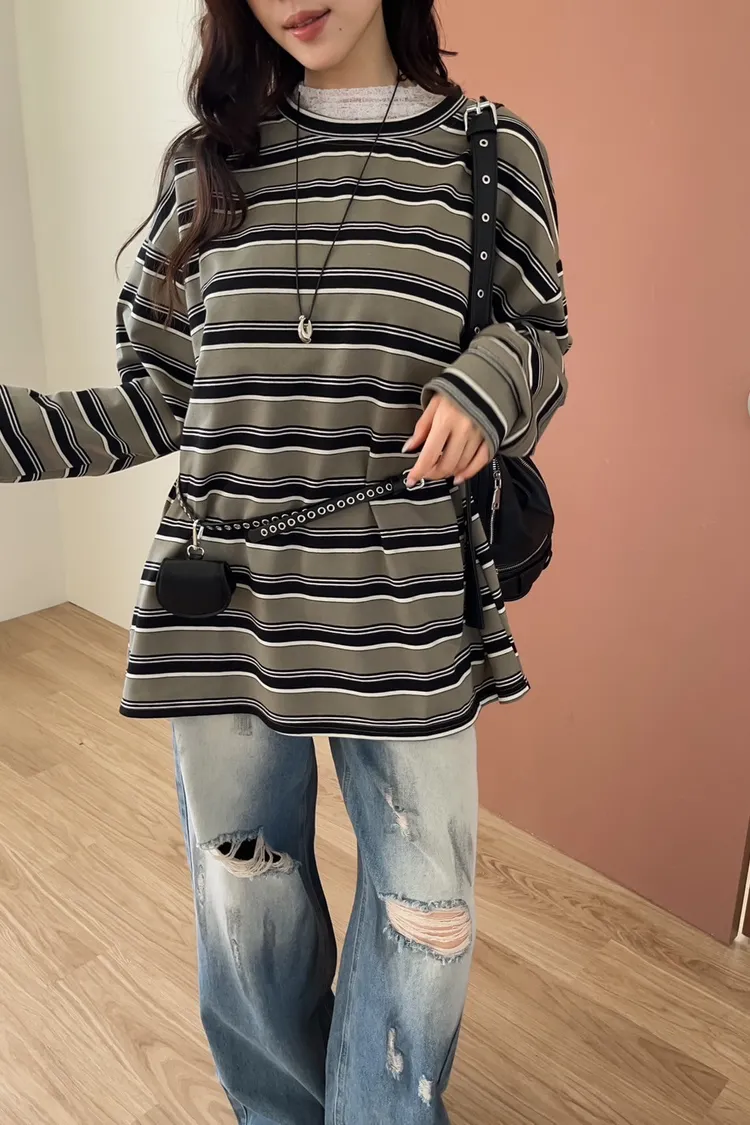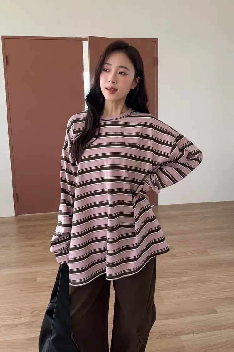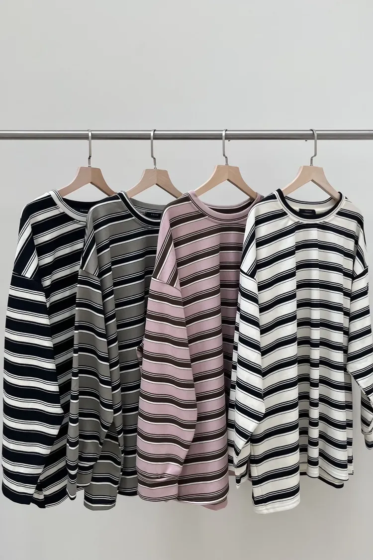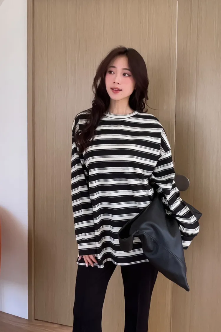 寬鬆落肩 條文配色 袖口內縮很可愛~
