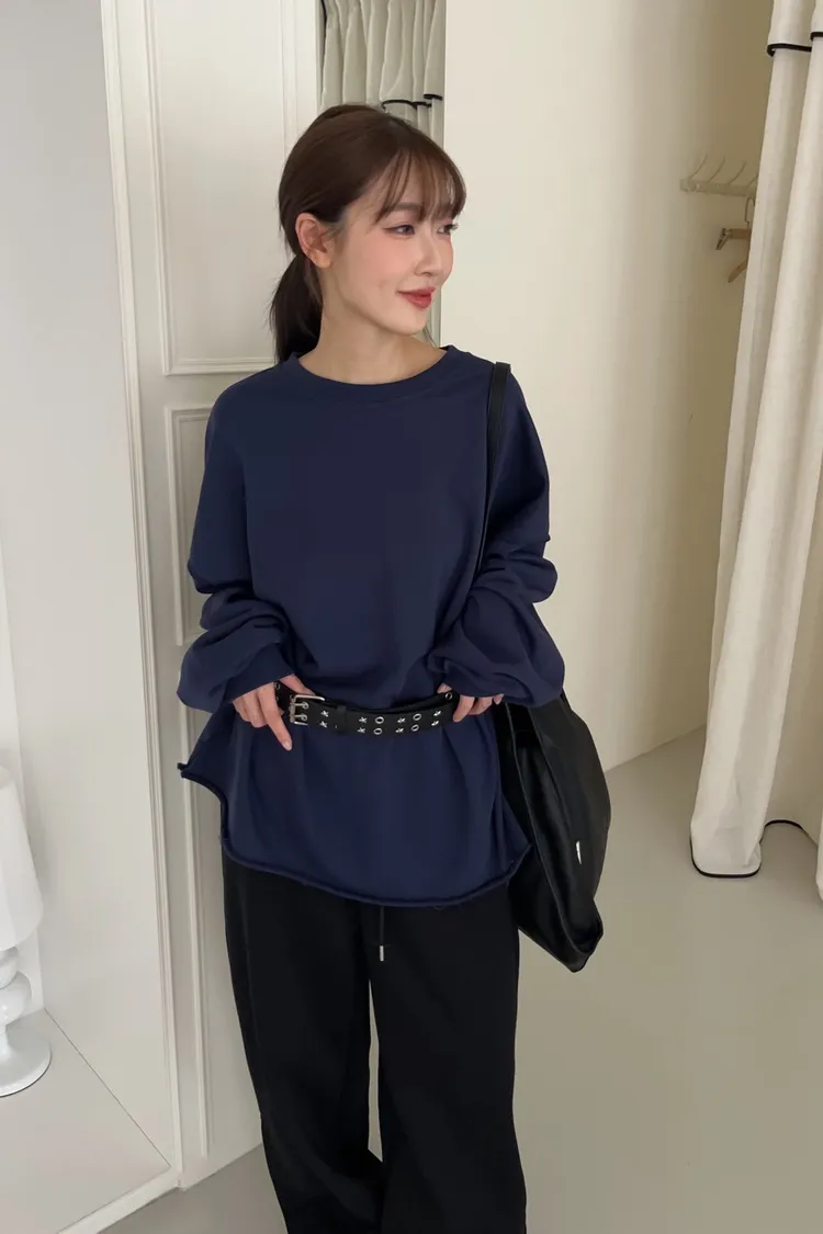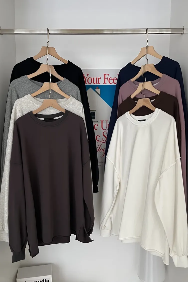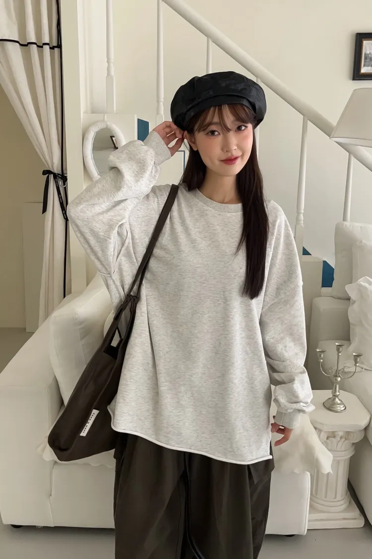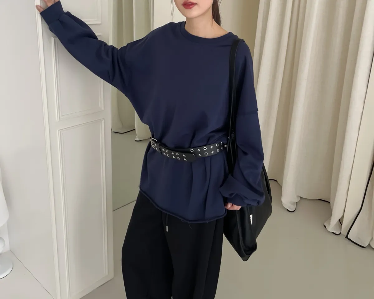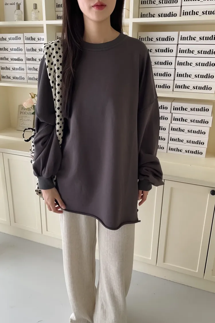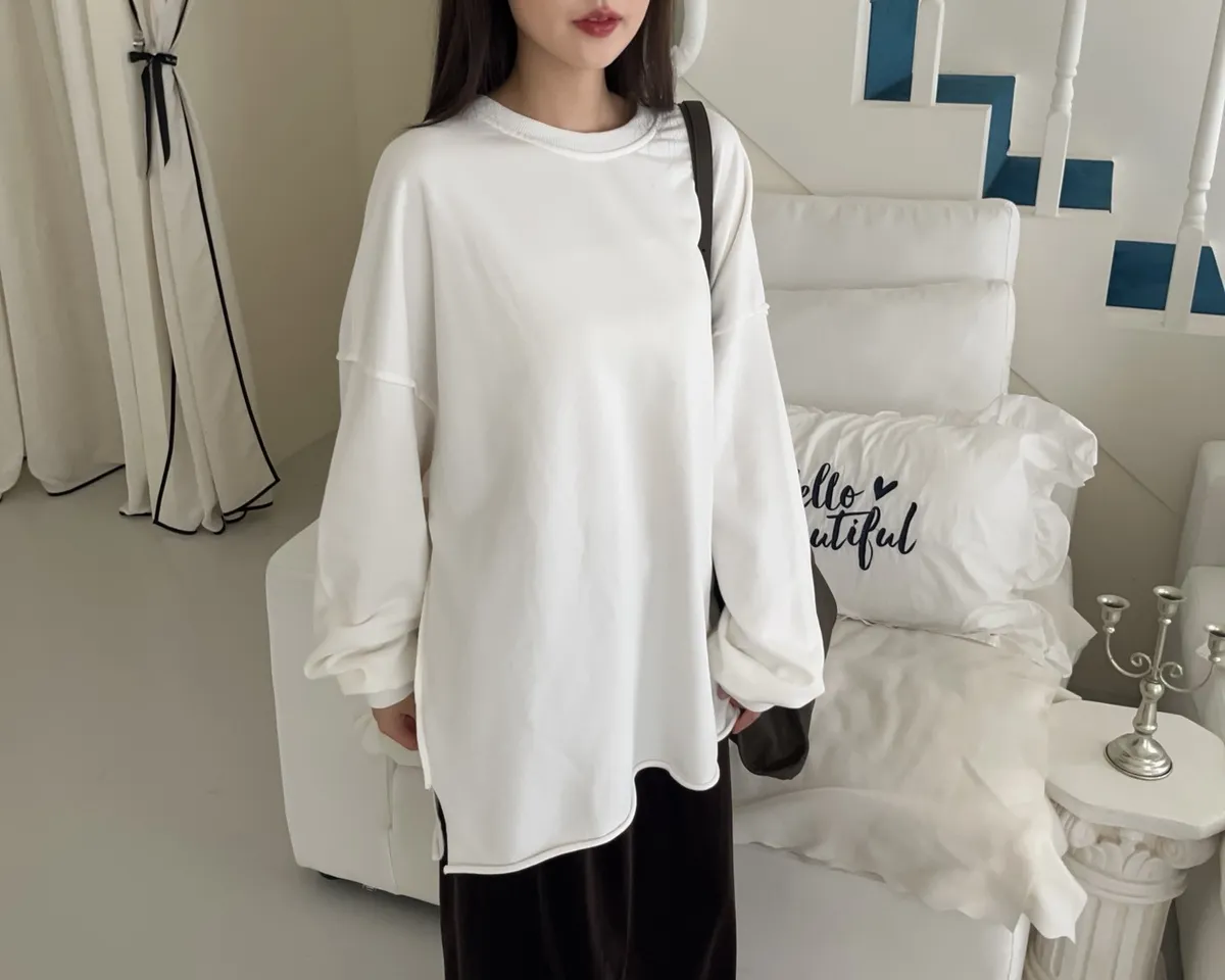 寬鬆落肩 兩側開岔 反車線造型 下擺捲邊 羅紋縮袖口