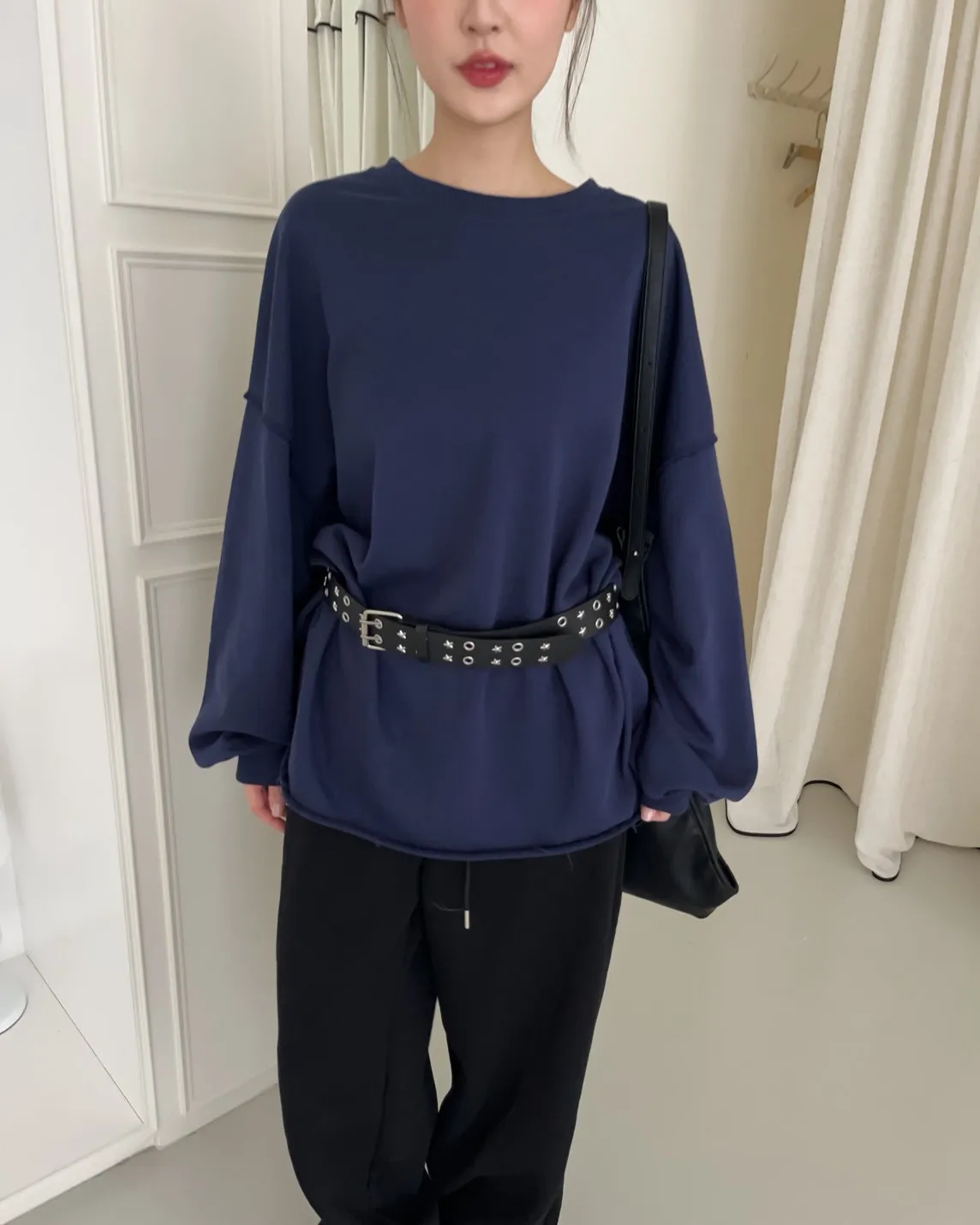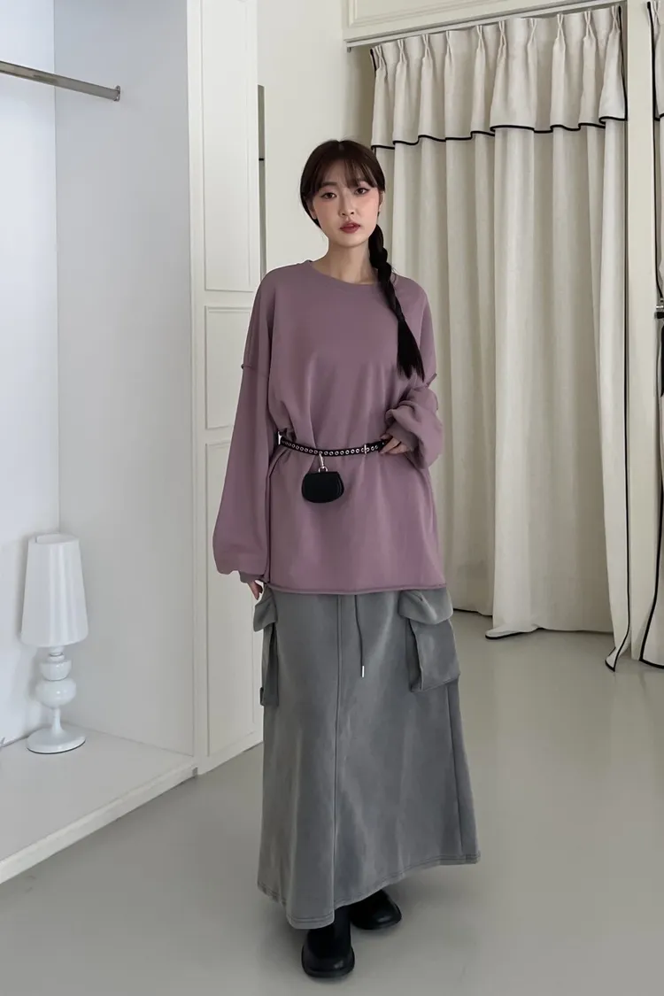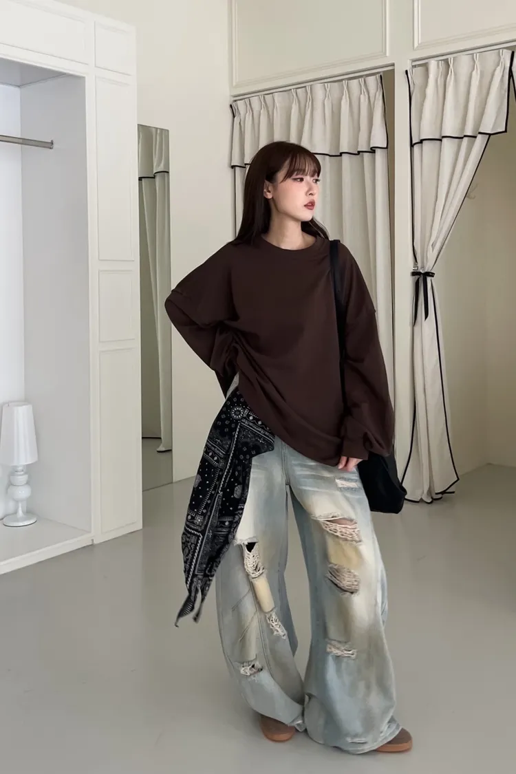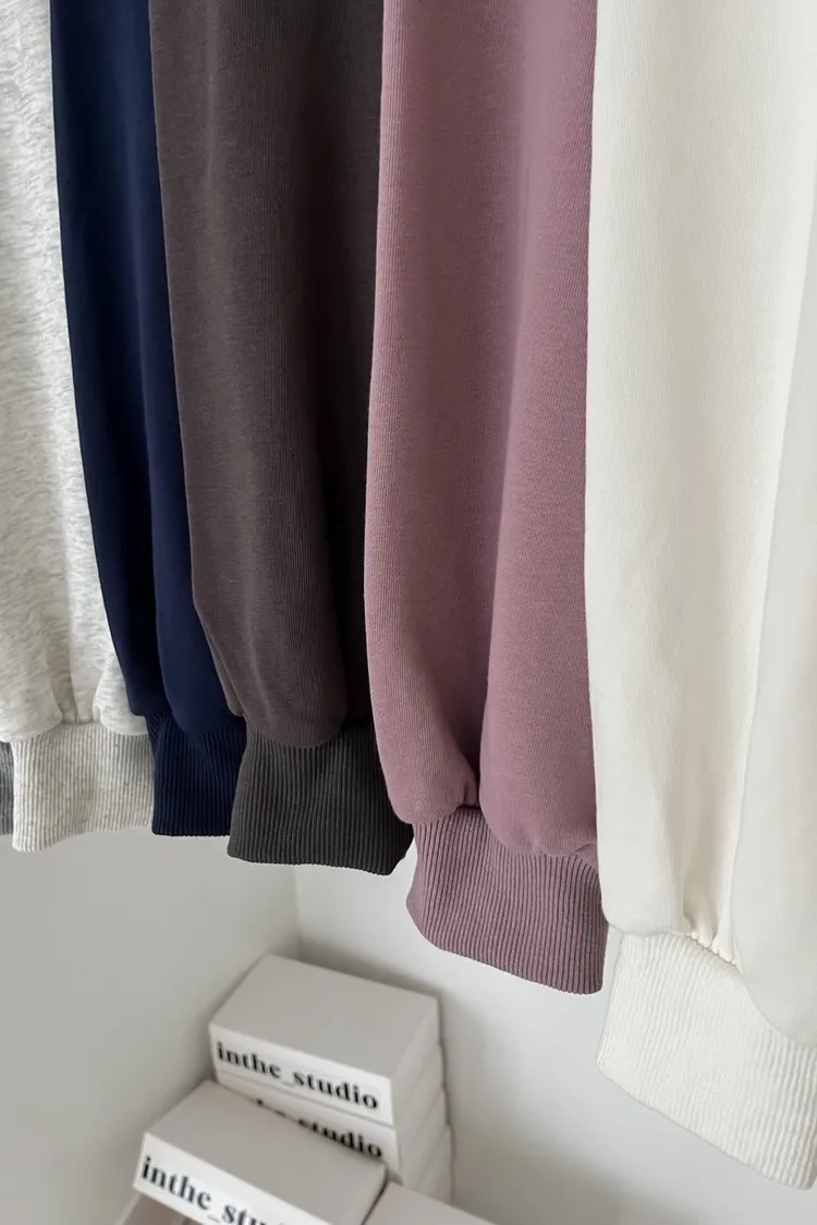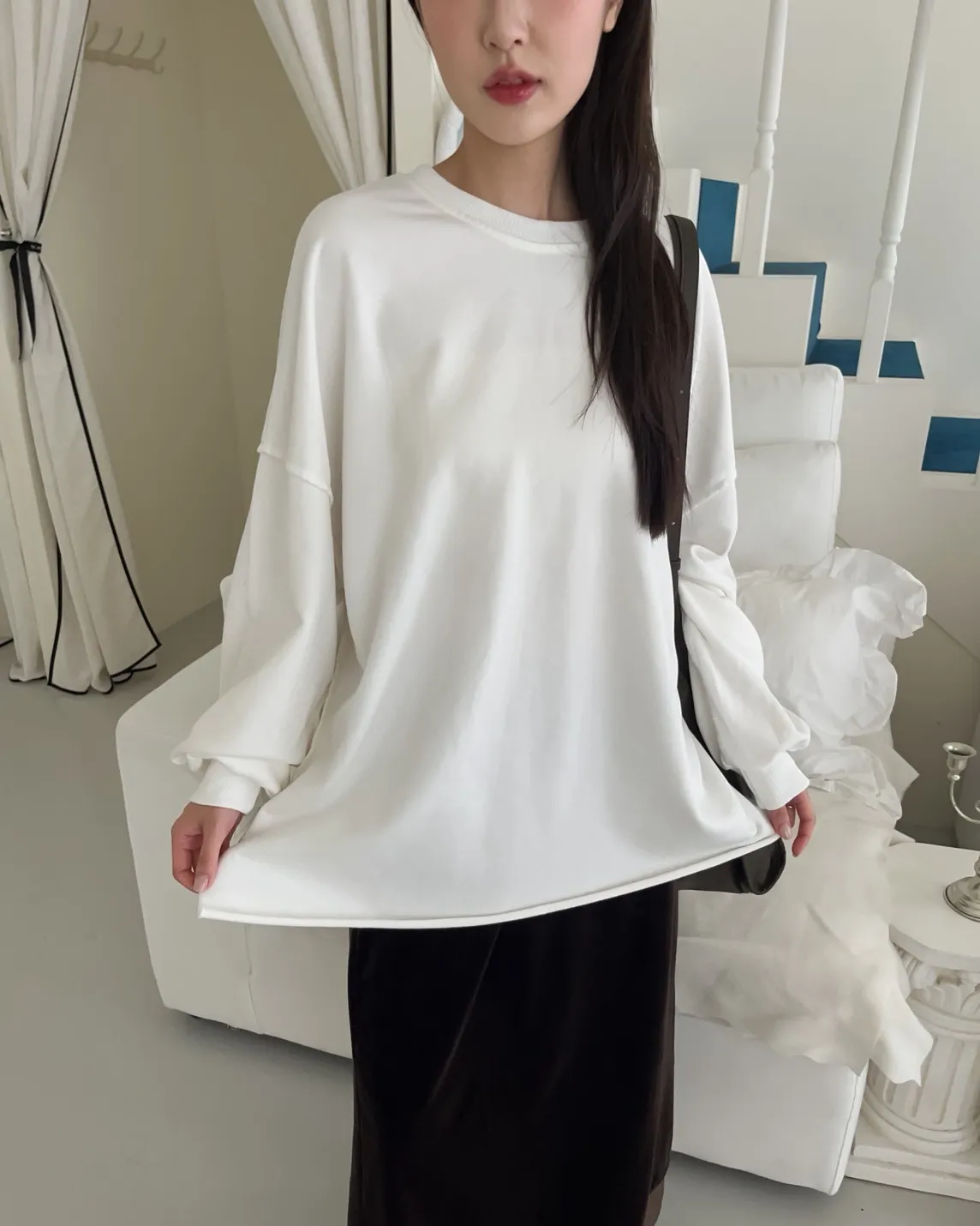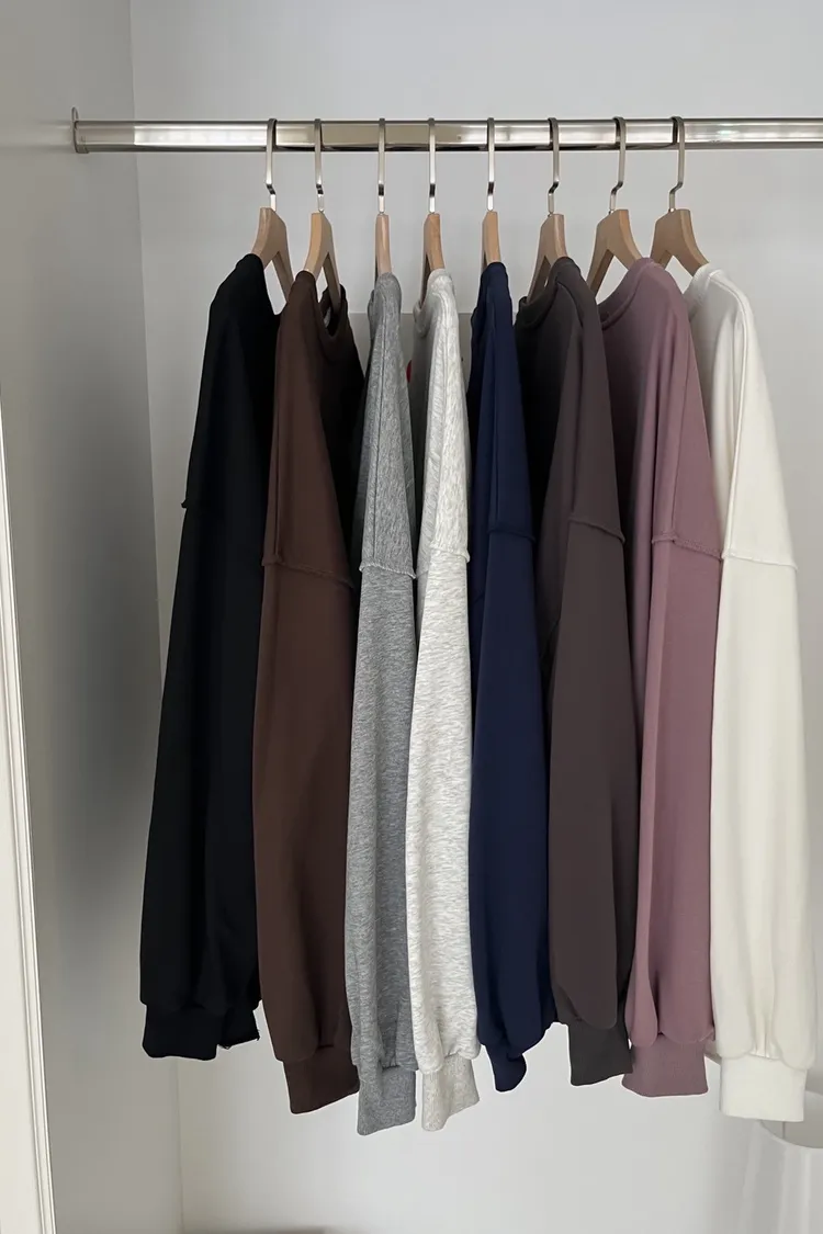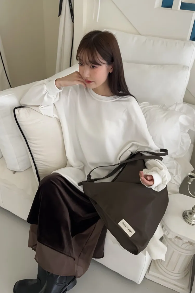 寬鬆落肩 兩側開岔 反車線造型 下擺捲邊 羅紋縮袖口