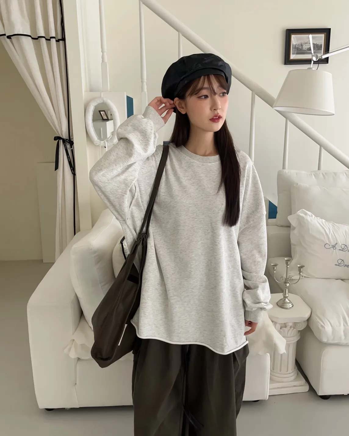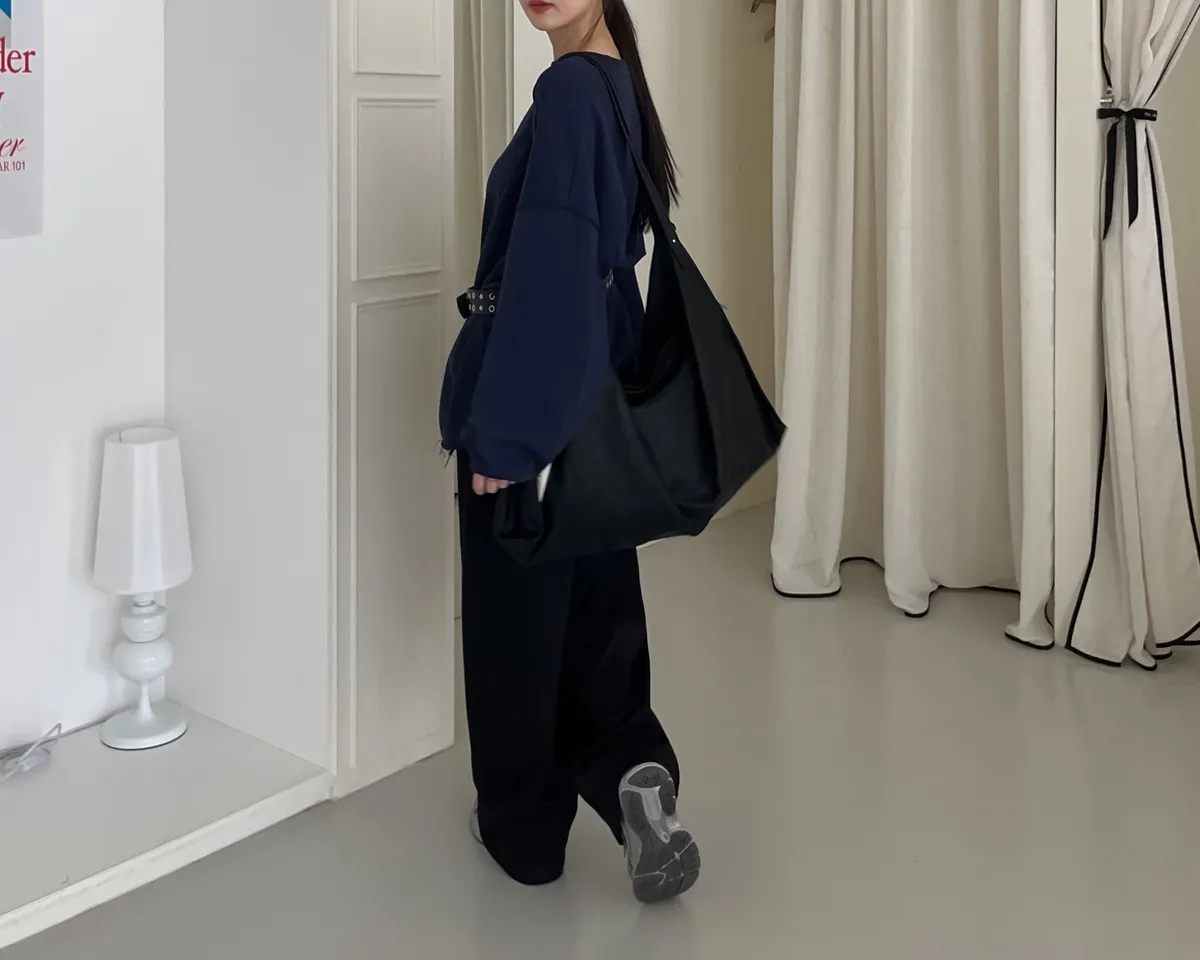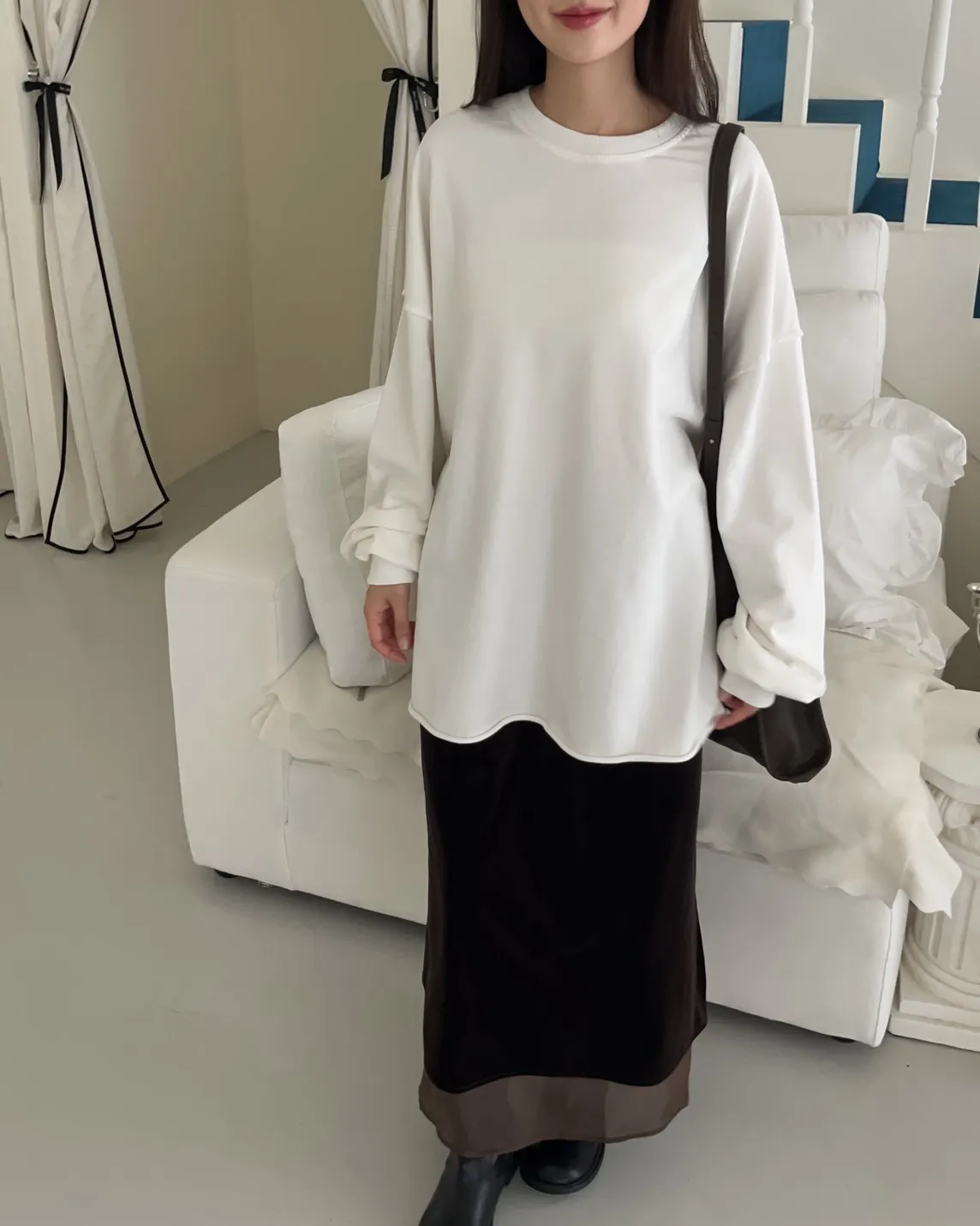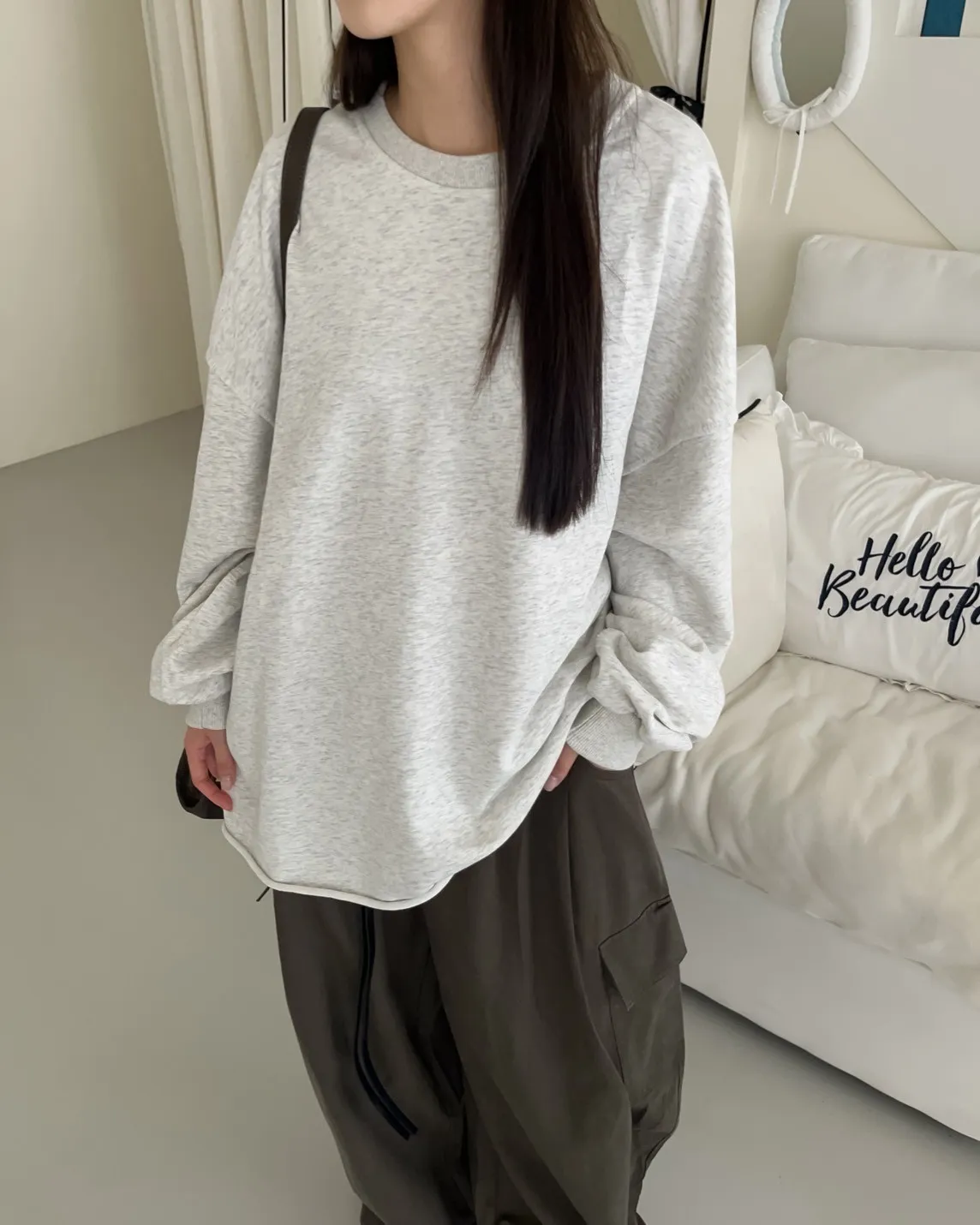 寬鬆落肩 兩側開岔 反車線造型 下擺捲邊 羅紋縮袖口
