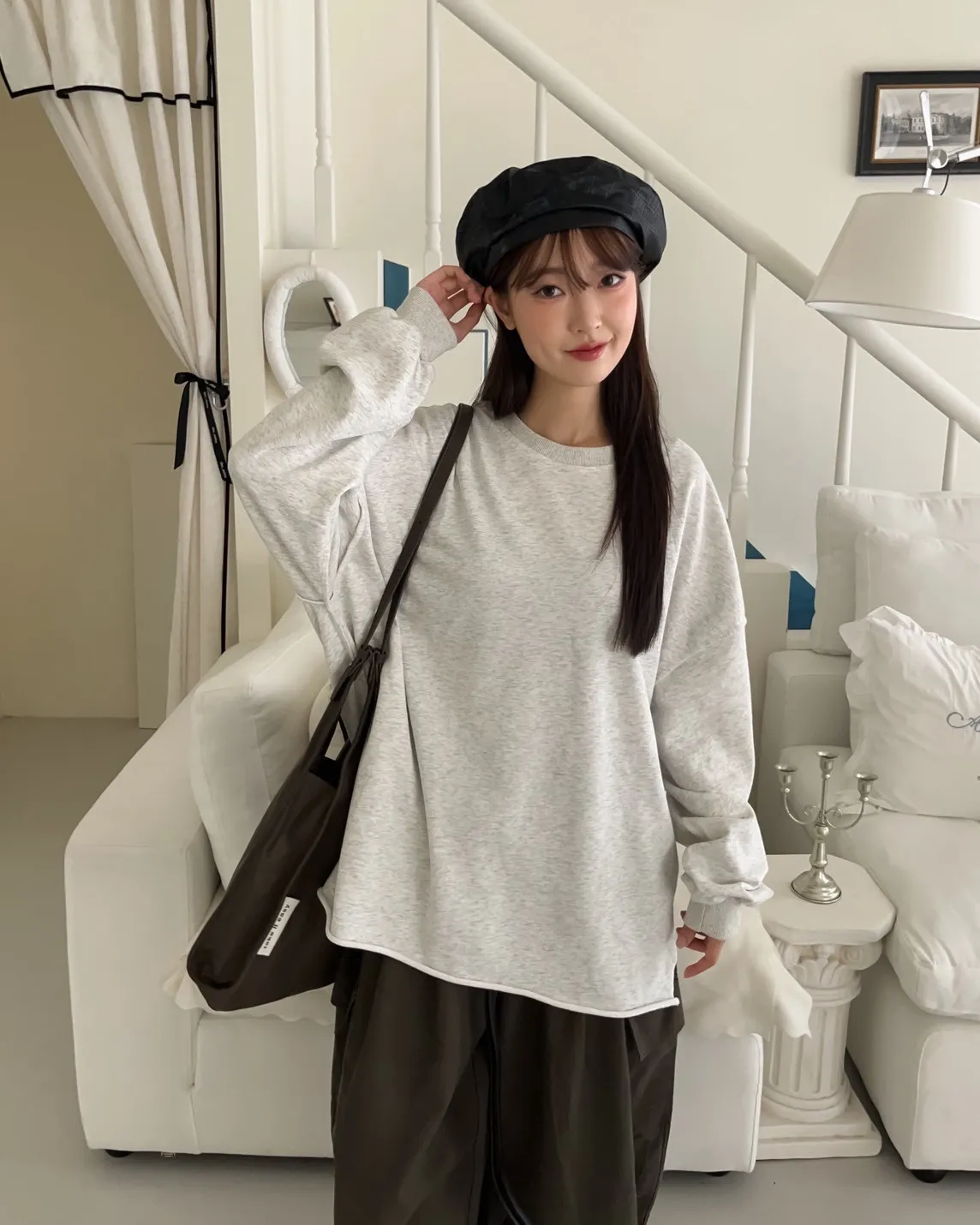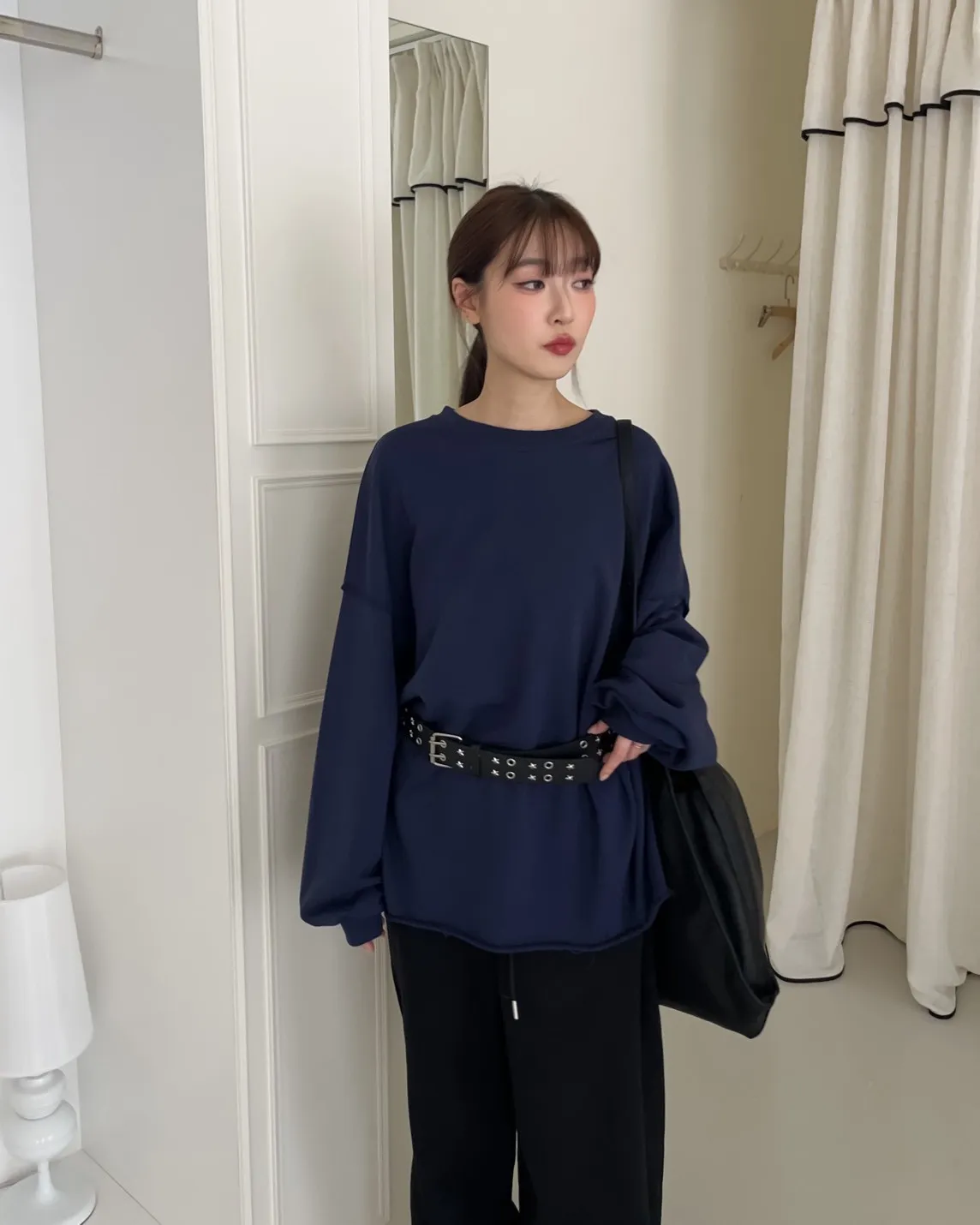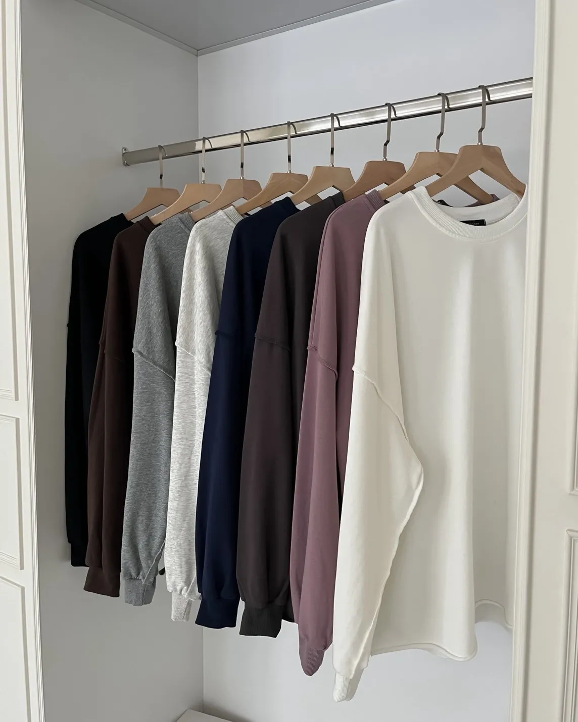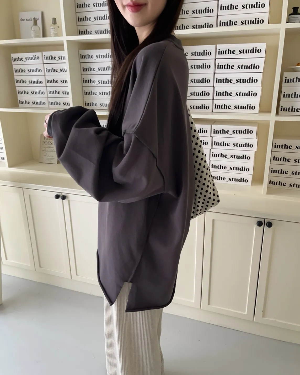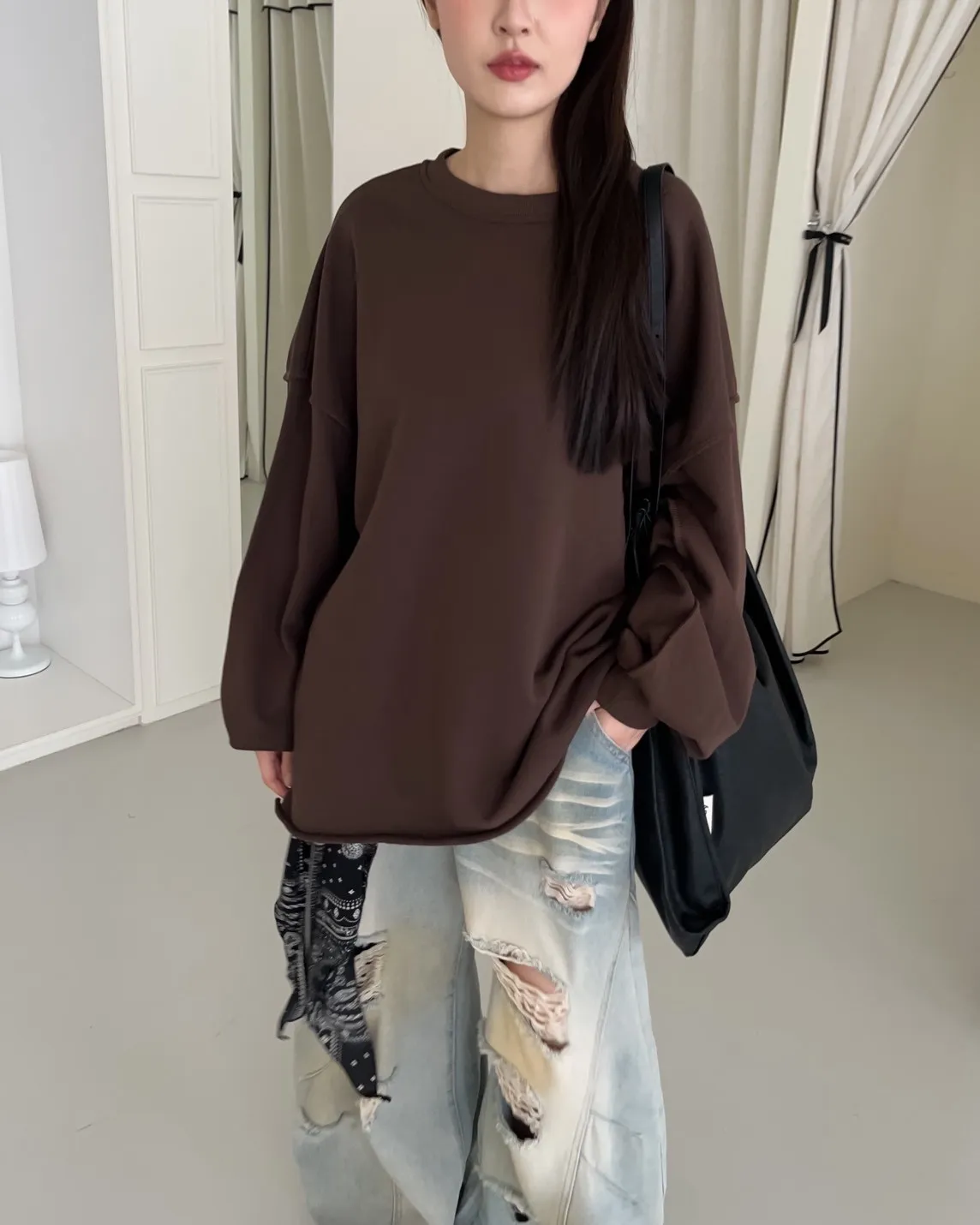寬鬆落肩 兩側開岔 反車線造型 下擺捲邊 羅紋縮袖口