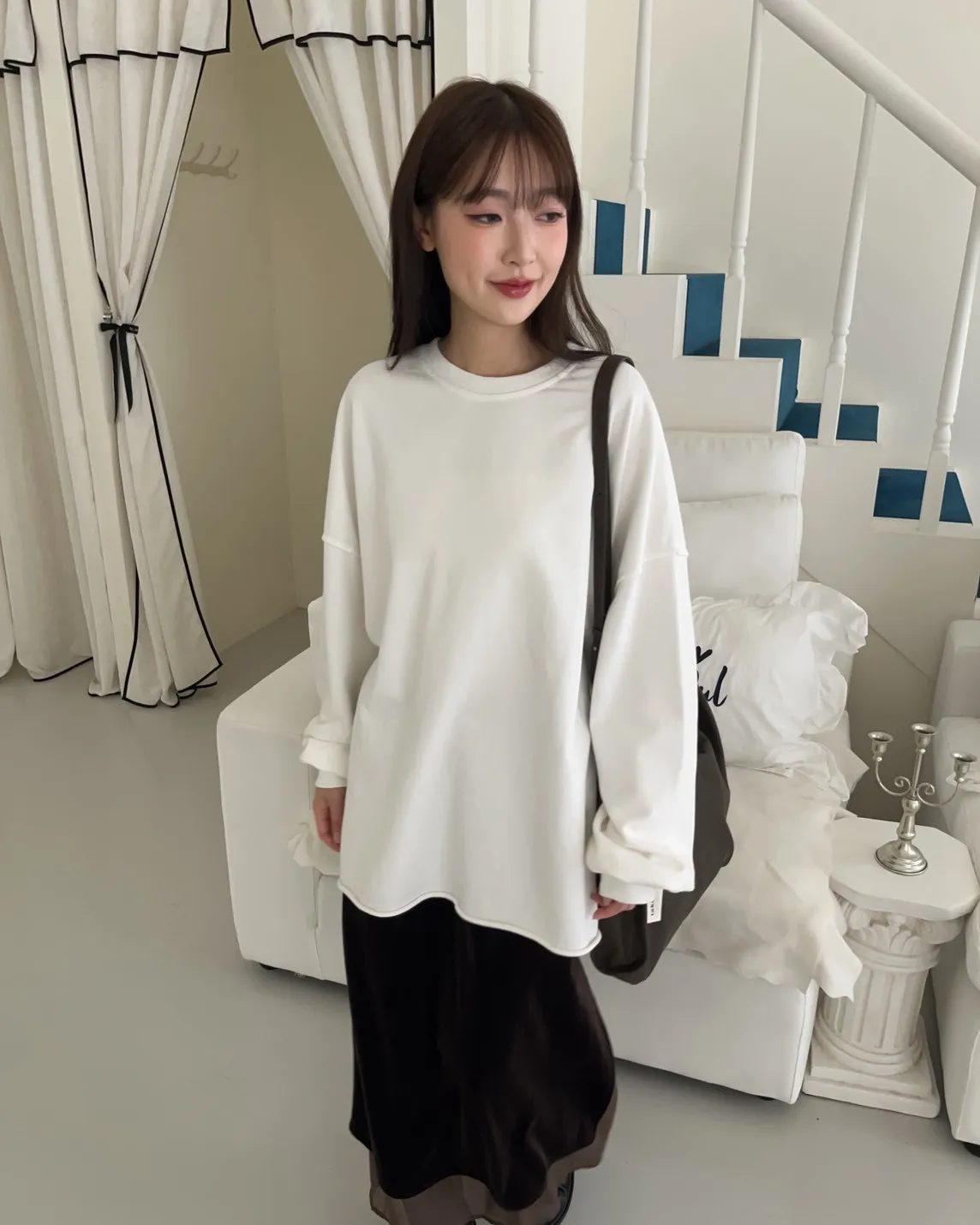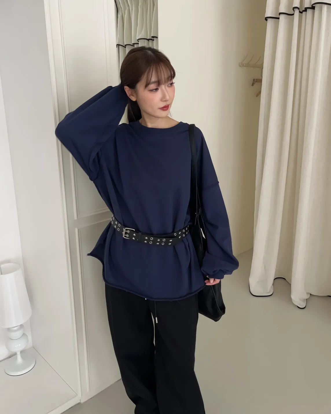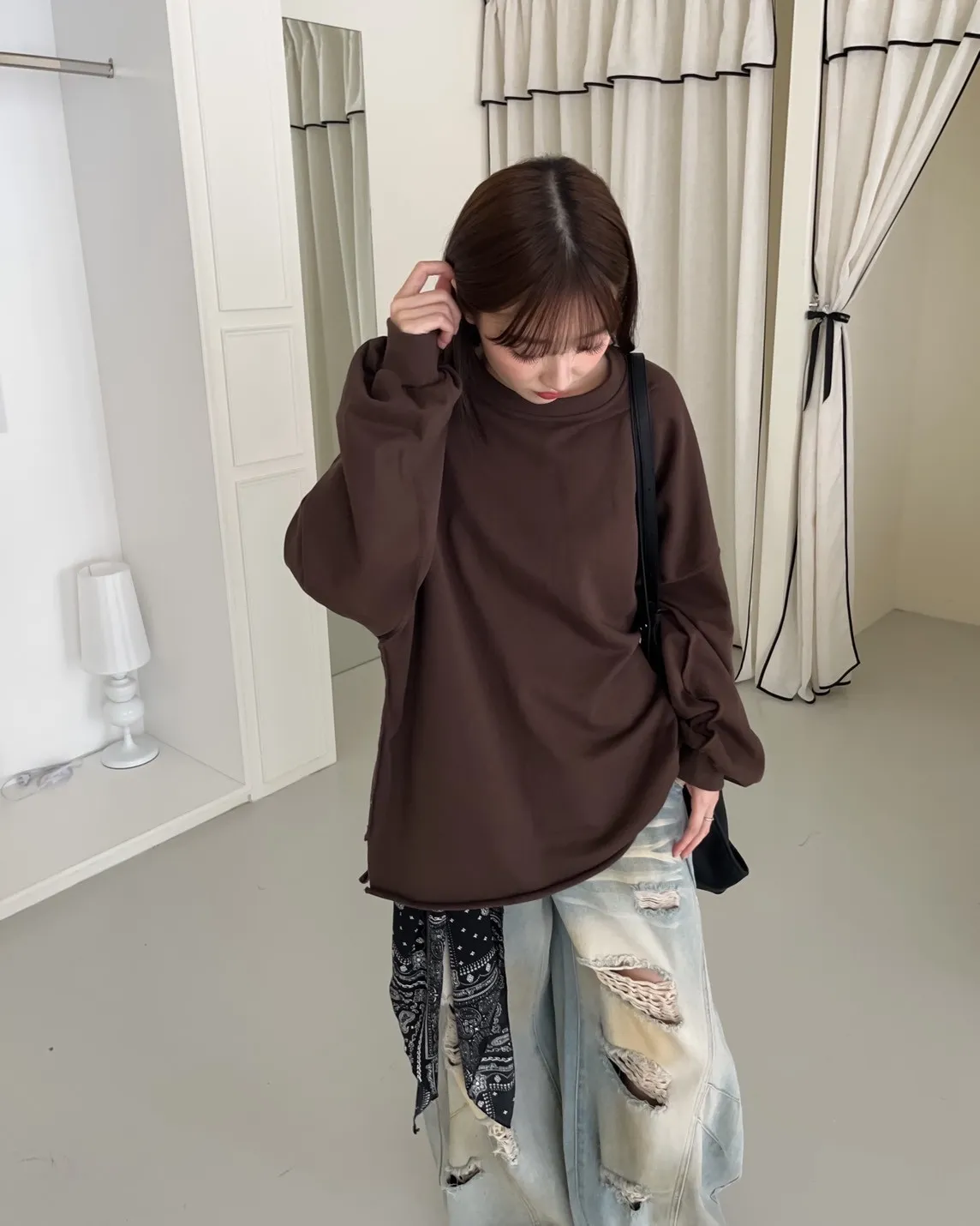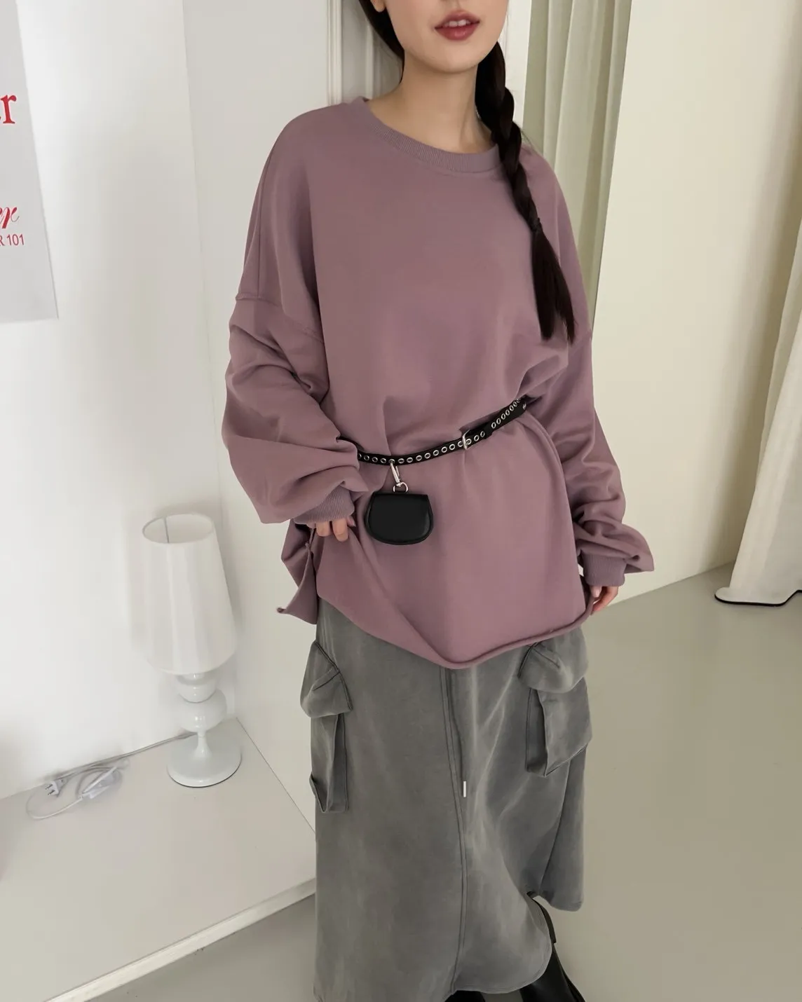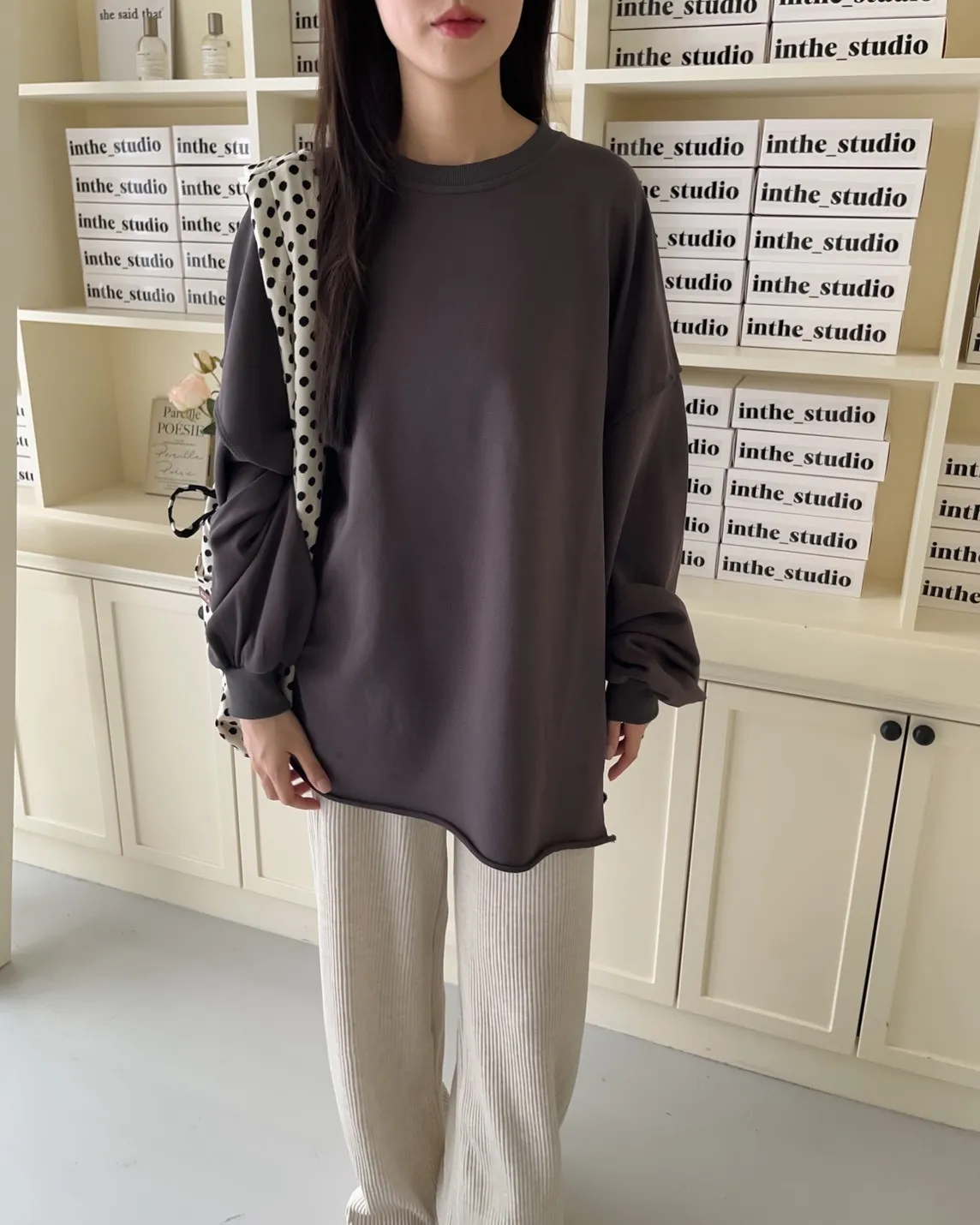 寬鬆落肩 兩側開岔 反車線造型 下擺捲邊 羅紋縮袖口