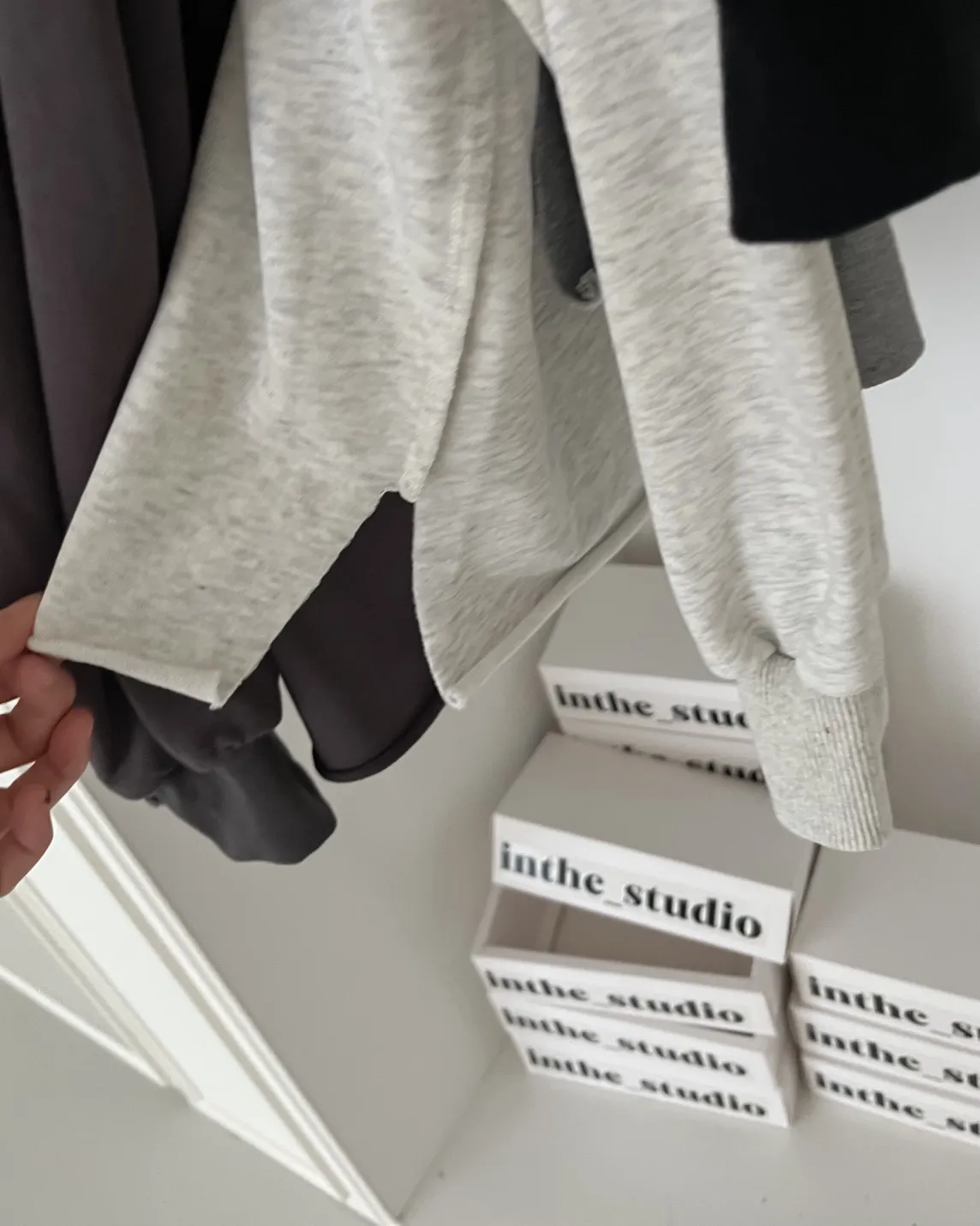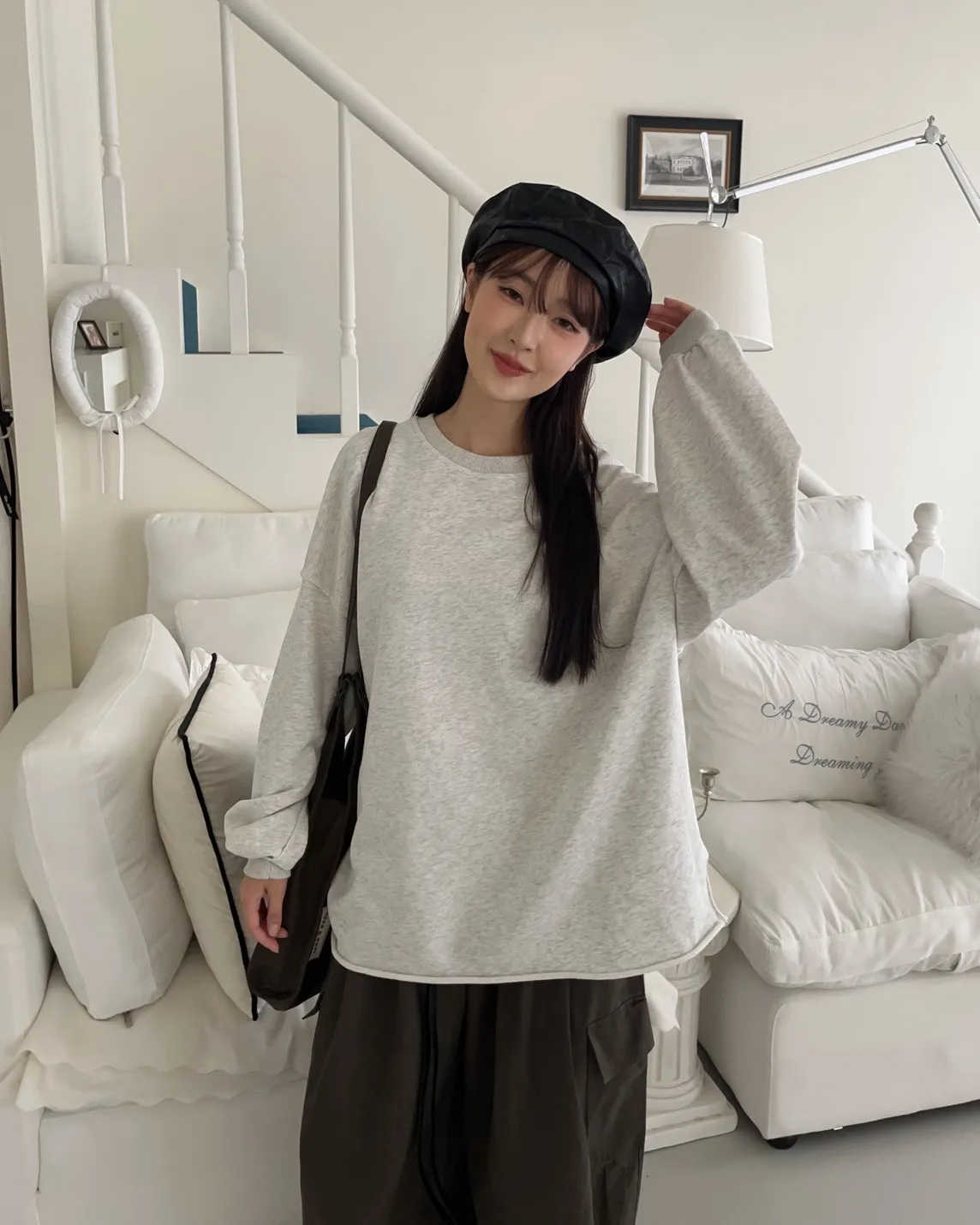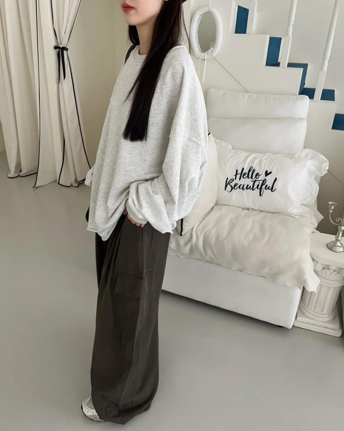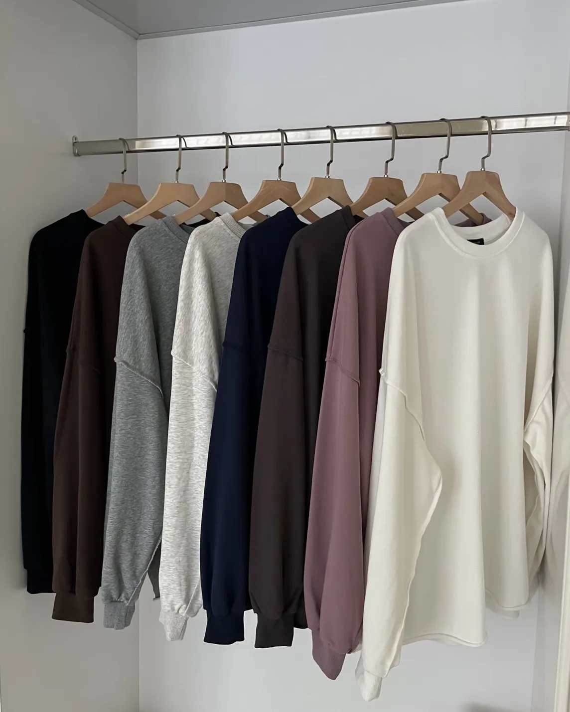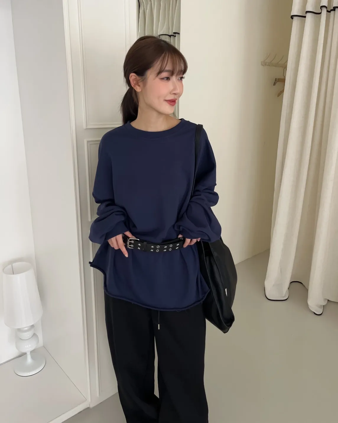 寬鬆落肩 兩側開岔 反車線造型 下擺捲邊 羅紋縮袖口