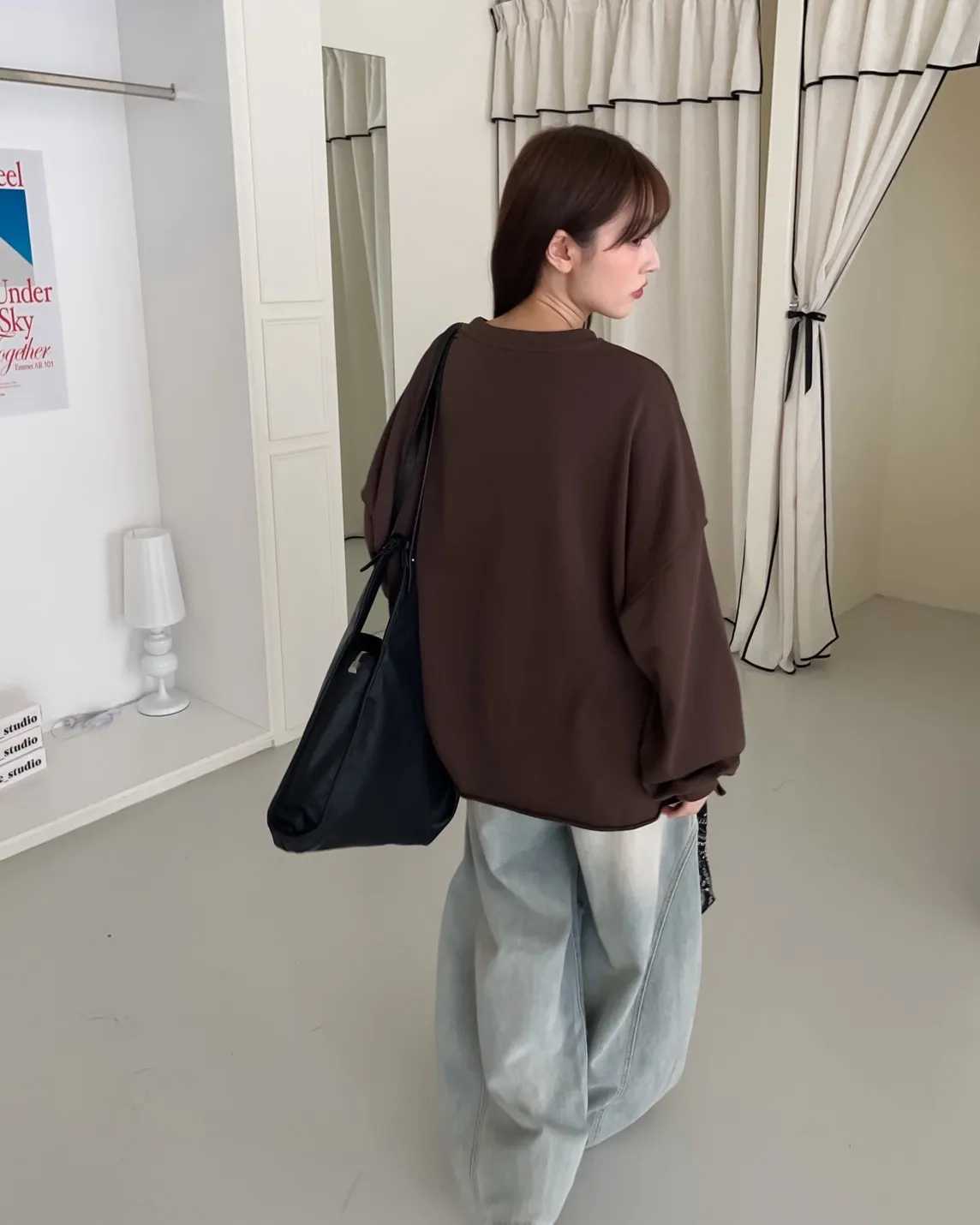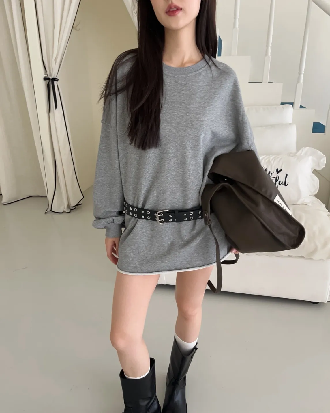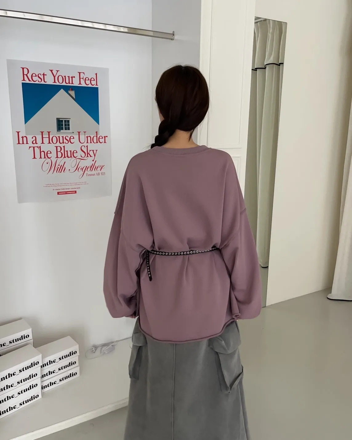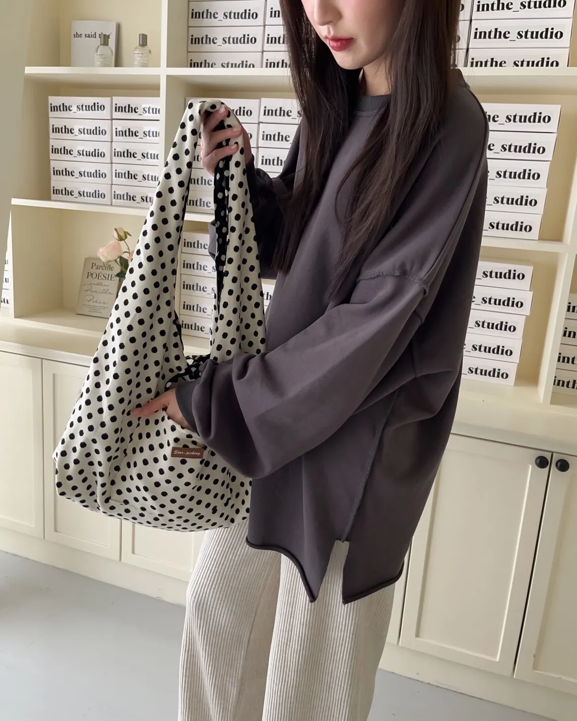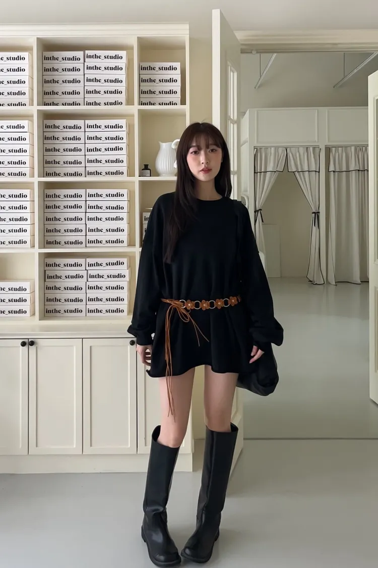寬鬆落肩 兩側開岔 反車線造型 下擺捲邊 羅紋縮袖口