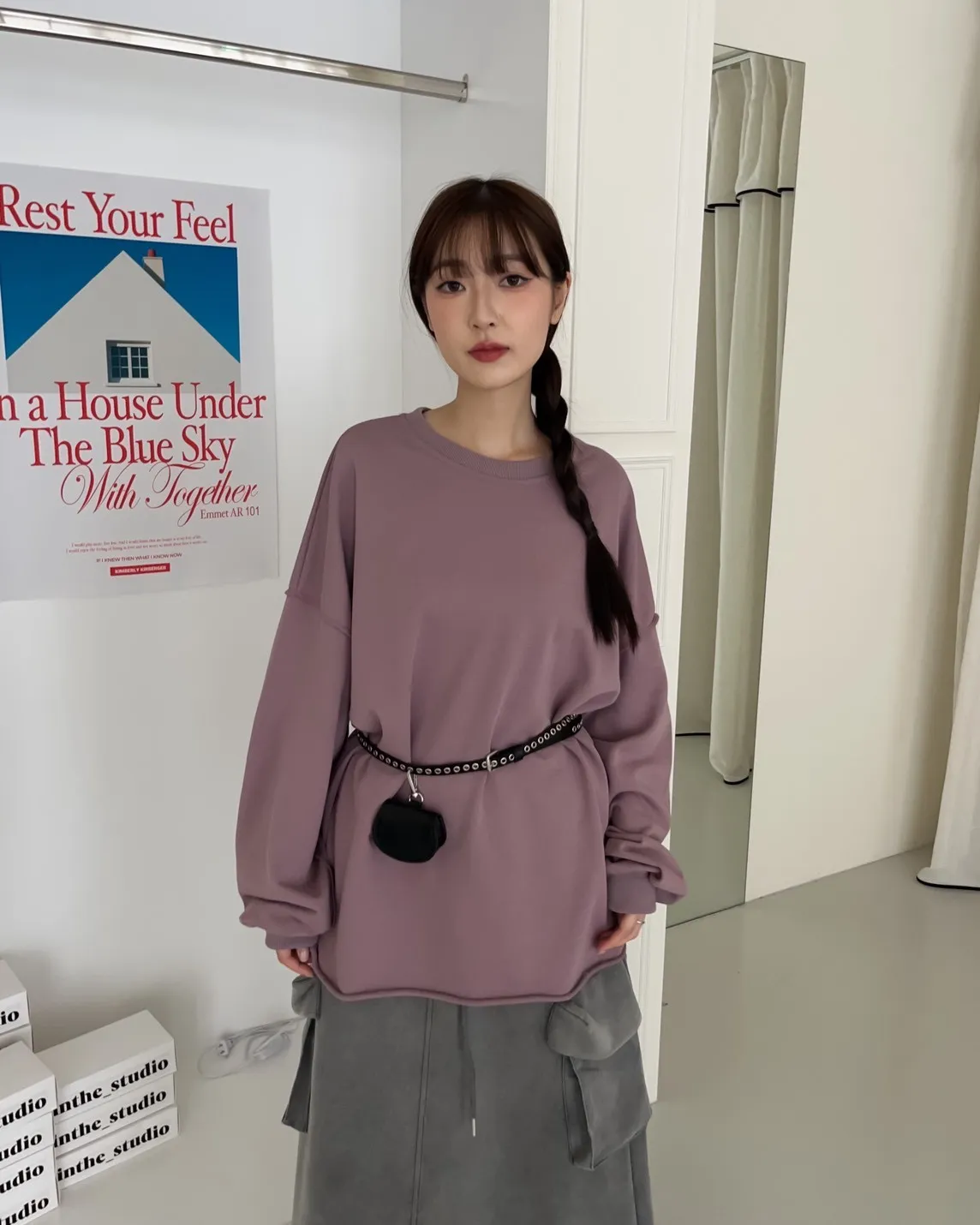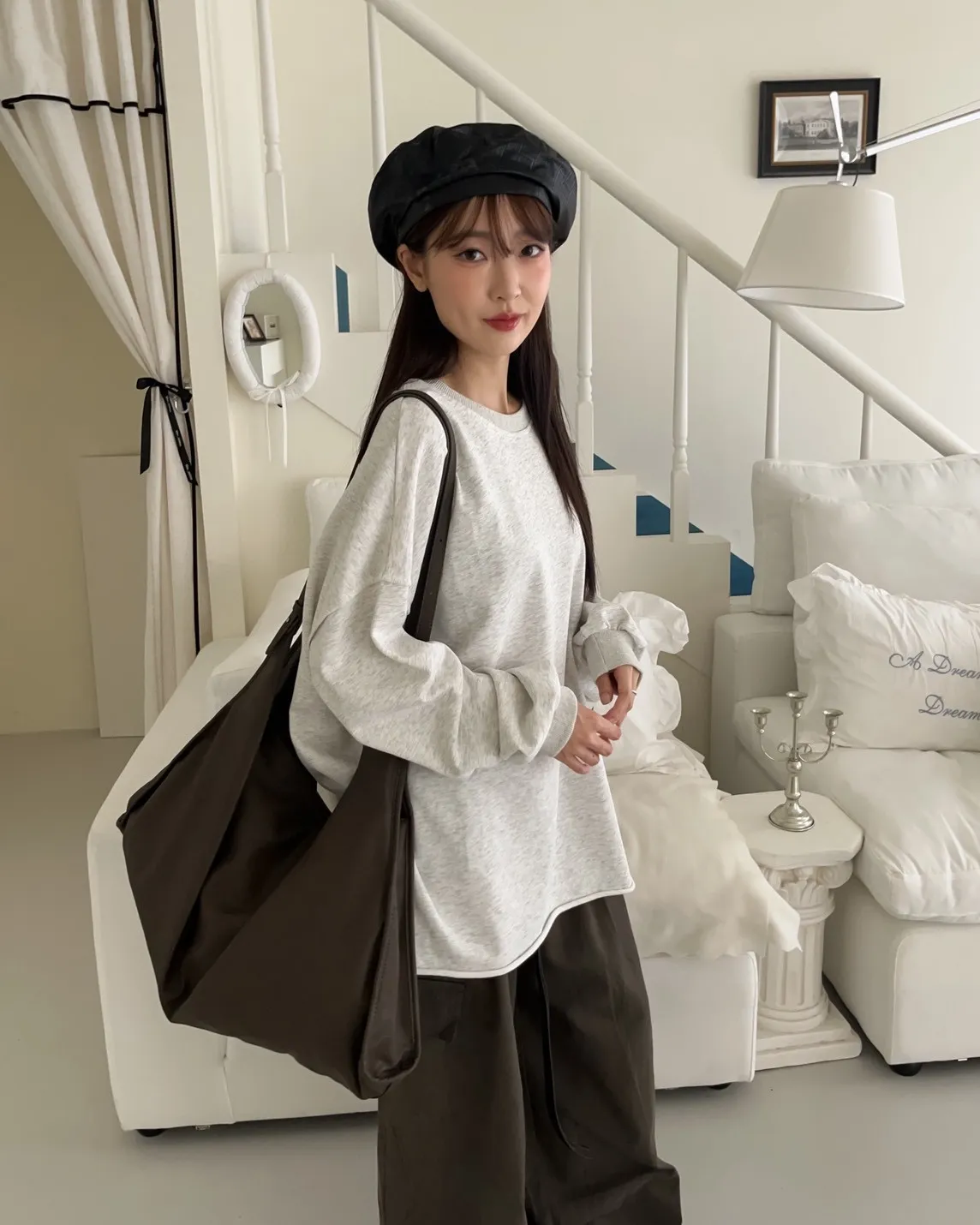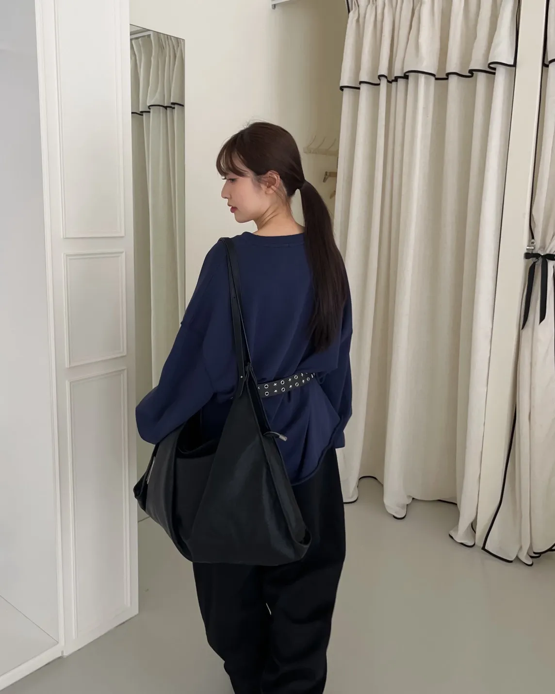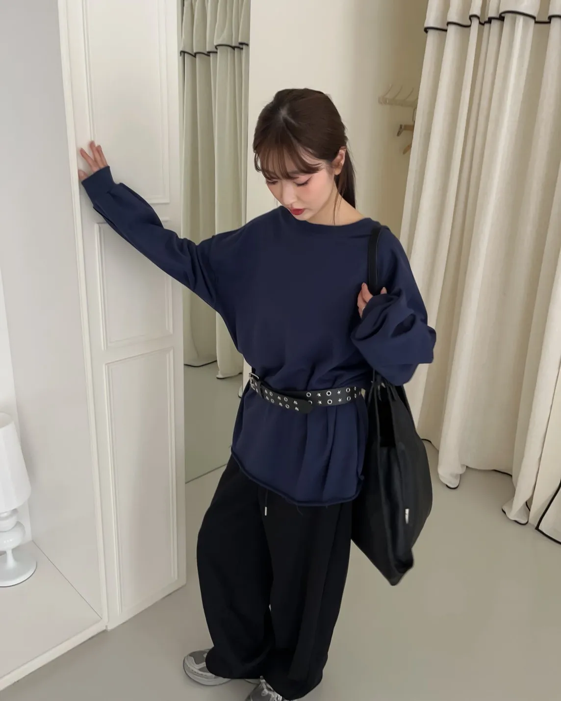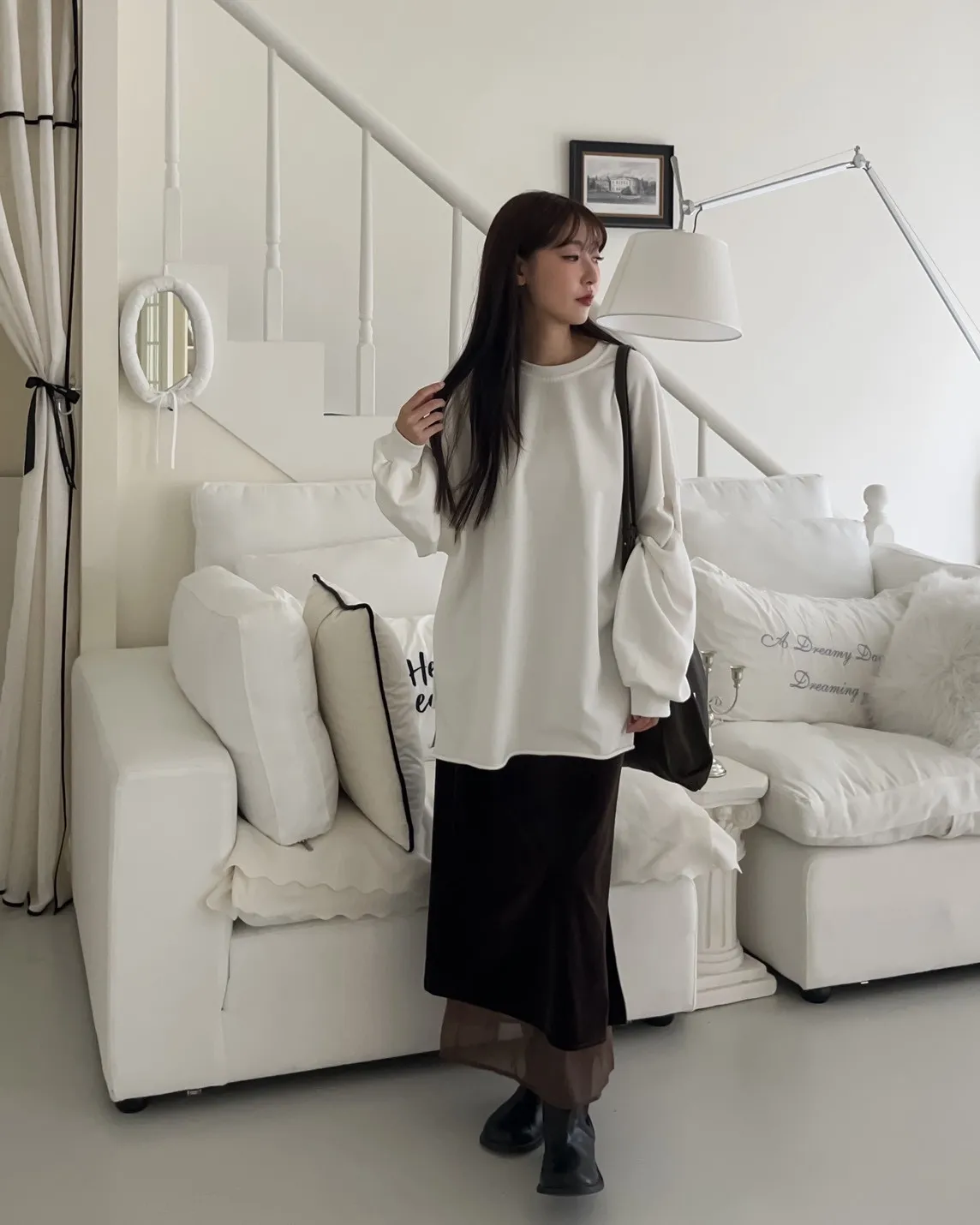 寬鬆落肩 兩側開岔 反車線造型 下擺捲邊 羅紋縮袖口