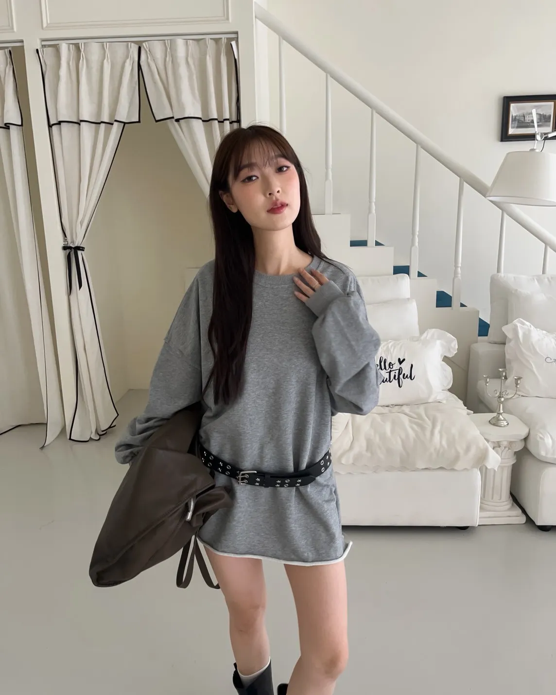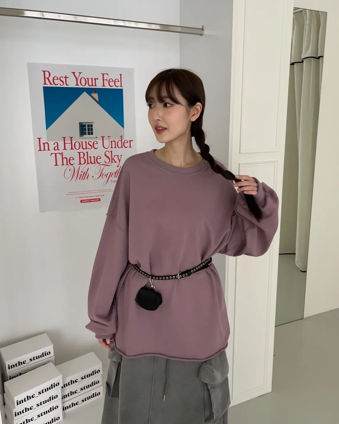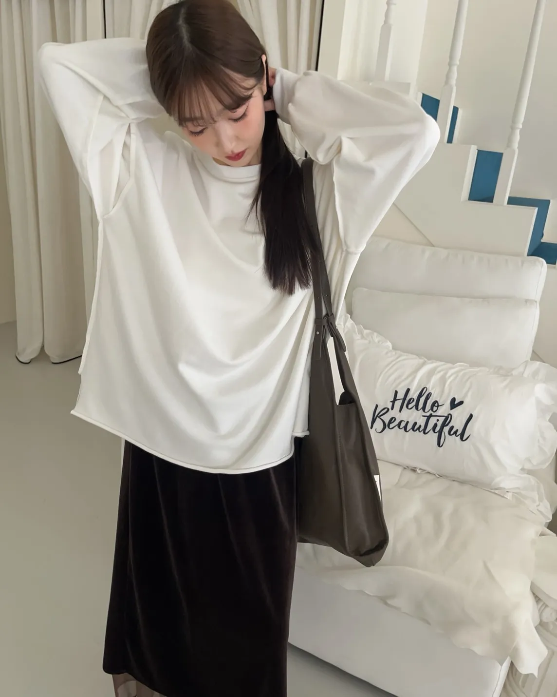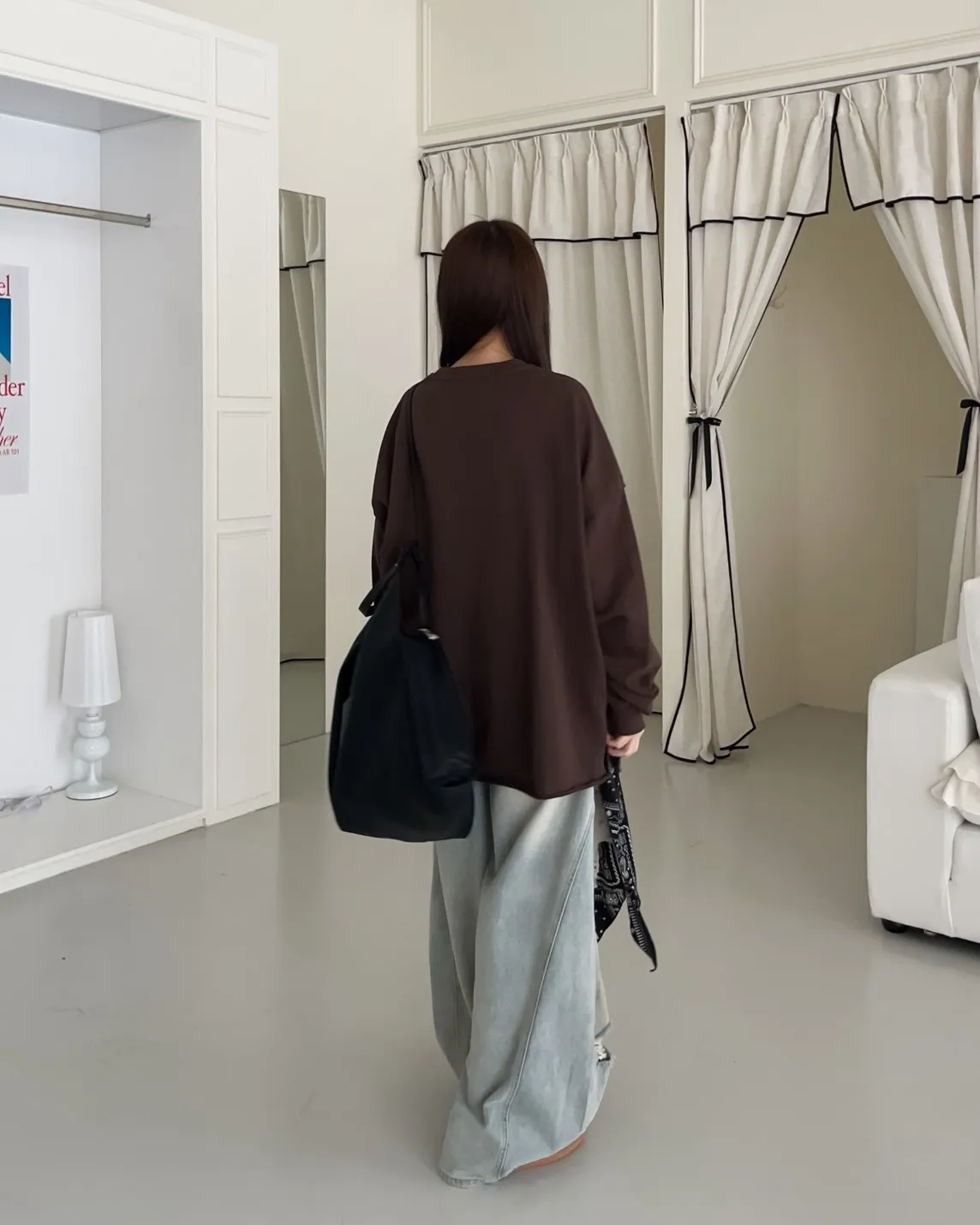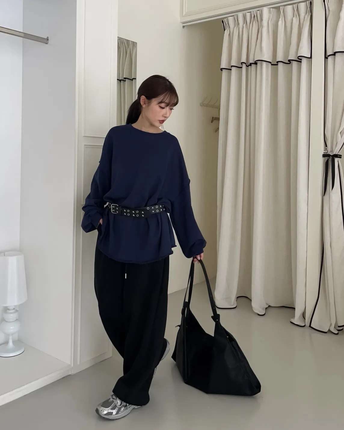 寬鬆落肩 兩側開岔 反車線造型 下擺捲邊 羅紋縮袖口