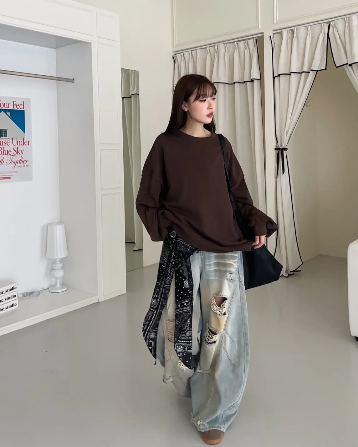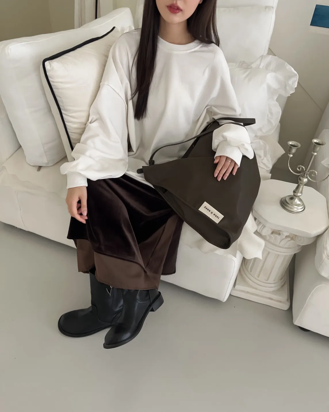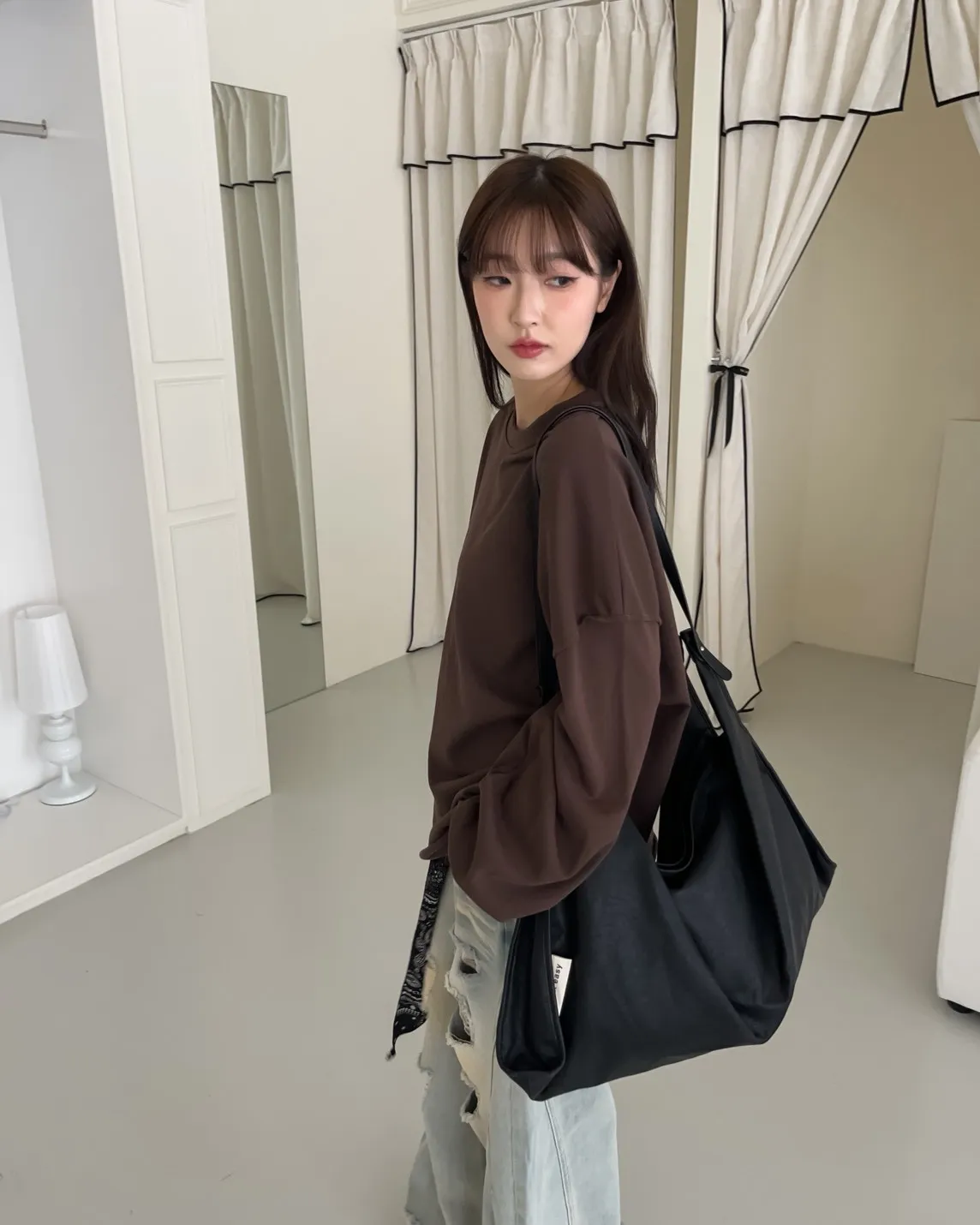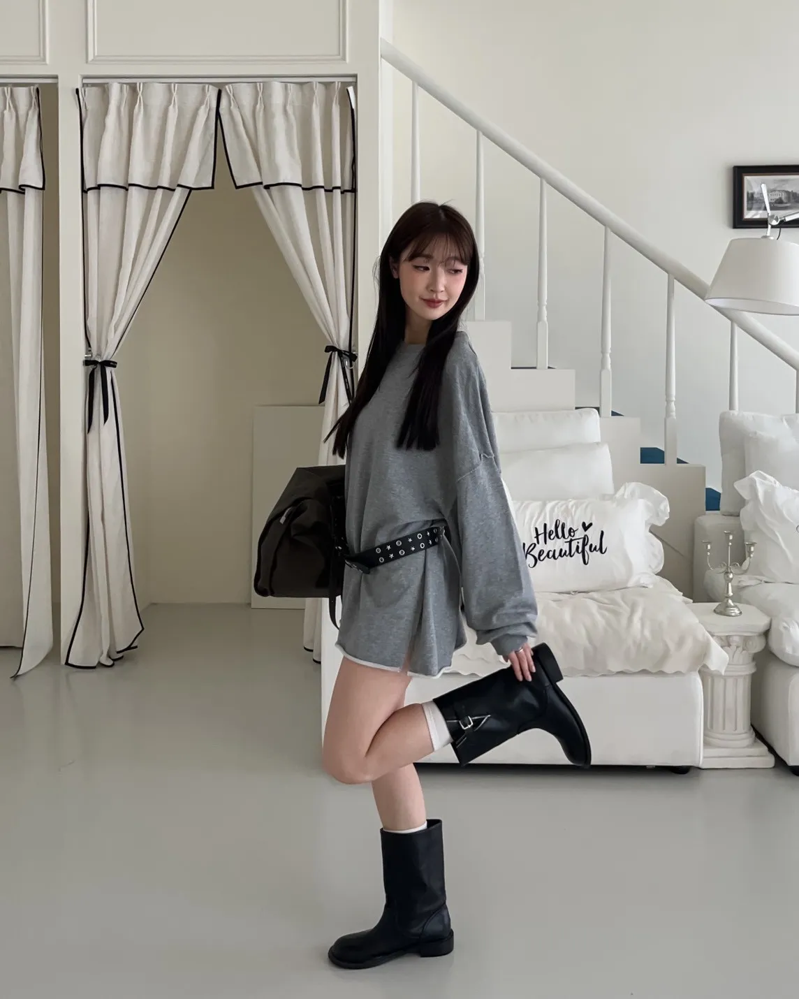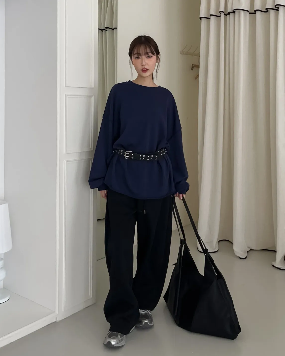 寬鬆落肩 兩側開岔 反車線造型 下擺捲邊 羅紋縮袖口