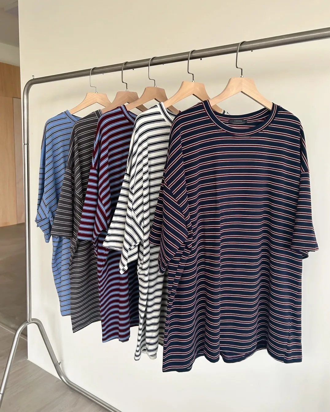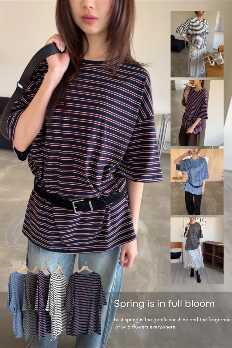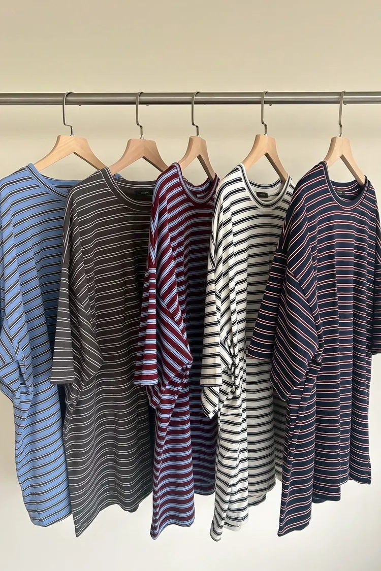 A0055(五色)經典撞色條紋寬鬆大T(米/灰綠/紅/淺藍/深藍)