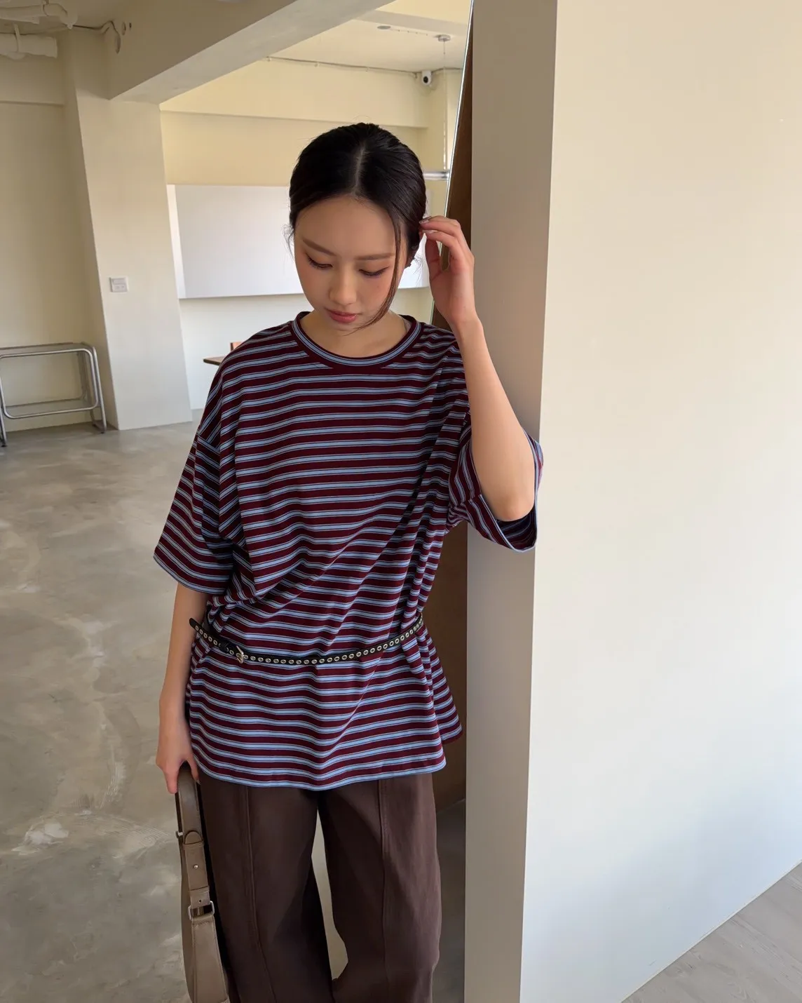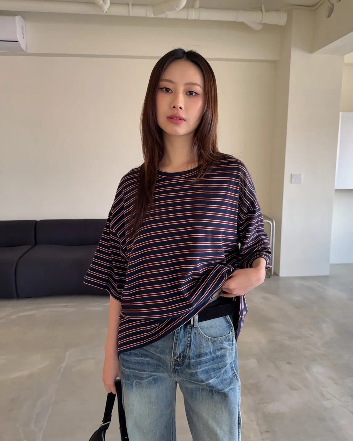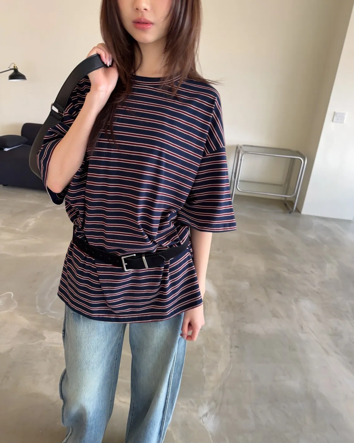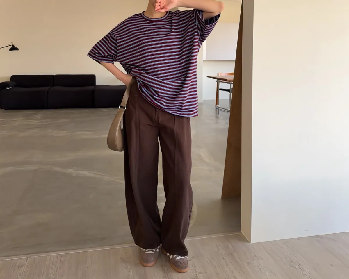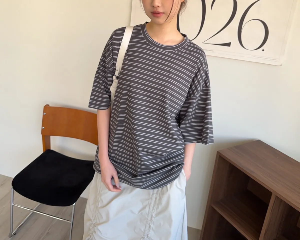 薄棉料 撞色橫條紋 寬鬆落肩