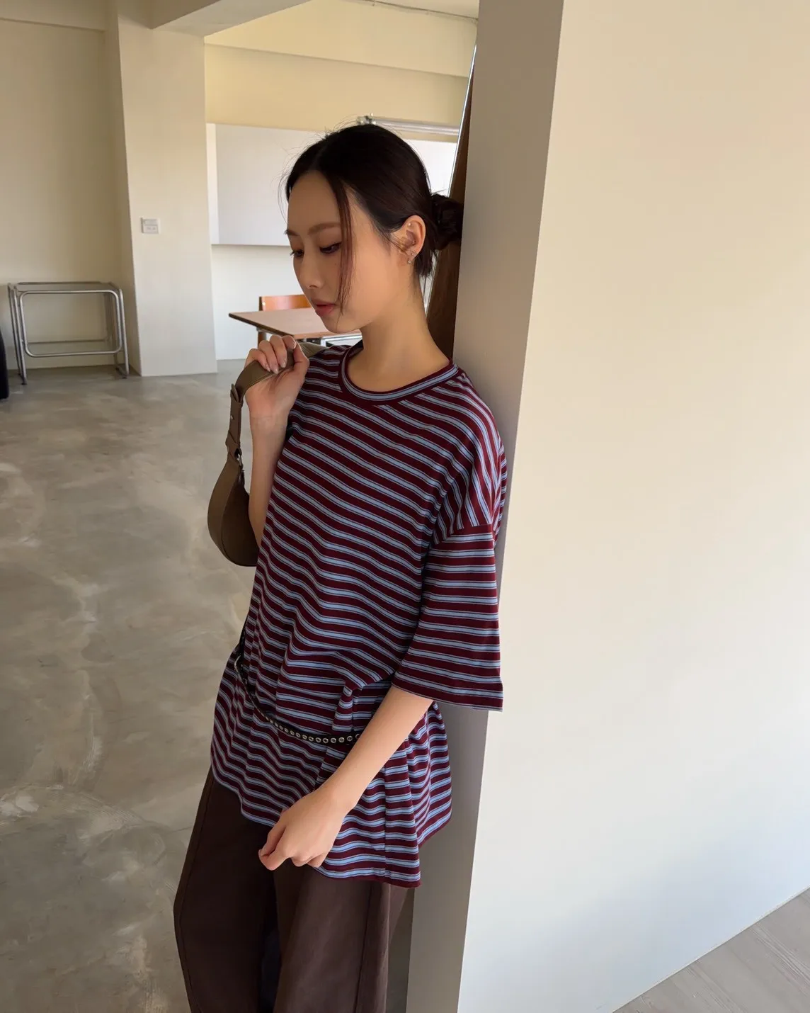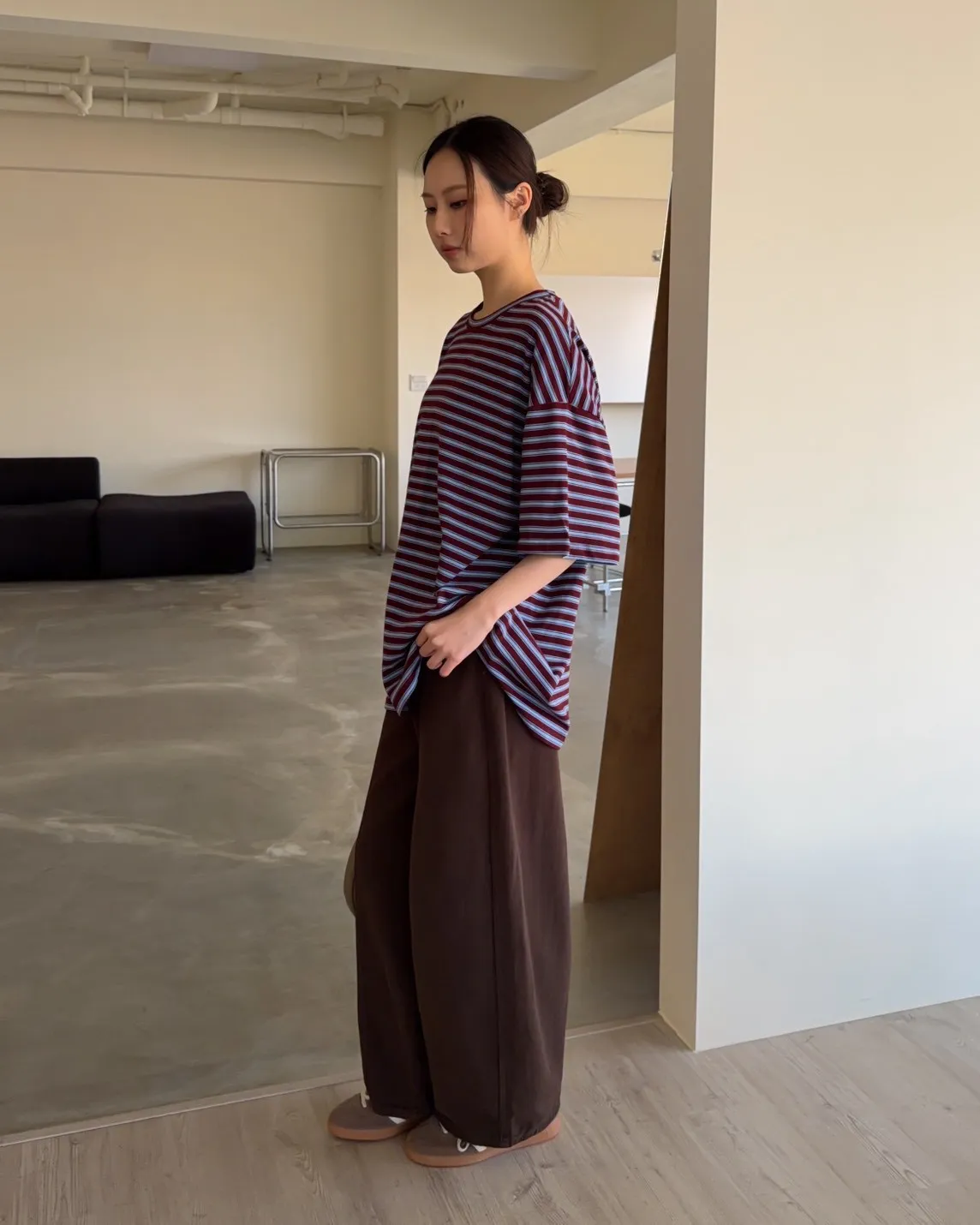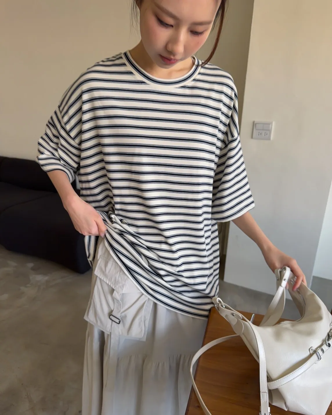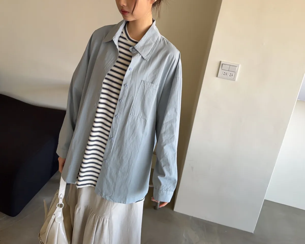 薄棉料 撞色橫條紋 寬鬆落肩