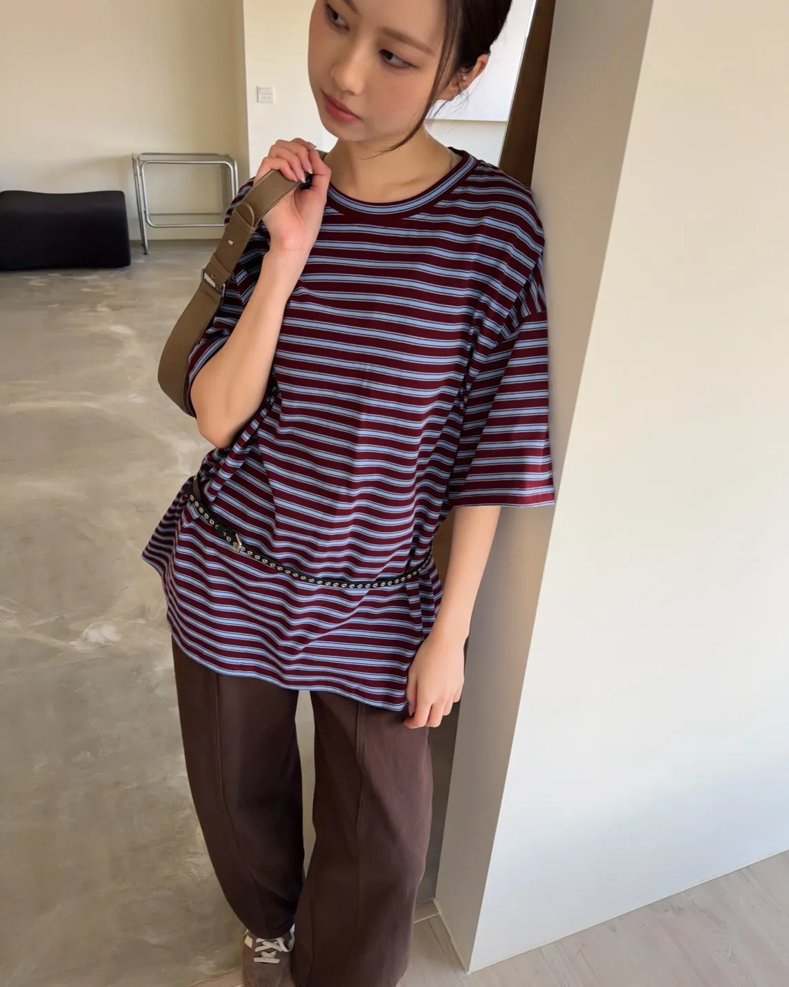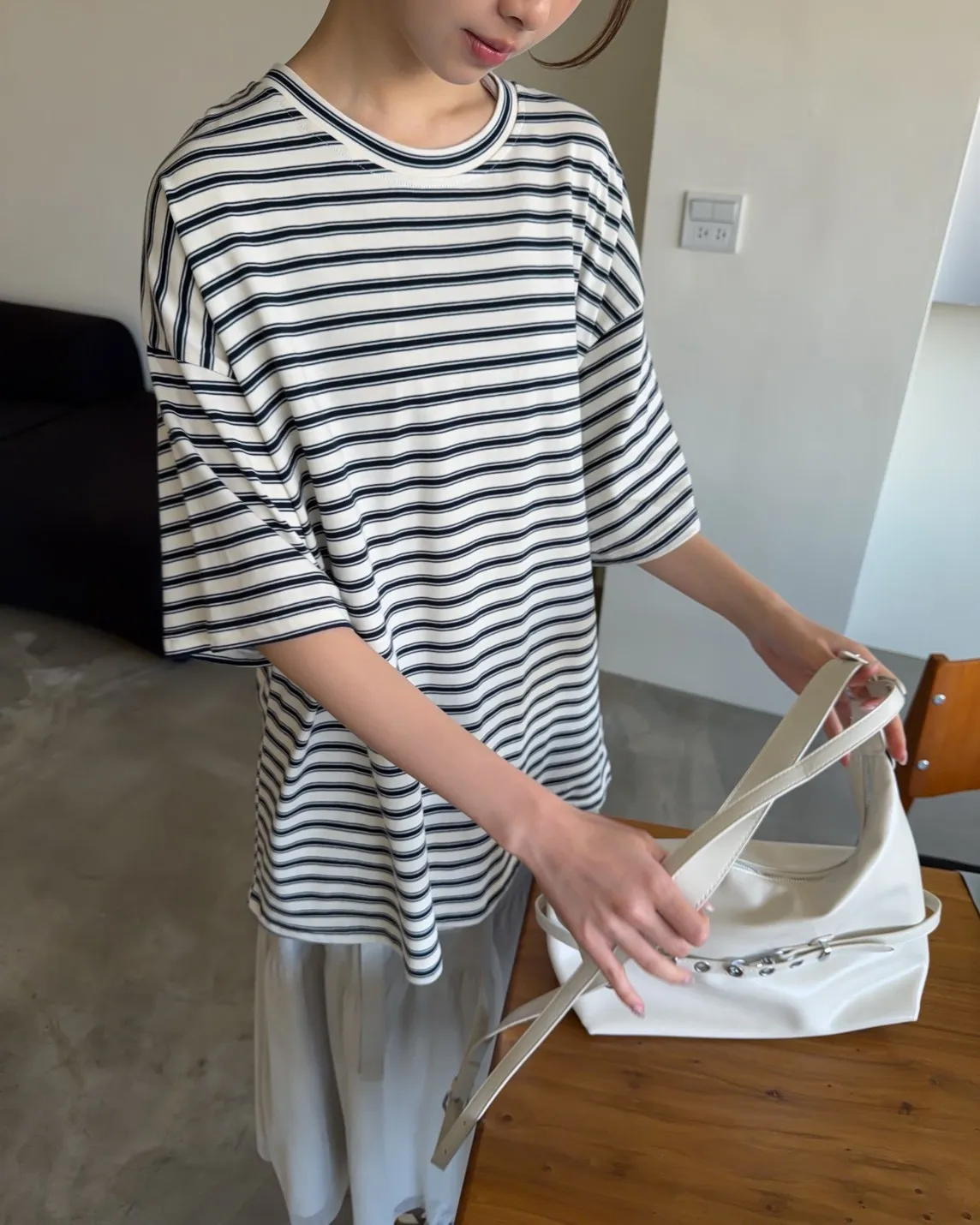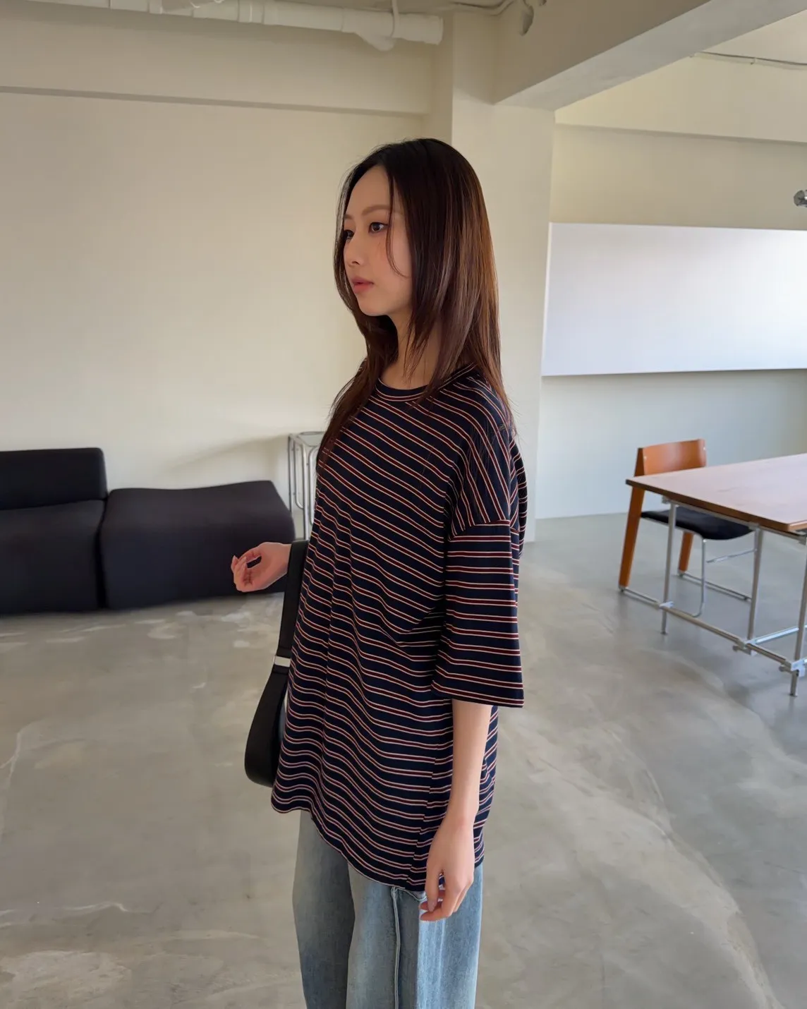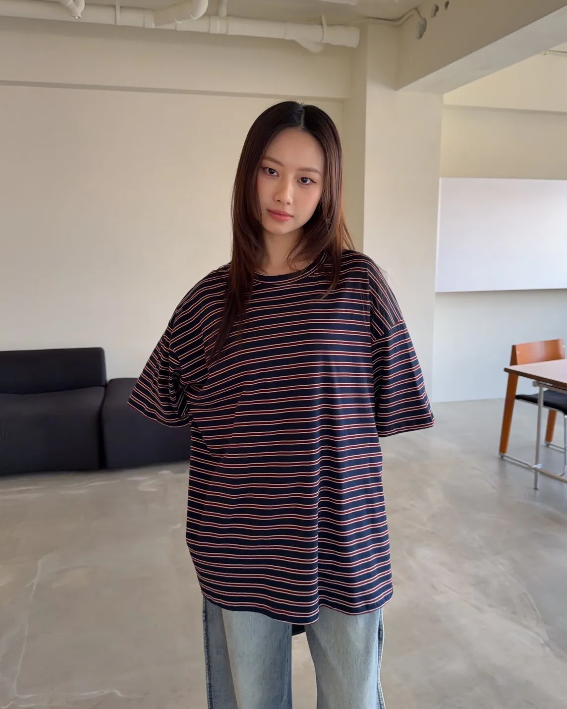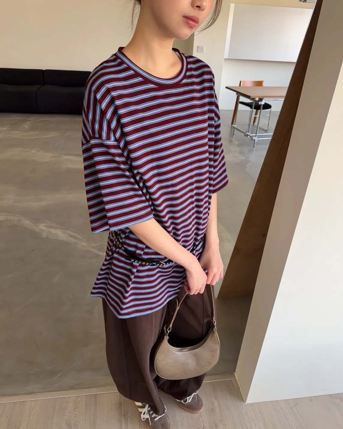 薄棉料 撞色橫條紋 寬鬆落肩