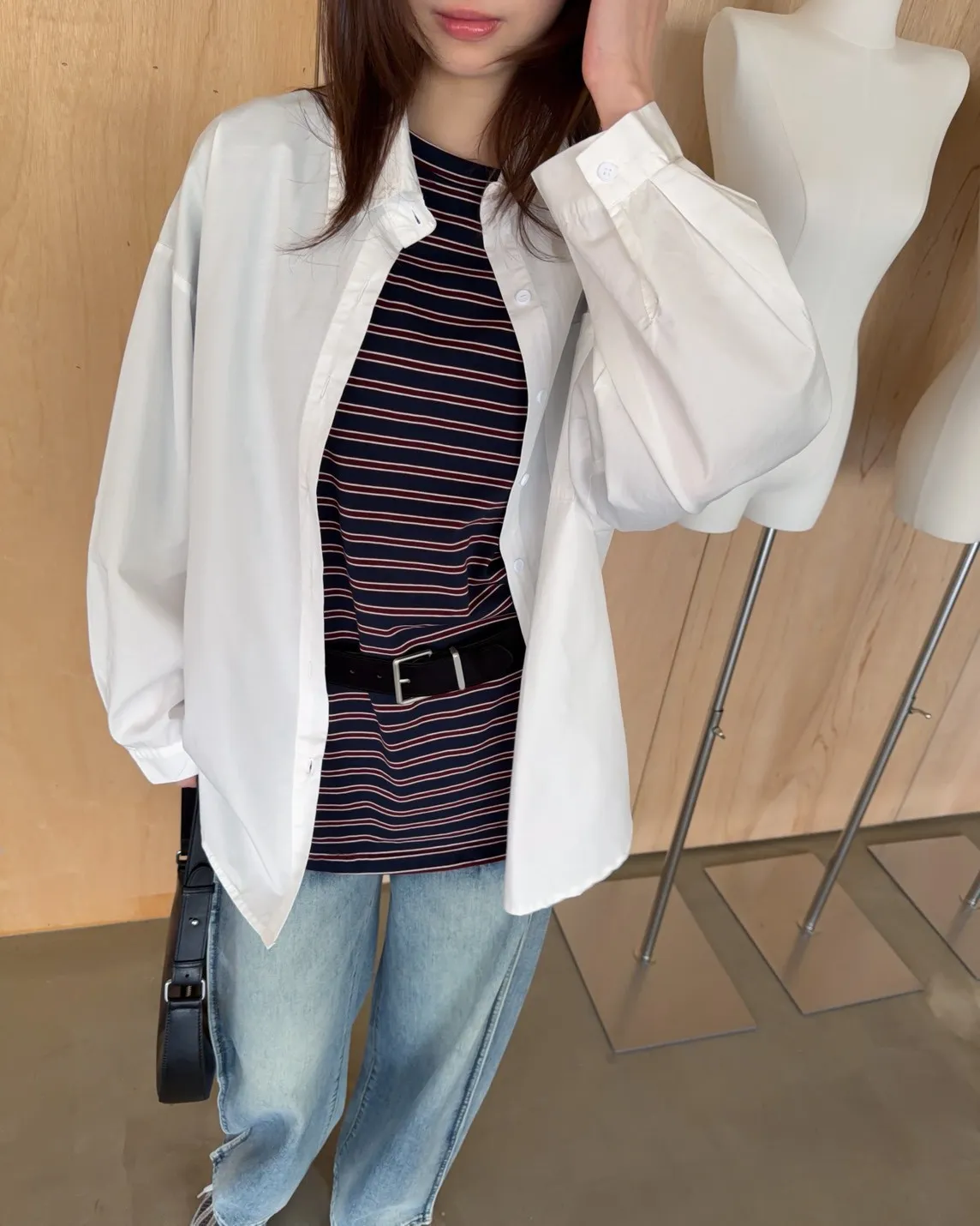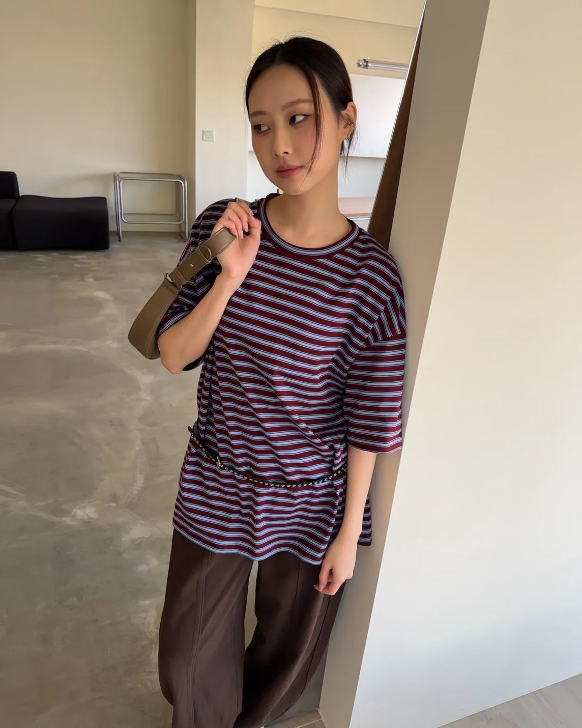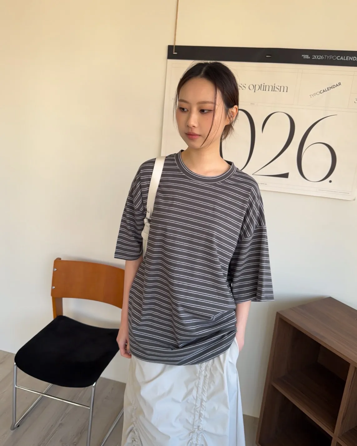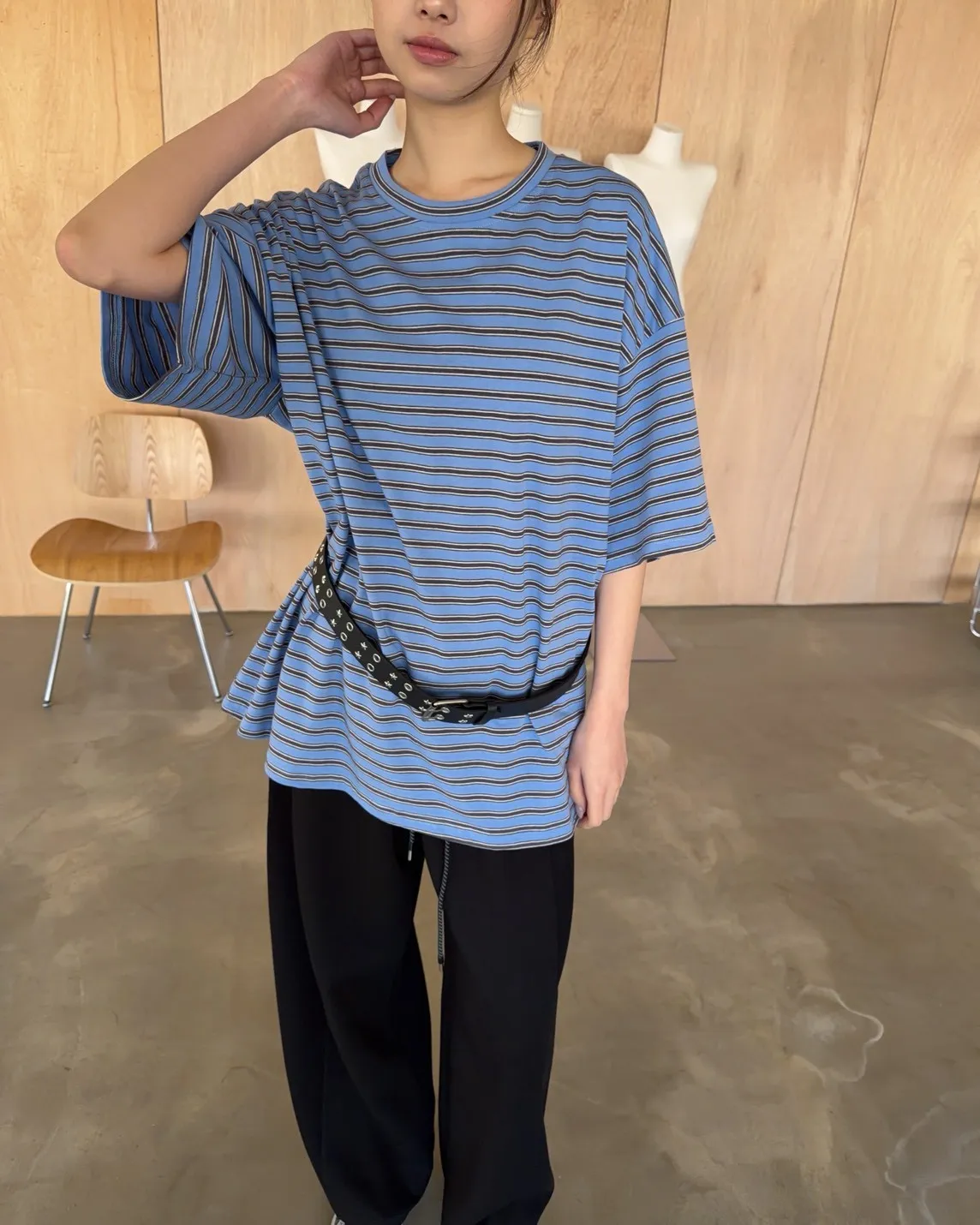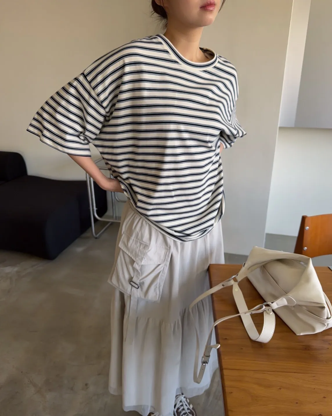 薄棉料 撞色橫條紋 寬鬆落肩