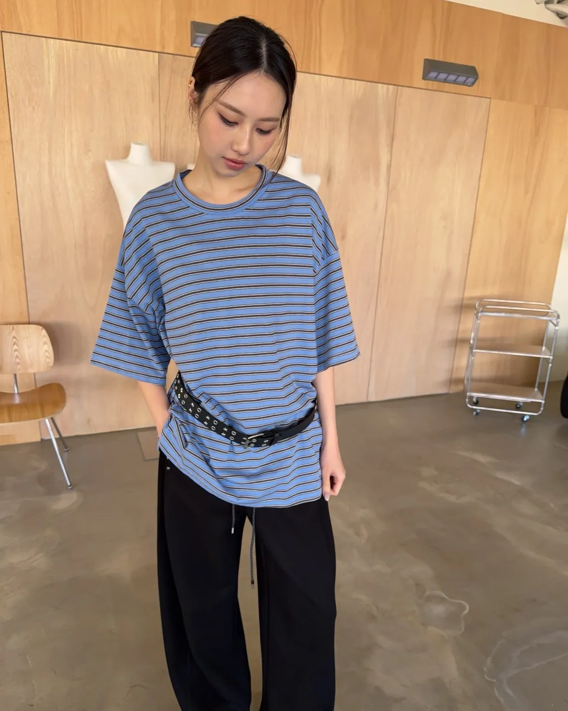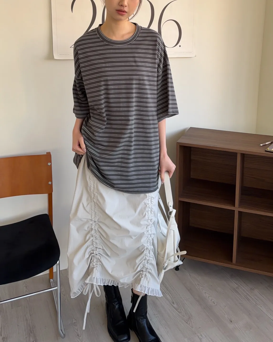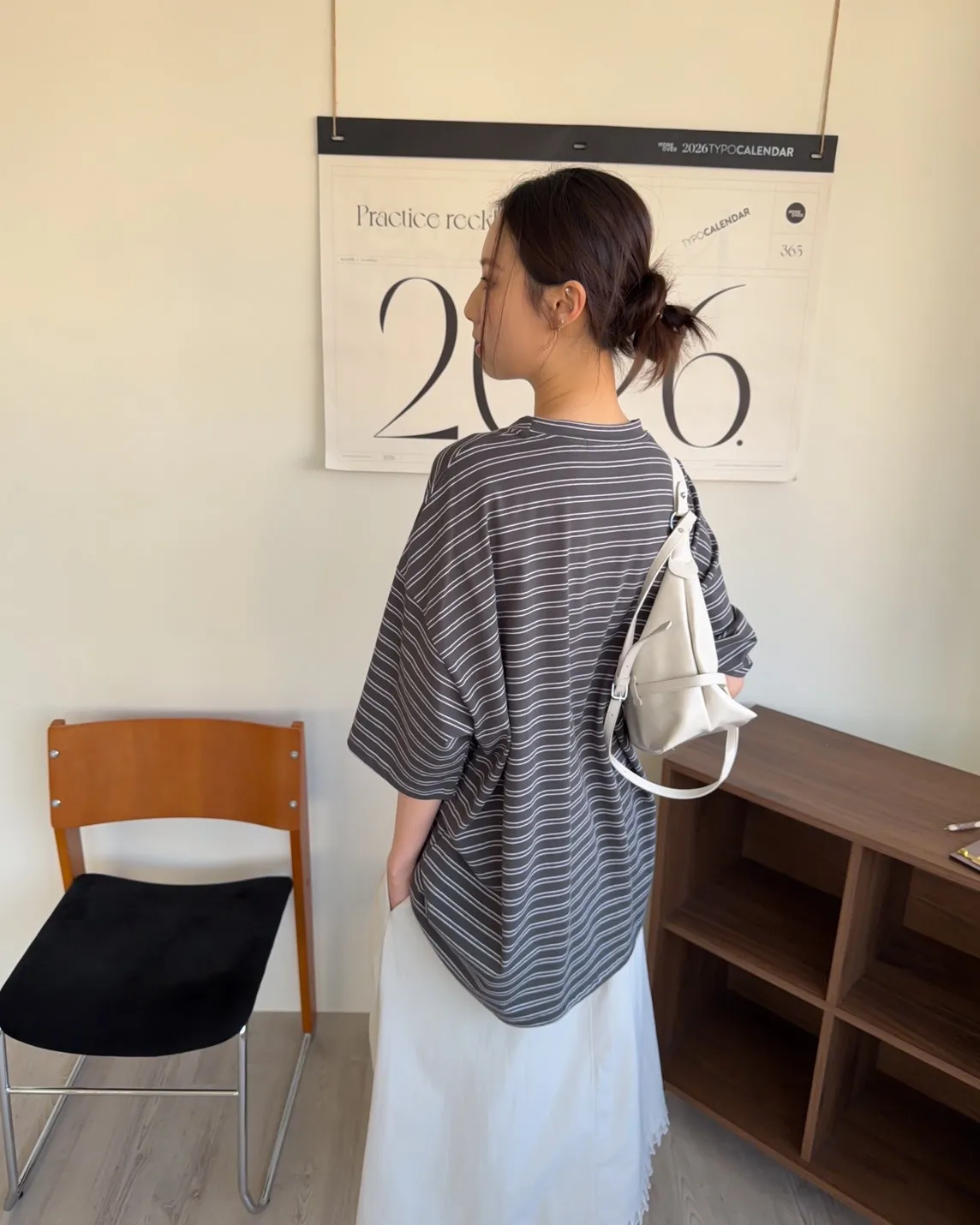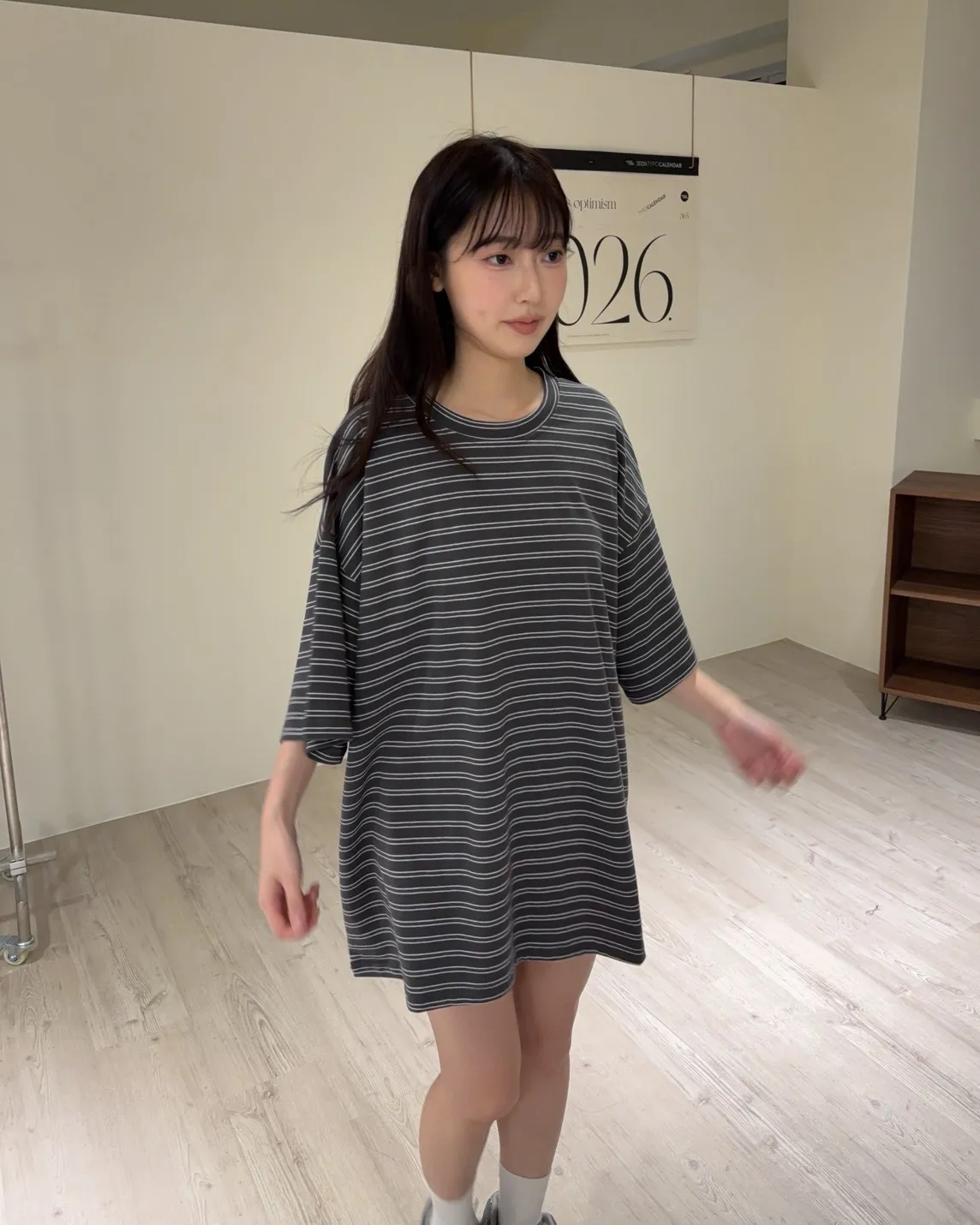 薄棉料 撞色橫條紋 寬鬆落肩