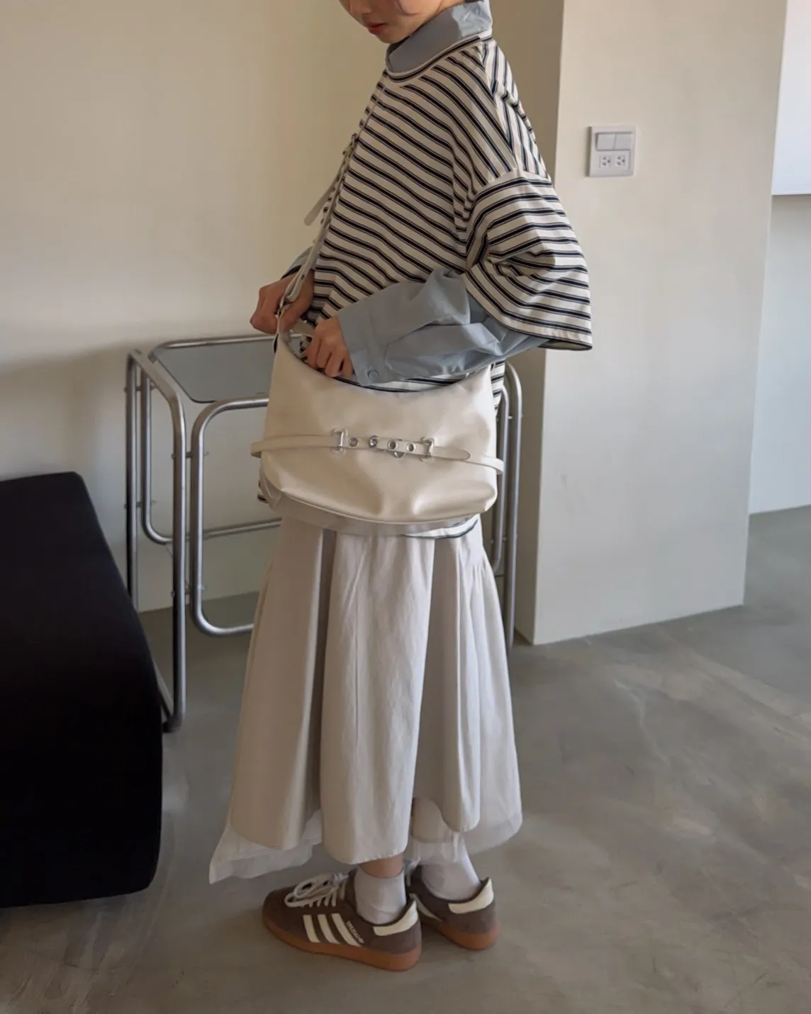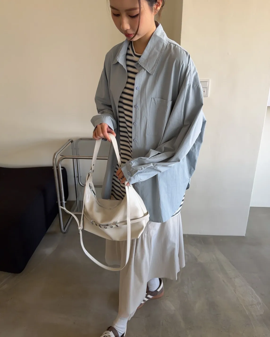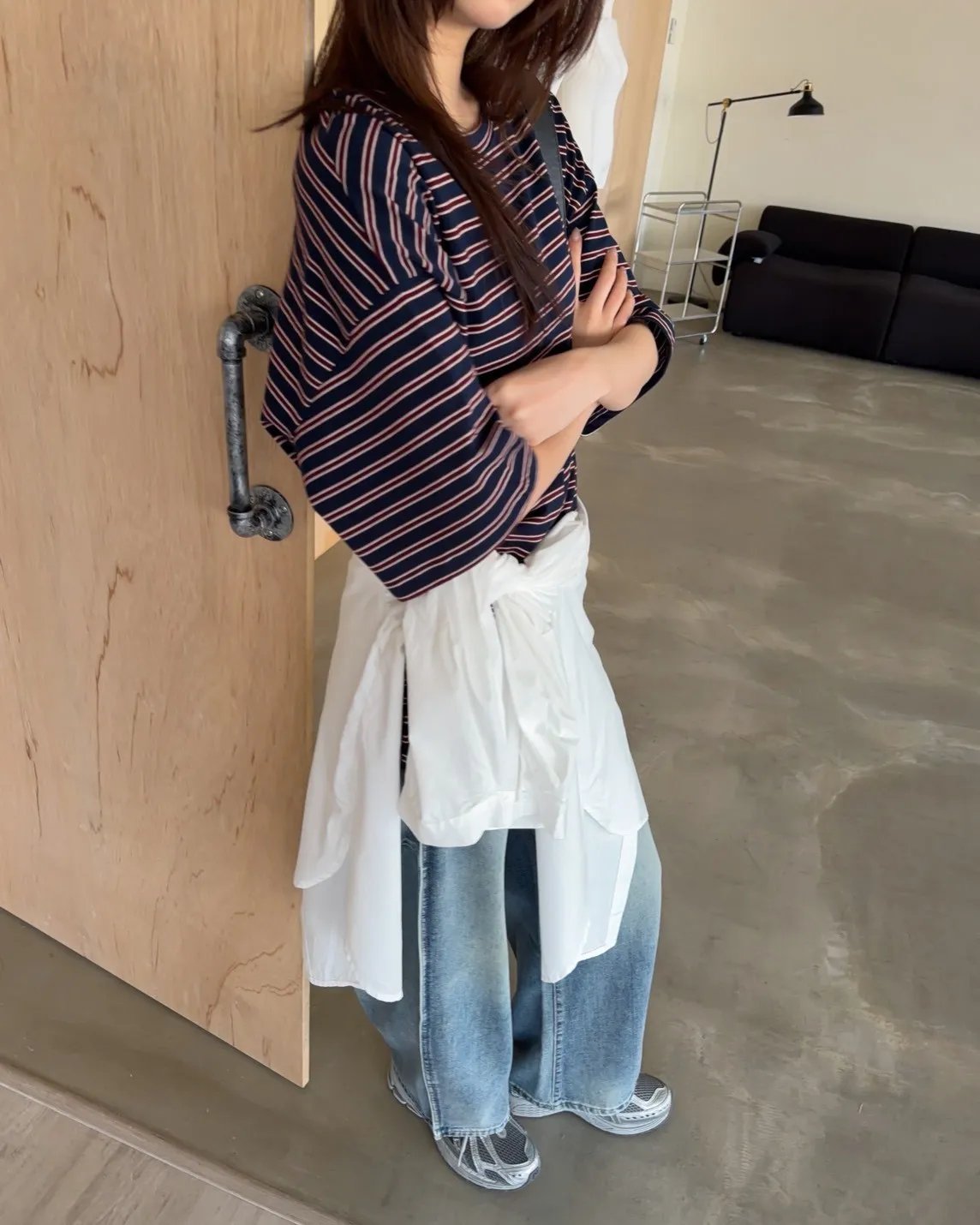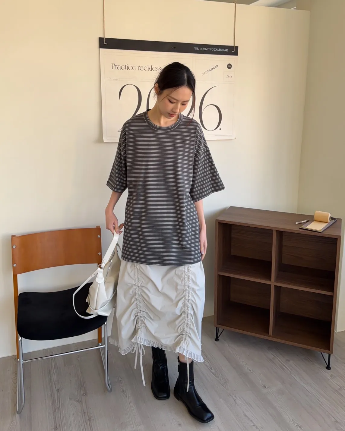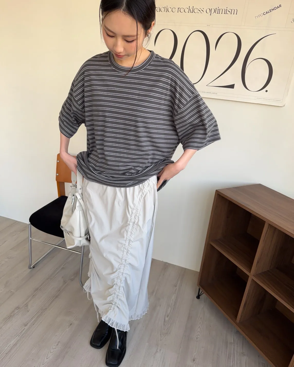 薄棉料 撞色橫條紋 寬鬆落肩