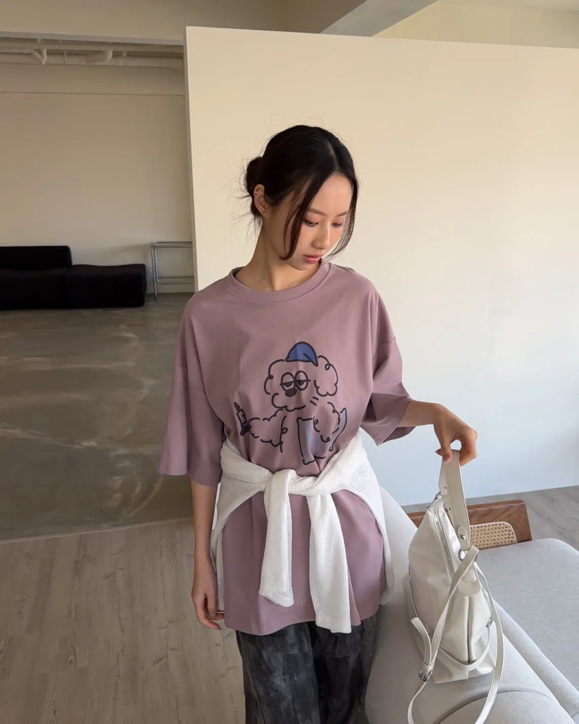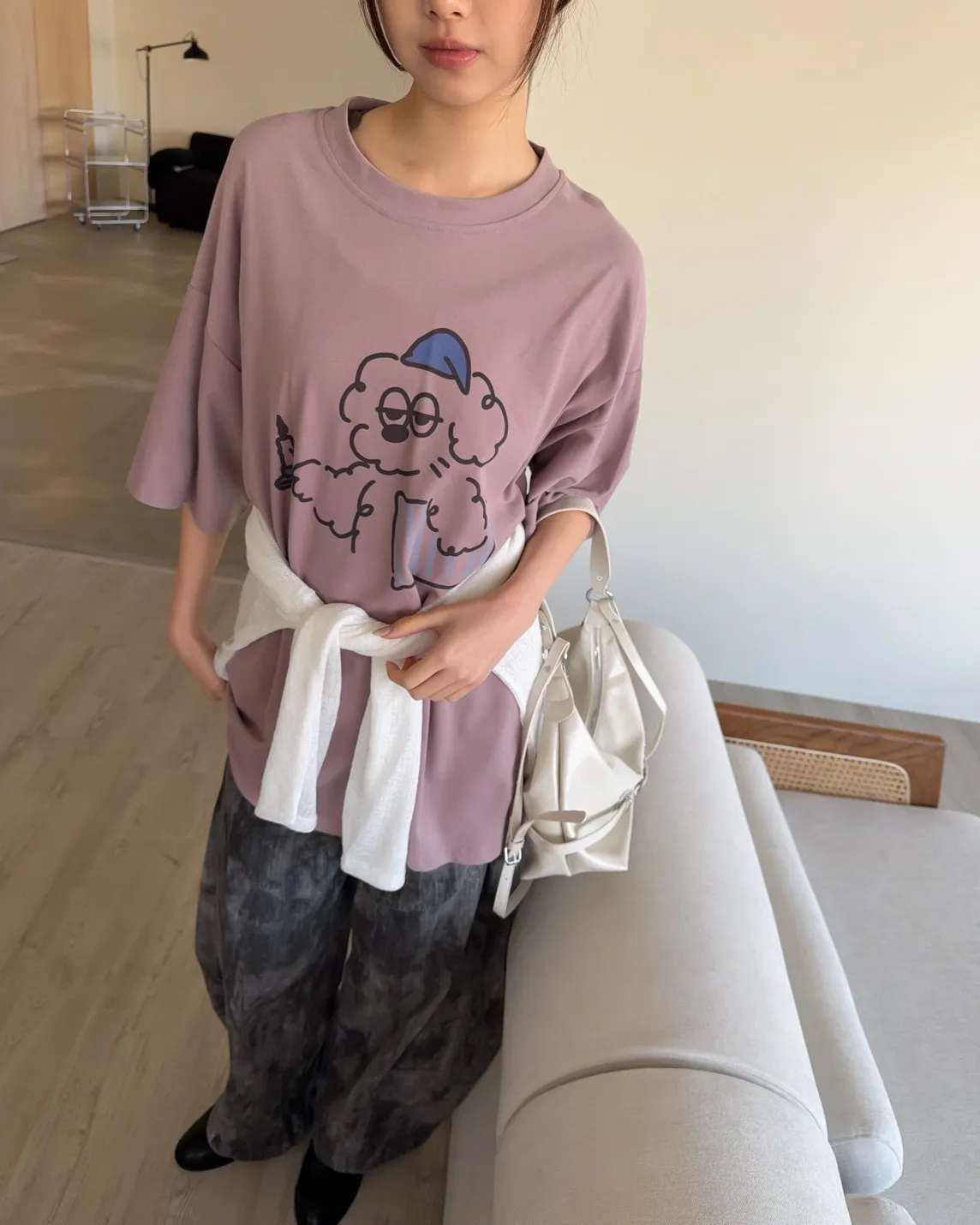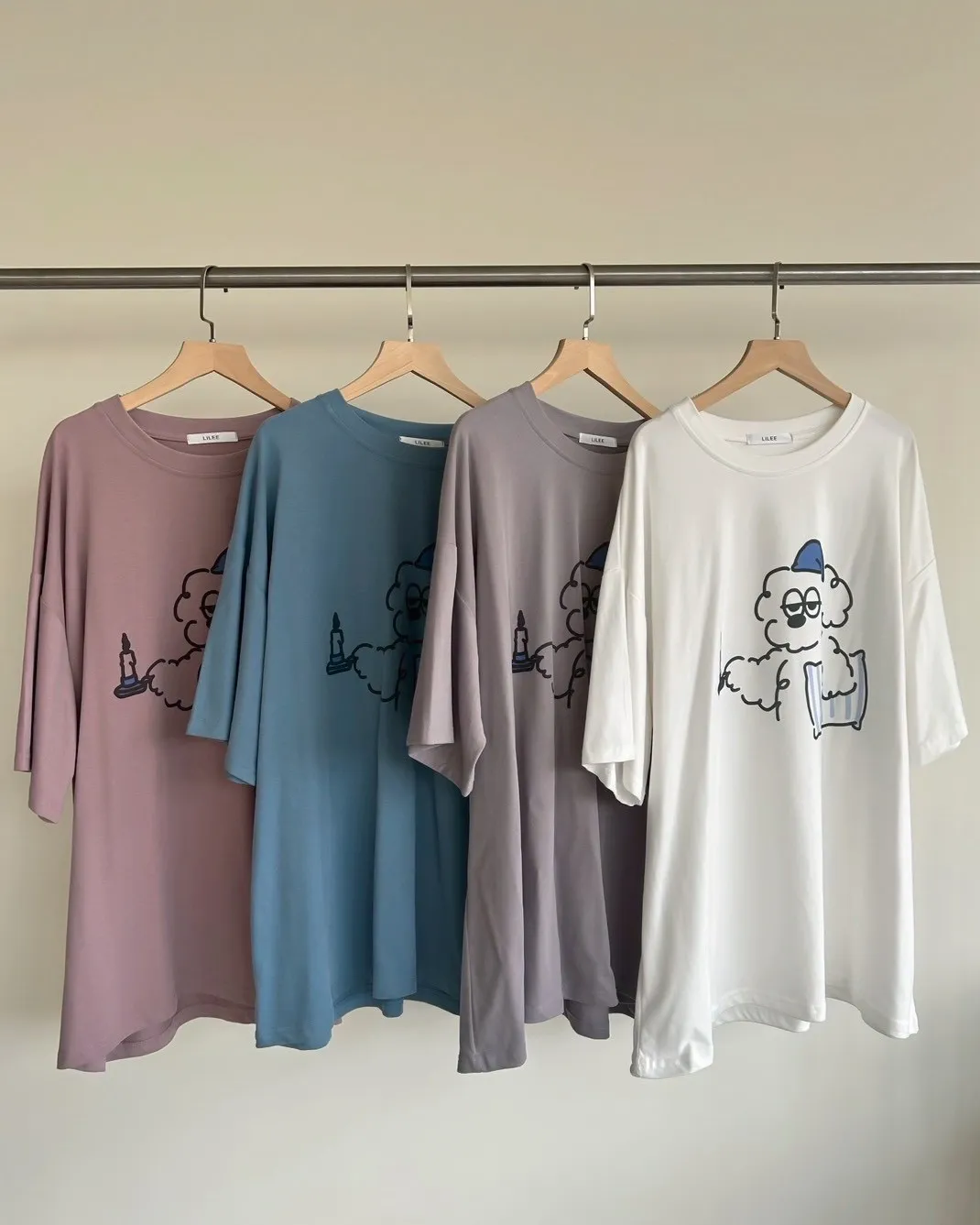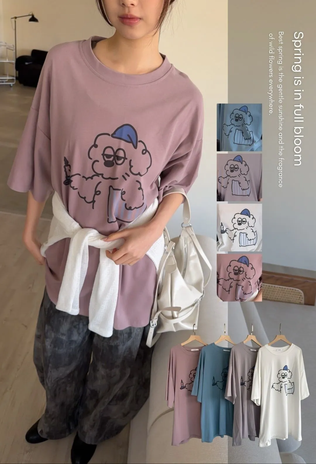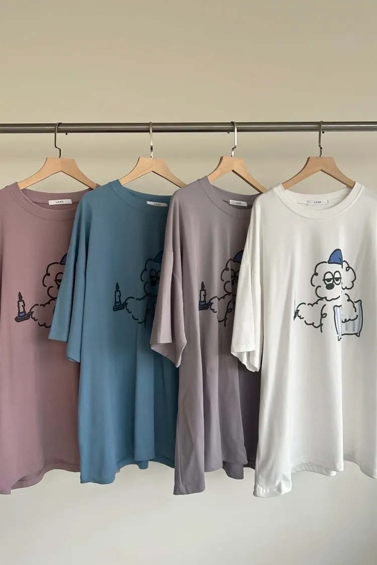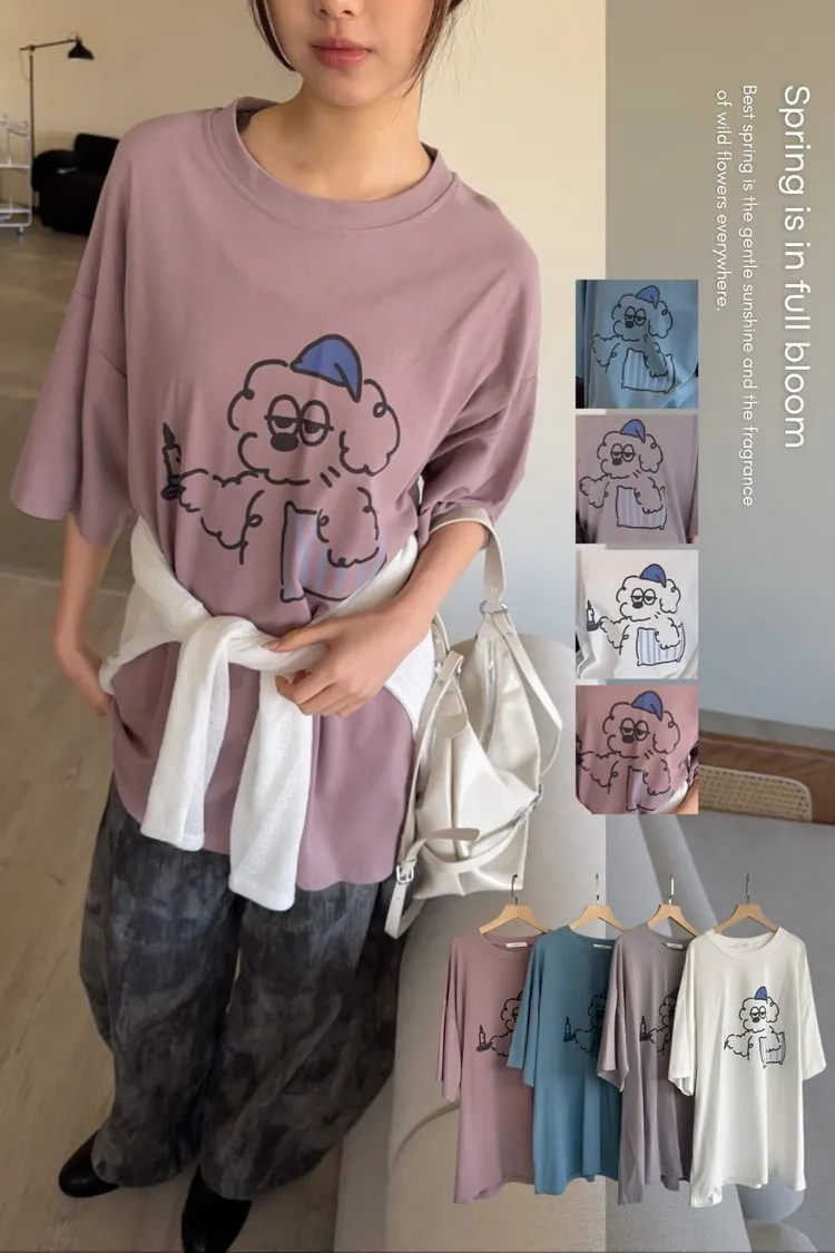 A0066貪睡小狗磨毛大T(白/藍/粉紫/灰紫)