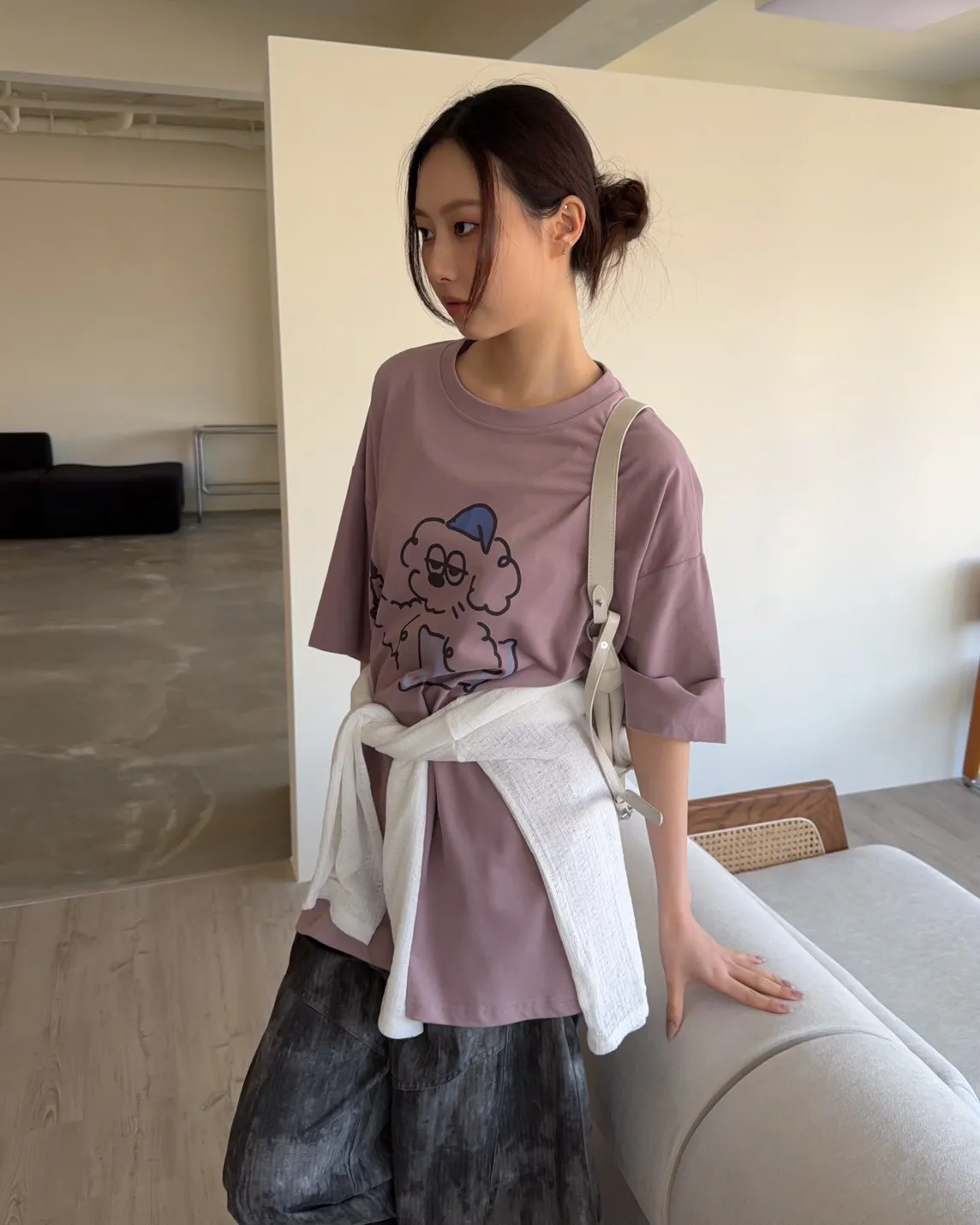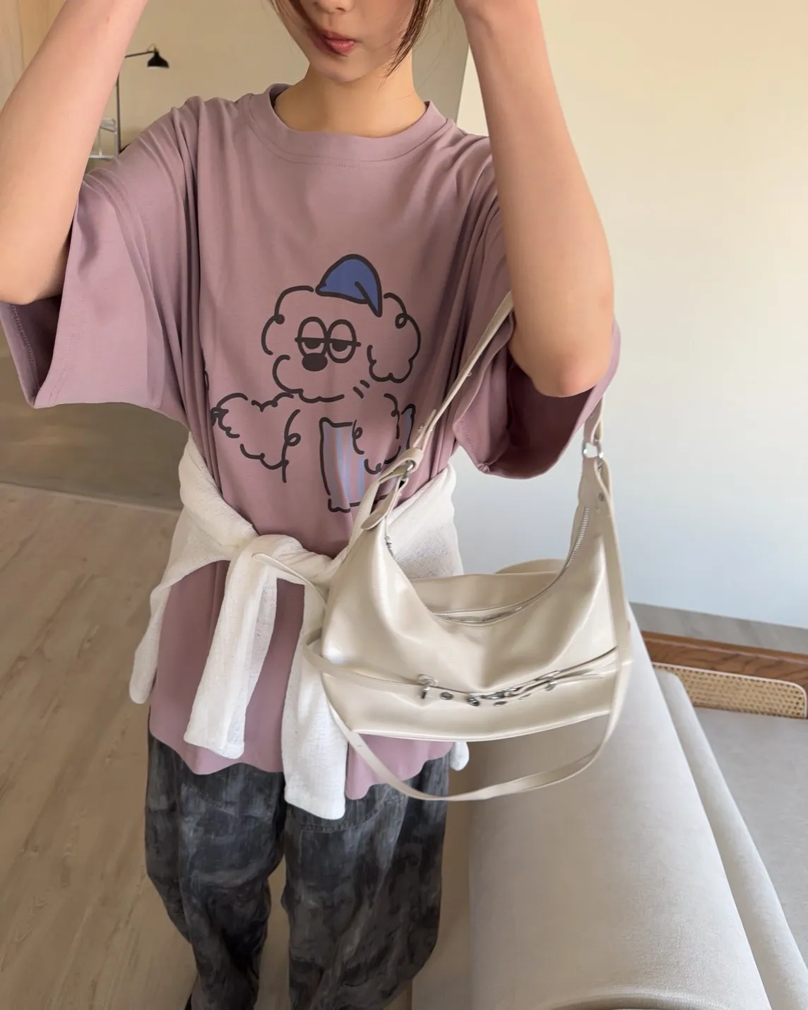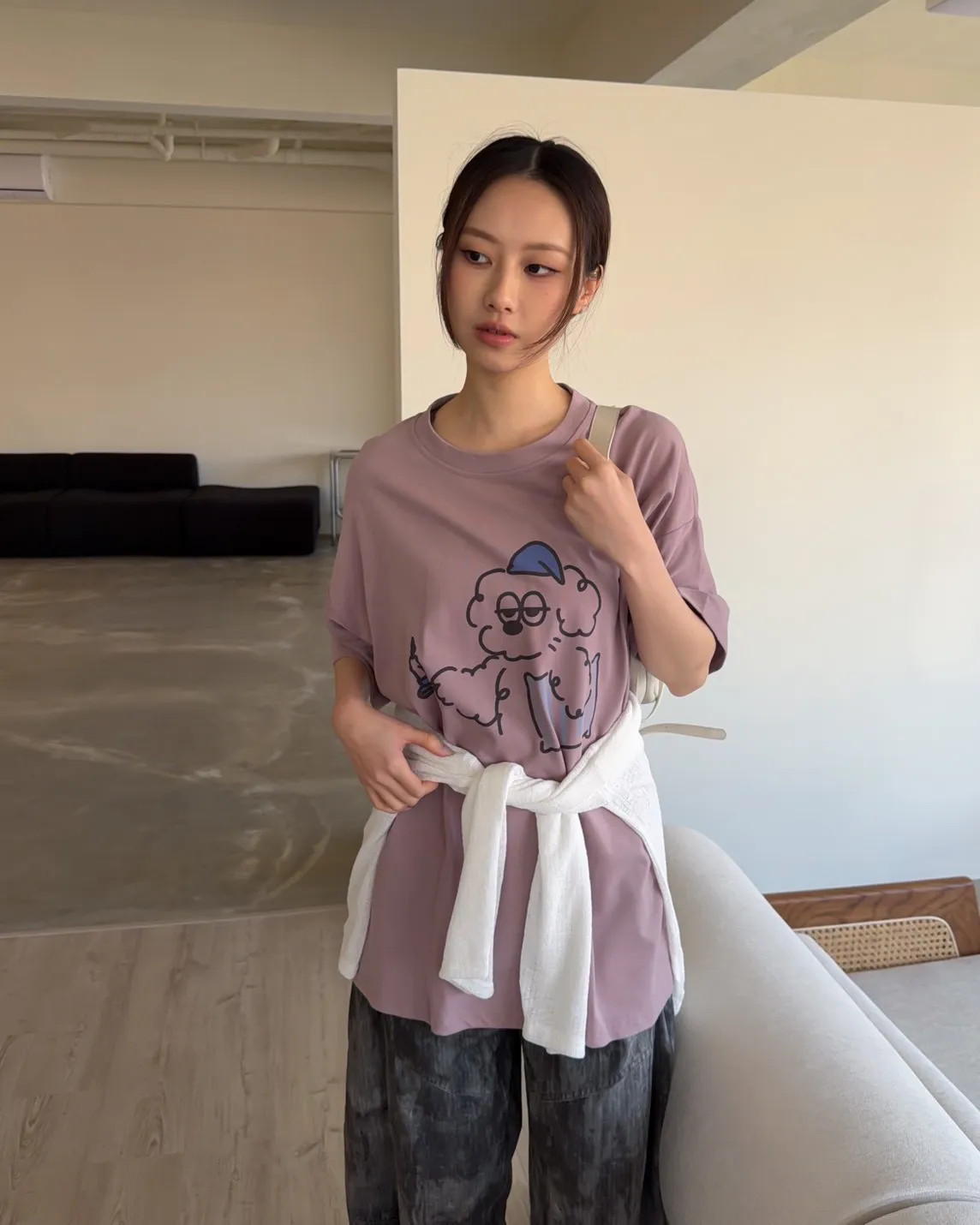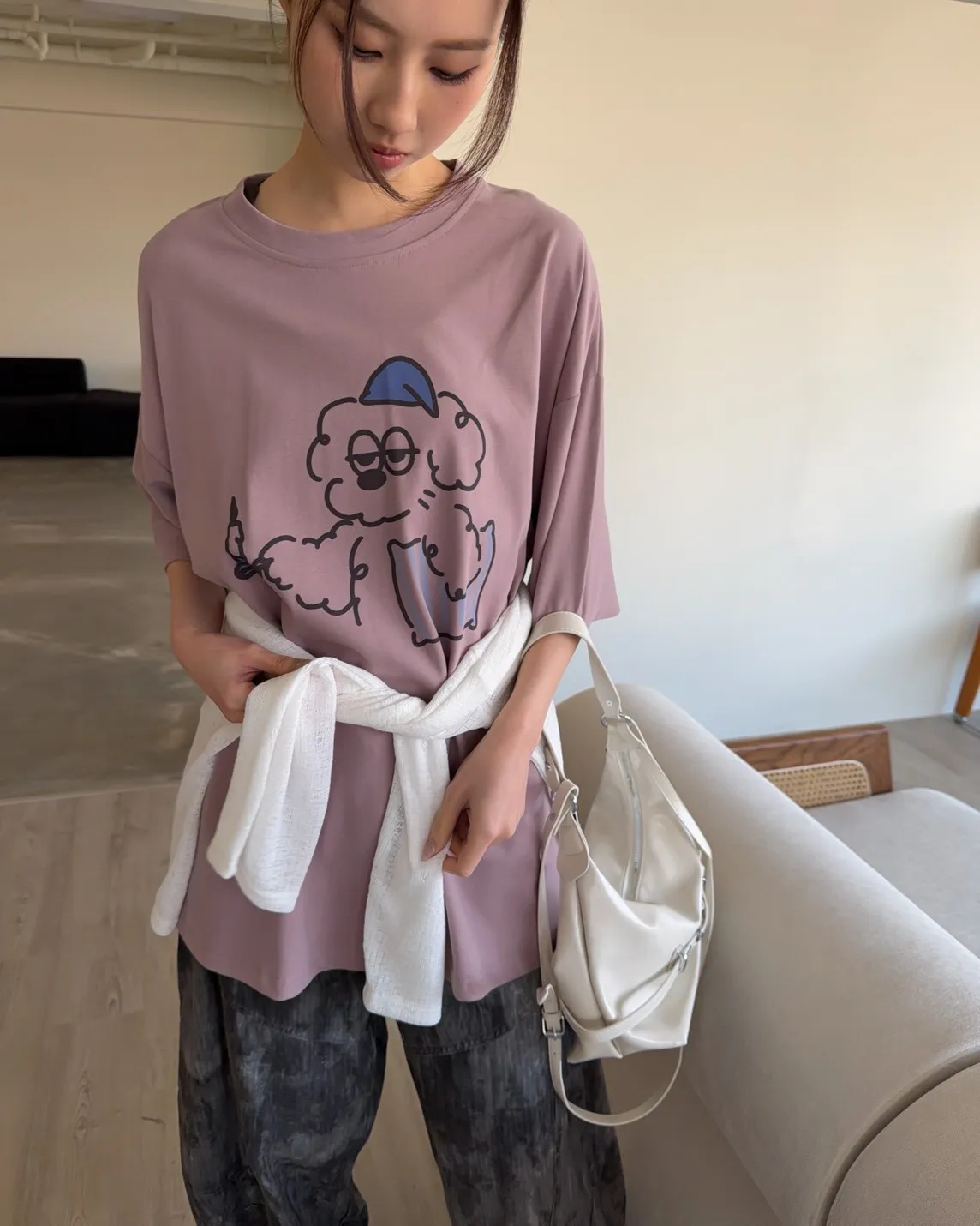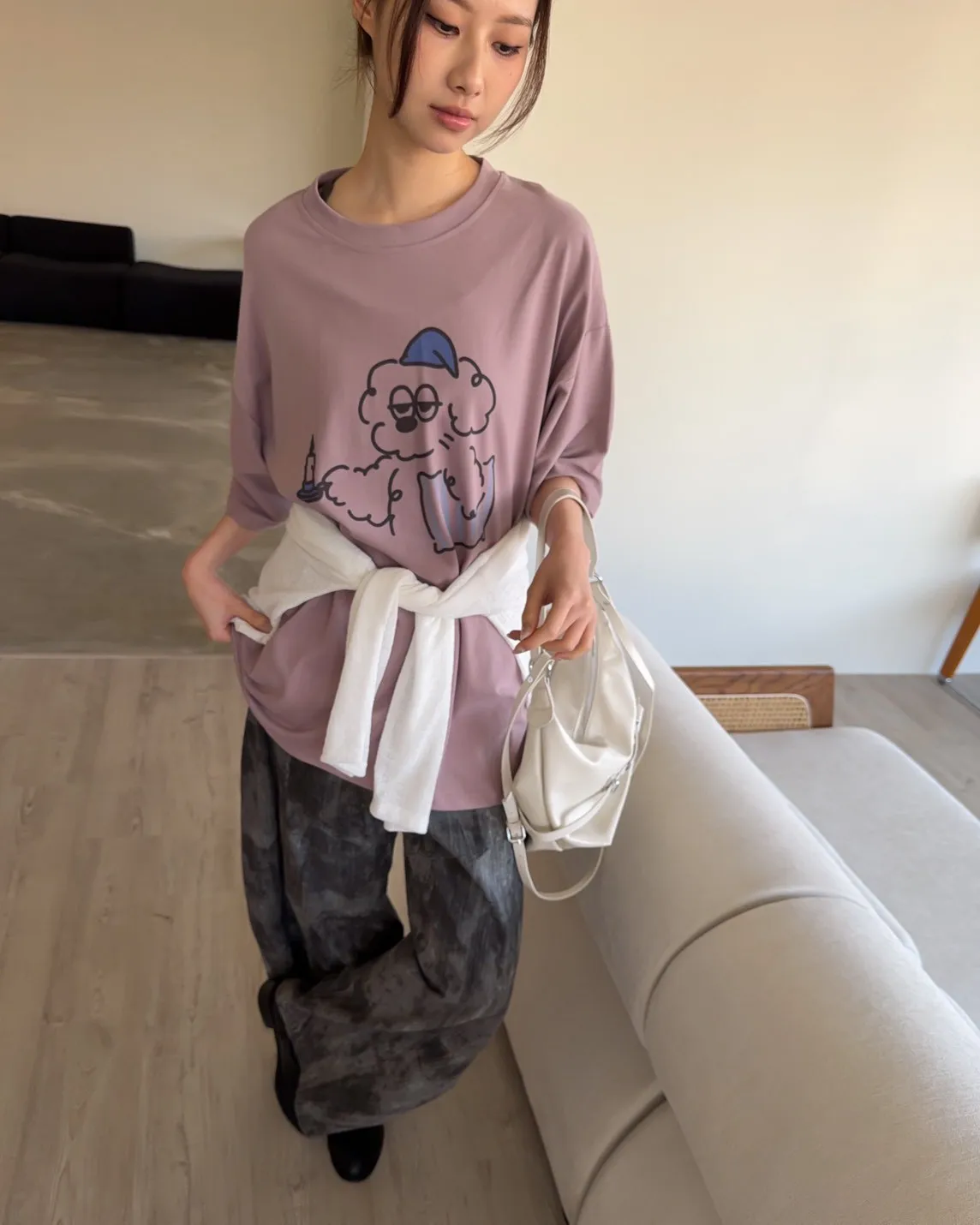 A0066貪睡小狗磨毛大T(白/藍/粉紫/灰紫)