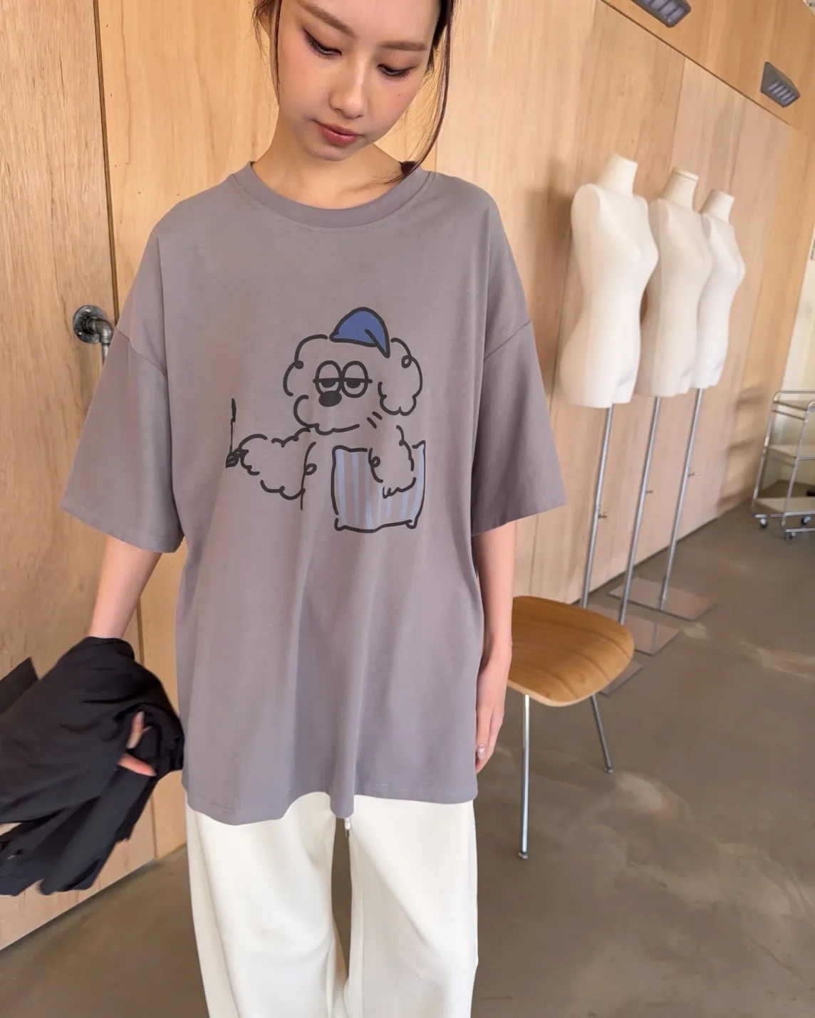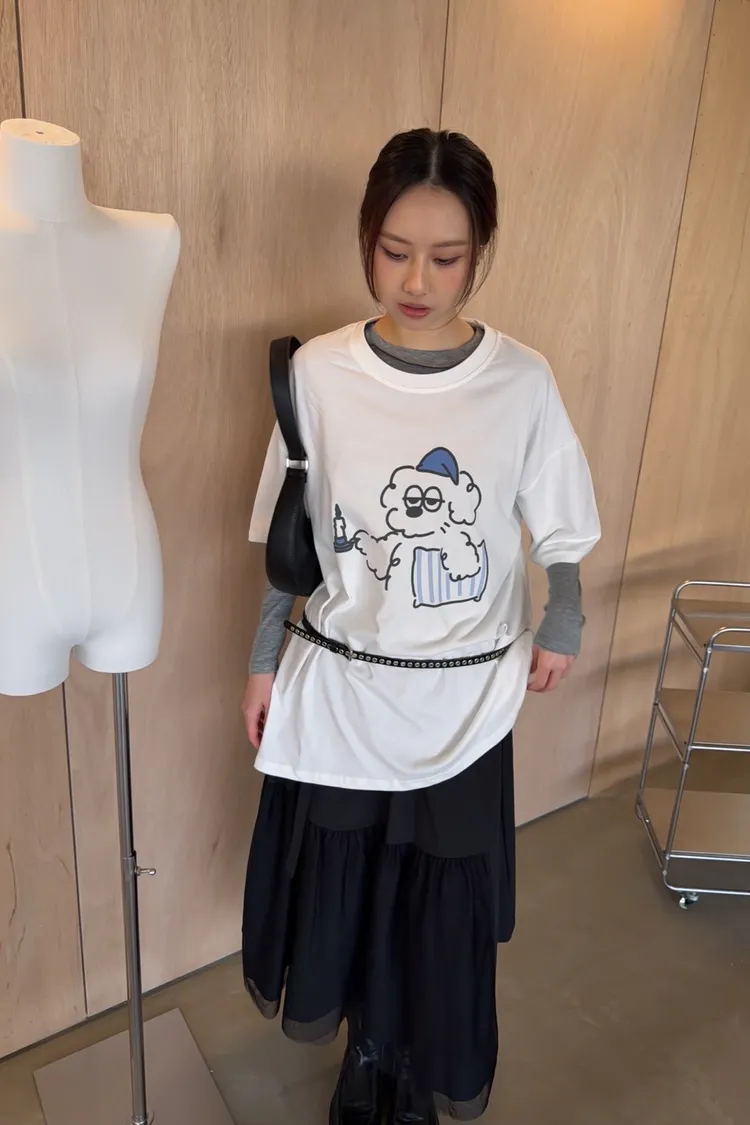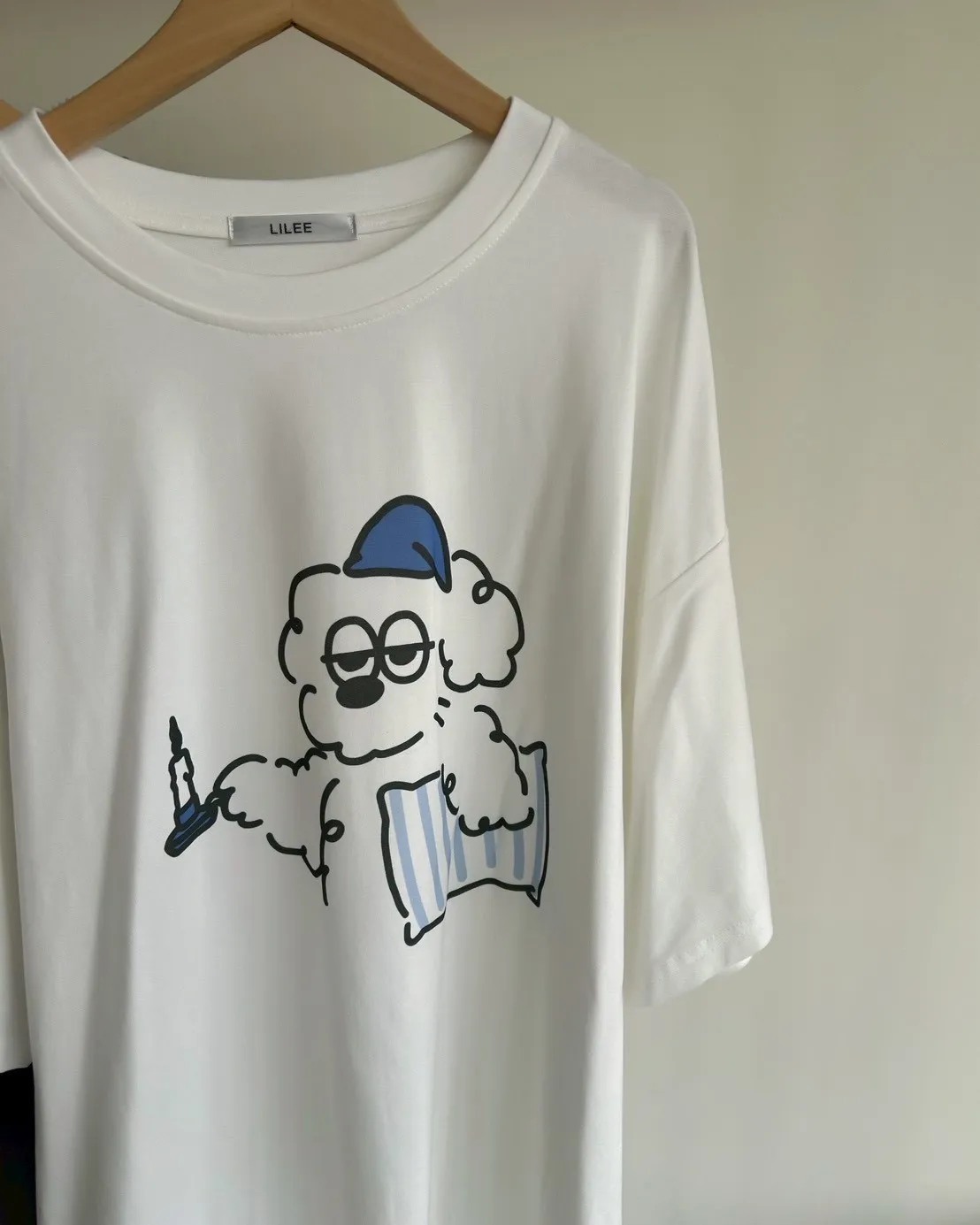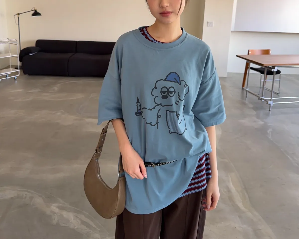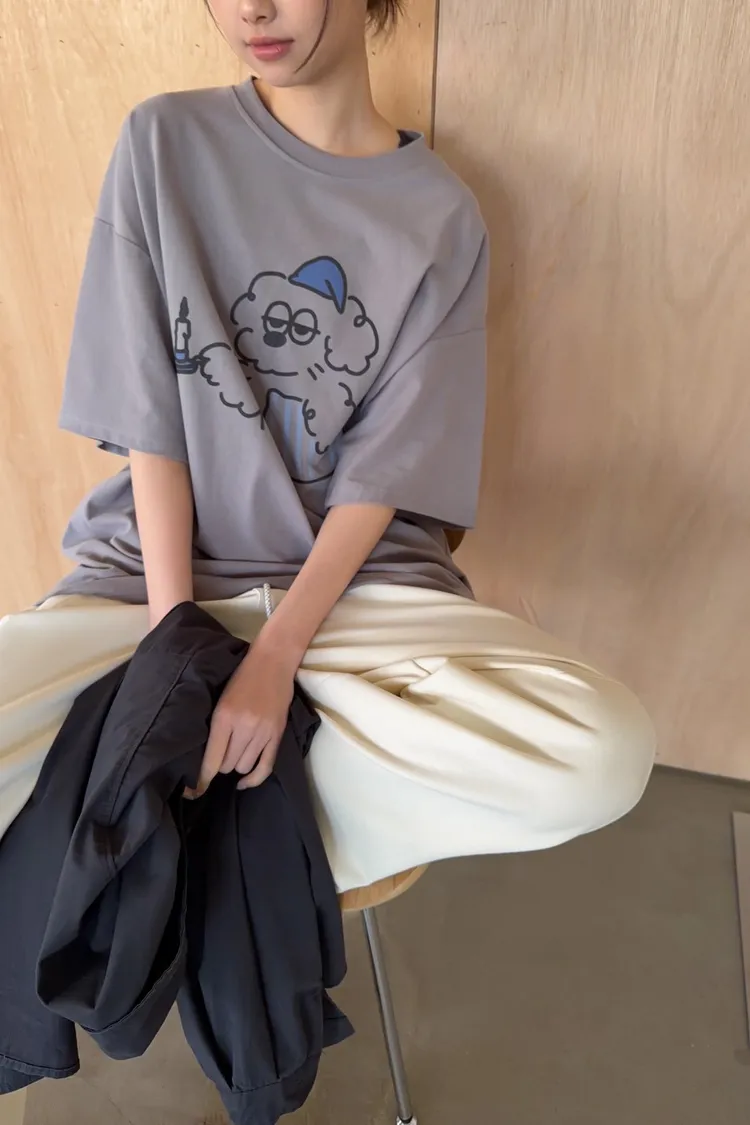 圓領 有磨毛微微厚度 抱枕頭小狗Q版印花 寬鬆落肩
