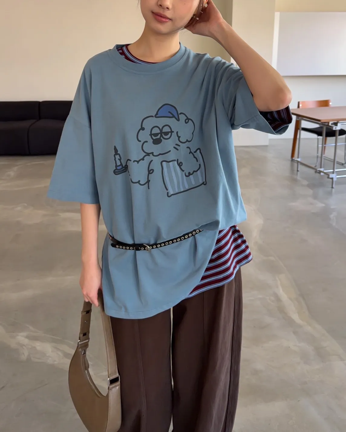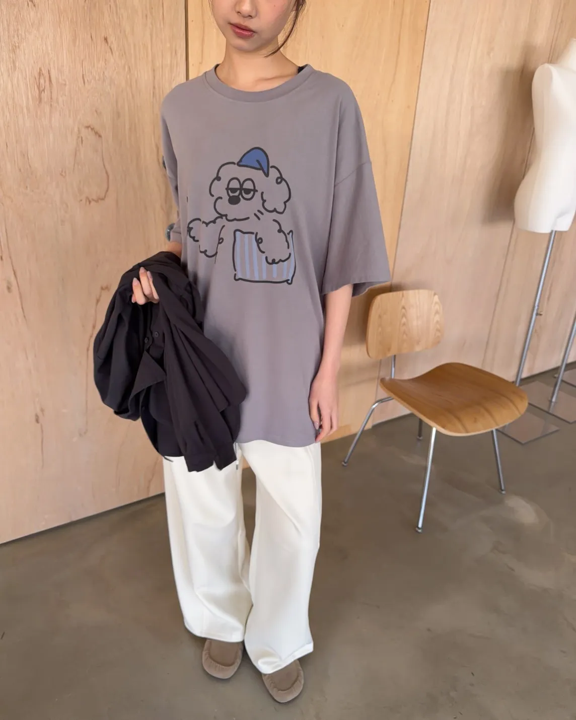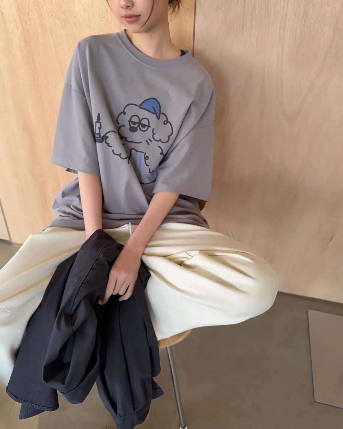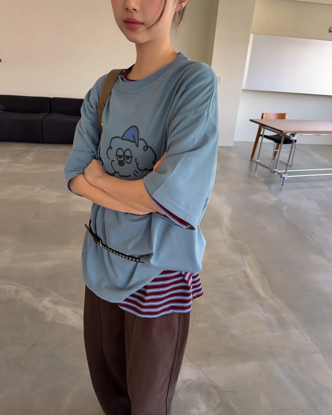 圓領 有磨毛微微厚度 抱枕頭小狗Q版印花 寬鬆落肩