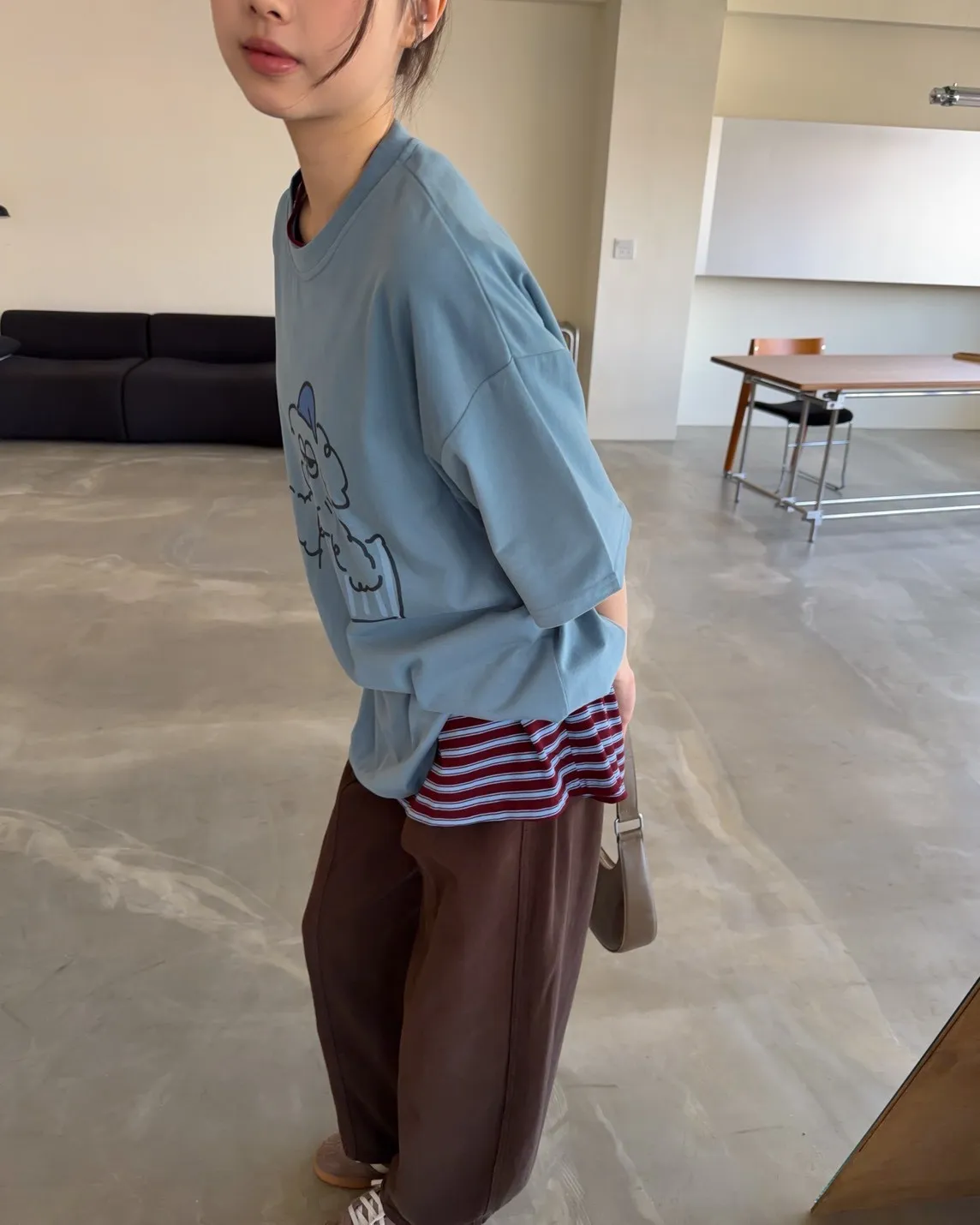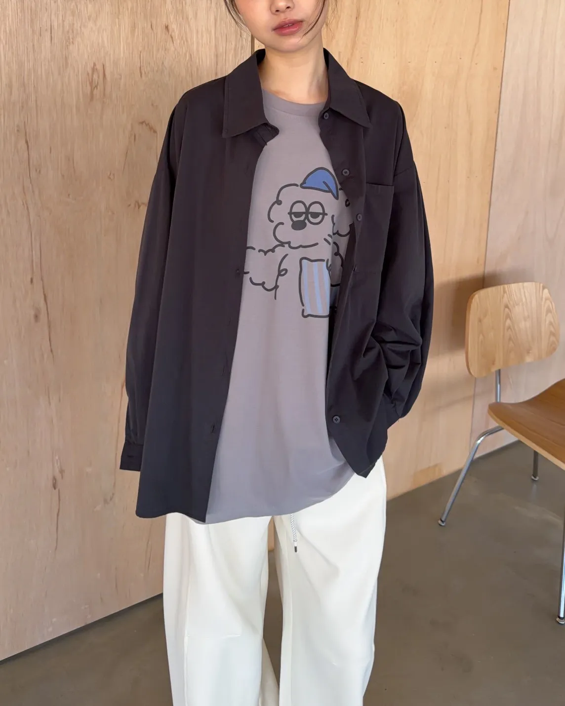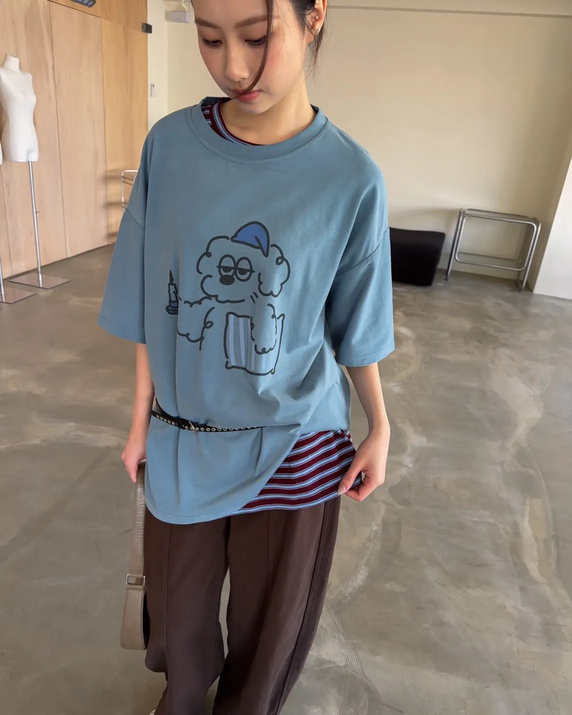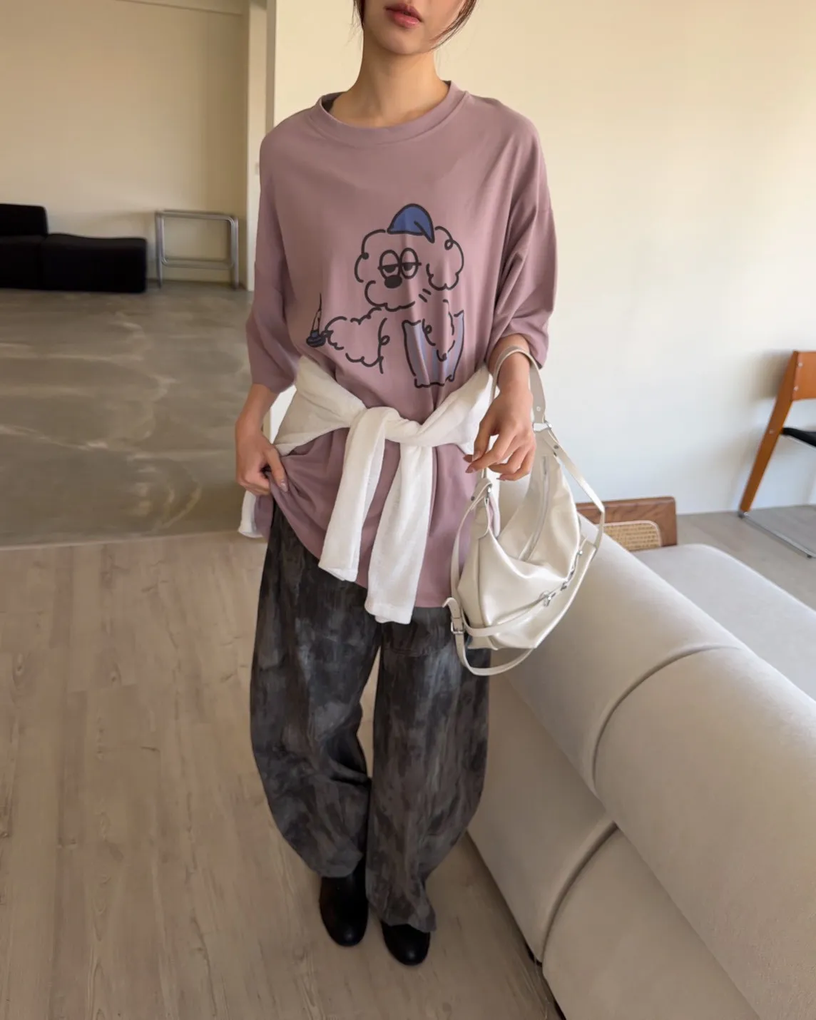 圓領 有磨毛微微厚度 抱枕頭小狗Q版印花 寬鬆落肩