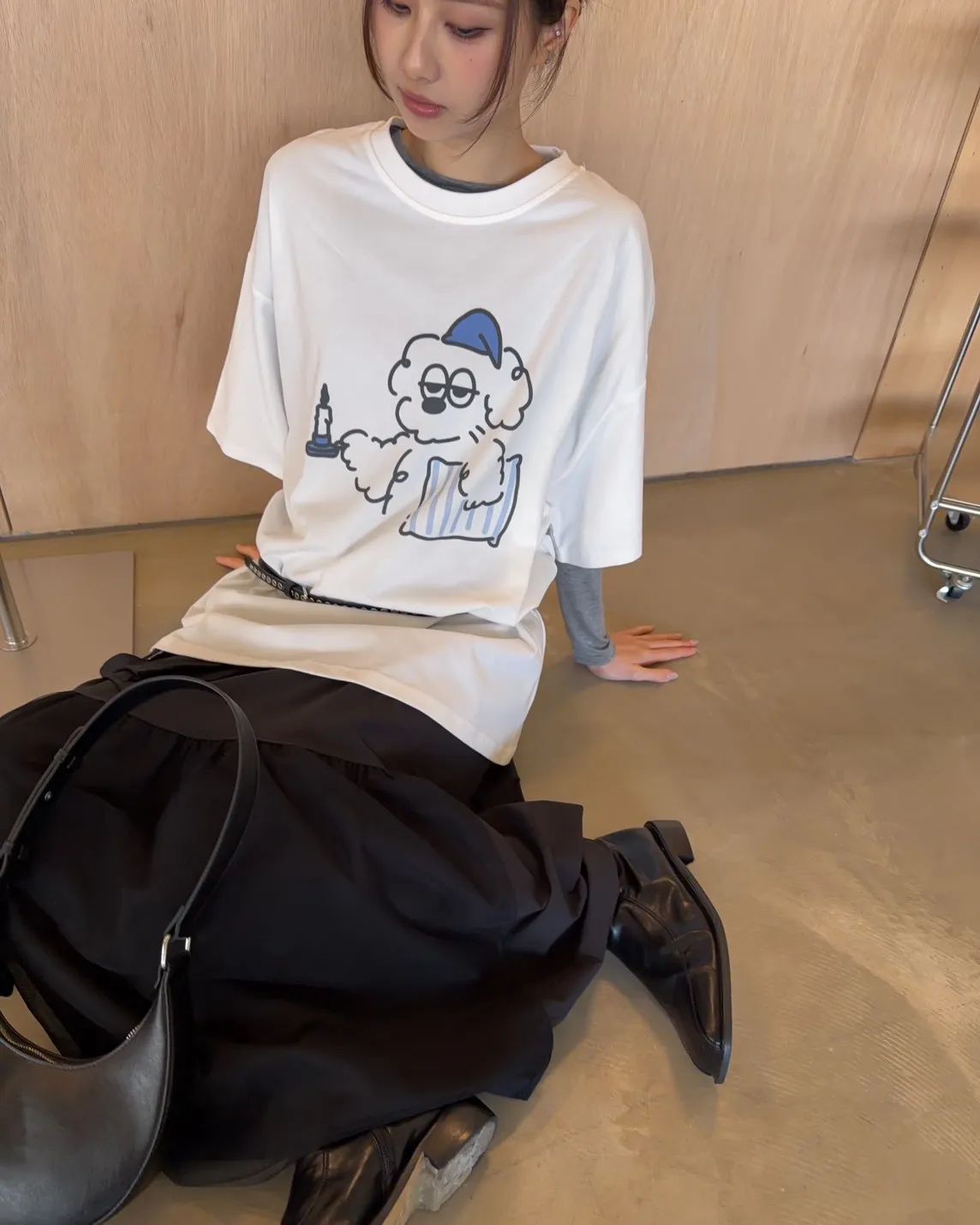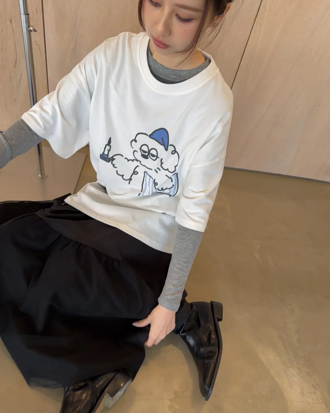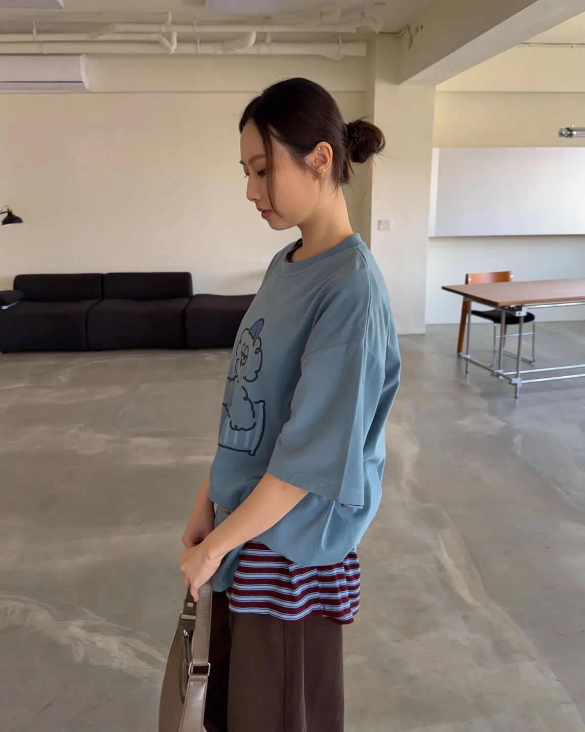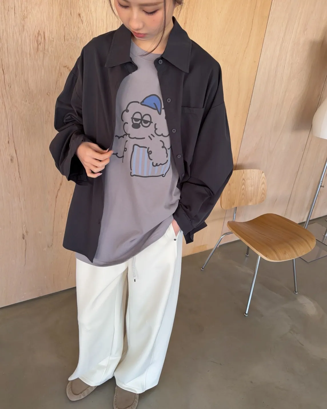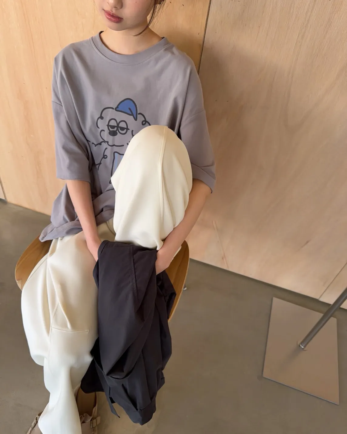 圓領 有磨毛微微厚度 抱枕頭小狗Q版印花 寬鬆落肩