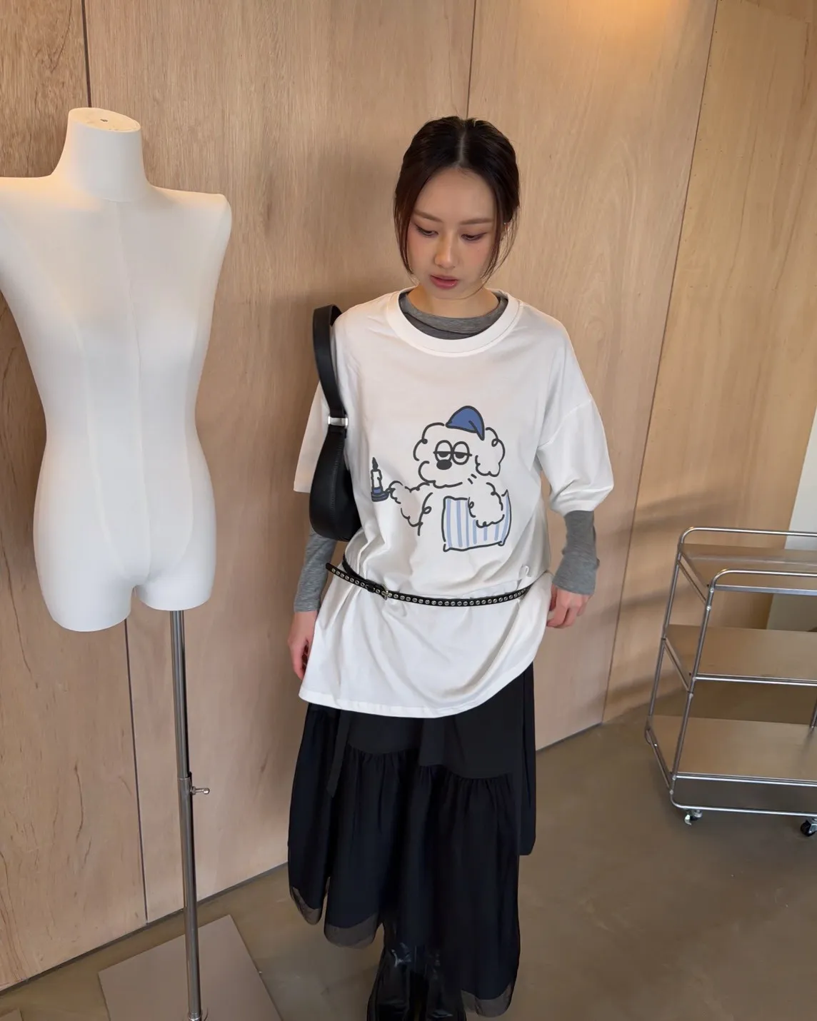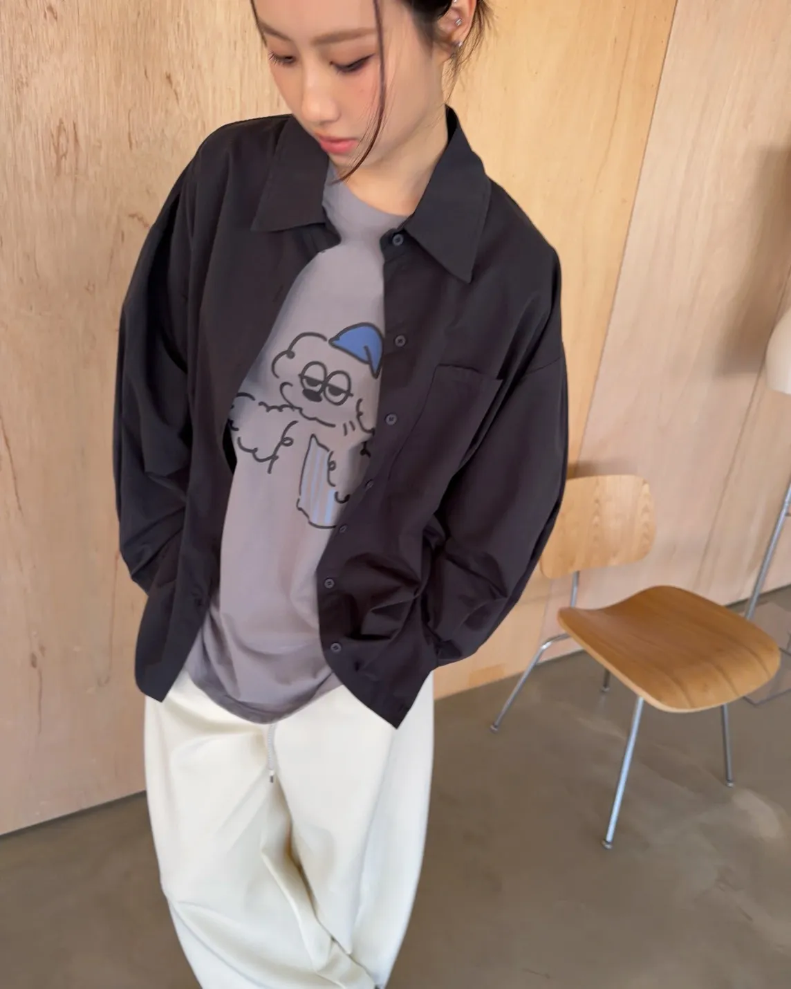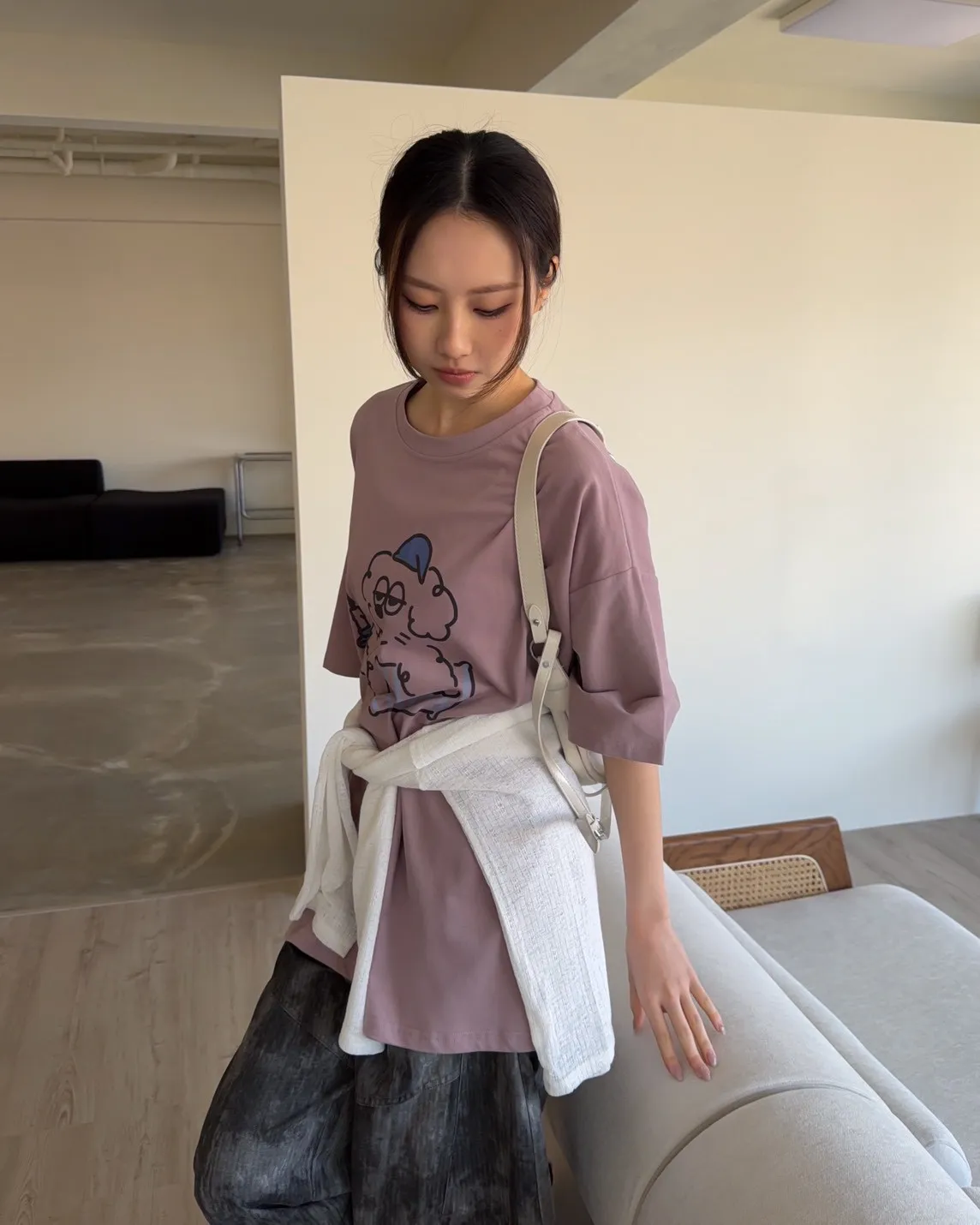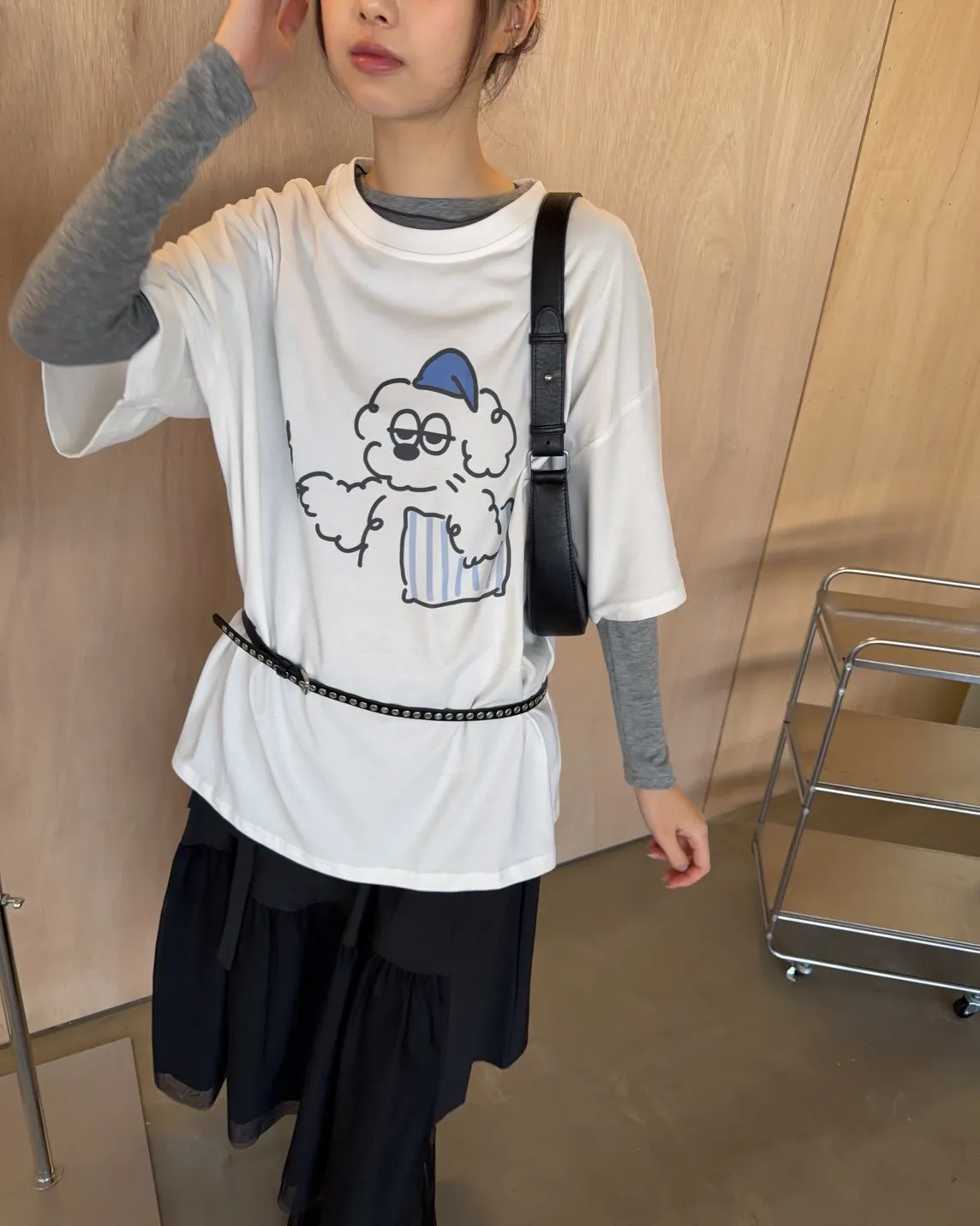 圓領 有磨毛微微厚度 抱枕頭小狗Q版印花 寬鬆落肩