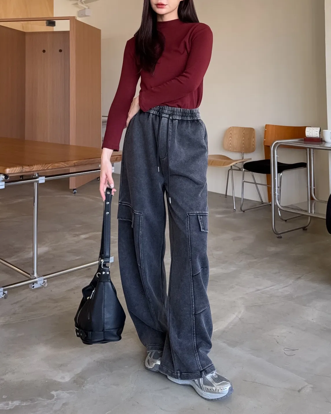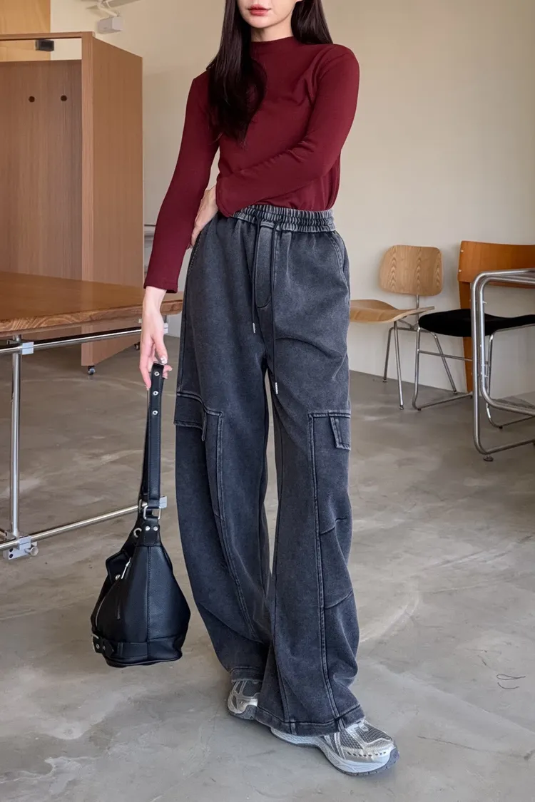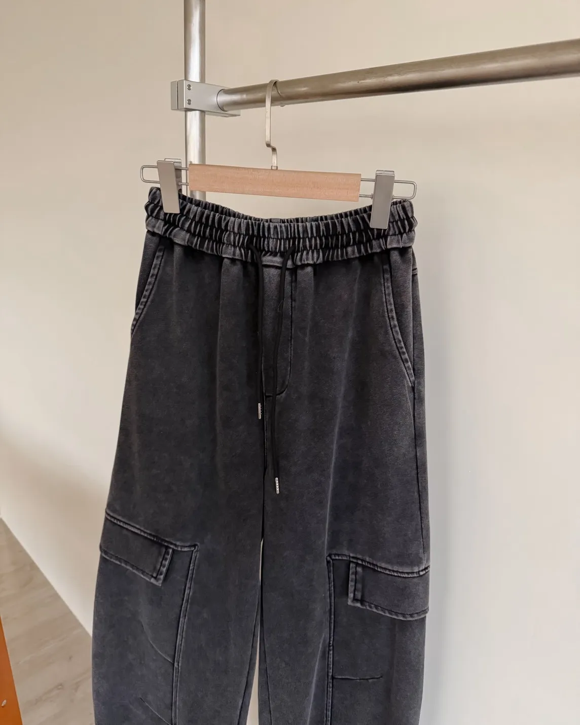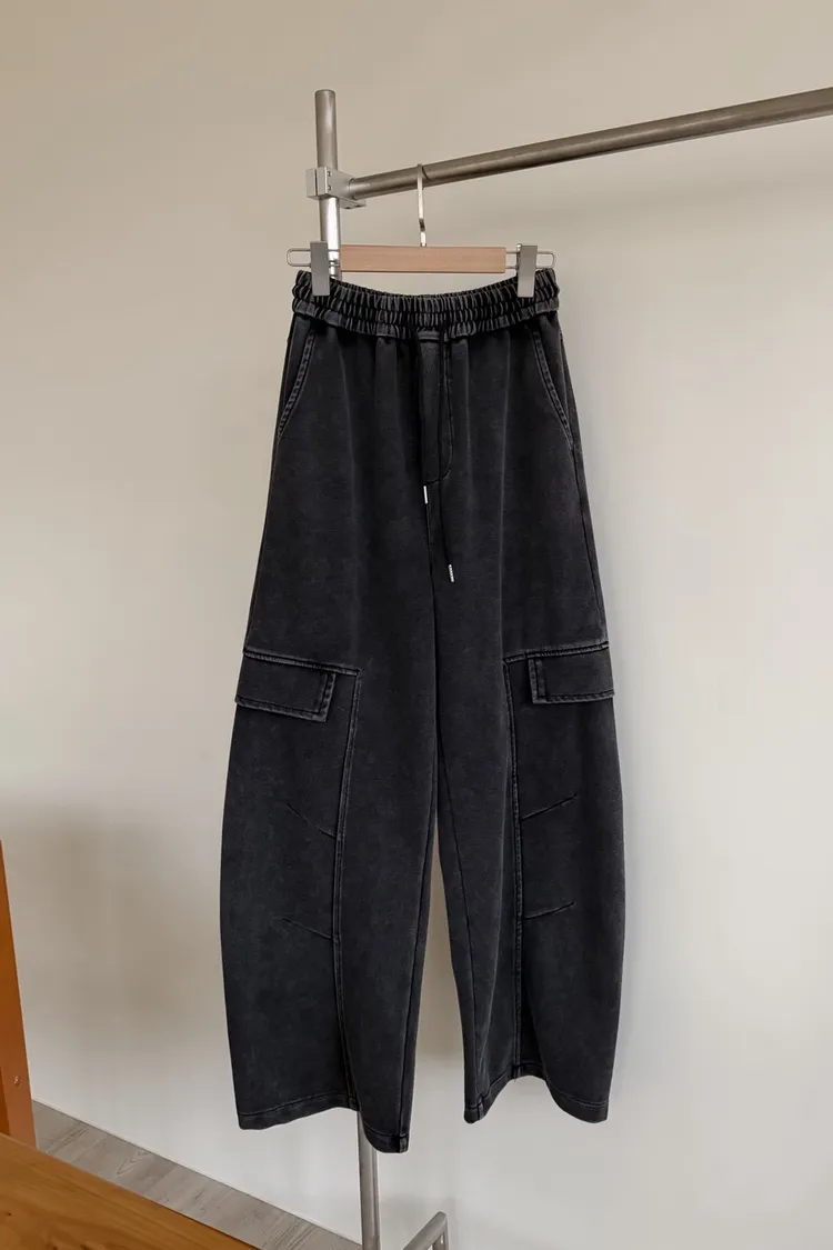 抽繩全鬆緊 建議尺寸S-L 煙灰刷色 兩側口袋 兩邊工裝口袋 彎刀版型 長度偏長 建議165以上女孩