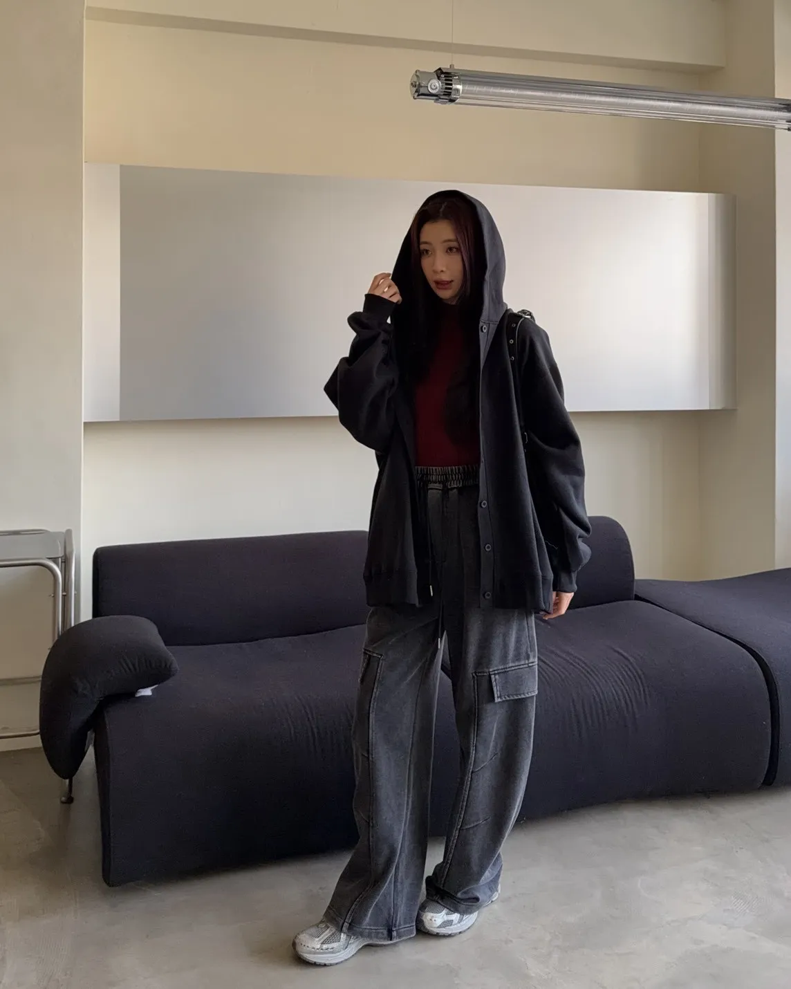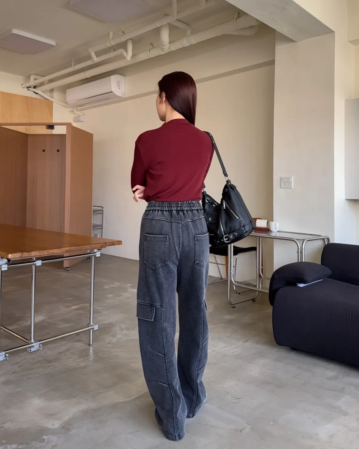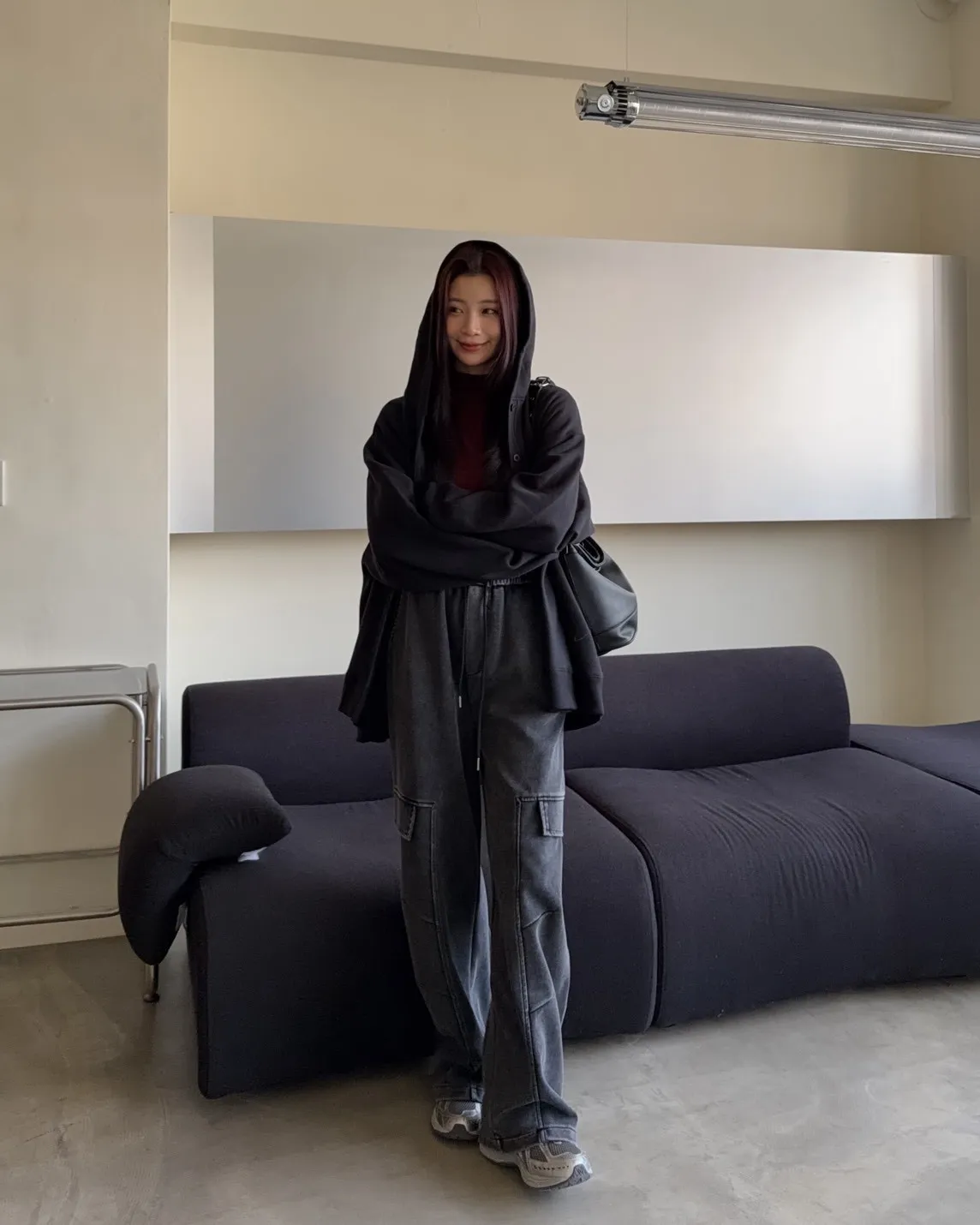 抽繩全鬆緊 建議尺寸S-L 煙灰刷色 兩側口袋 兩邊工裝口袋 彎刀版型 長度偏長 建議165以上女孩