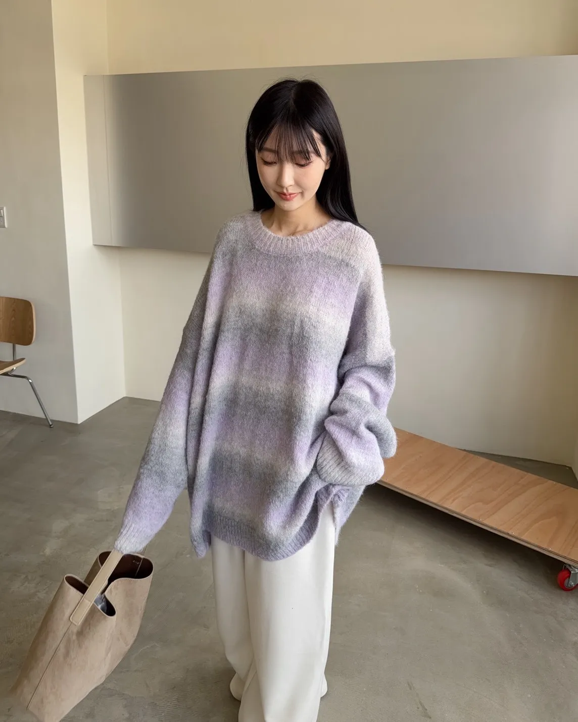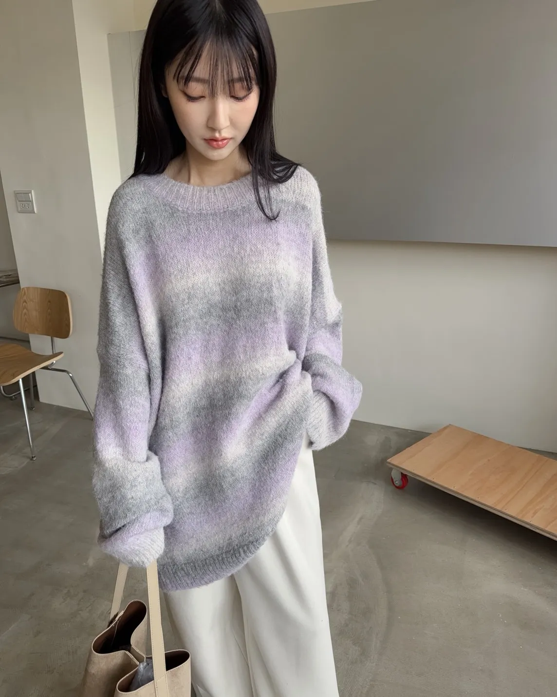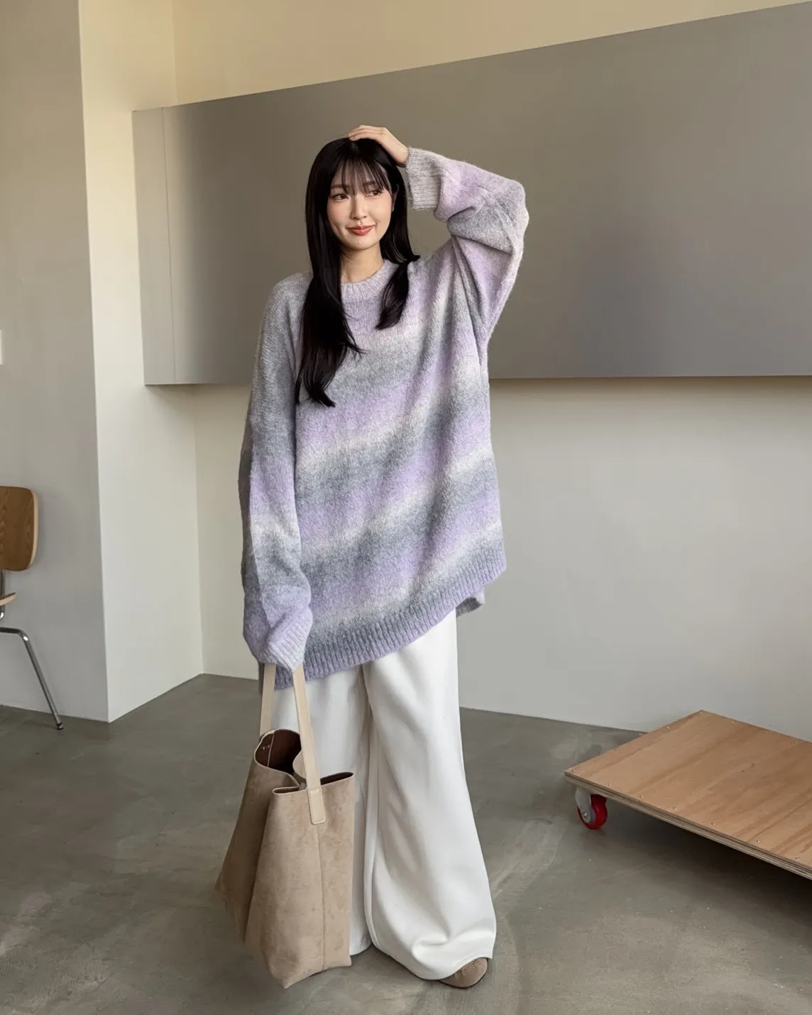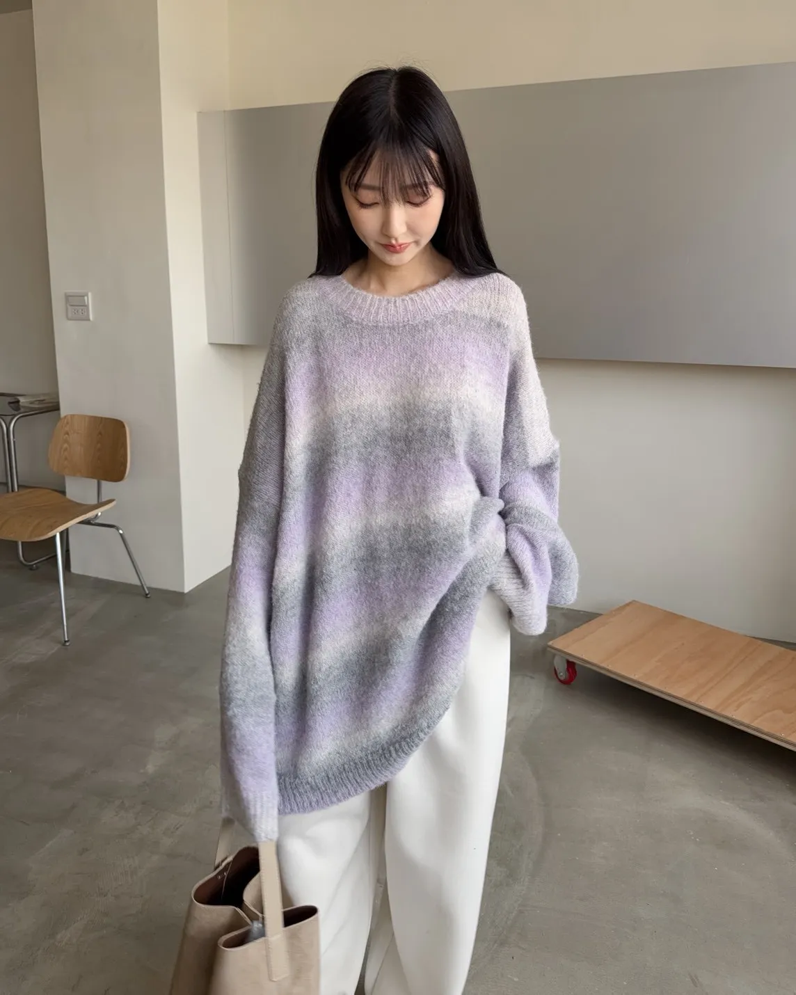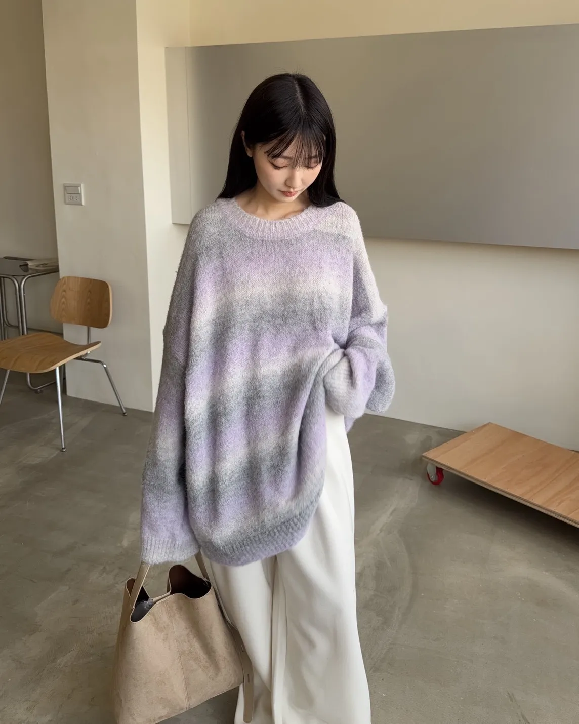 X0032夢幻漸層寬橫條大毛衣(紫/黑)