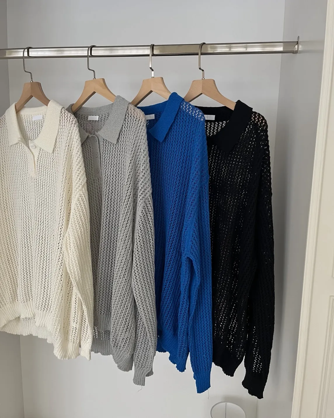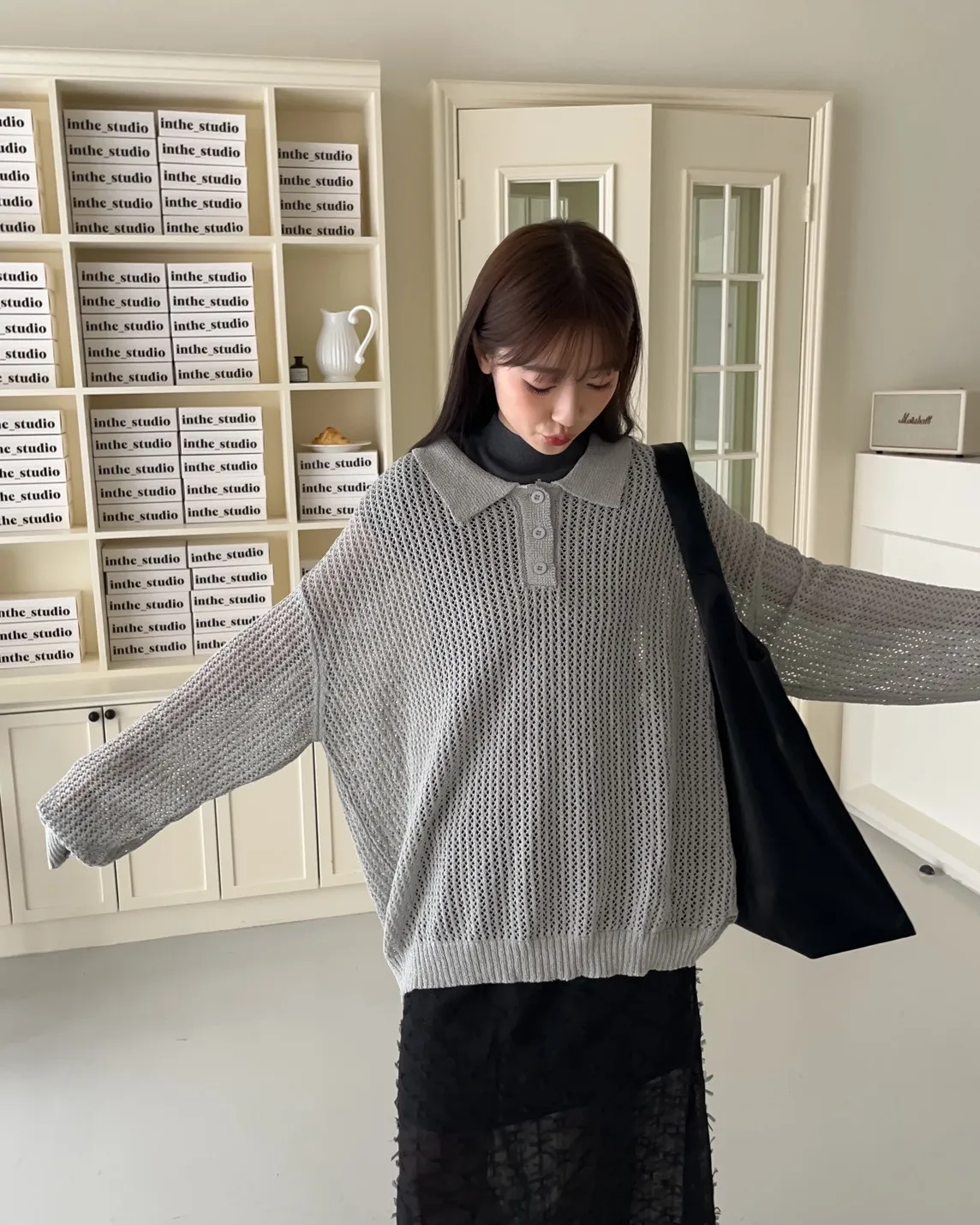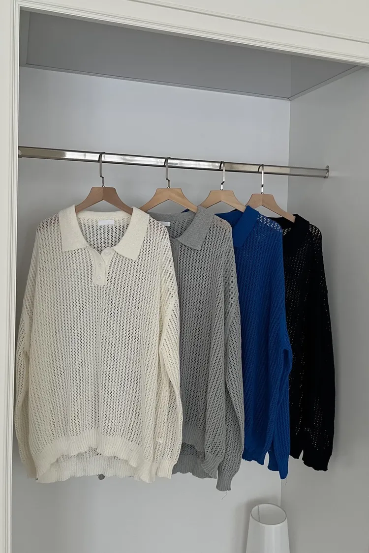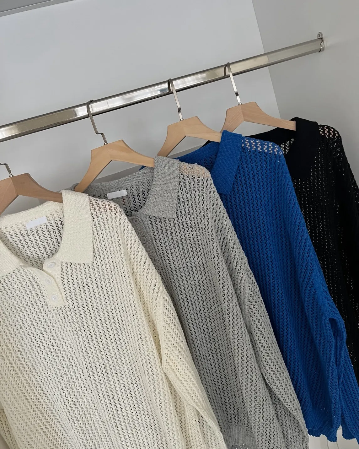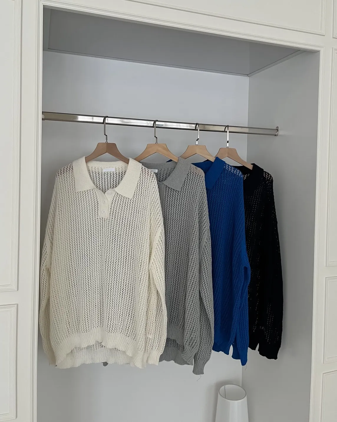 V0015翻領鈕扣洞洞落肩針織衣(米/藍/灰/黑)