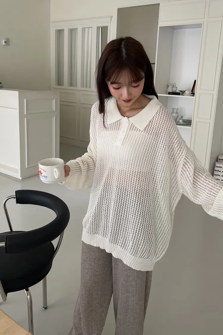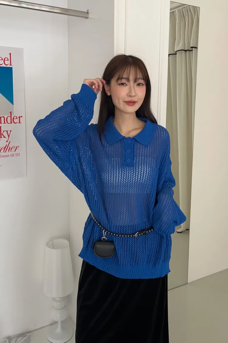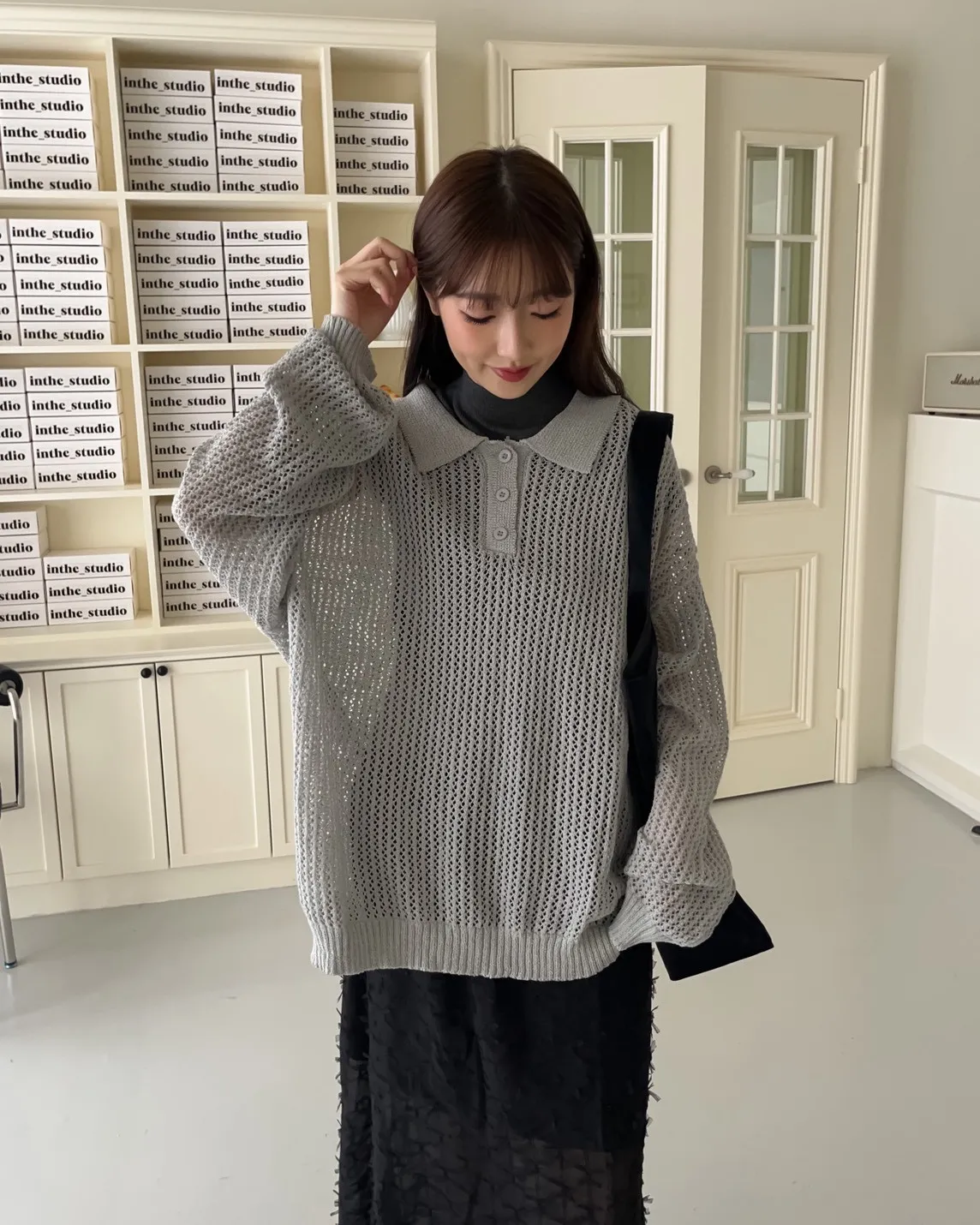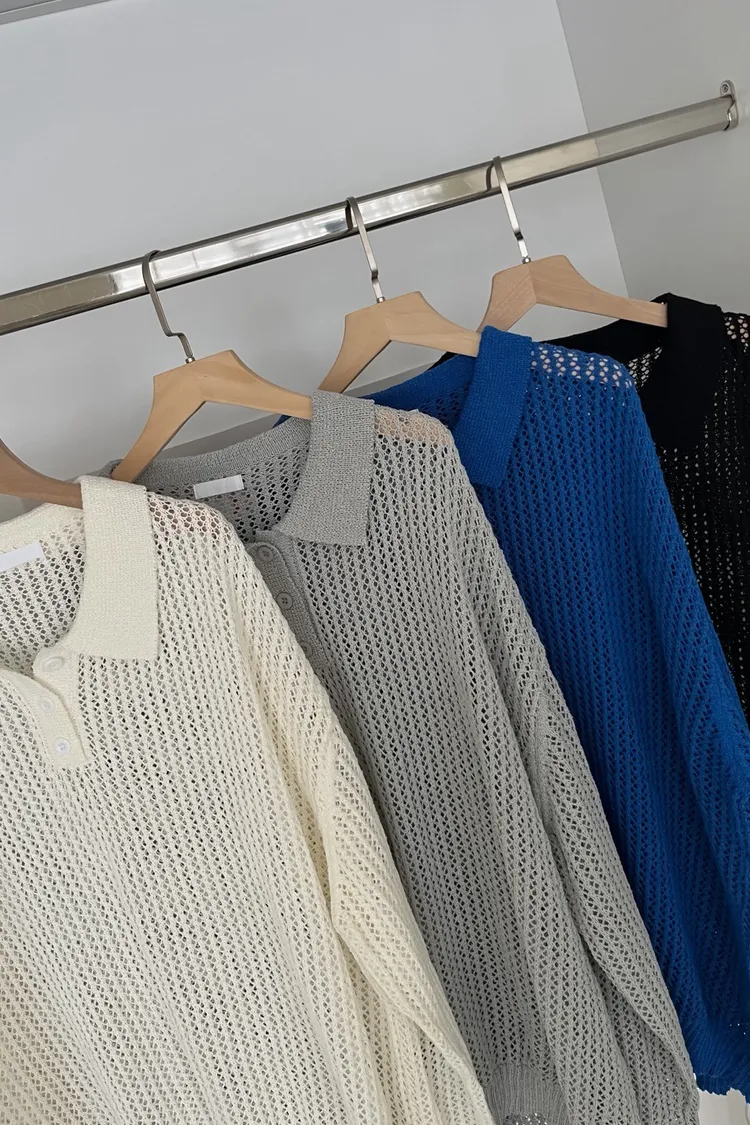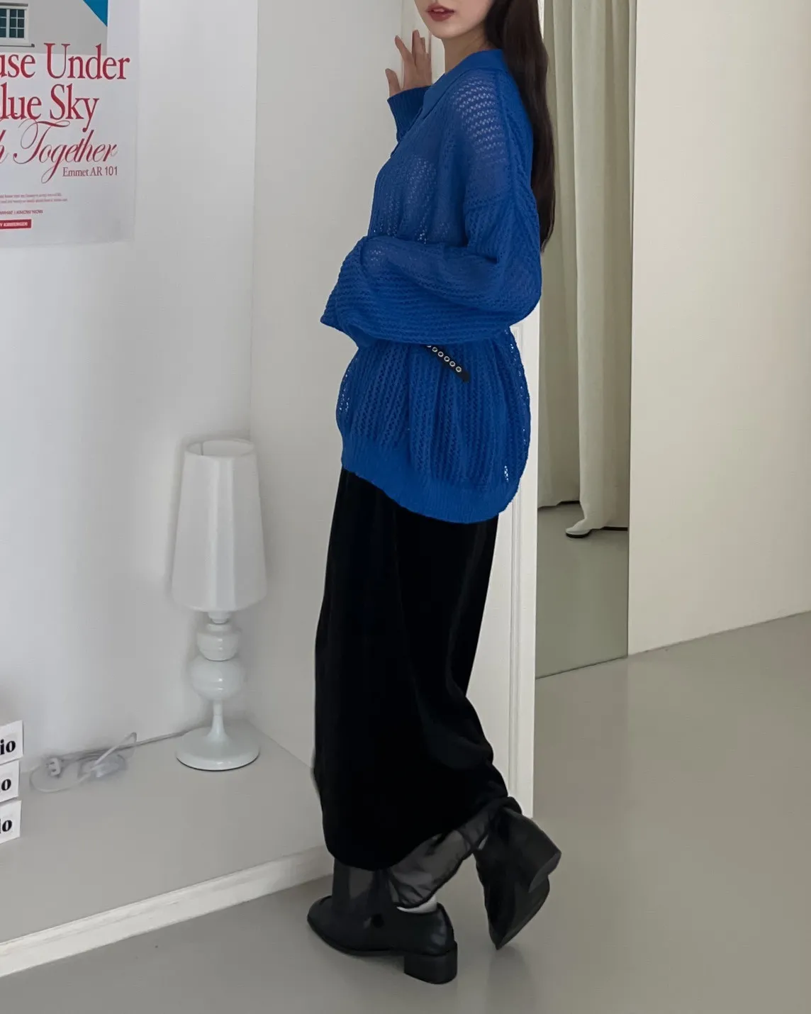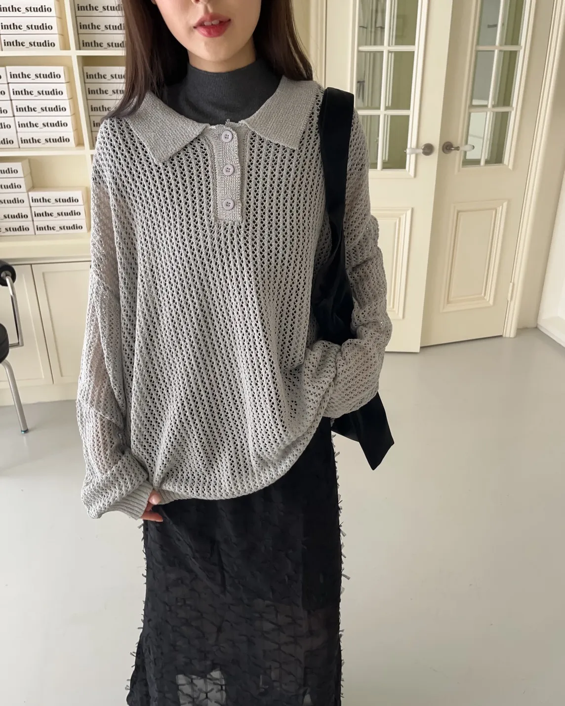 V0015翻領鈕扣洞洞落肩針織衣(米/藍/灰/黑)