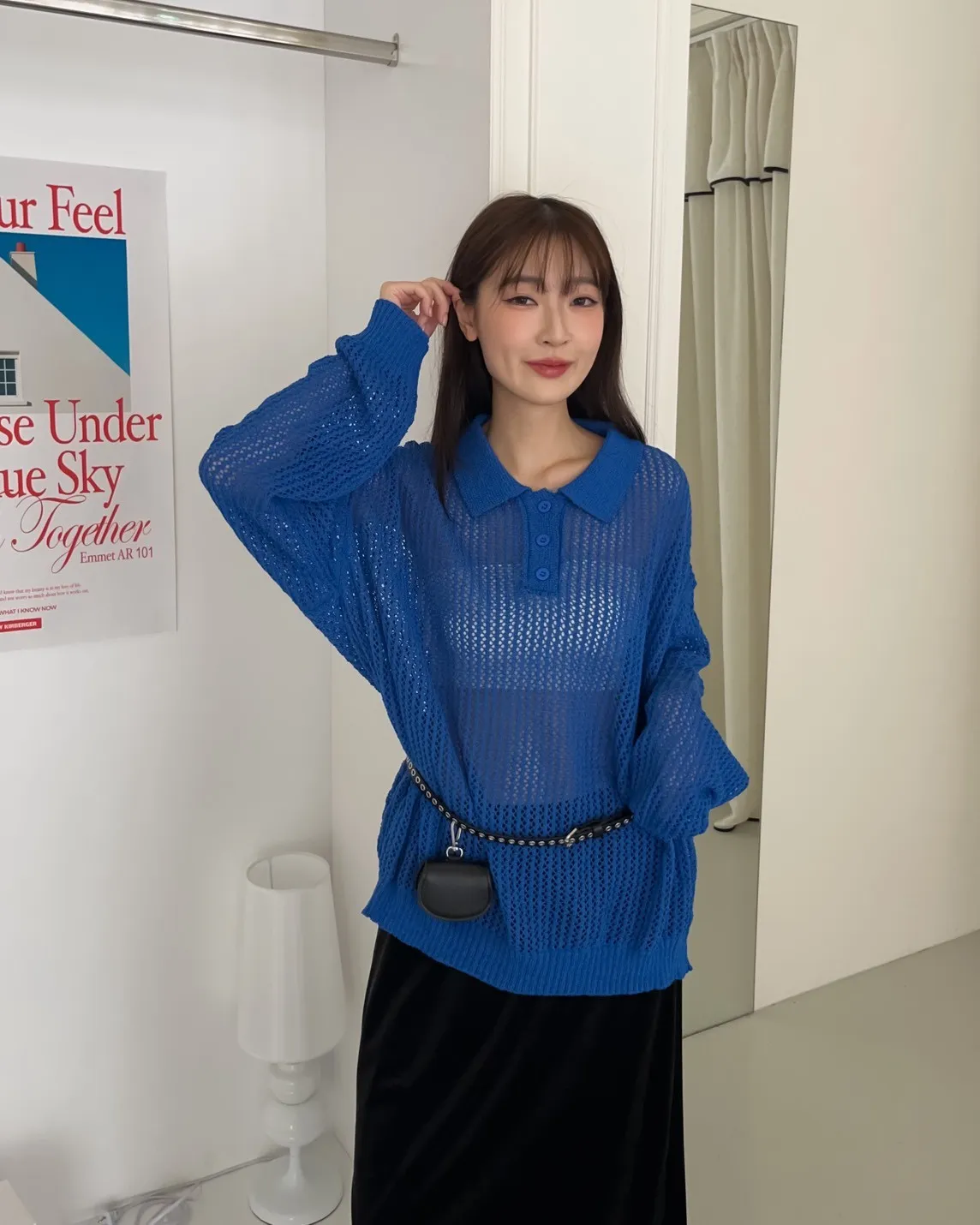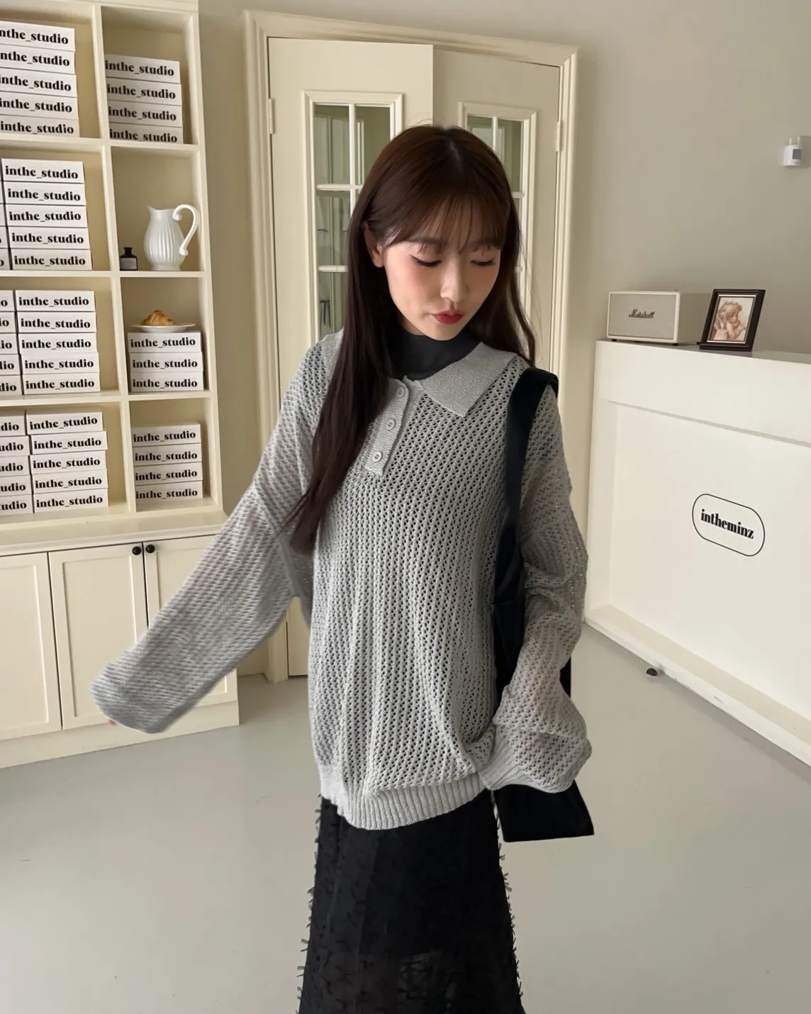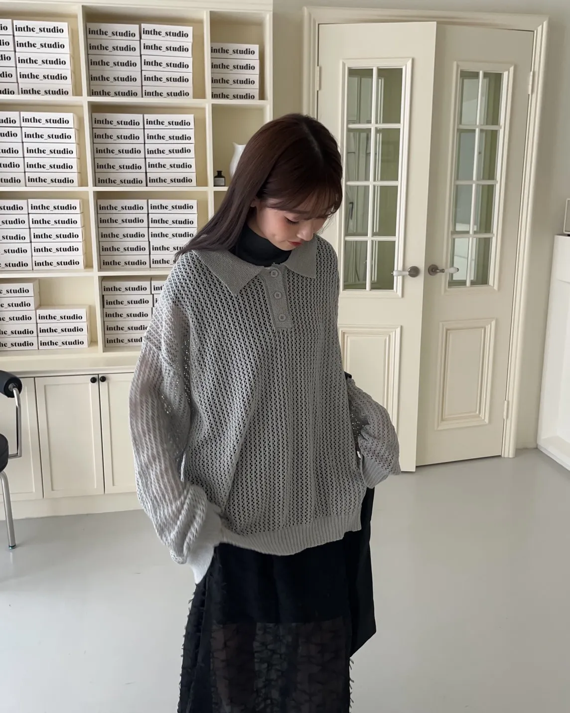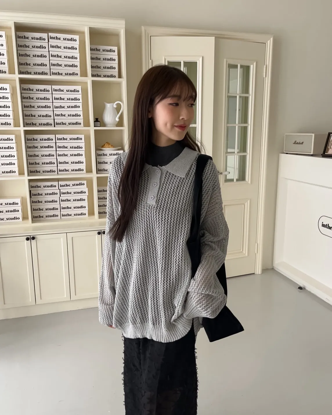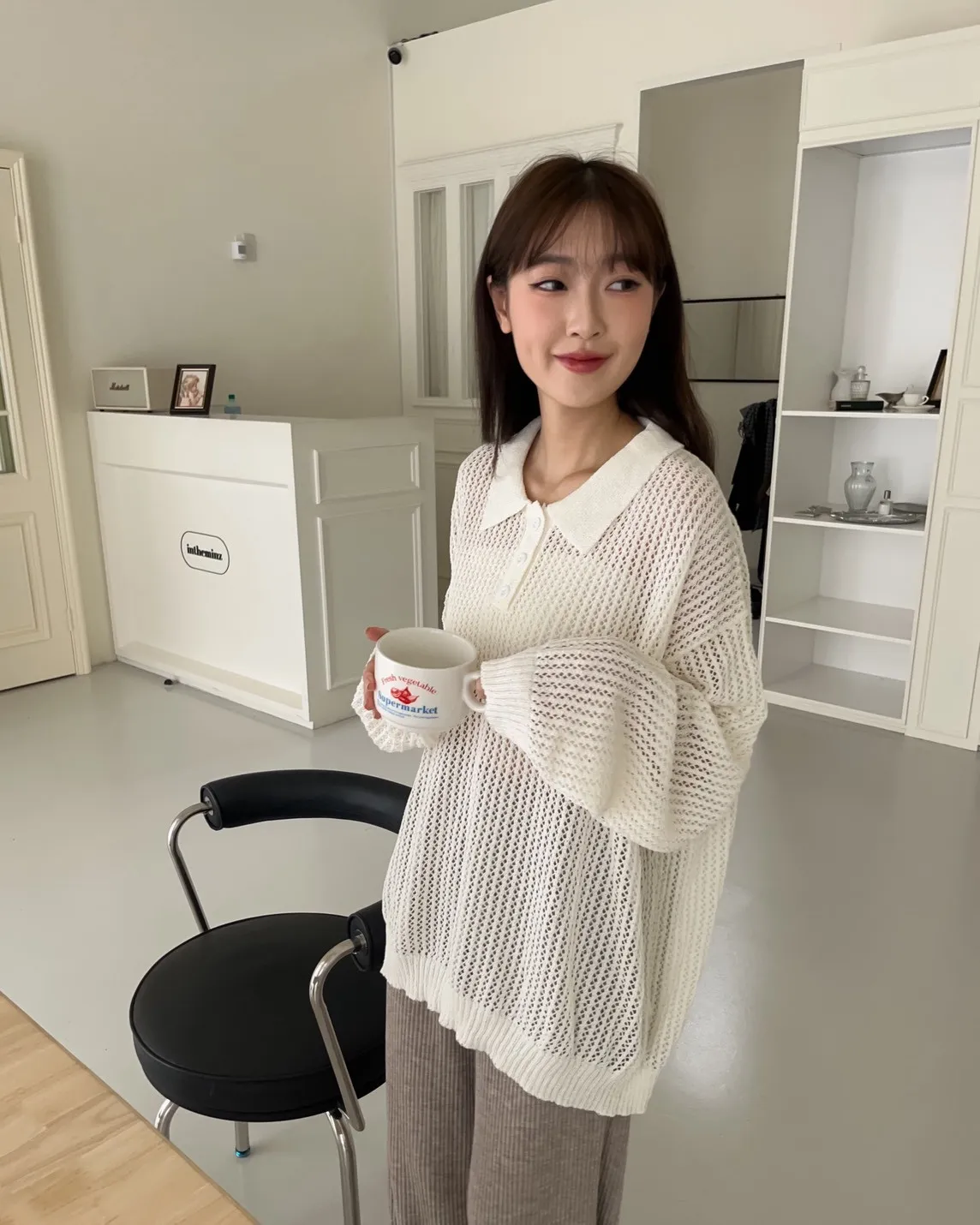 V0015翻領鈕扣洞洞落肩針織衣(米/藍/灰/黑)