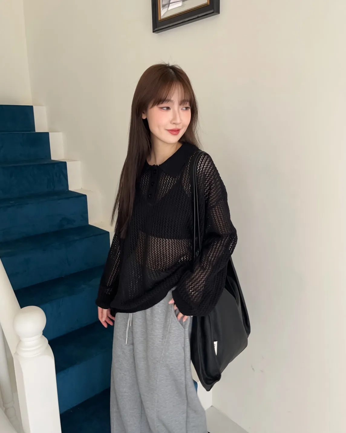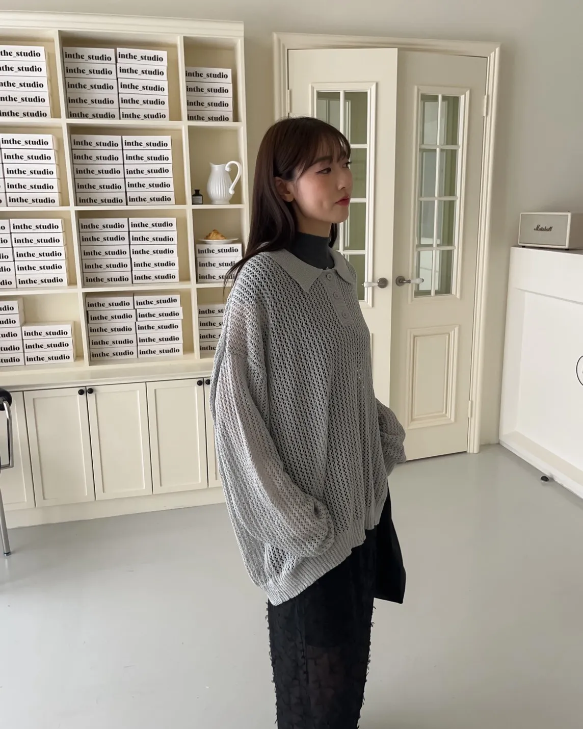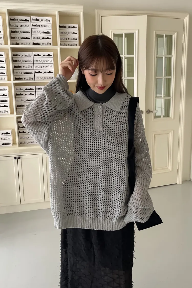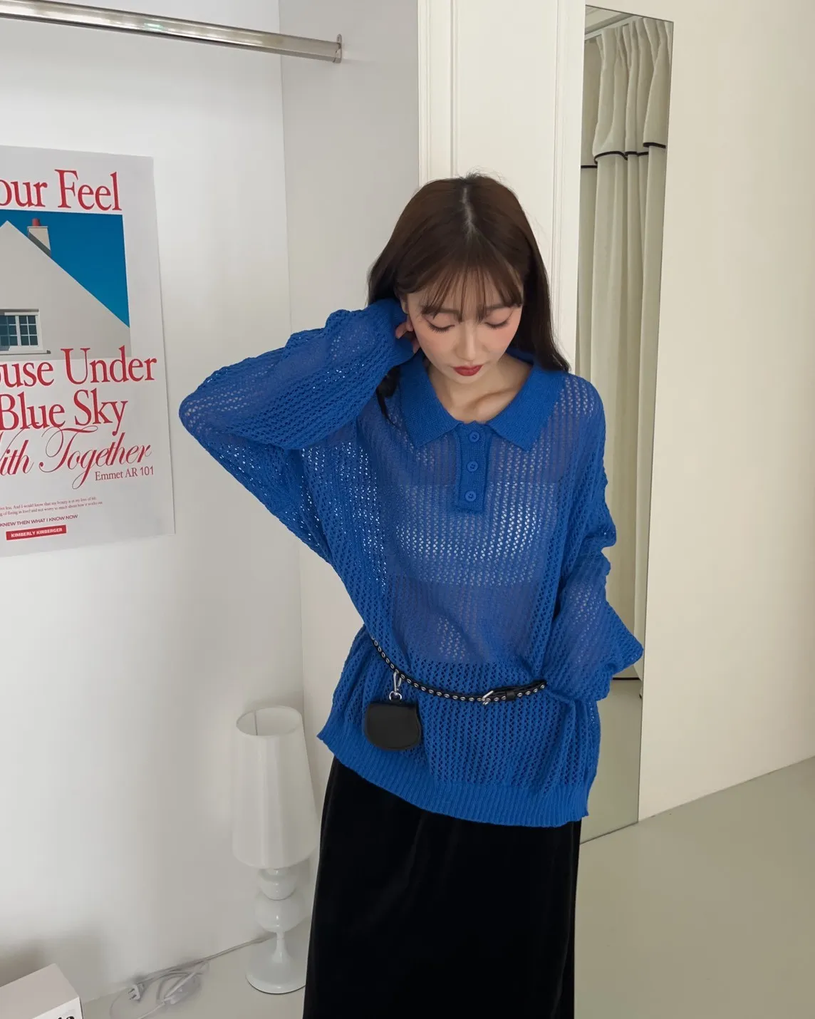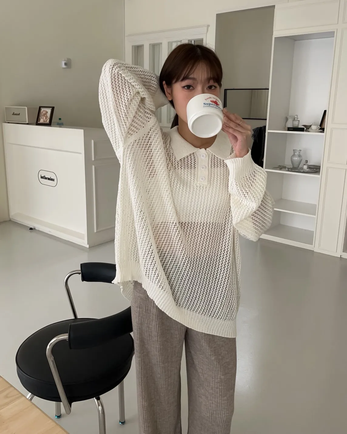 V0015翻領鈕扣洞洞落肩針織衣(米/藍/灰/黑)