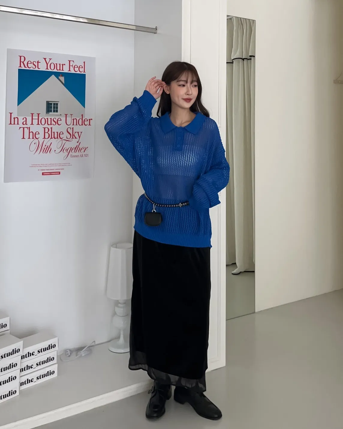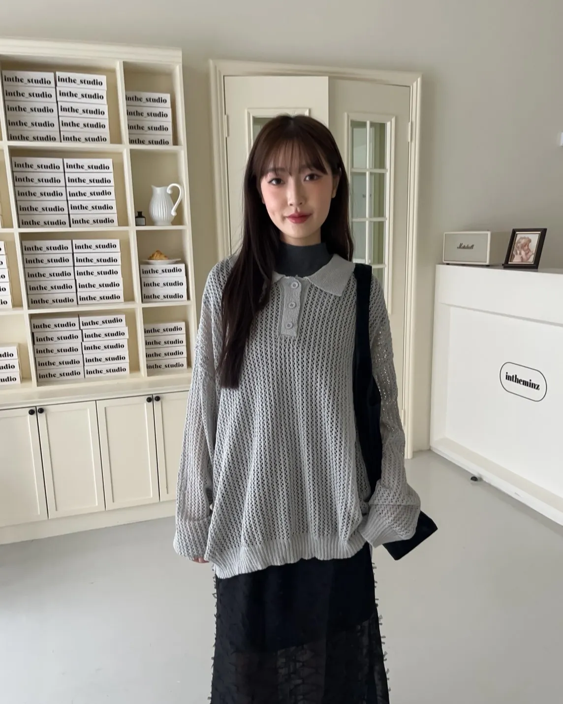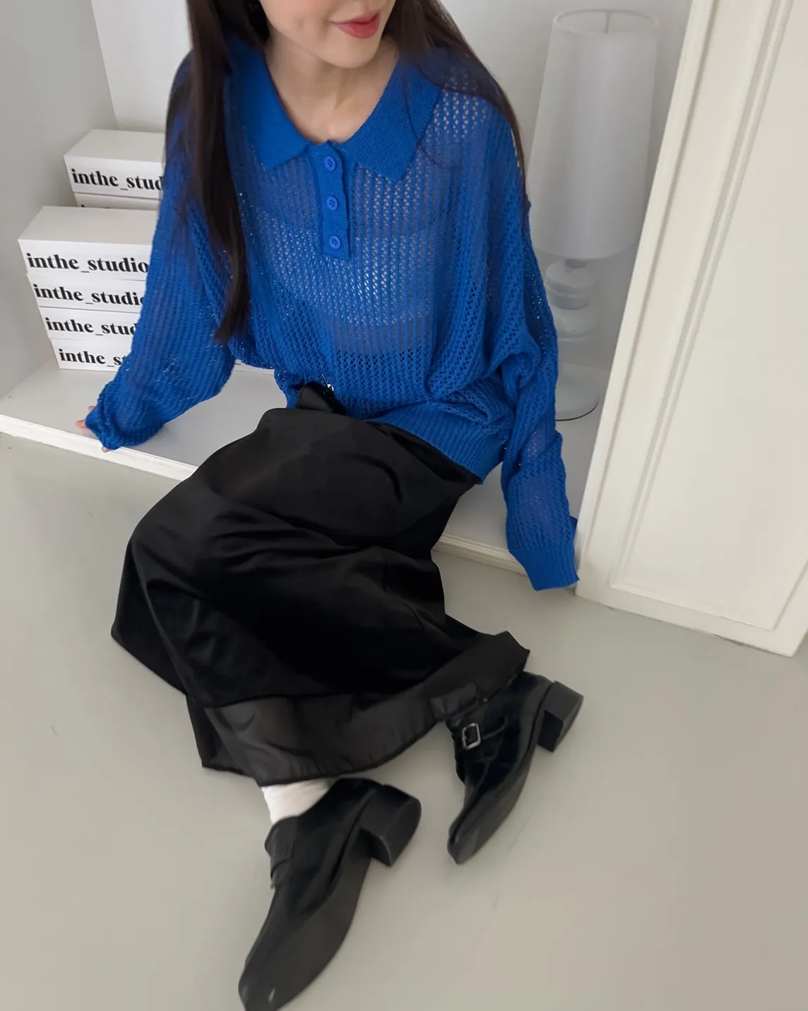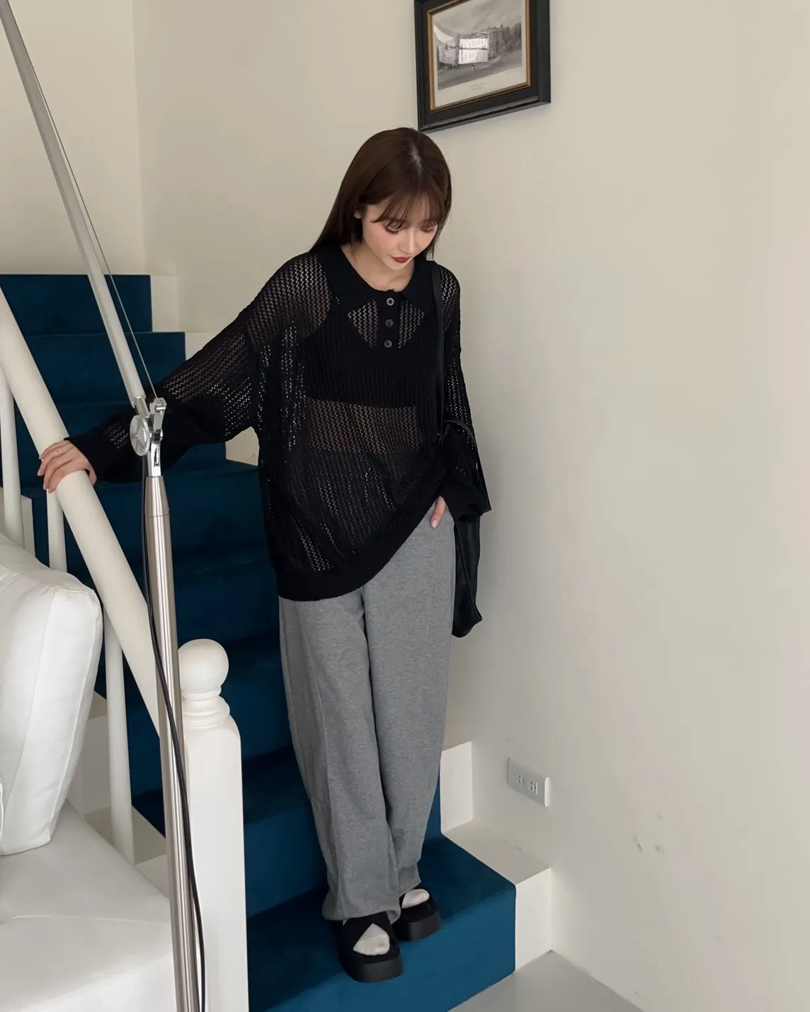 V0015翻領鈕扣洞洞落肩針織衣(米/藍/灰/黑)