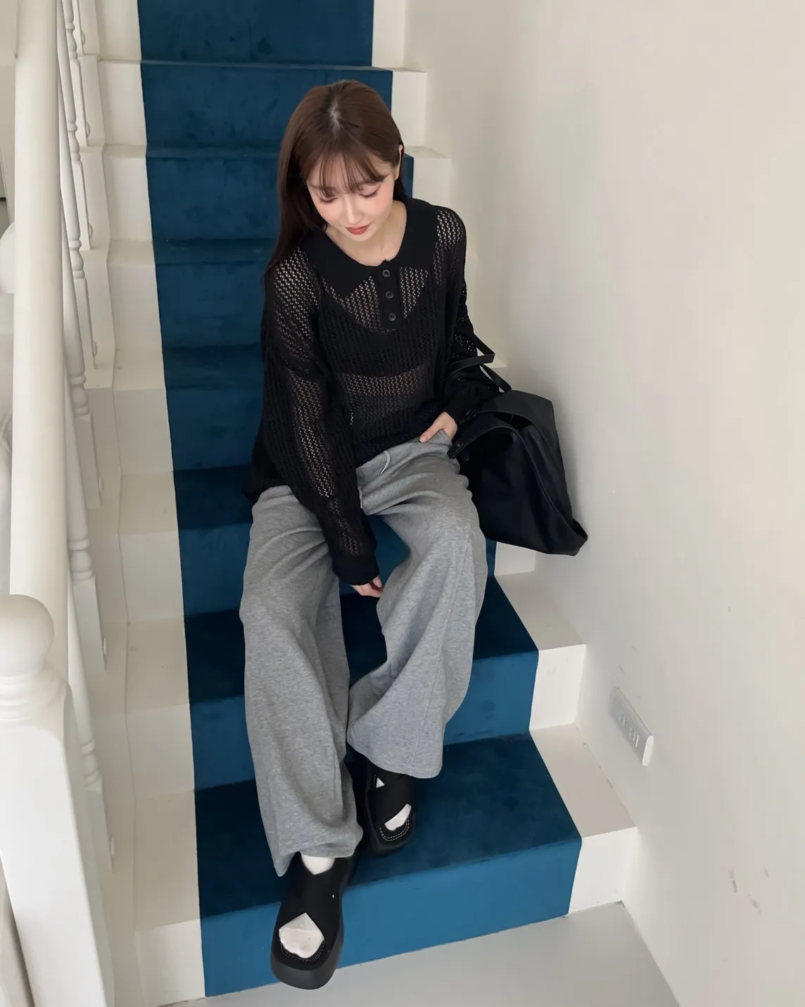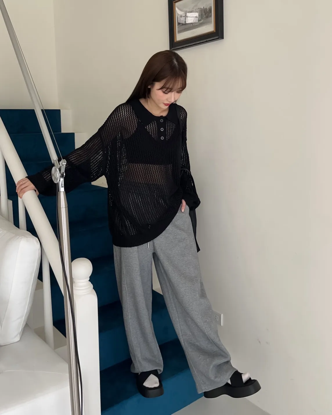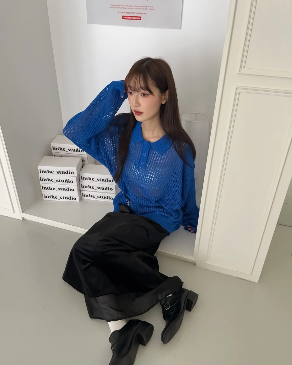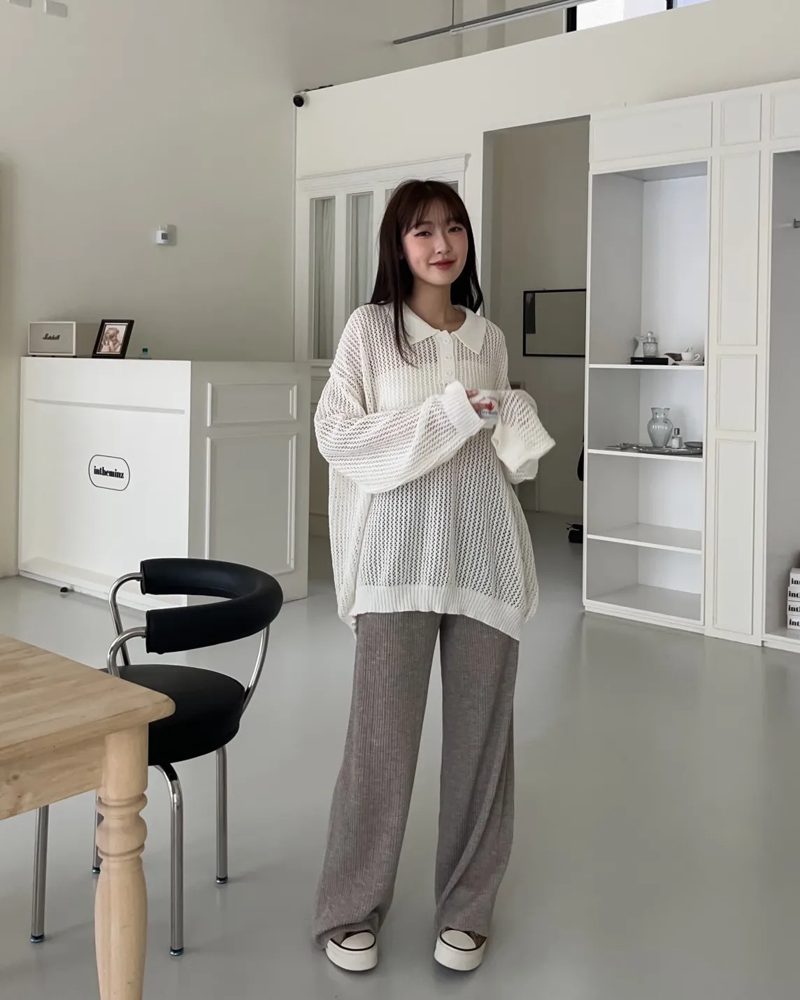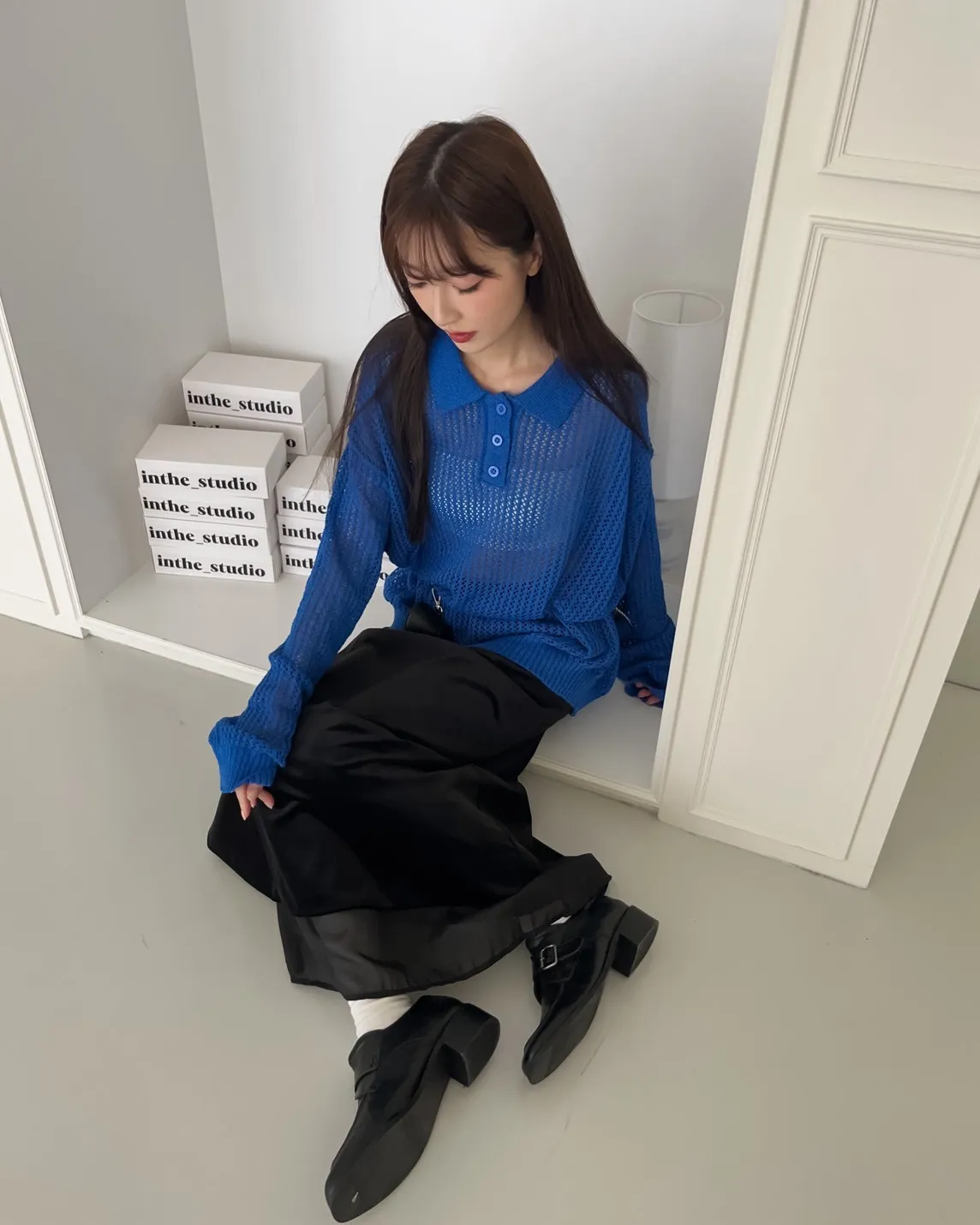 V0015翻領鈕扣洞洞落肩針織衣(米/藍/灰/黑)