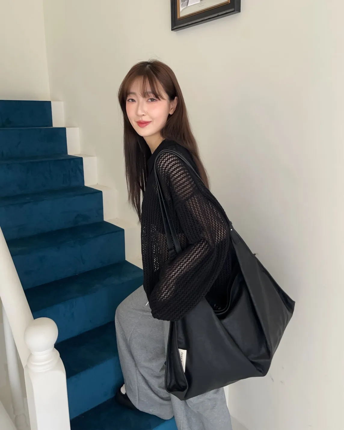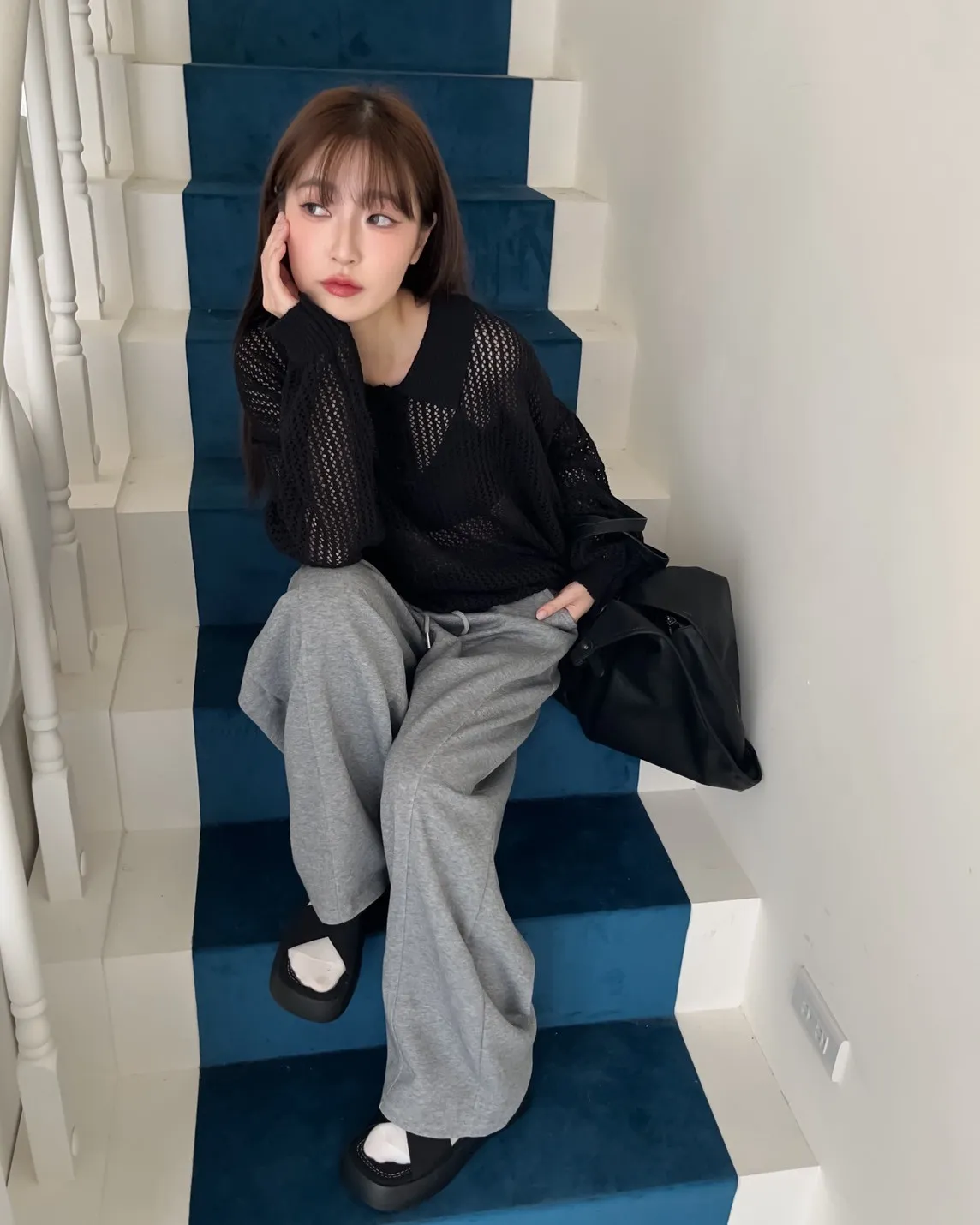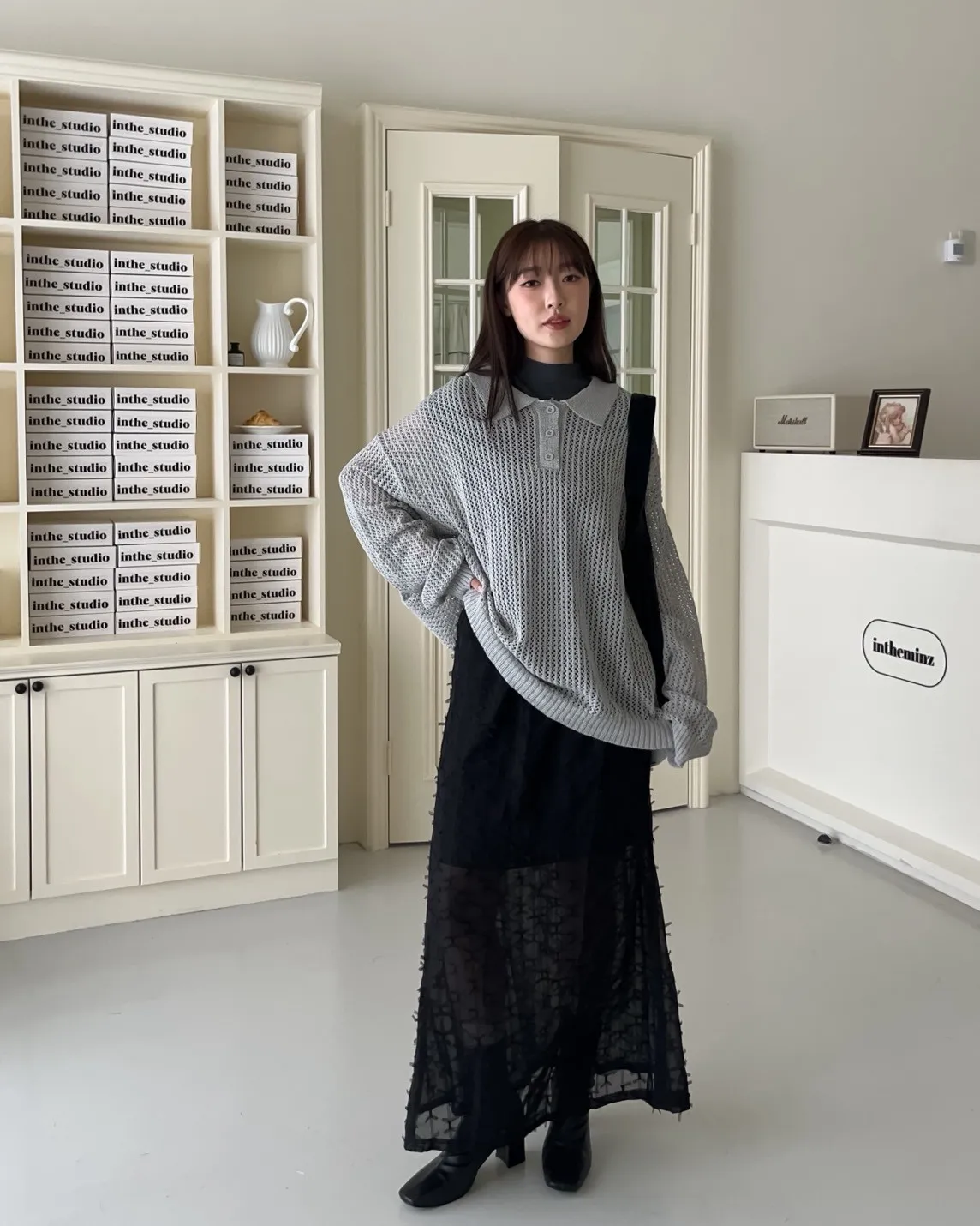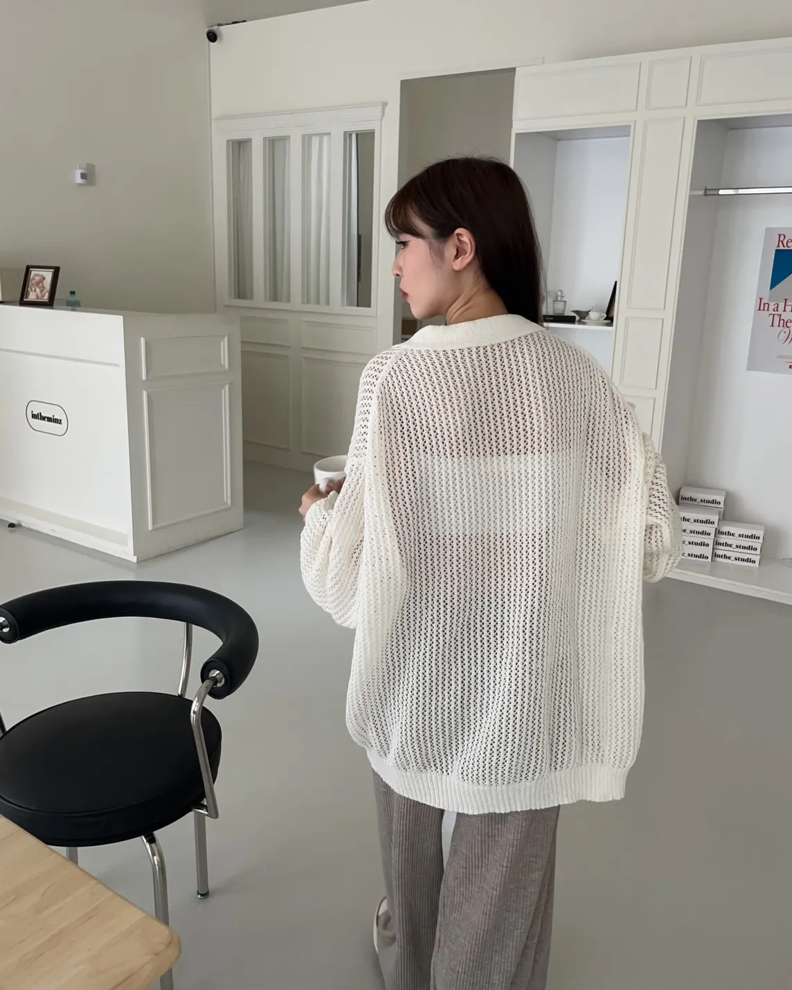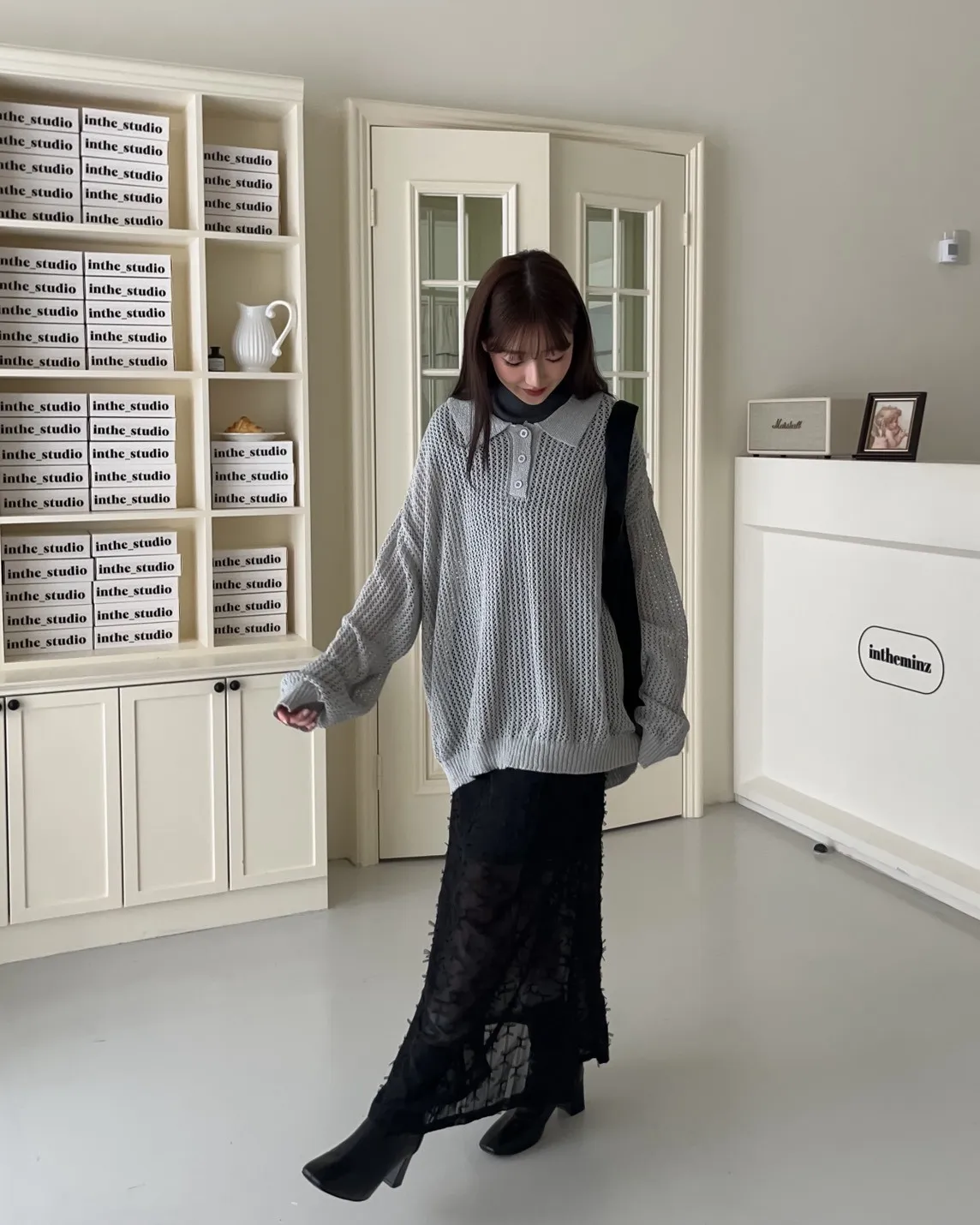 V0015翻領鈕扣洞洞落肩針織衣(米/藍/灰/黑)