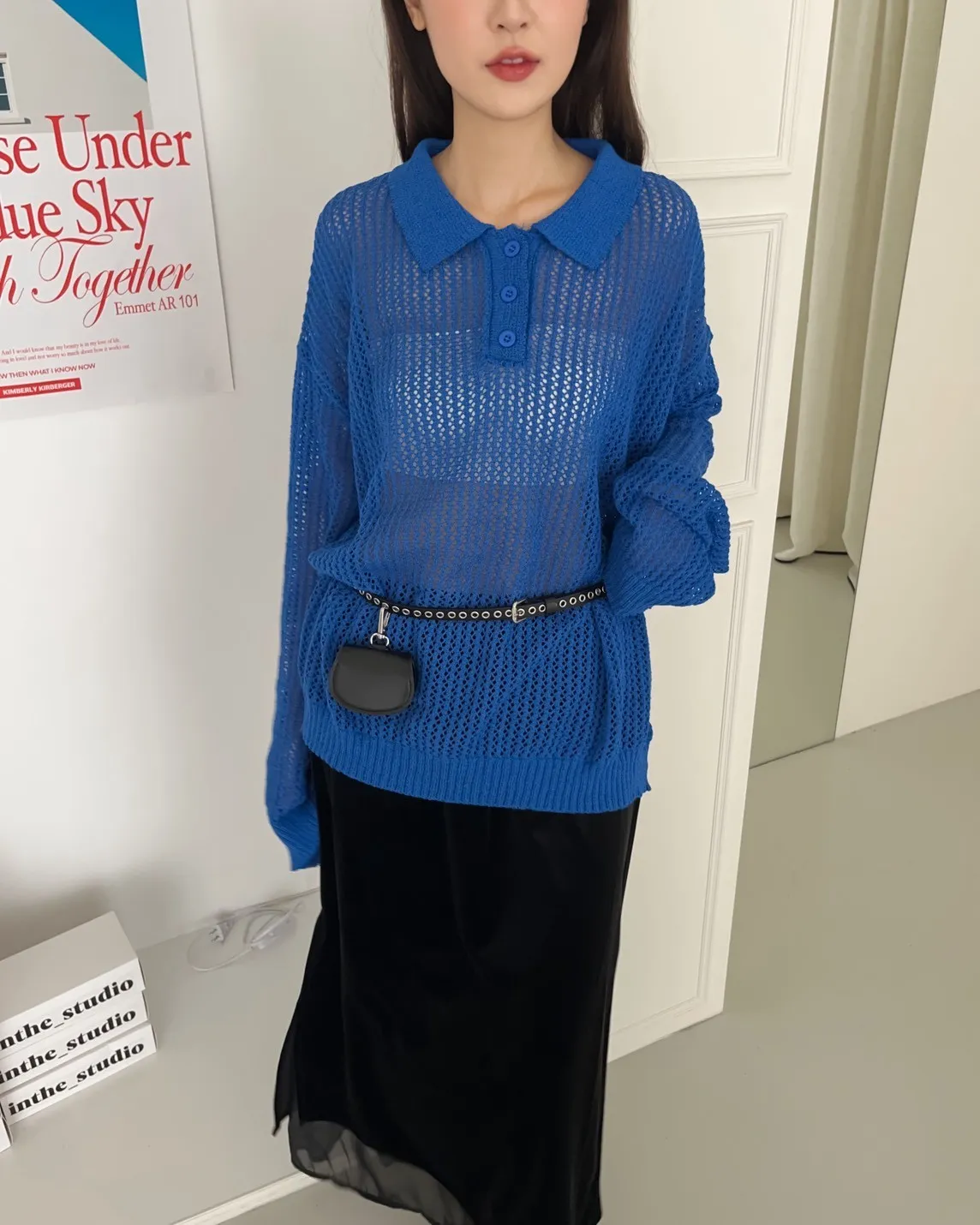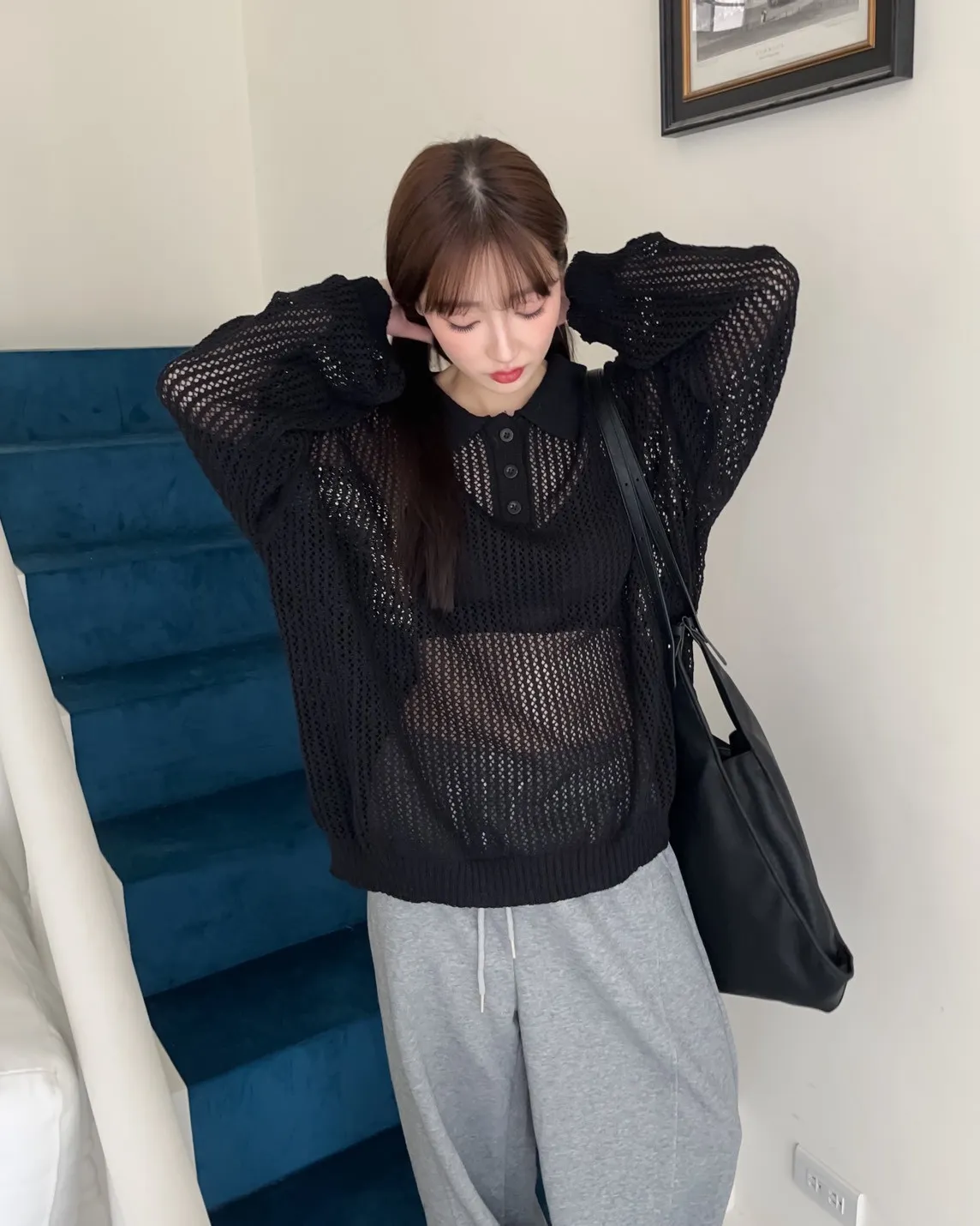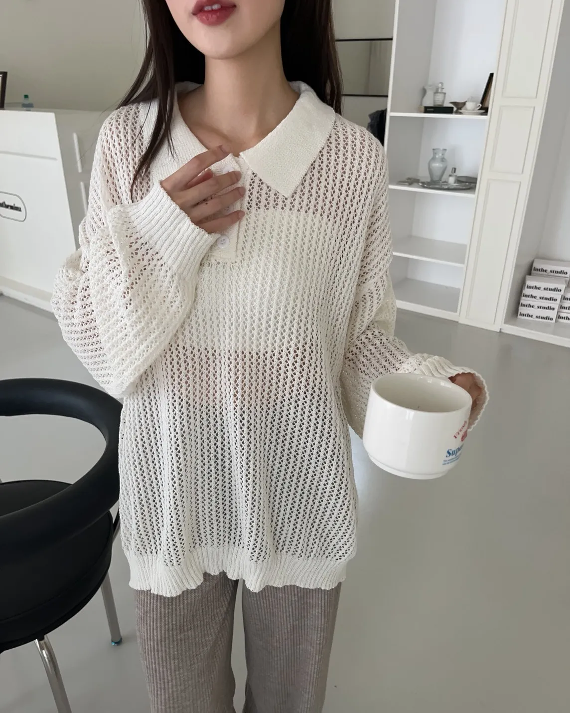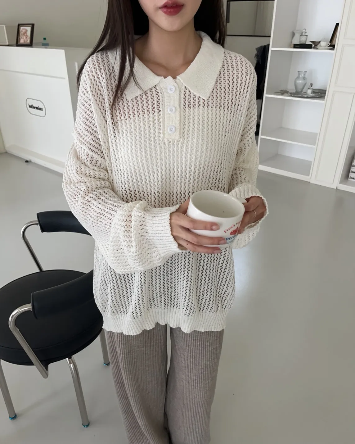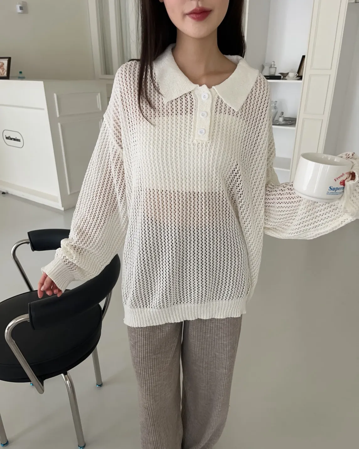 鈕扣翻領 針織 鏤空洞洞 下擺可愛內縮 同色系鈕扣