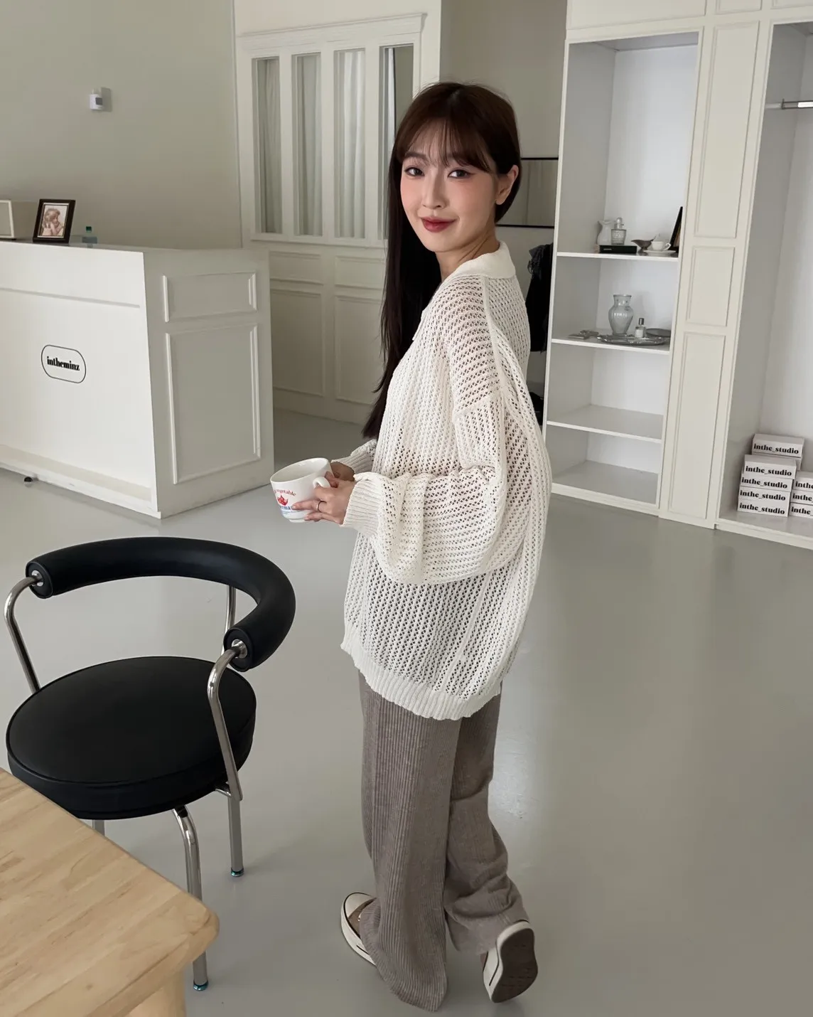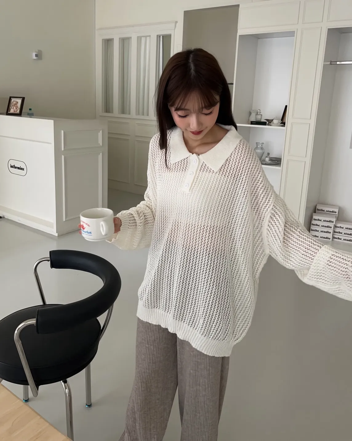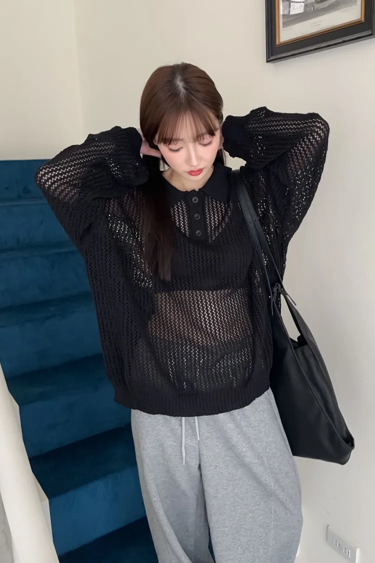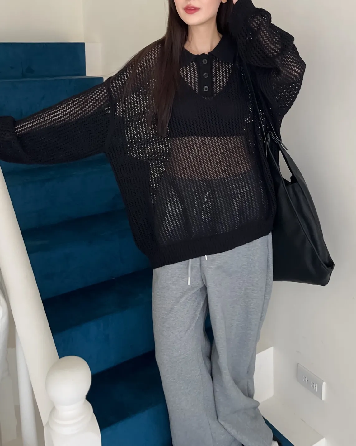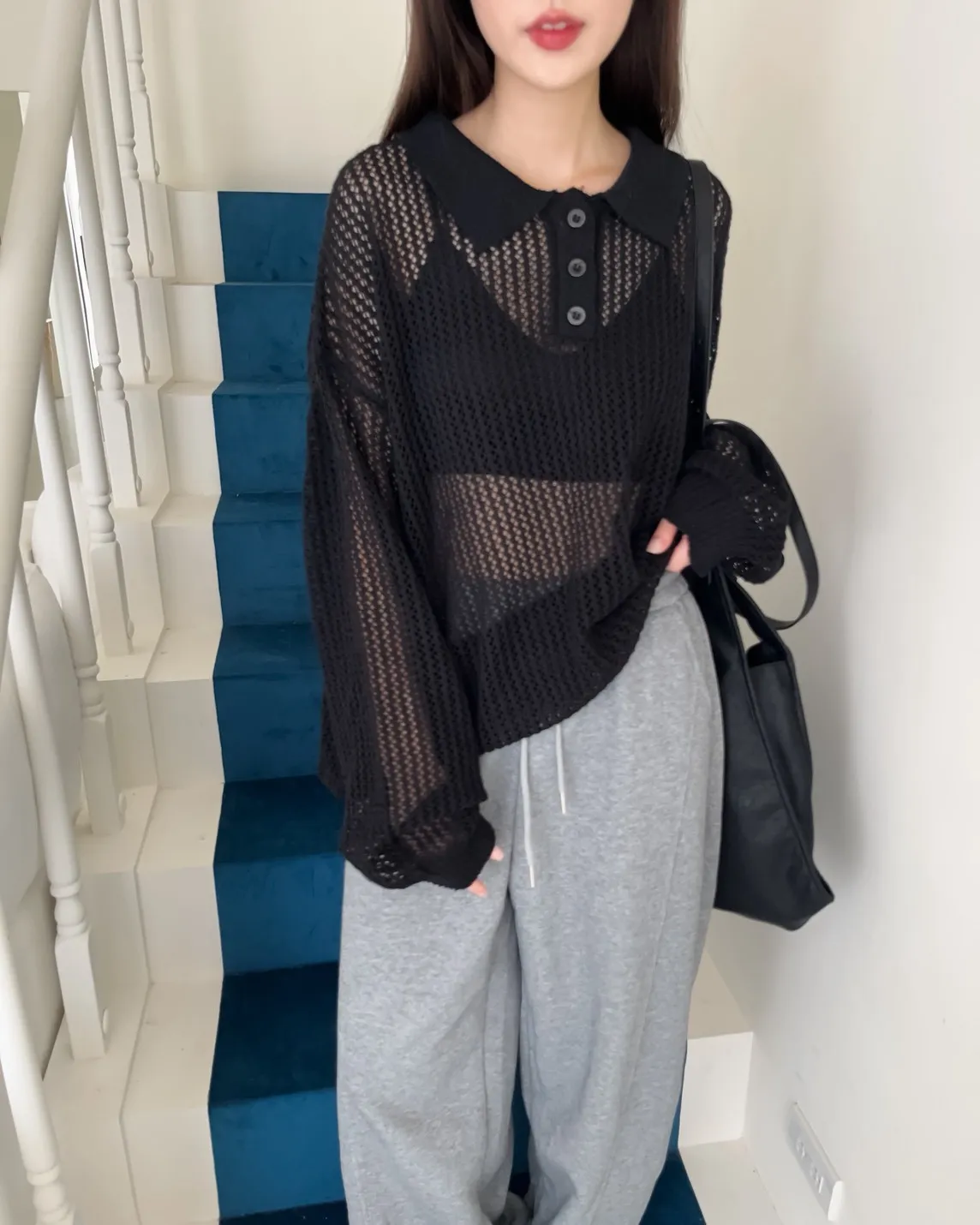 鈕扣翻領 針織 鏤空洞洞 下擺可愛內縮 同色系鈕扣