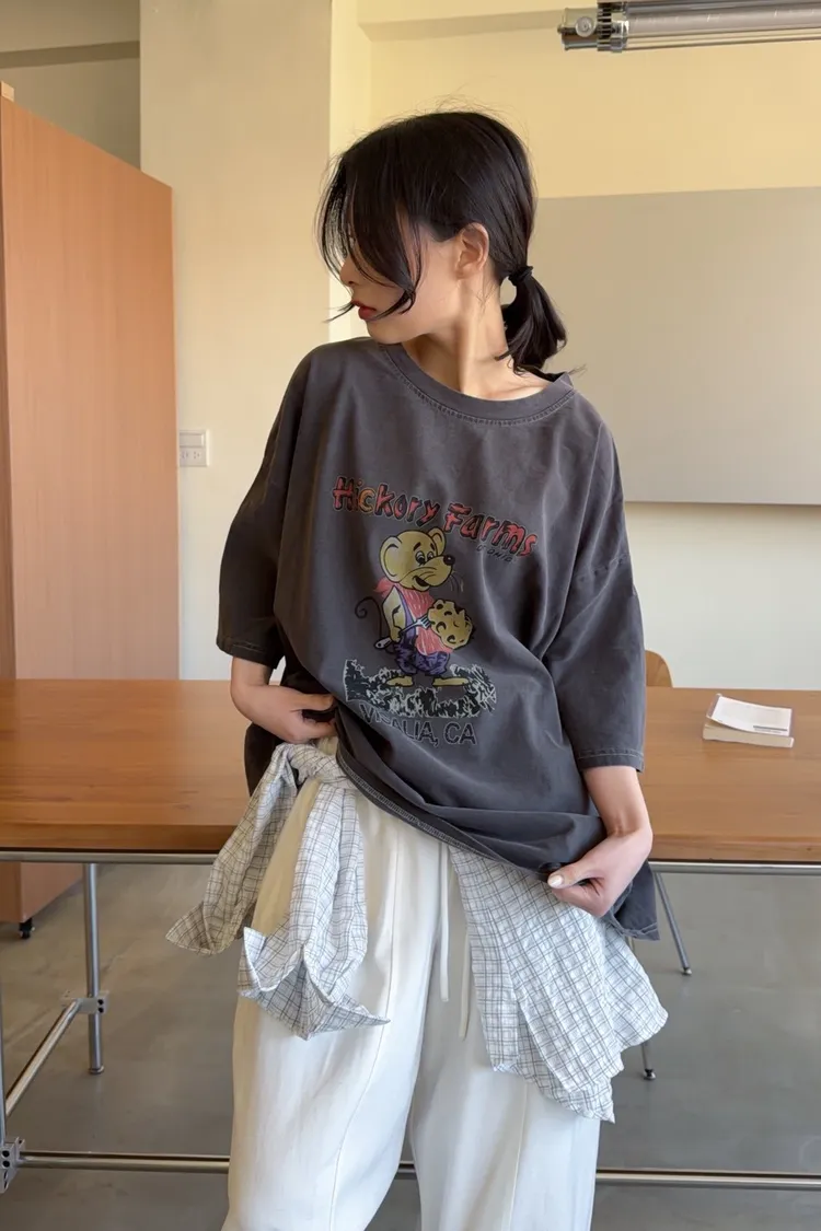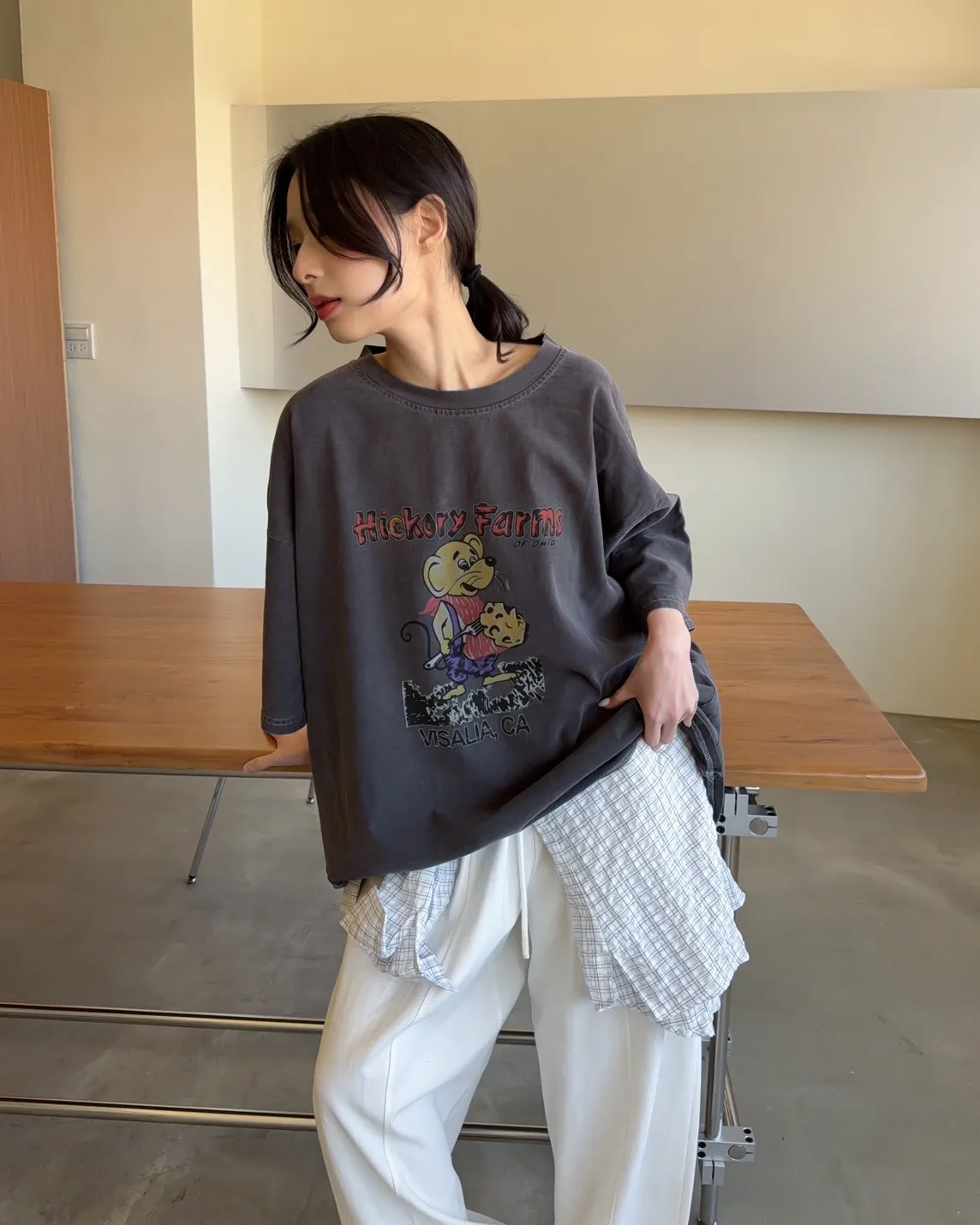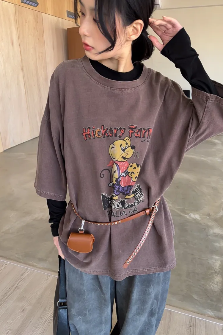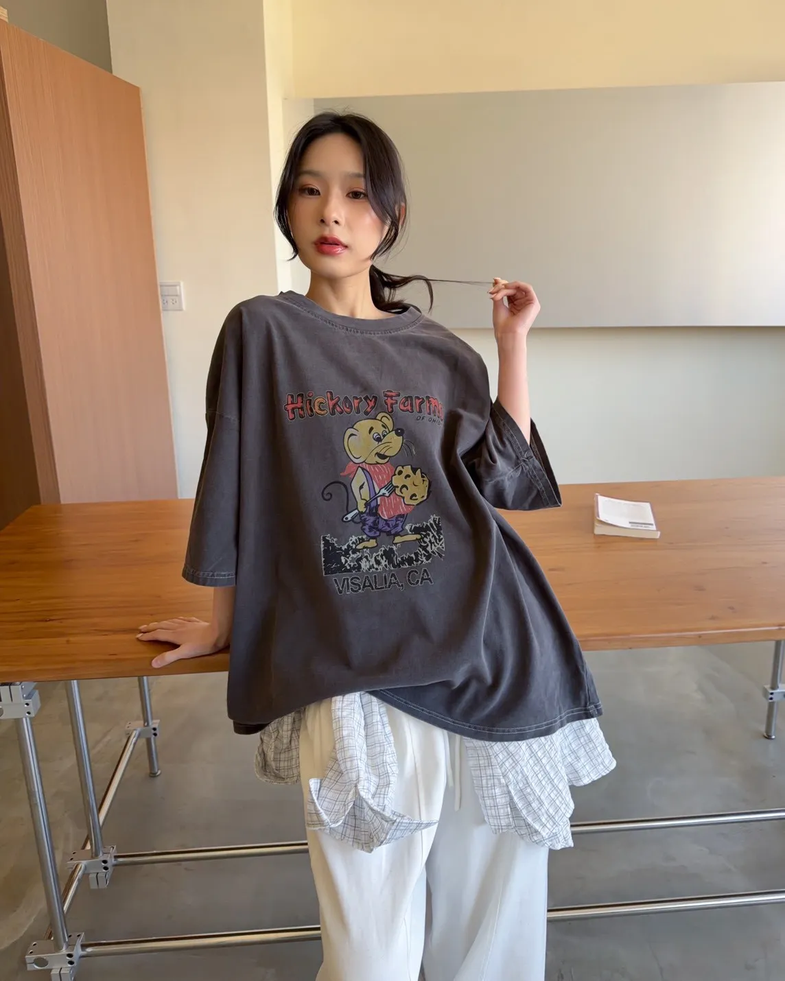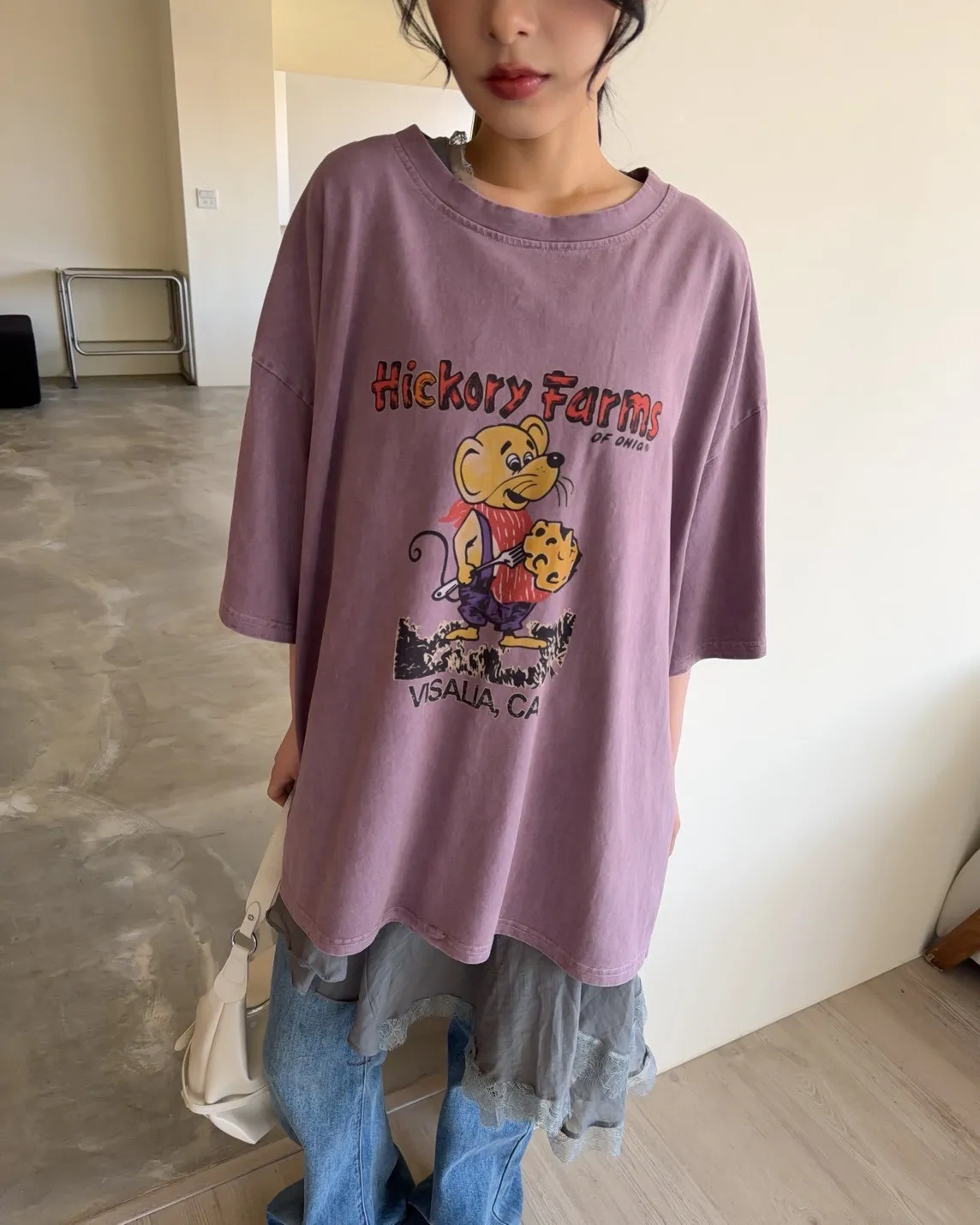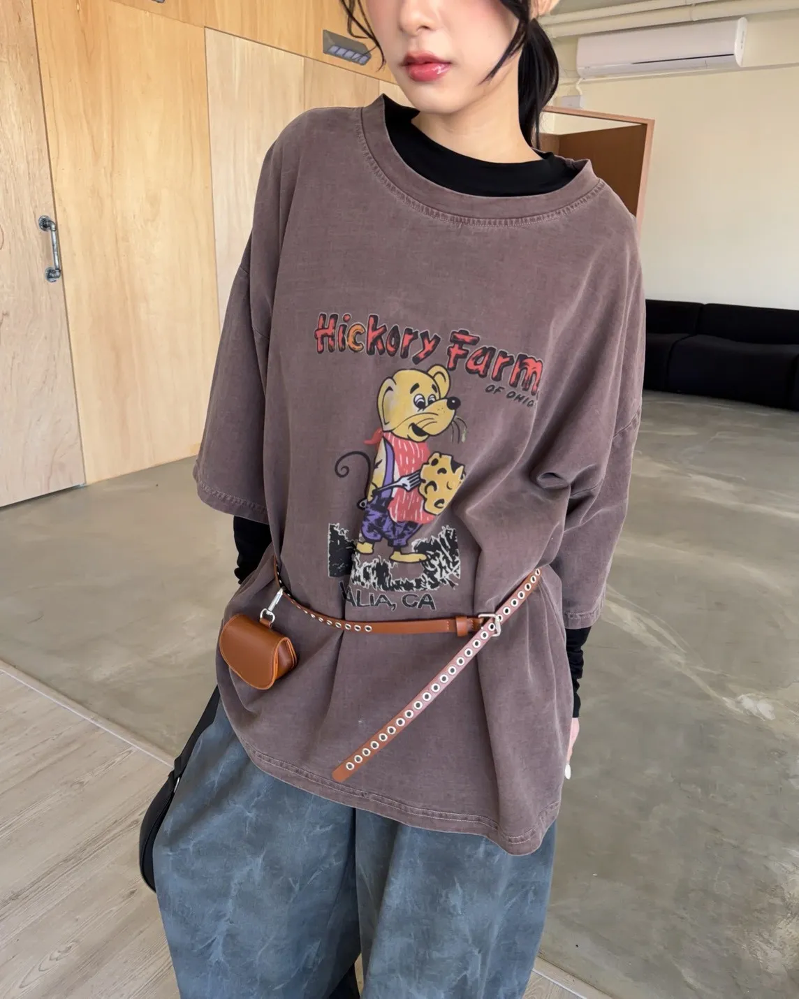 寬鬆落肩 刷白水洗做舊 老鼠起司印花