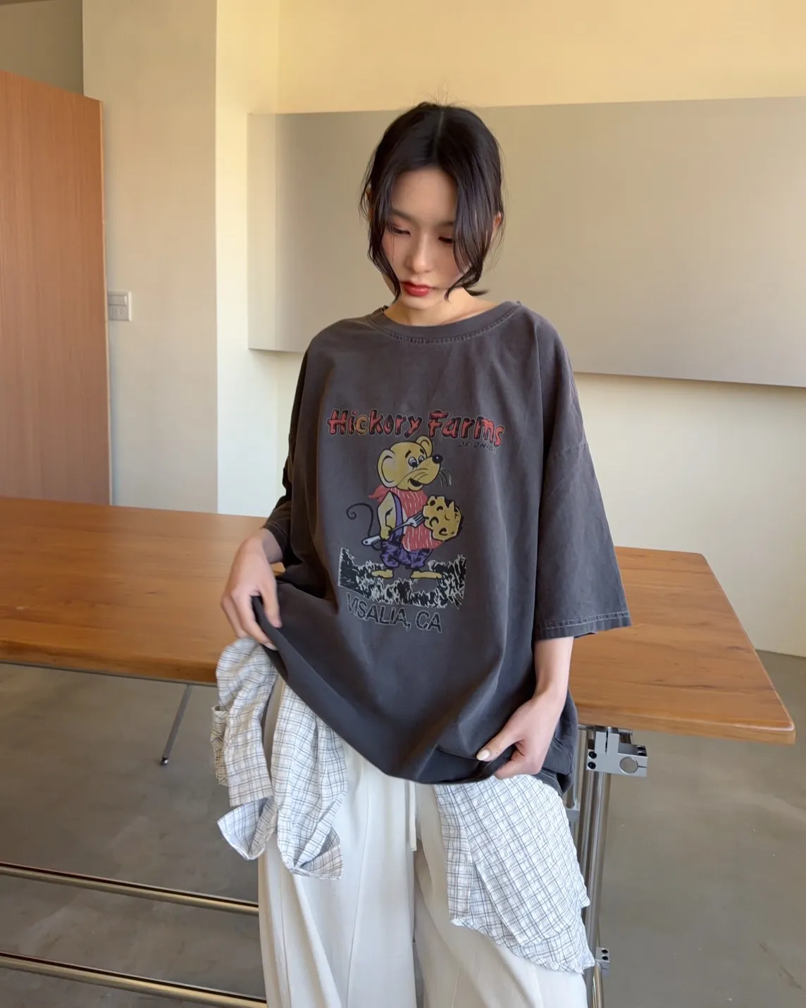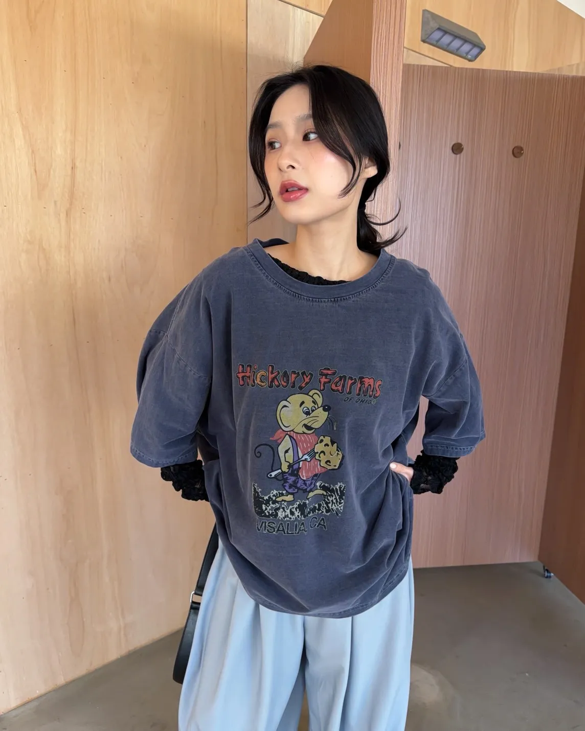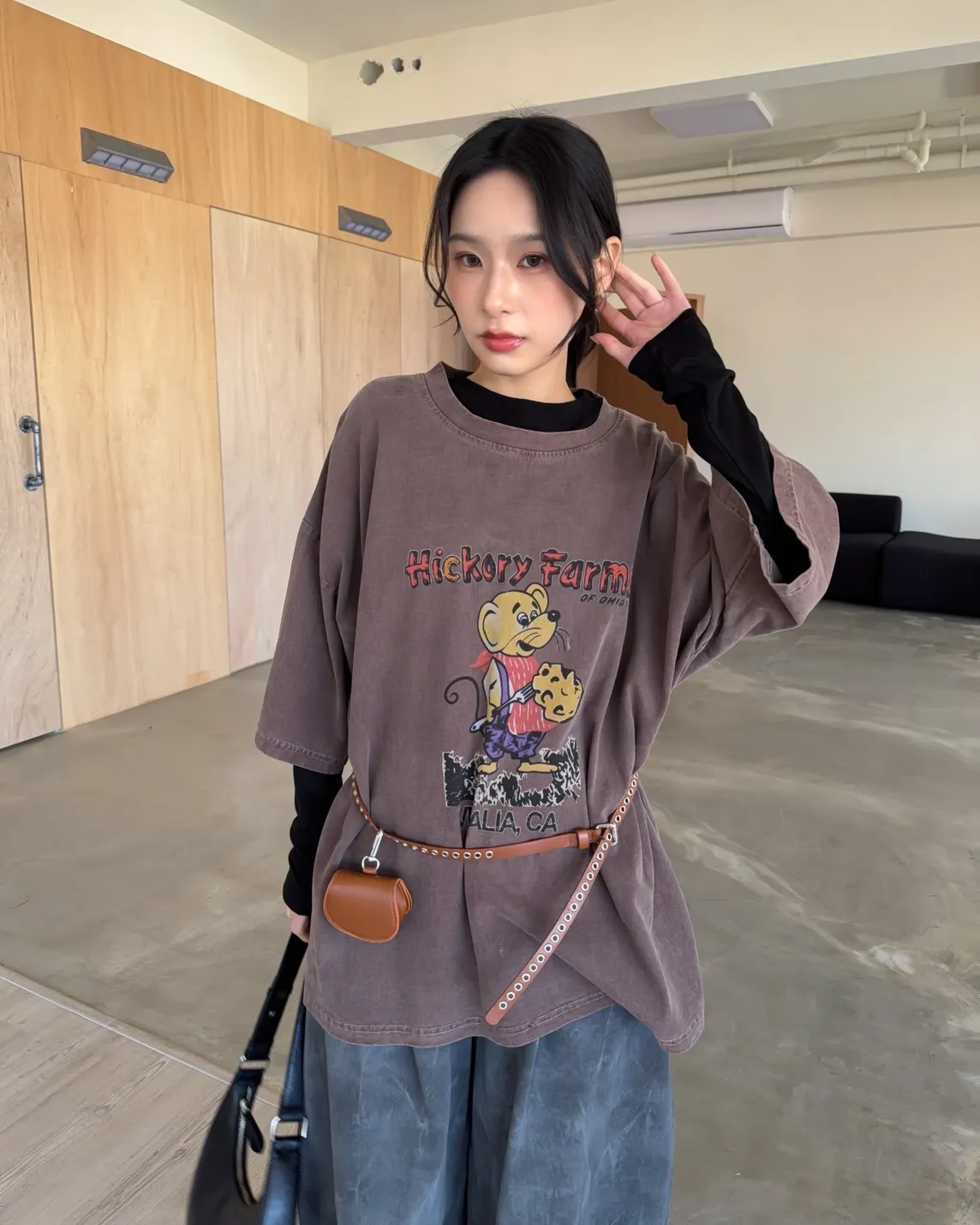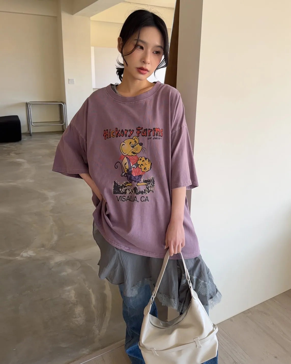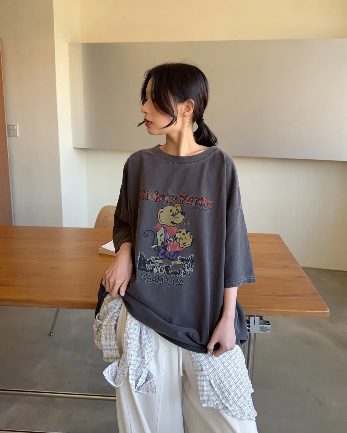 寬鬆落肩 刷白水洗做舊 老鼠起司印花