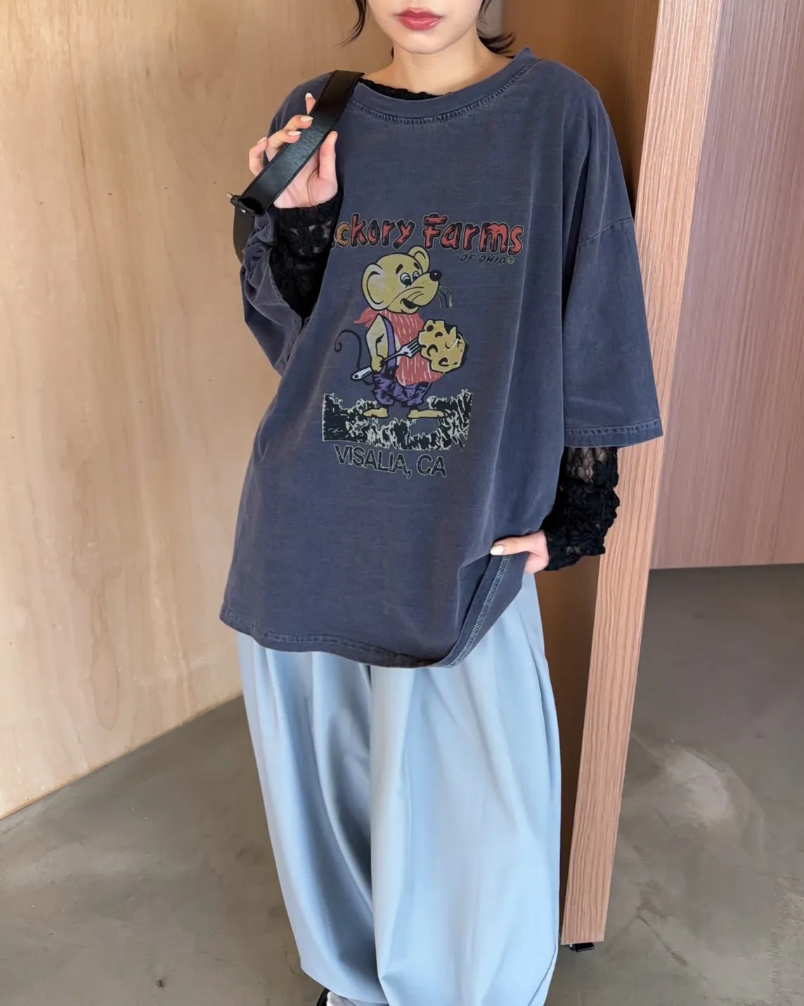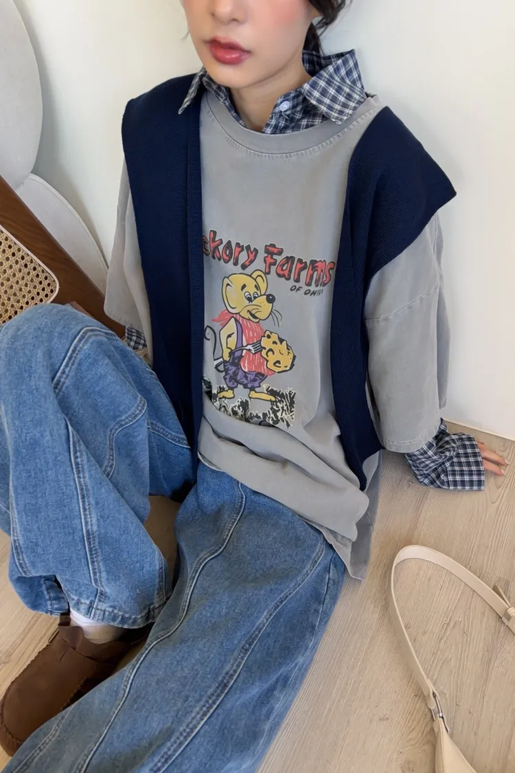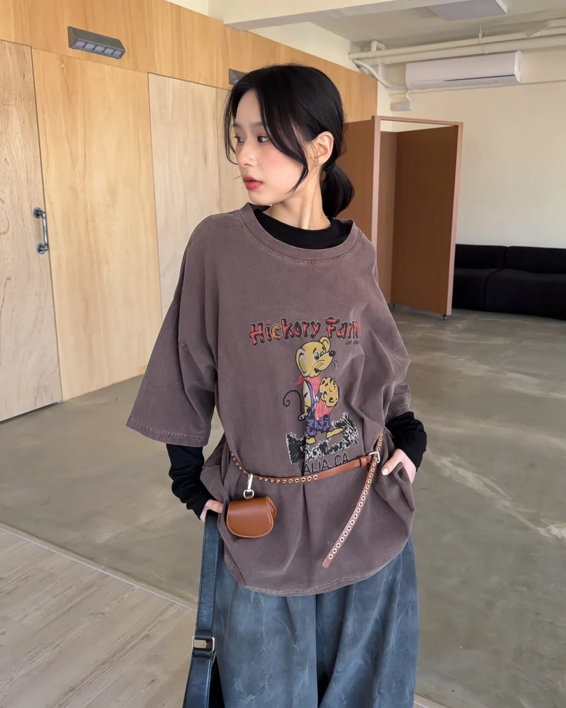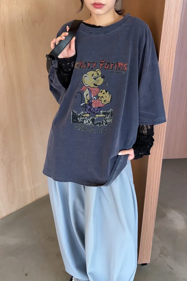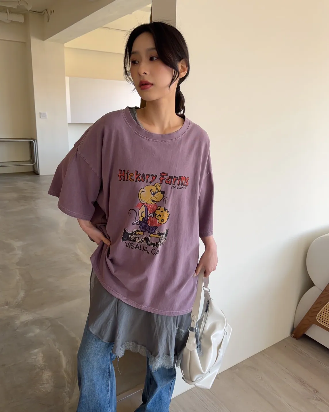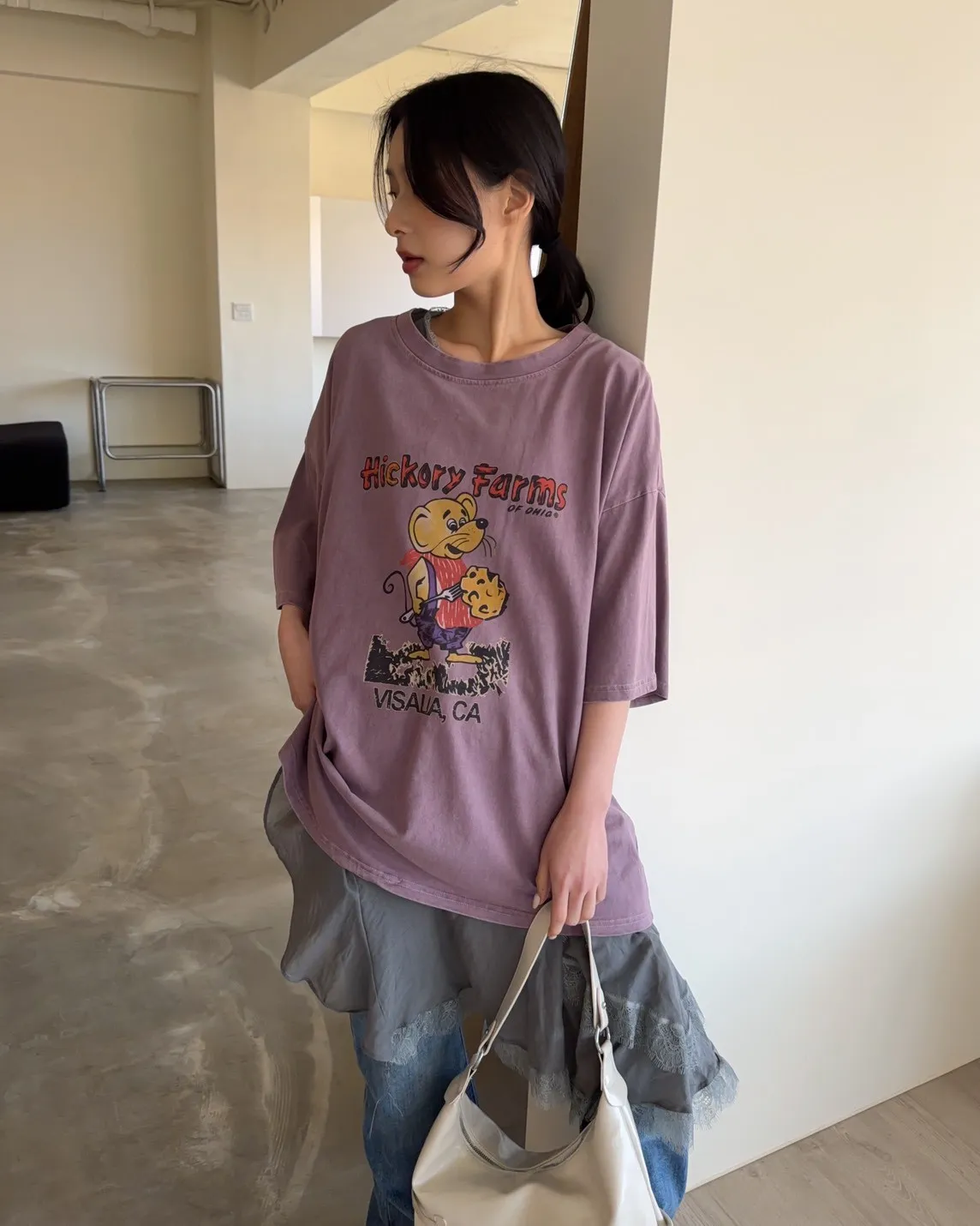 寬鬆落肩 刷白水洗做舊 老鼠起司印花