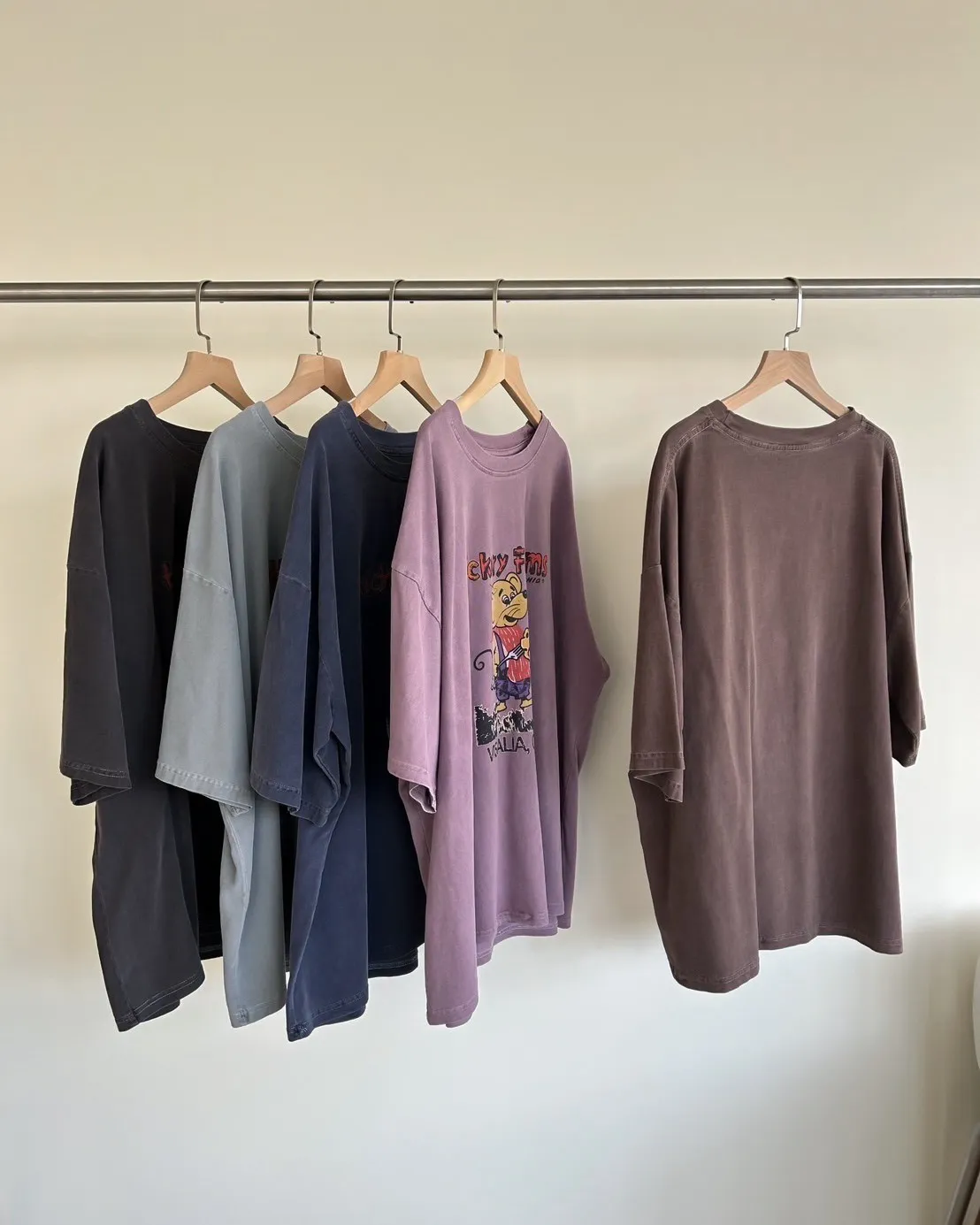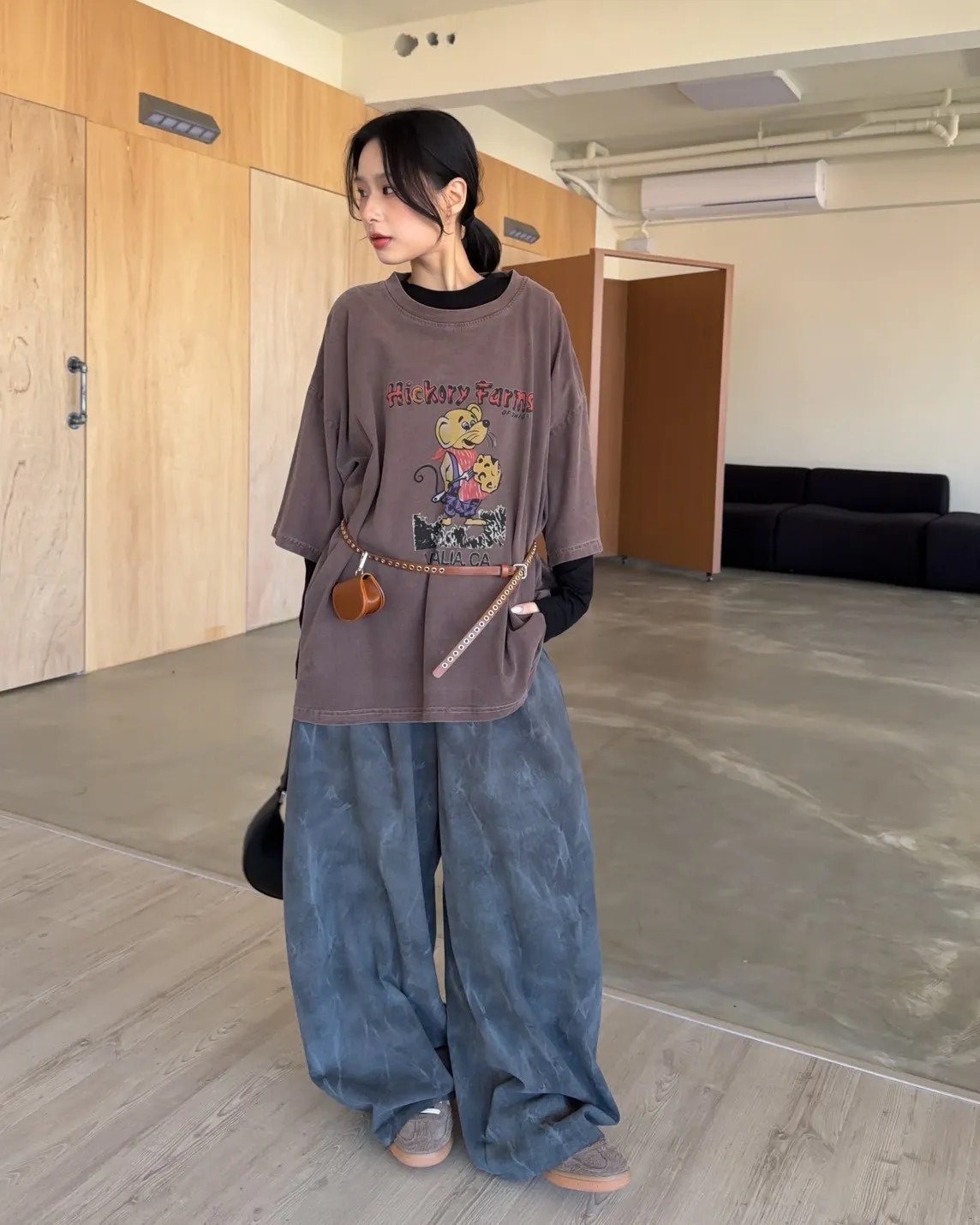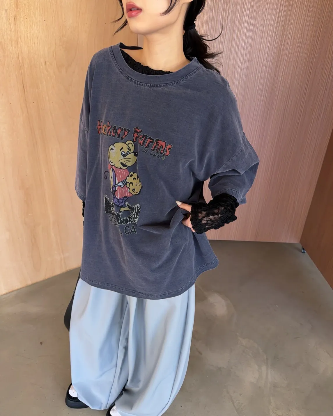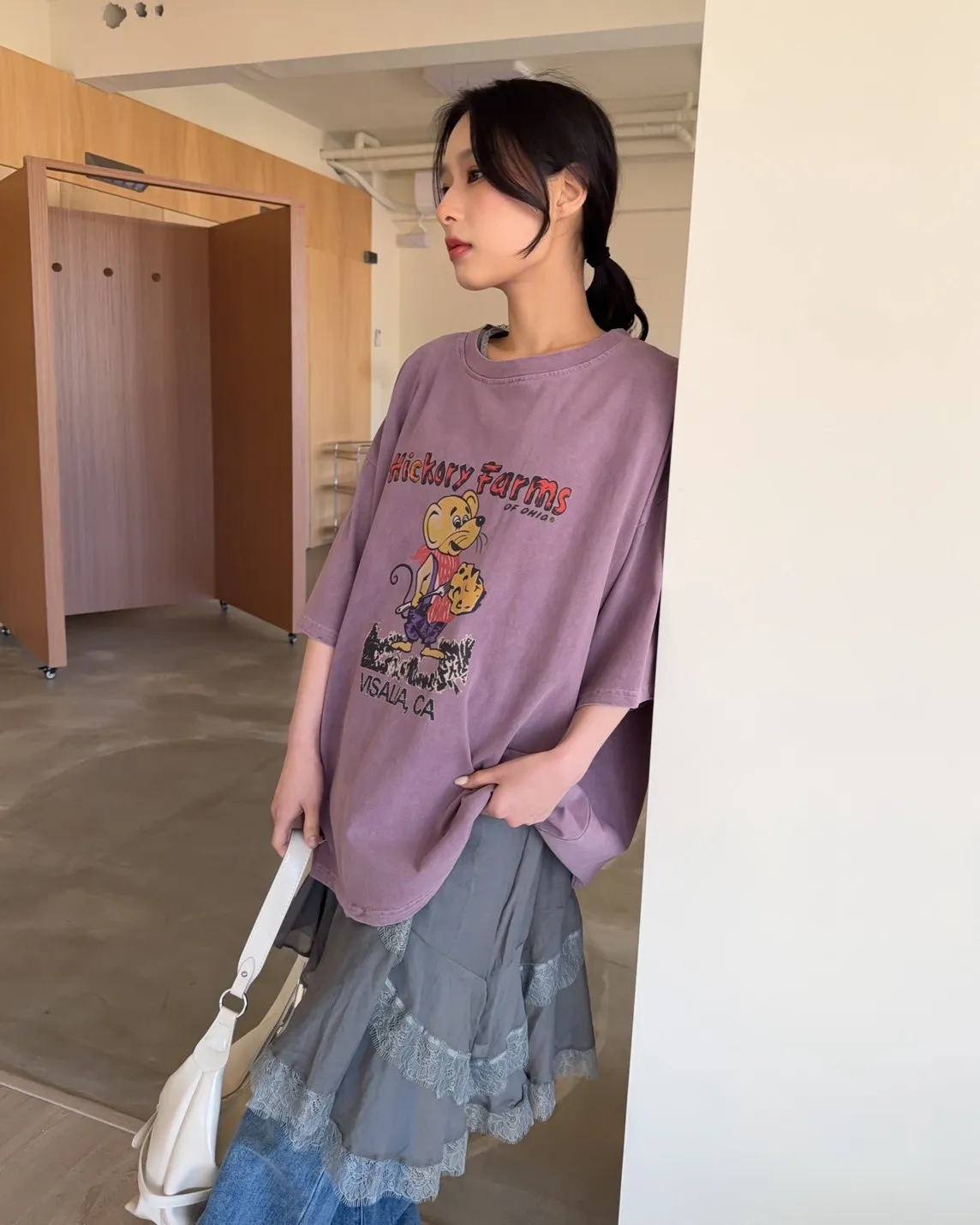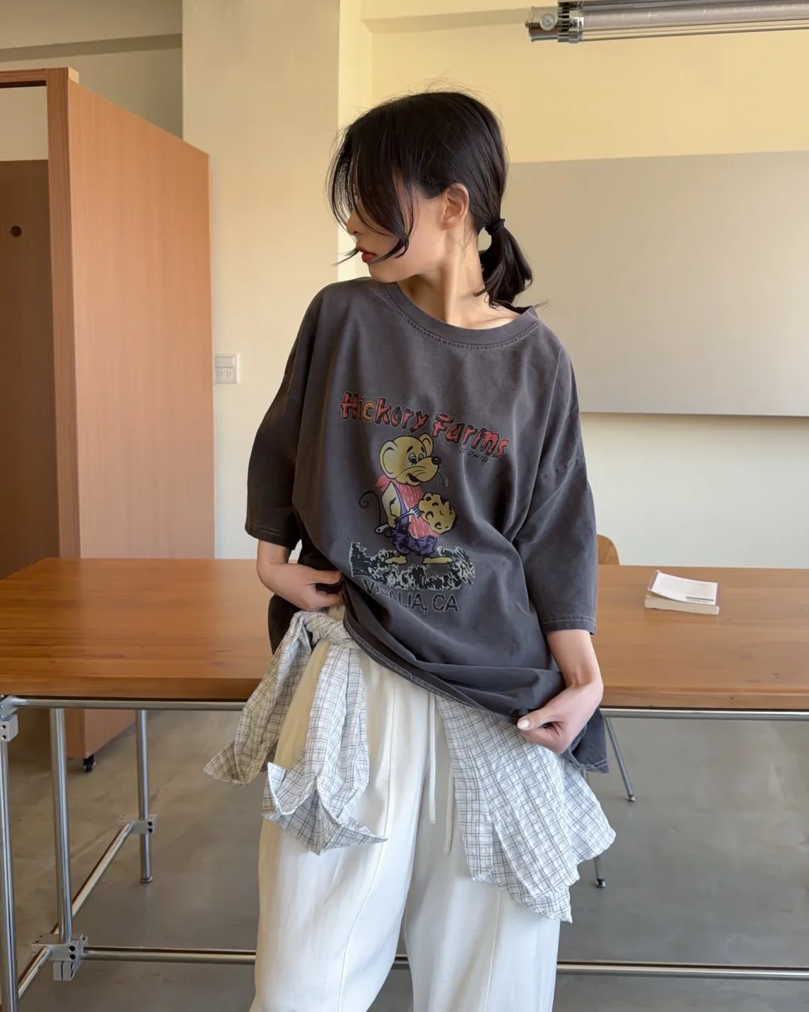 寬鬆落肩 刷白水洗做舊 老鼠起司印花