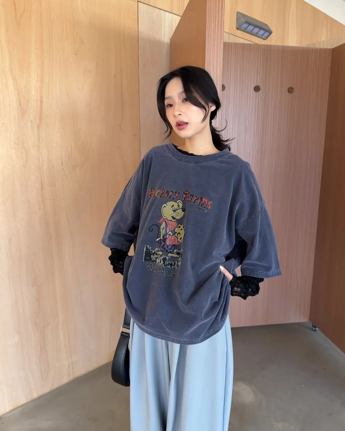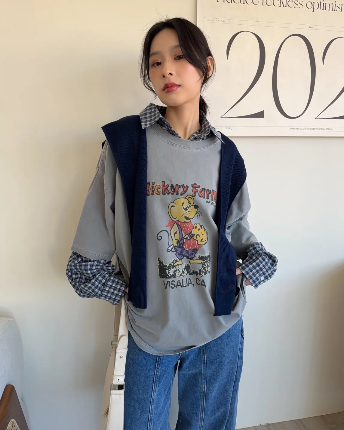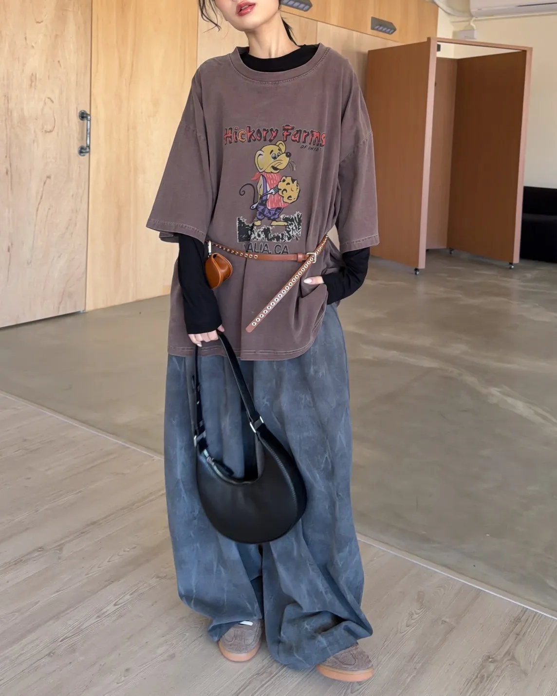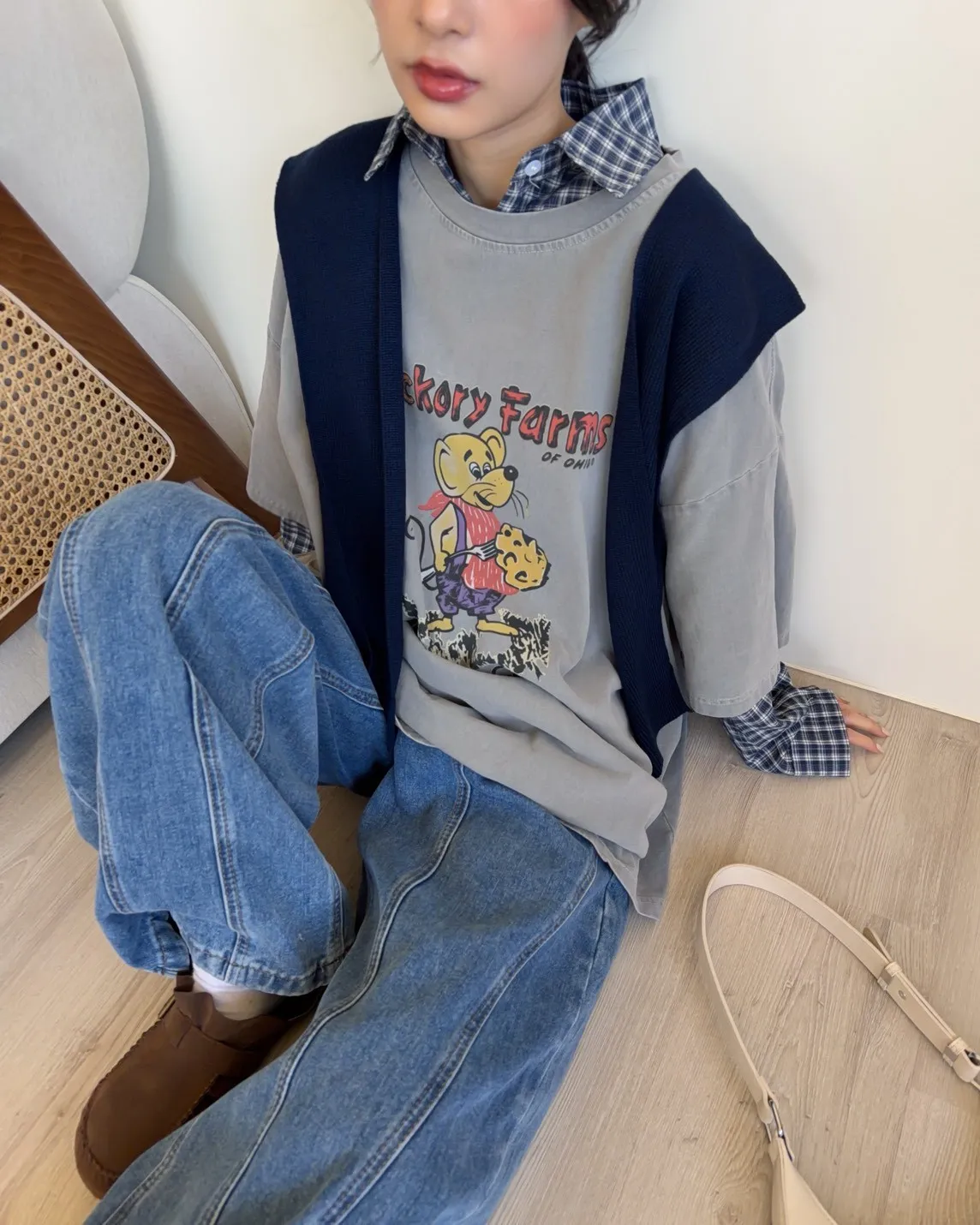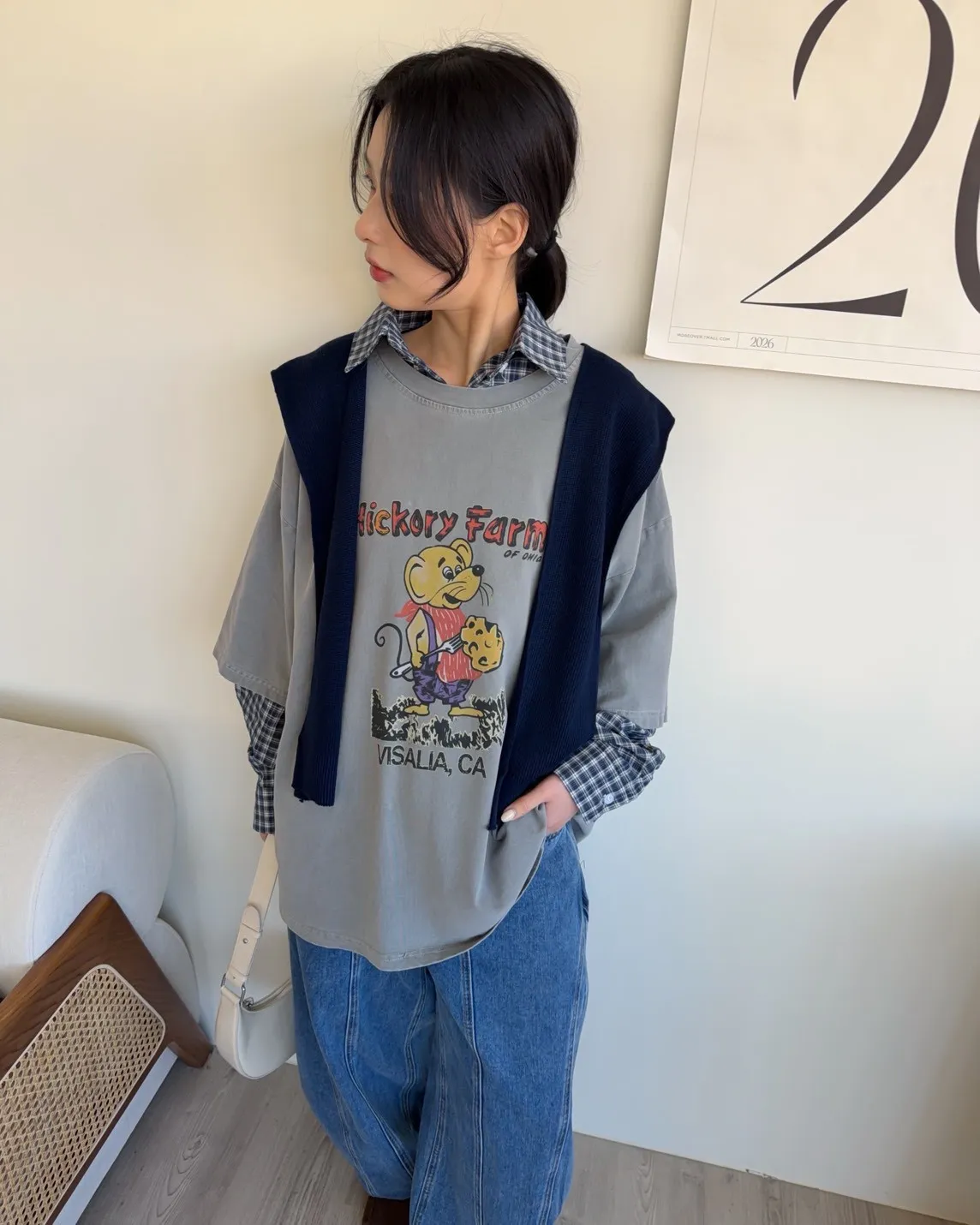 寬鬆落肩 刷白水洗做舊 老鼠起司印花